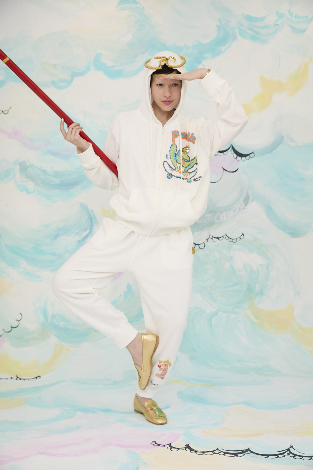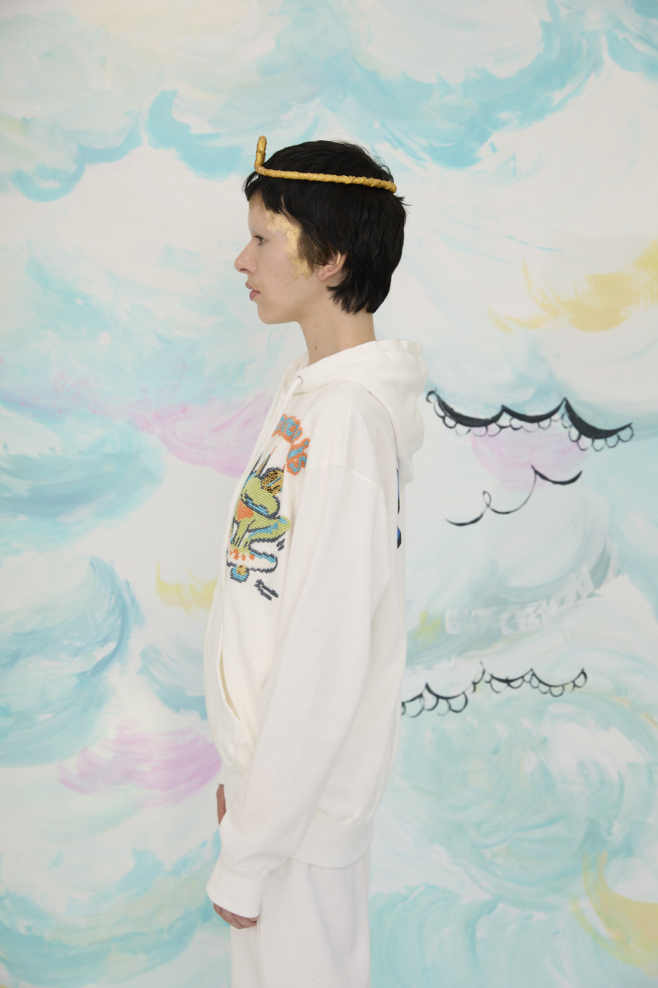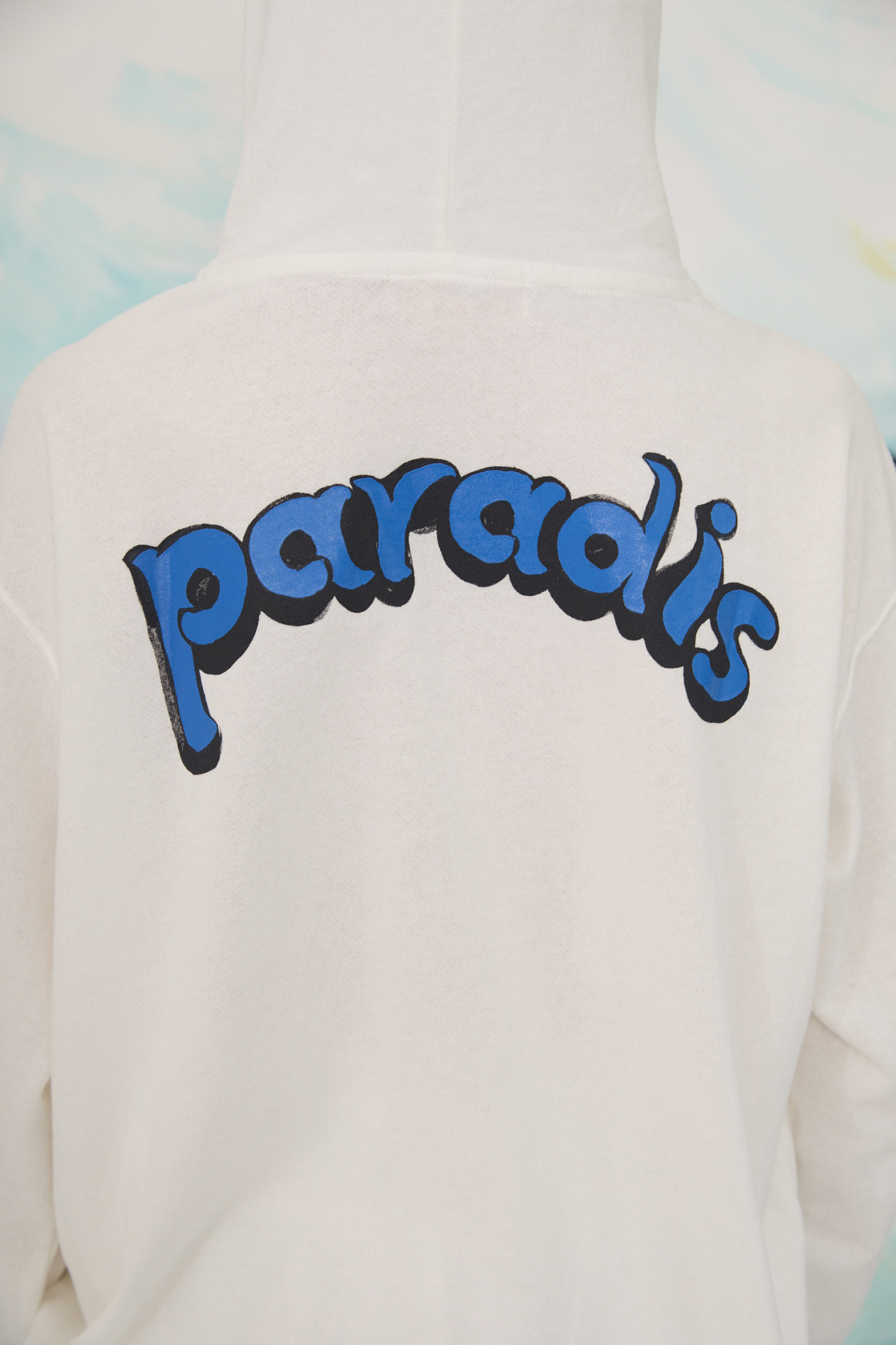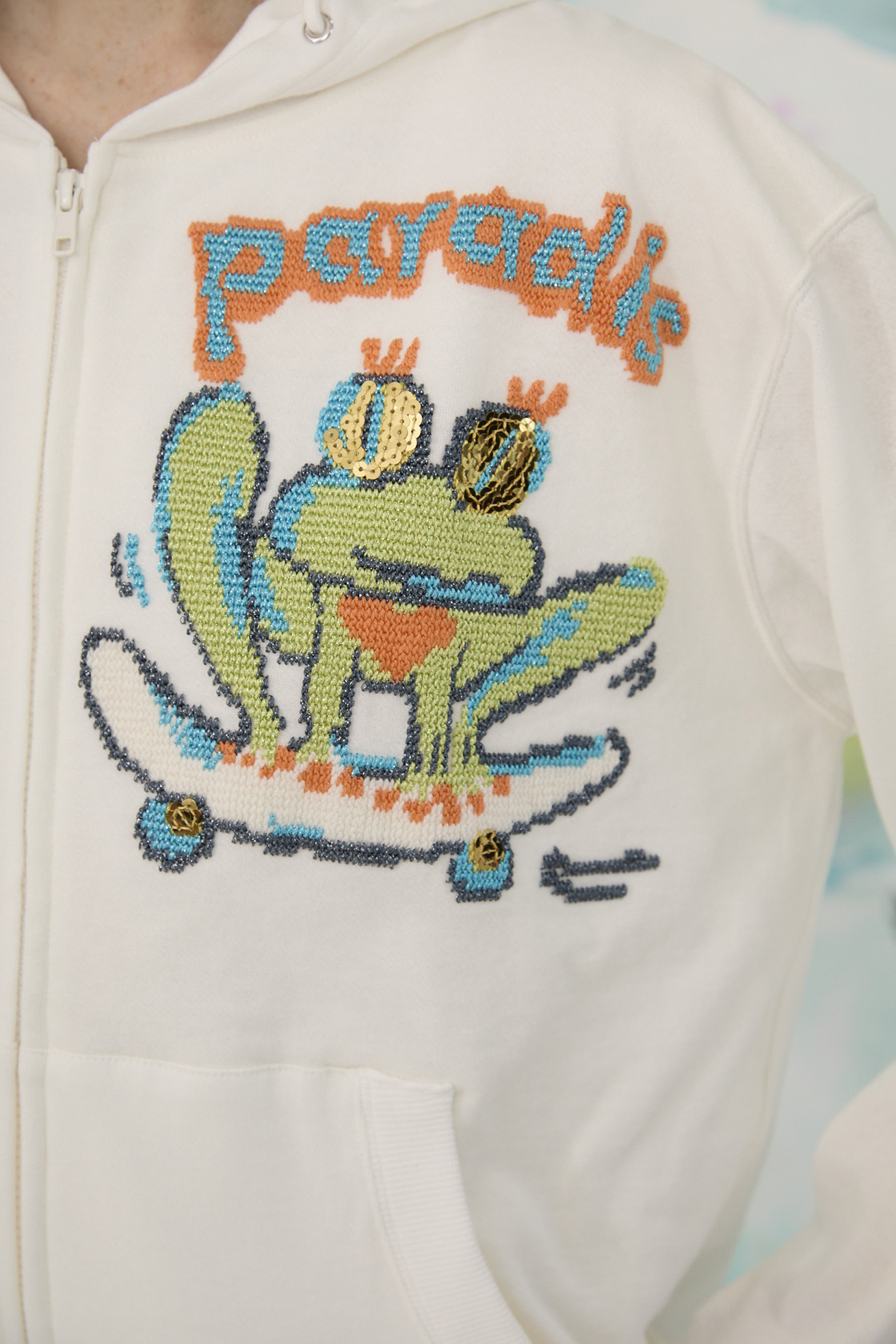 スケボーに乗ったファニーなカエルをラメ糸を混ぜた太めの糸で立体刺繍で表現しています。 部分的にスパンコールを加えてキラキラと存在感のあるモチーフに。 バックスタイルにはparadisのプリント。ゆったりしたサイズ感で男女兼用でご利用いただけます。 こちらの商品は手洗い可能です。 ※着用モデル身長:173cm ※着用サイズ: 2(M) ※当サイトの商品は実店舗と在庫を共有しており、ご注文完了後に商品を確保できない場合がございます。 その際、改めてキャンセルまたは数量変更のメールをお送りいたします。何卒ご了承いただけますと幸いです。