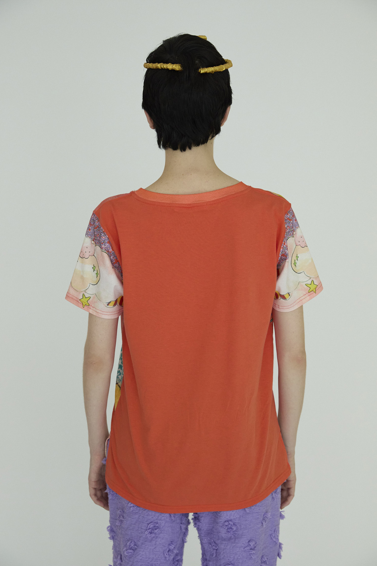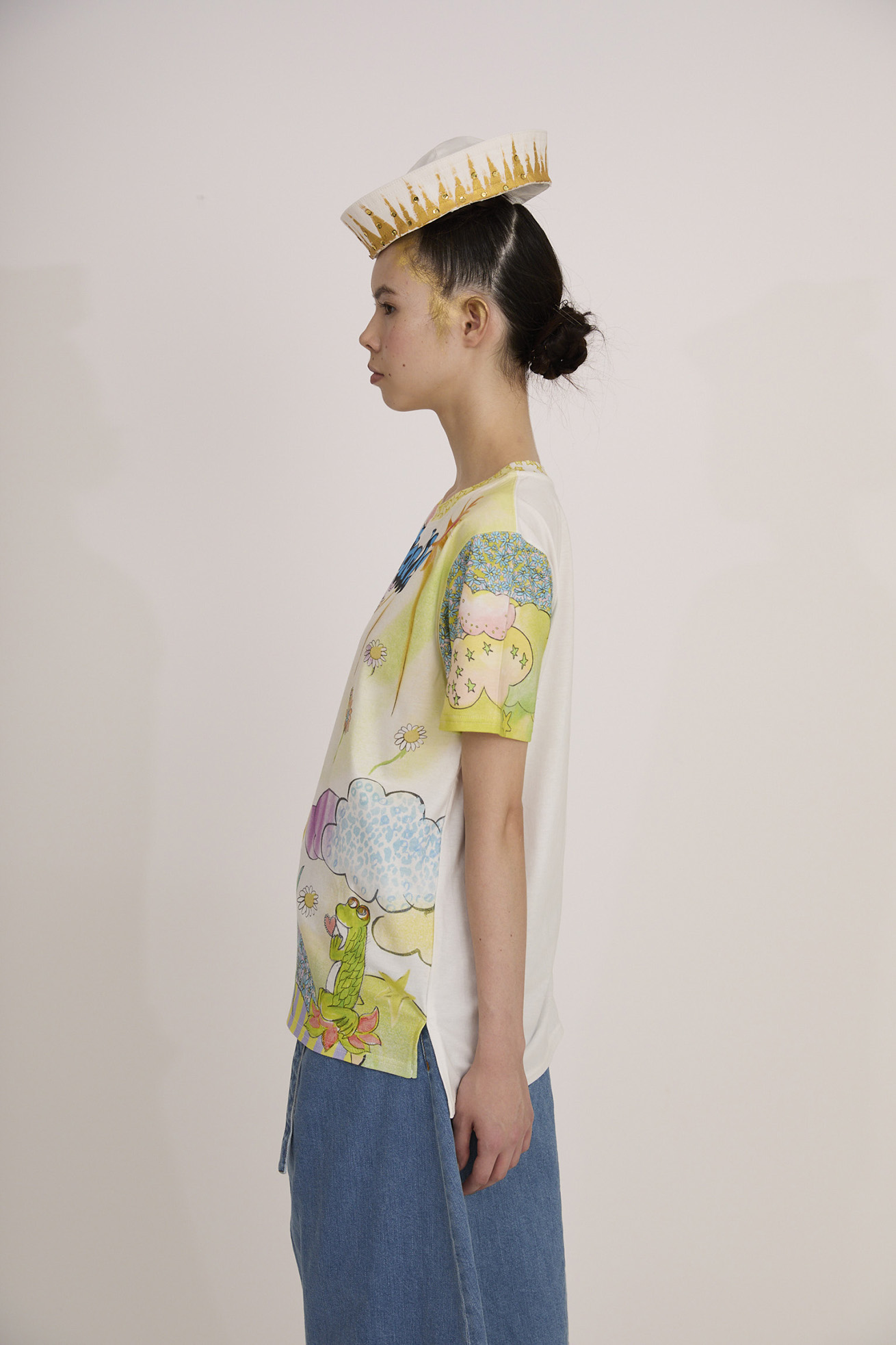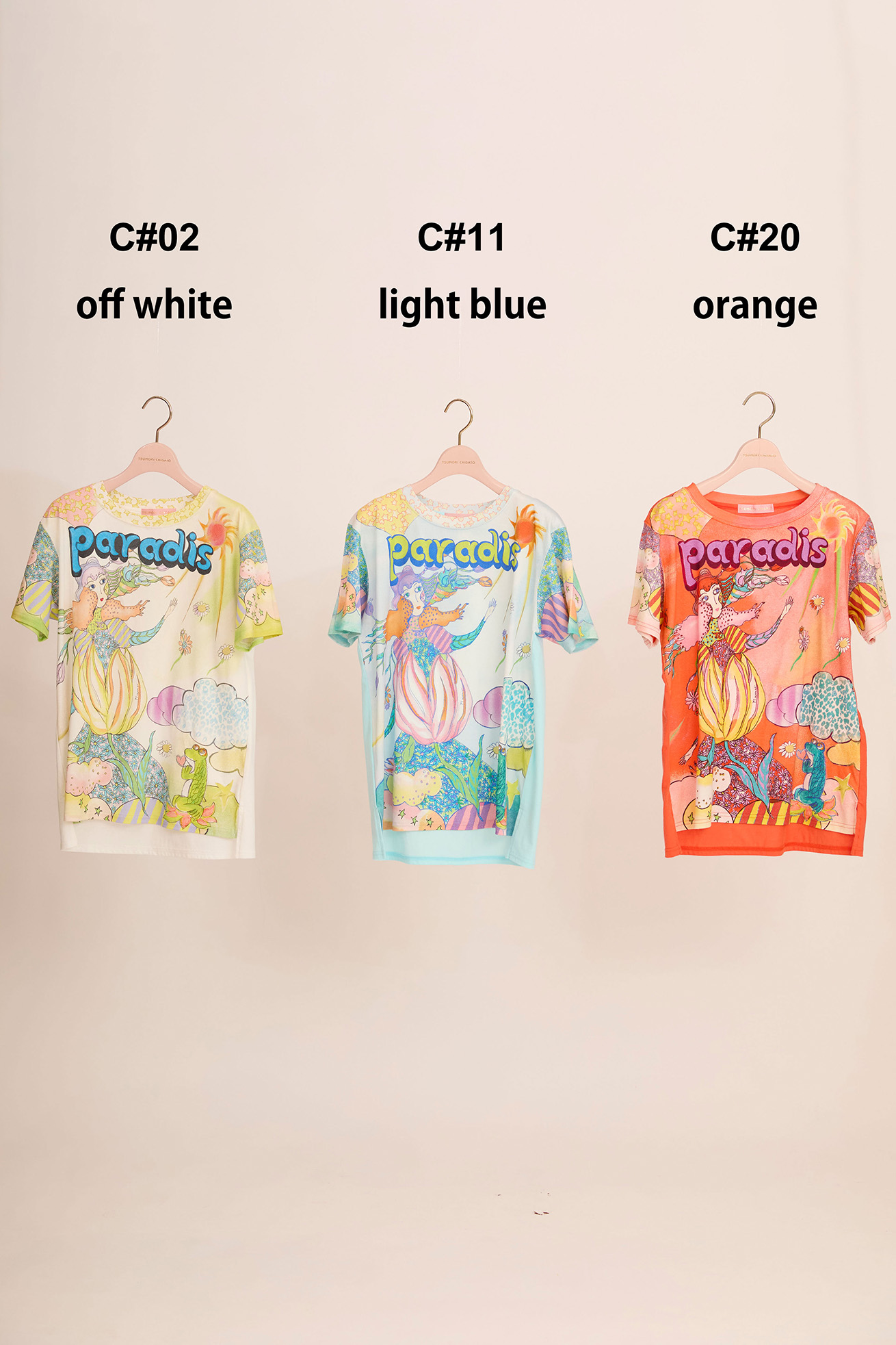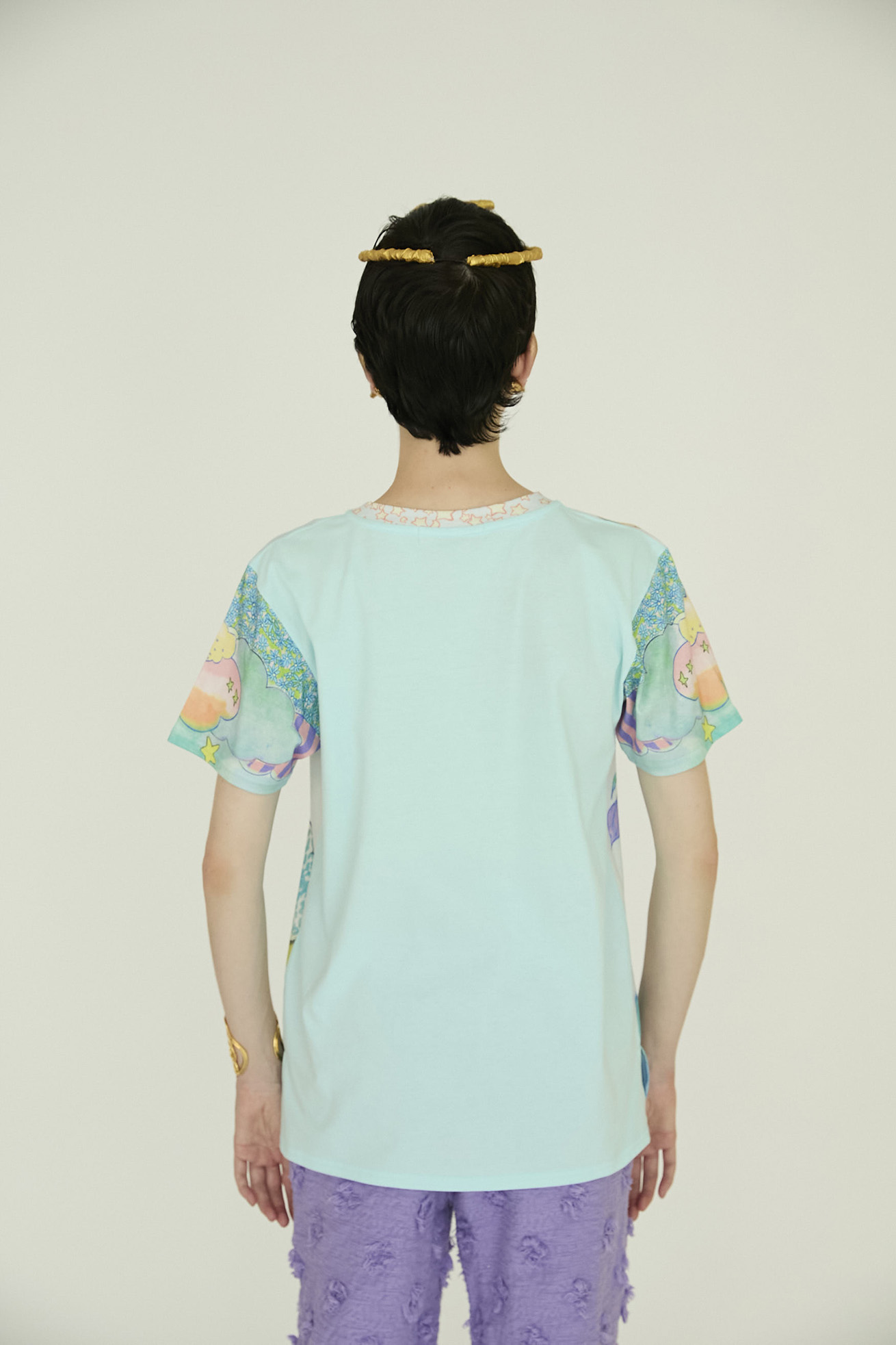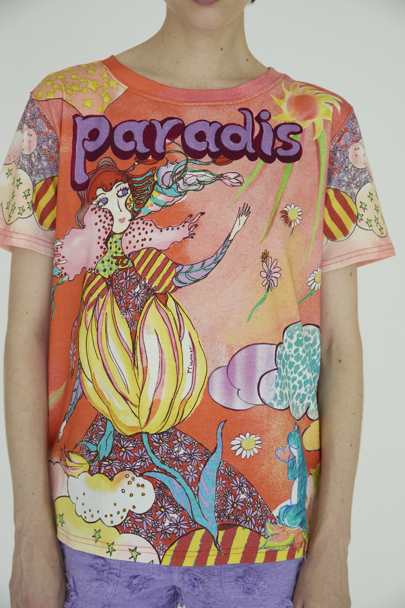 Bloom girl garden printを発色の良い染料インクジェットでプリントしたTシャツ。 前身頃の生地には柔らかく伸縮性が特徴の60/-スムース、 後ろ身頃には柔らかくふくらみのある綿天竺を使用し、コンパクトなサイズ感ですが着心地の良いアイテムです。 袖のプリントは後ろから見た時にもアクセントになっています。 こちらの商品は手洗い可能です。 〈Bloom girl garden print〉 花を咲かせるパワーを持った、Bloom girl。たくさんの花がふわふわと舞って空 に浮かんでいく。蓮の花の上のカエル、Paradisの文字。優しく光る太陽。 空に浮かぶ雲と一緒にふわふわと浮かんでいるような花の楽園をイメージしています。 ※着用モデル身長:off white 170cm ,light blue/orange 1 ※着用サイズ: 2(M) ※当サイトの商品は実店舗と在庫を共有しており、ご注文完了後に商品を確保できない場合がございます。 その際、改めてキャンセルまたは数量変更のメールをお送りいたします。何卒ご了承いただけますと幸いです。