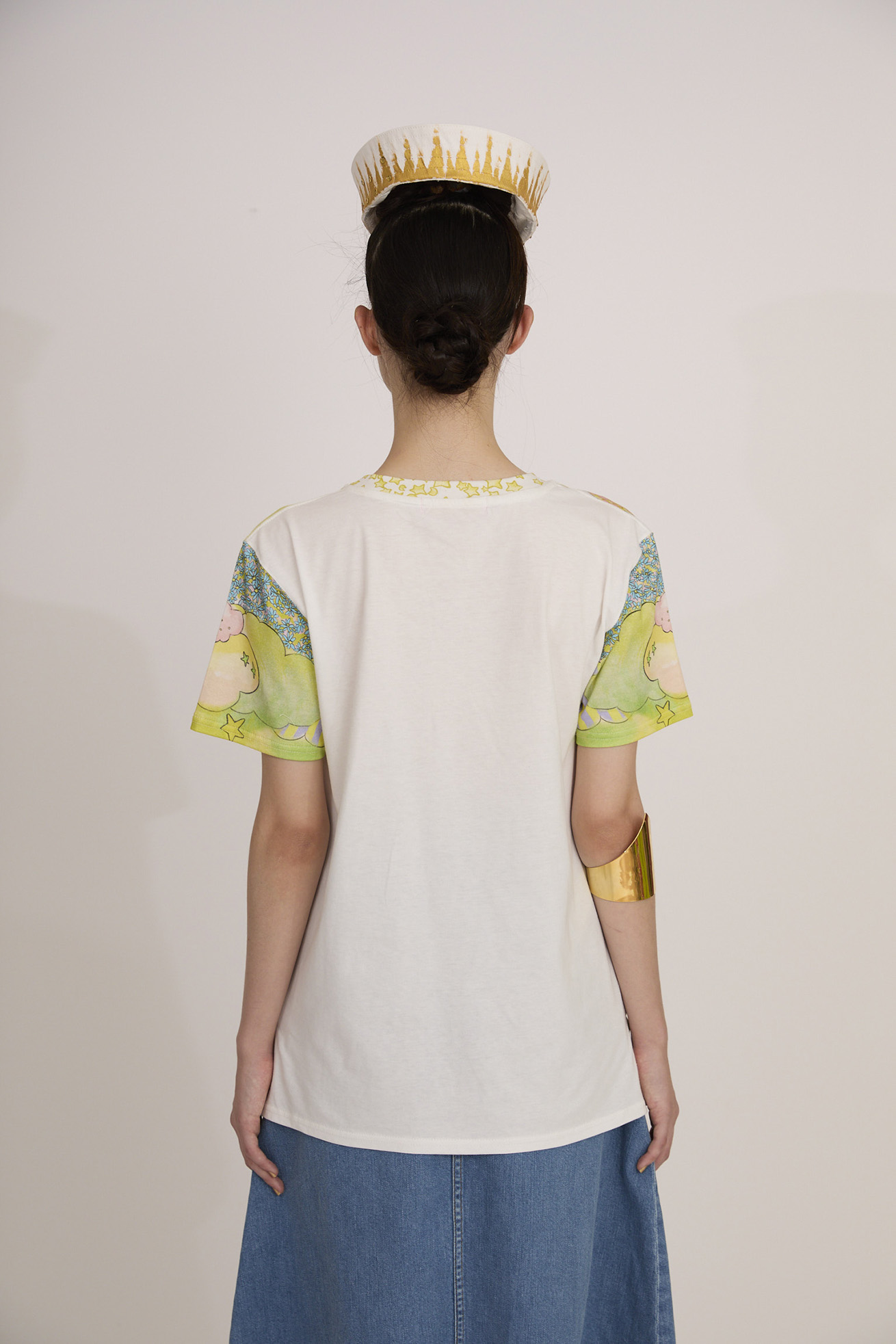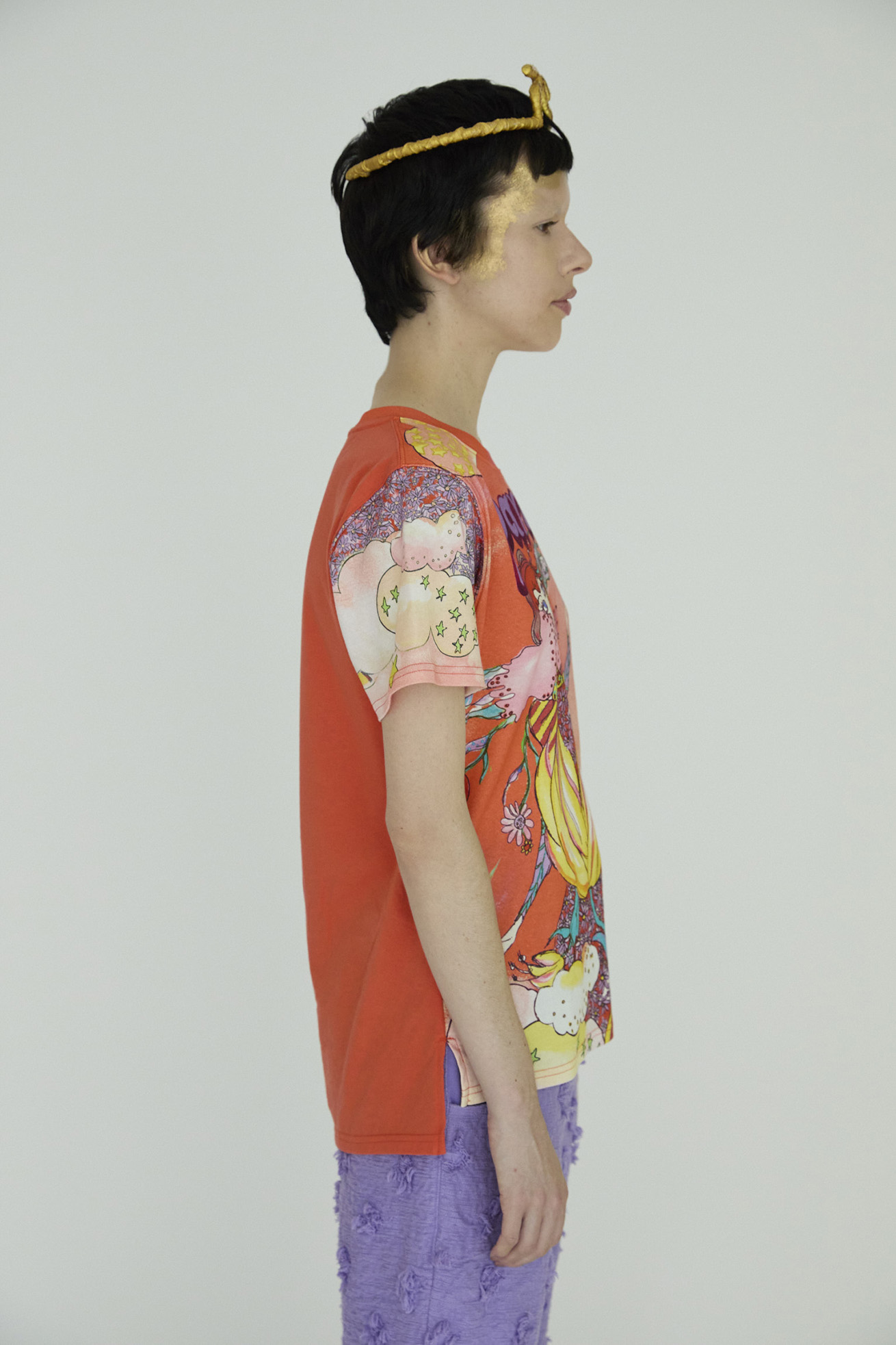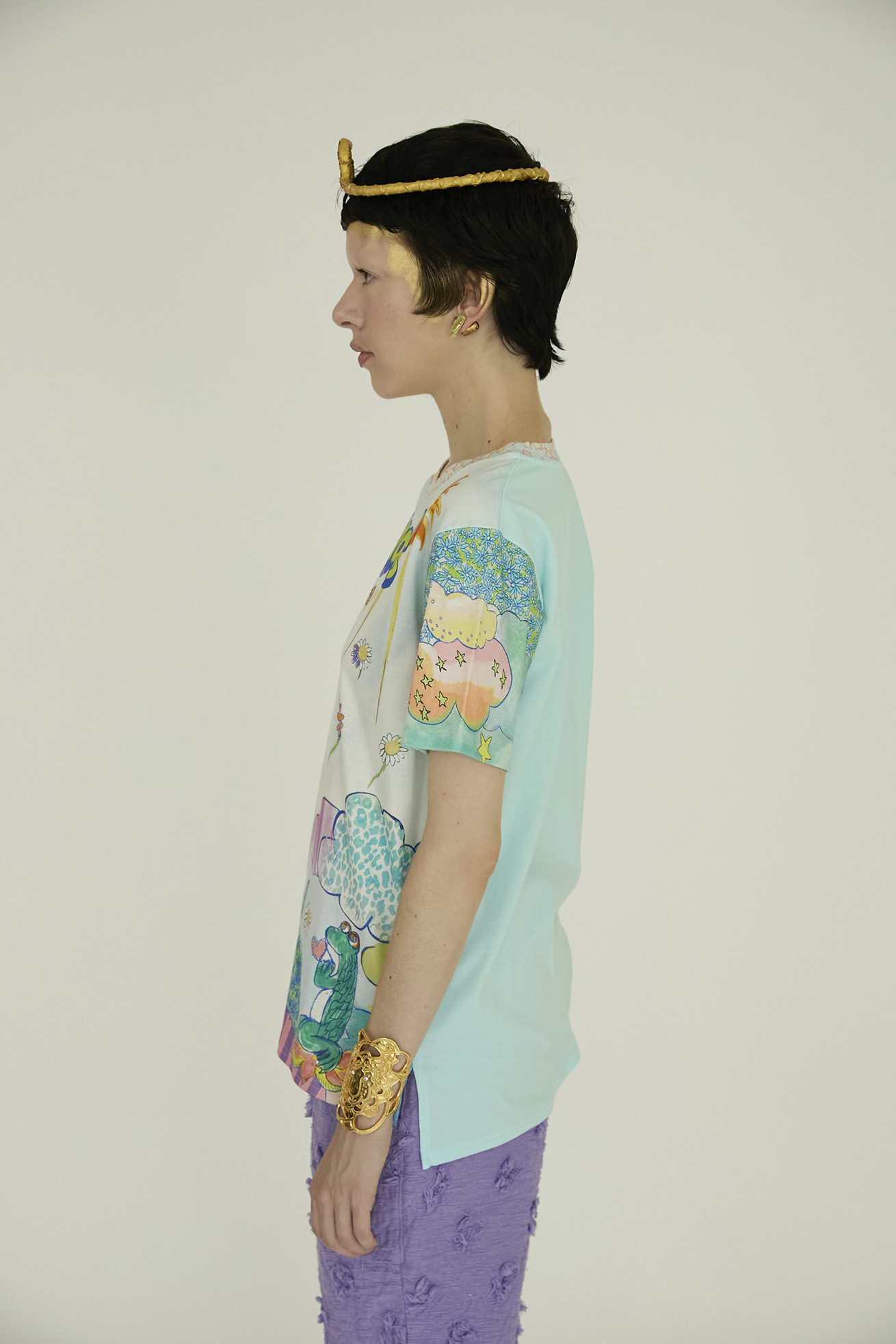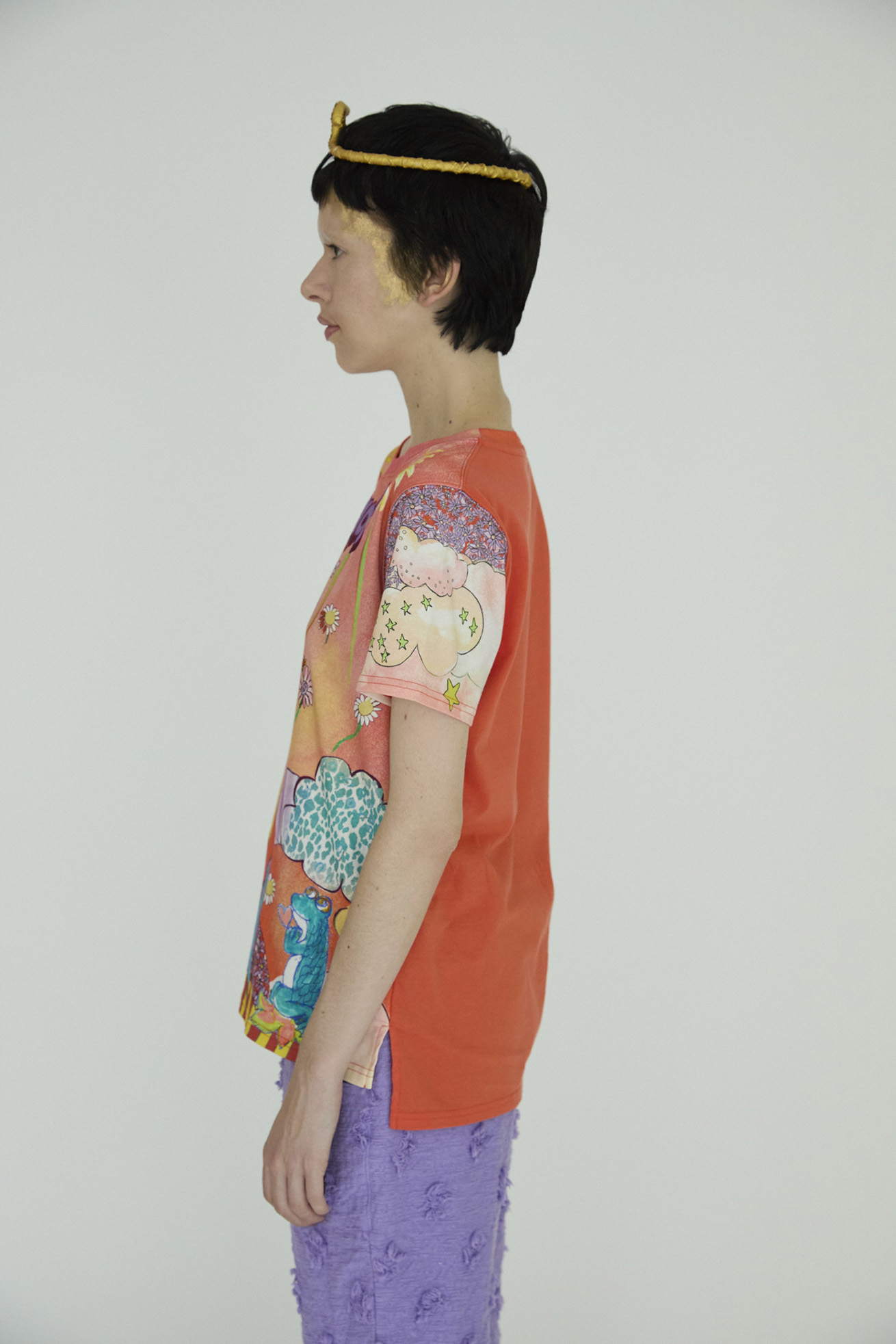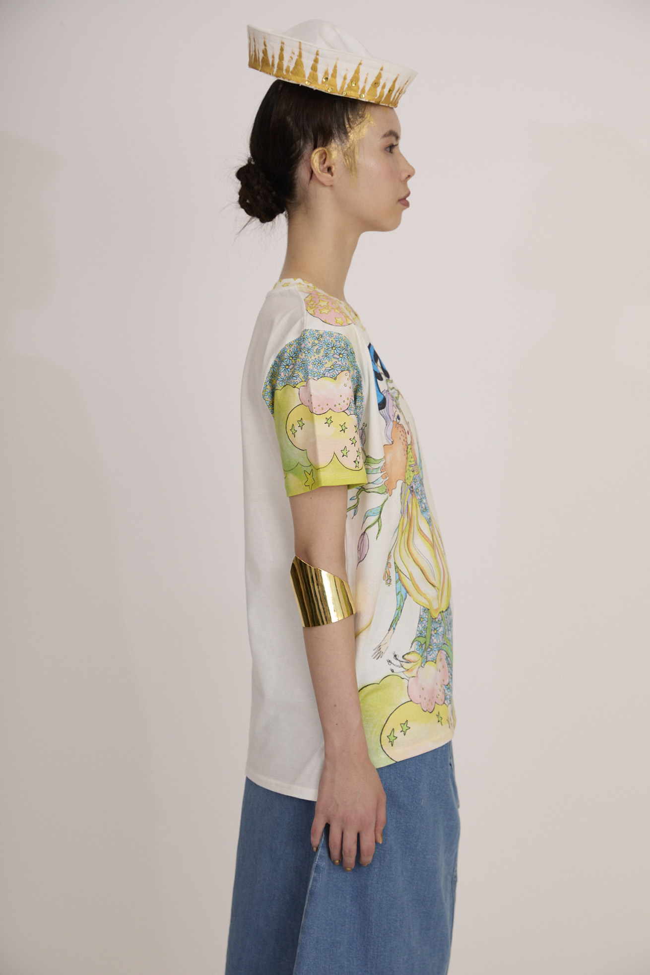 Bloom girl garden printを発色の良い染料インクジェットでプリントしたTシャツ。 前身頃の生地には柔らかく伸縮性が特徴の60/-スムース、 後ろ身頃には柔らかくふくらみのある綿天竺を使用し、コンパクトなサイズ感ですが着心地の良いアイテムです。 袖のプリントは後ろから見た時にもアクセントになっています。 こちらの商品は手洗い可能です。 〈Bloom girl garden print〉 花を咲かせるパワーを持った、Bloom girl。たくさんの花がふわふわと舞って空 に浮かんでいく。蓮の花の上のカエル、Paradisの文字。優しく光る太陽。 空に浮かぶ雲と一緒にふわふわと浮かんでいるような花の楽園をイメージしています。 ※着用モデル身長:off white 170cm ,light blue/orange 1 ※着用サイズ: 2(M) ※当サイトの商品は実店舗と在庫を共有しており、ご注文完了後に商品を確保できない場合がございます。 その際、改めてキャンセルまたは数量変更のメールをお送りいたします。何卒ご了承いただけますと幸いです。