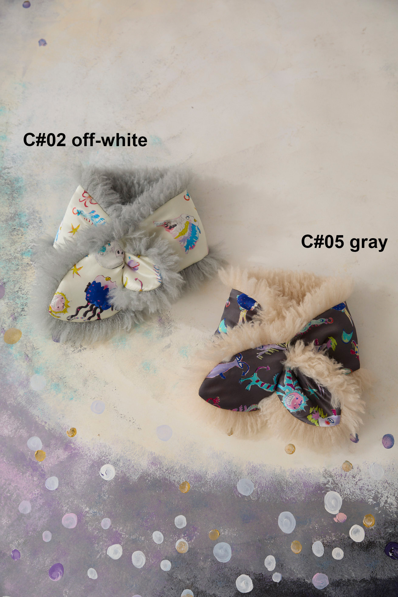 ふわふわでボリュームのあるフェイクファーとシルクサテンの<Space walk>生地を合わせたファーマフラー。 ファー部分には毛足が長く細かなウェーブが入ったチベットラム風のフェイクファーを使用。 ほどよいボリューム感とシンプルなデザインがデイリーに使いやすいアイテムです。 ※プリント生地の柄の出方はランダムです。柄はお選びいただけません。 <Space walk> 猫の宇宙飛行士、手の翼を持った魚、ウーパールーパーのようなタコ、「Bonjour」と挨拶をする帽子を被った不思議な生き物。 ライオンのような猫、カラフルなエビ、ロケットに乗った猫や半魚人など、、、個性豊かな不思議な生き物たちが宇宙遊泳を楽しむ様子を描きました。 手描きならではの線や色のニュアンスを生かし、そのままの雰囲気でインクジェットプリントにより表現しています。 ケア方法:ドライクリーニング ※表記のサイズはサンプル商品での計測の為、若干の誤差が生じます。予めご了承ください。 ※完全受注生産の為、オーダー後の変更・キャンセルはお受けしておりません。予めご了承ください。