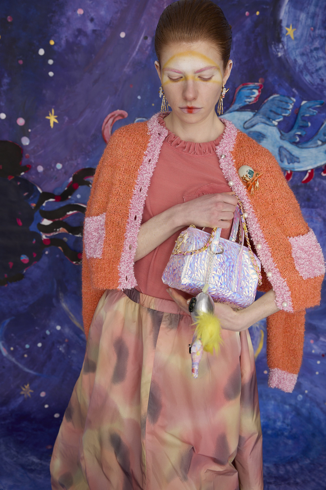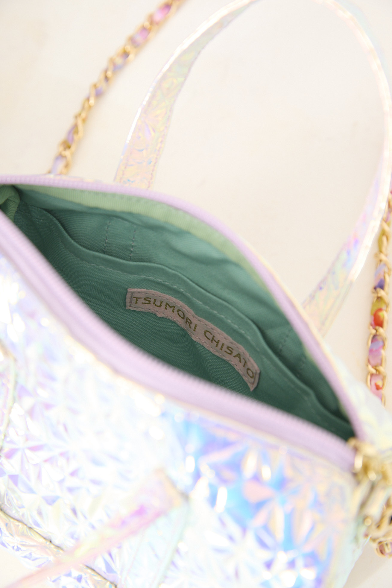 クラッシュ加工の型押しが存在感を放つ、宇宙的なムードのミニボストンバッグ。 見る角度によって表情を変える、オーロラのような偏光パールが魅力です。 アクセサリー感覚で楽しめるデザインで、取り外し可能なショルダーチェーンにはAndromeda print生地を通しています。 バッグ内側には仕切りポケットがあります。東京都で製作しています。 <Andromeda > たくさんの星が集まるアンドロメダ星雲、いくつもの銀河が交差する世界をイメージしたプリントです。よく見るとアンドロメダ銀河の間を駆け抜ける銀河鉄道や、ネオキャットの姿が見え、楽しく遊び心のあるキュートな一枚に仕上げました。 たくさんの星を思わせるカラフルな描写と、重なり合う色が織りなすファンタジー感溢れるテキスタイルです。 着用モデル身長:170cm ※表記のサイズはサンプル商品での計測の為、若干の誤差が生じます。予めご了承ください。 ※完全受注生産の為、オーダー後の変更・キャンセルはお受けしておりません。予めご了承ください。