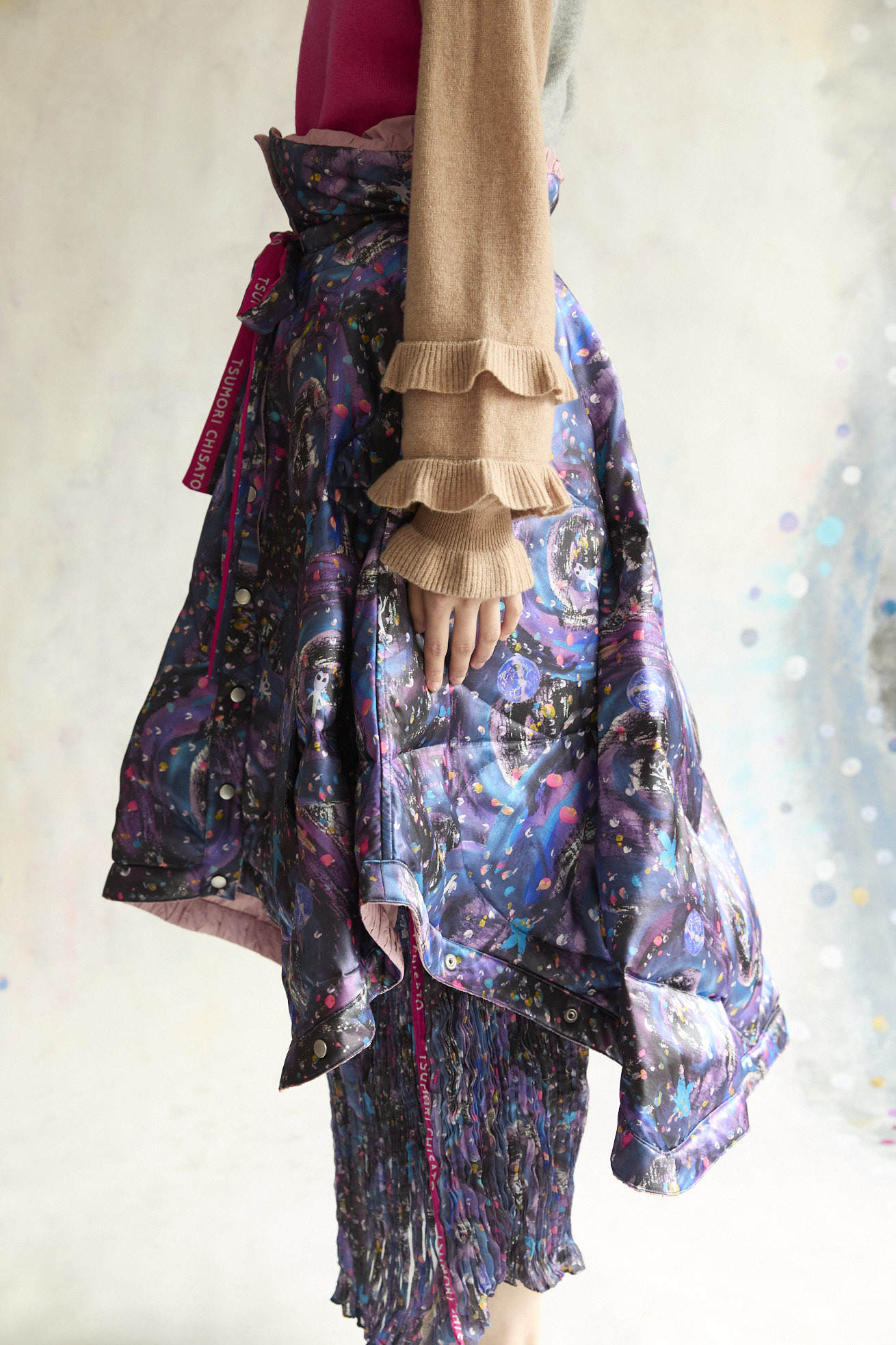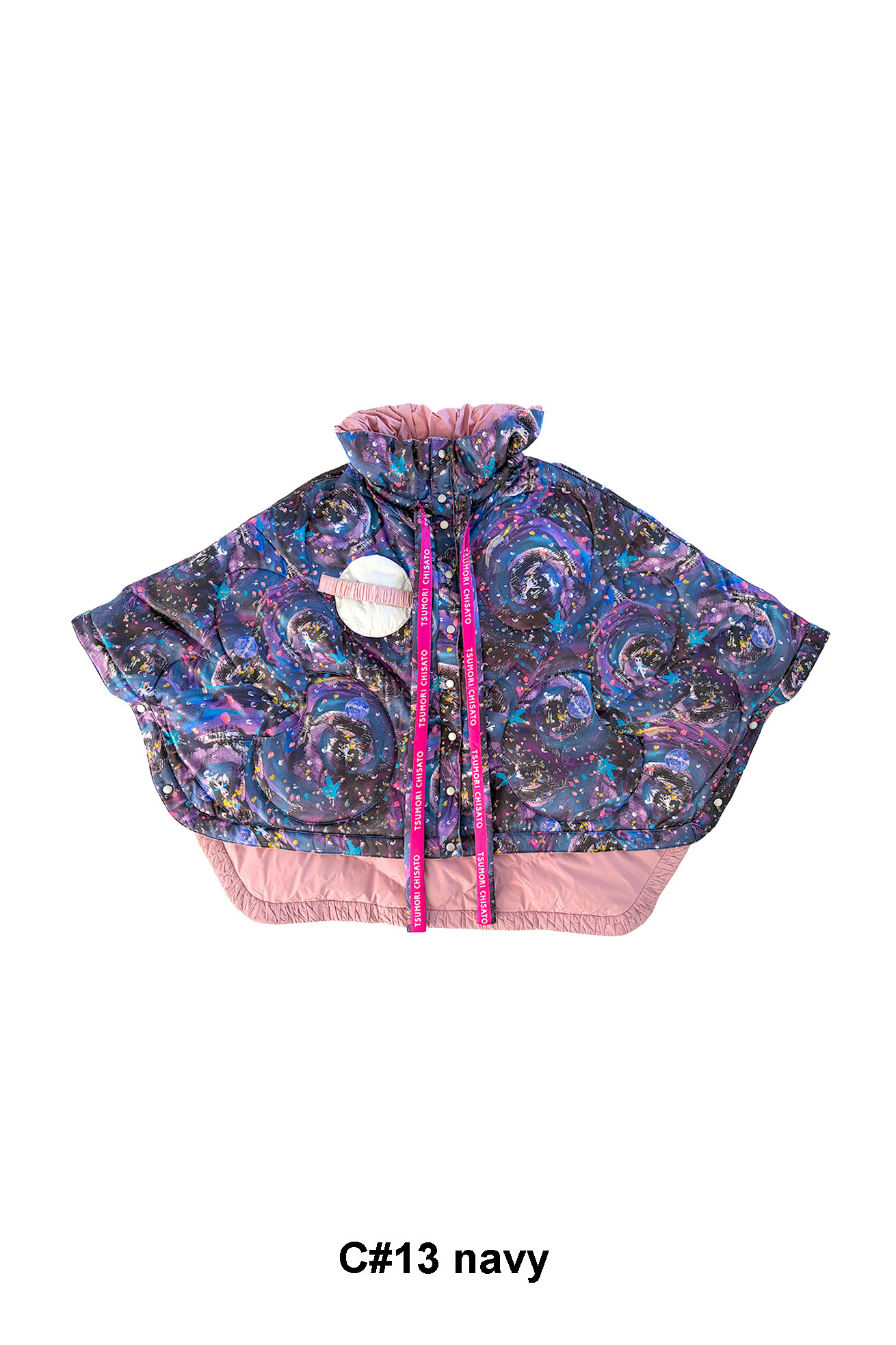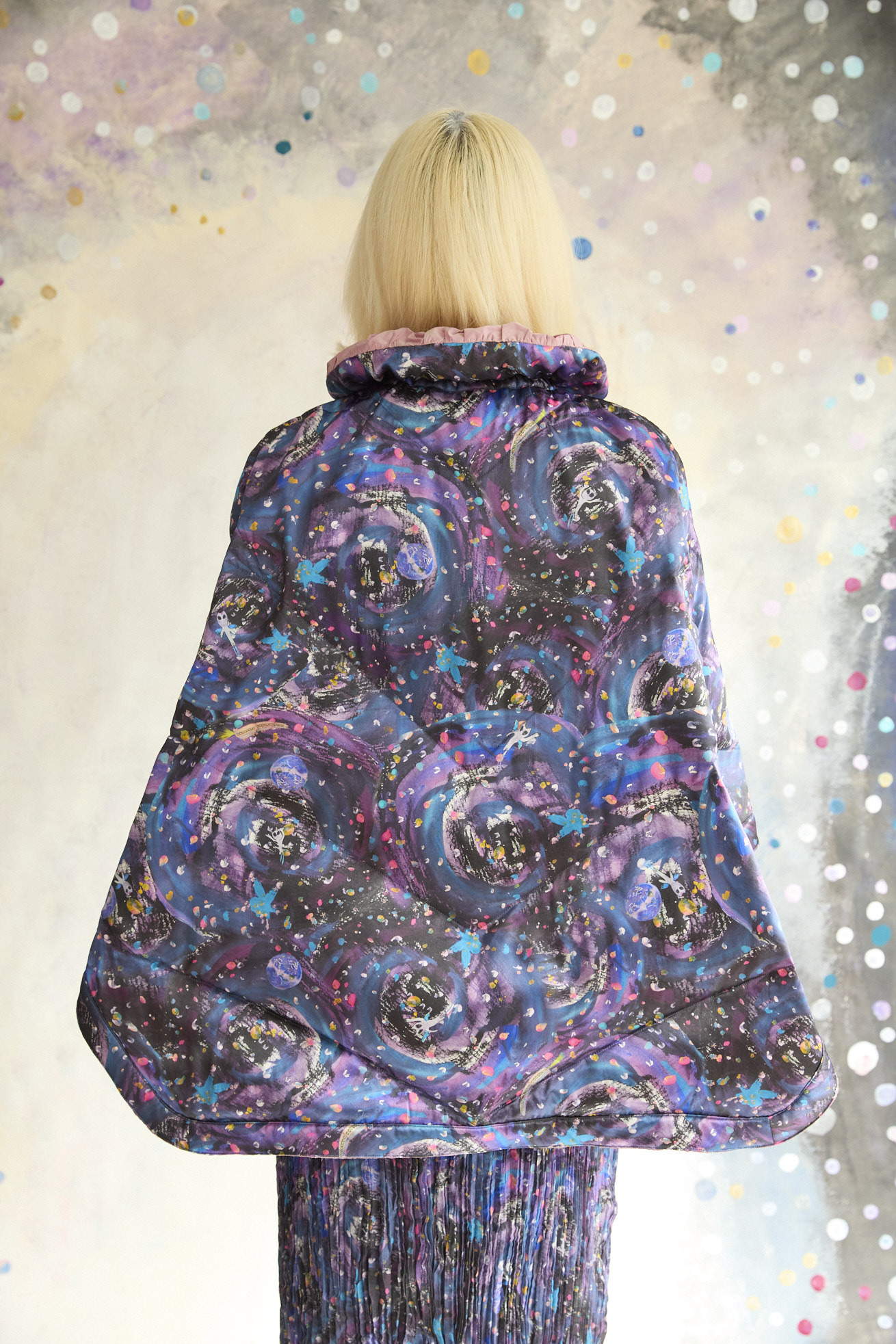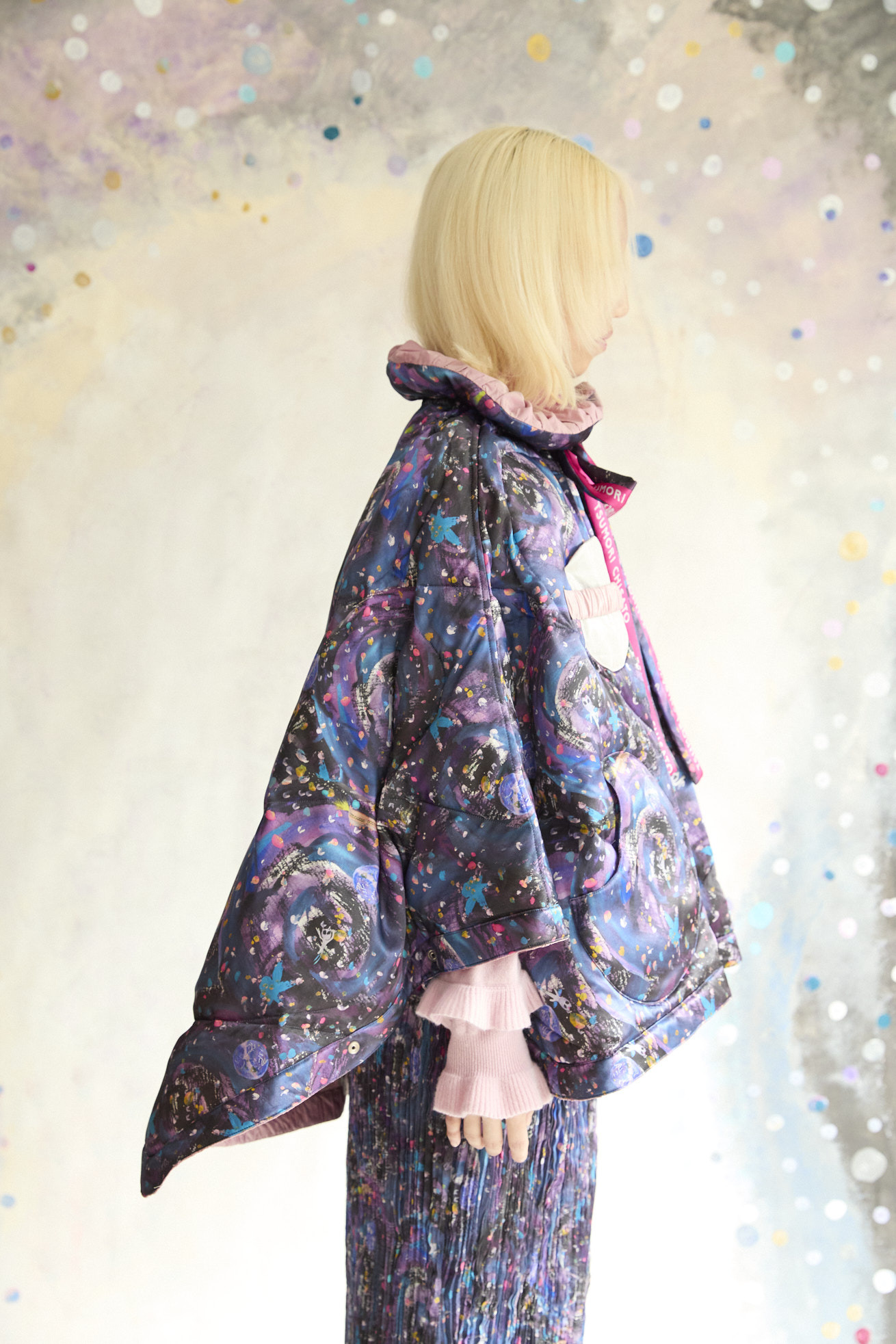 高さのあるギャザー襟がアクセントのリバーシブルダウンポンチョ。 襟は内側のゴムと表のプリント紐でシルエットの調整が可能です。 Andromeda Printのシルクサテンを使用し、カラフルでミステリアスな1枚に仕上げました。無地面も月や惑星、ハートのステッチが目を惹くデザインです。 防寒着としてはもちろん、ドレッシーでデザイン性の高いアイテムです。 スカートとしてのアレンジもお楽しみください。 <Andromeda > たくさんの星が集まるアンドロメダ星雲、いくつもの銀河が交差する世界をイメージしたプリントです。 よく見るとアンドロメダ銀河の間を駆け抜ける銀河鉄道や、ネオキャットの姿が見え、楽しく遊び心のあるキュートな一枚に仕上げました。 たくさんの星を思わせるカラフルな描写と重なり合う色が織りなすファンタジー感溢れるテキスタイルです。 ケア方法:ドライクリーニング 着用モデル身長:165cm 着用サイズ:2(M) ※表記のサイズはサンプル商品での計測の為、若干の誤差が生じます。予めご了承ください。 ※完全受注生産の為、オーダー後の変更・キャンセルはお受けしておりません。予めご了承ください。