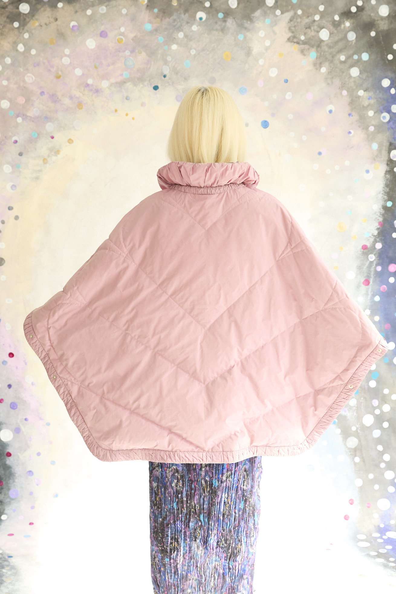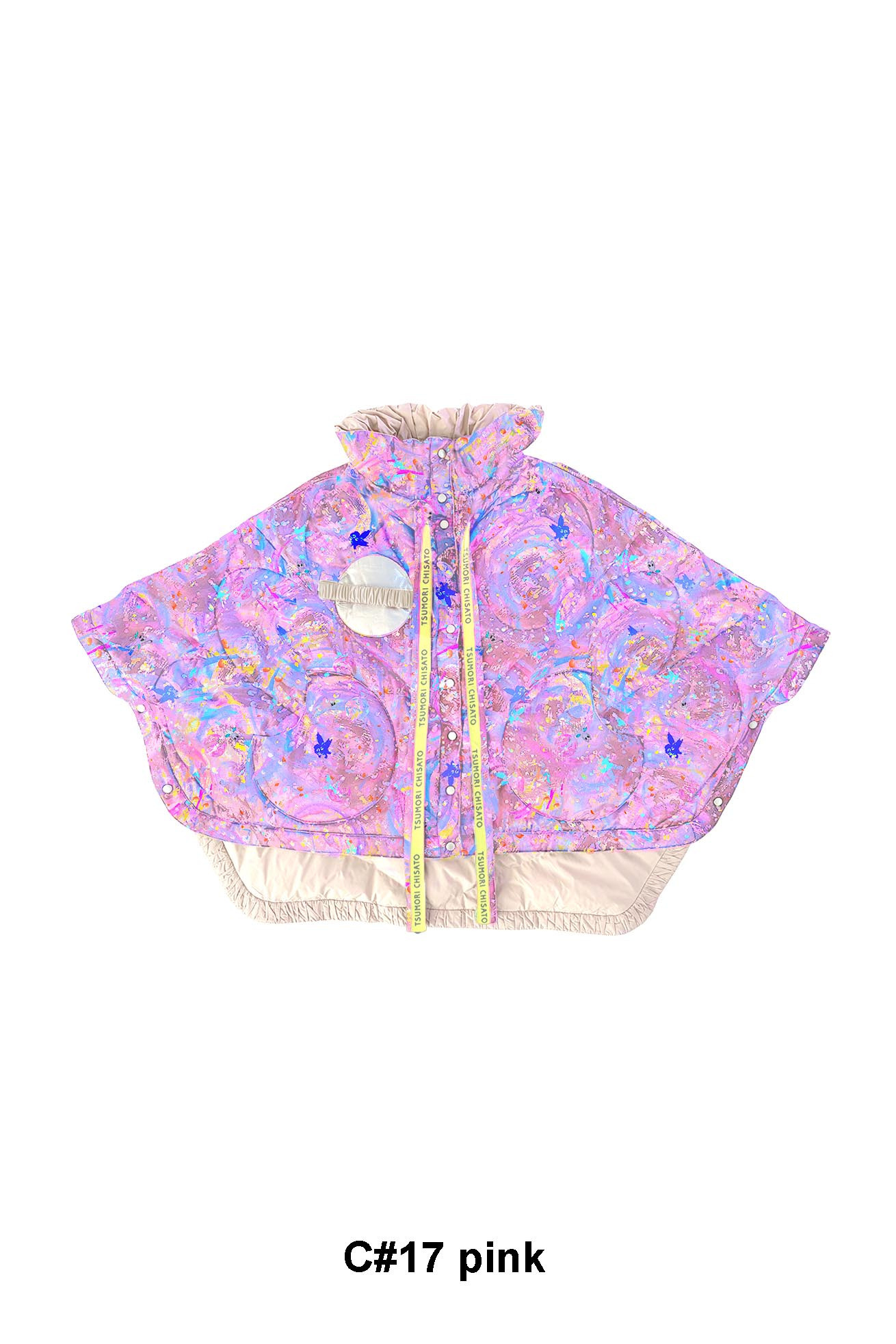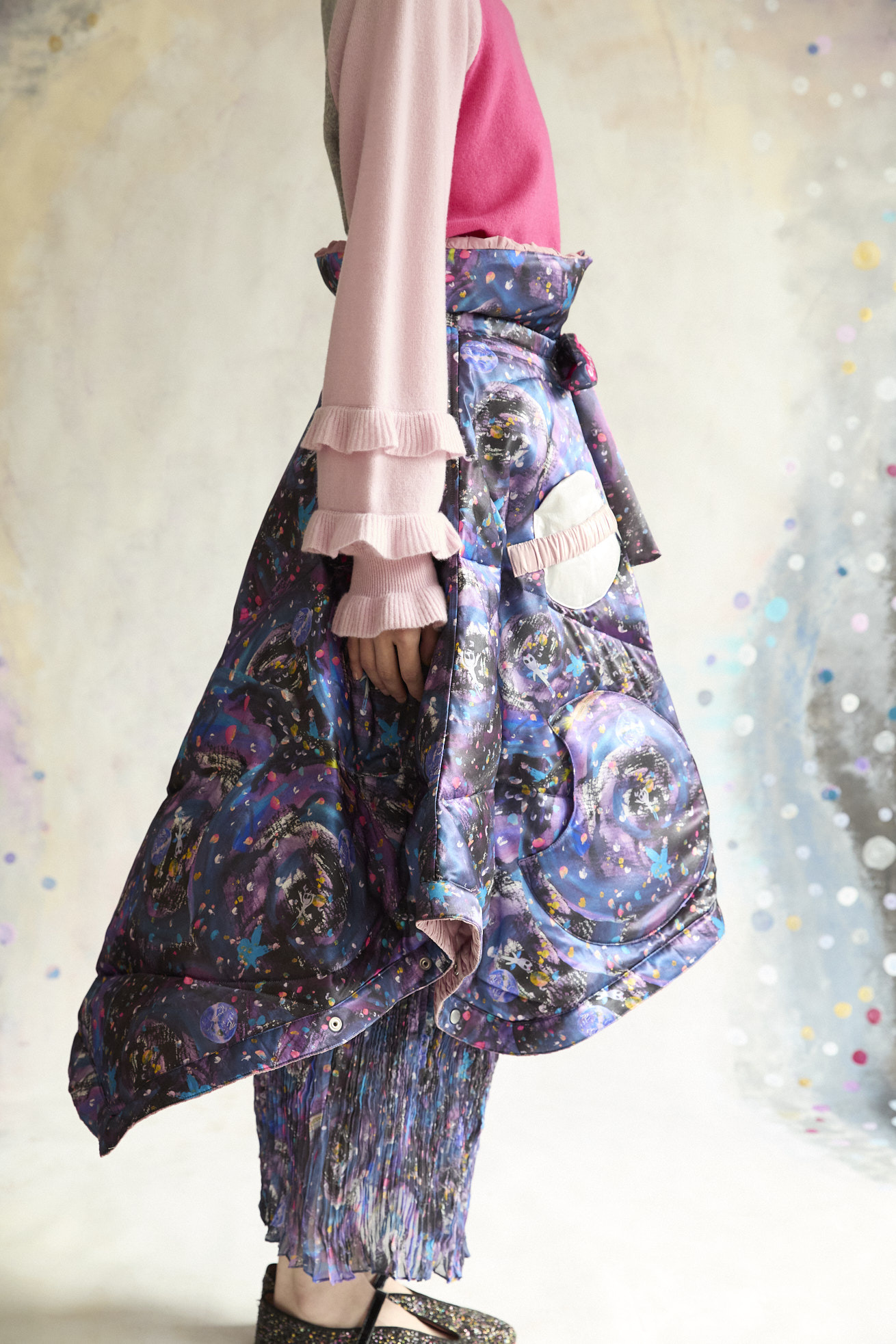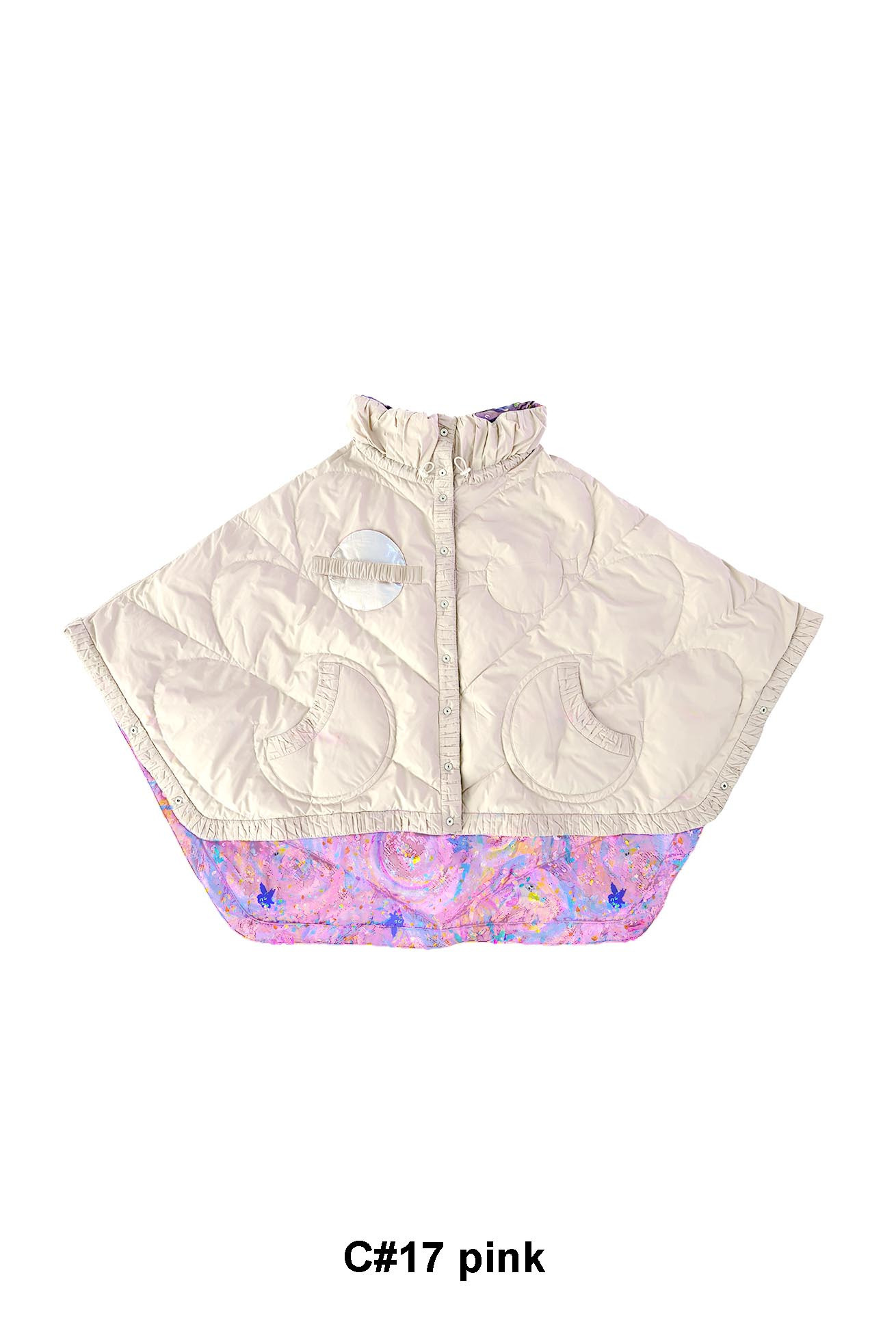 高さのあるギャザー襟がアクセントのリバーシブルダウンポンチョ。 襟は内側のゴムと表のプリント紐でシルエットの調整が可能です。 Andromeda Printのシルクサテンを使用し、カラフルでミステリアスな1枚に仕上げました。無地面も月や惑星、ハートのステッチが目を惹くデザインです。 防寒着としてはもちろん、ドレッシーでデザイン性の高いアイテムです。 スカートとしてのアレンジもお楽しみください。 <Andromeda > たくさんの星が集まるアンドロメダ星雲、いくつもの銀河が交差する世界をイメージしたプリントです。 よく見るとアンドロメダ銀河の間を駆け抜ける銀河鉄道や、ネオキャットの姿が見え、楽しく遊び心のあるキュートな一枚に仕上げました。 たくさんの星を思わせるカラフルな描写と重なり合う色が織りなすファンタジー感溢れるテキスタイルです。 ケア方法:ドライクリーニング 着用モデル身長:165cm 着用サイズ:2(M) ※表記のサイズはサンプル商品での計測の為、若干の誤差が生じます。予めご了承ください。 ※完全受注生産の為、オーダー後の変更・キャンセルはお受けしておりません。予めご了承ください。