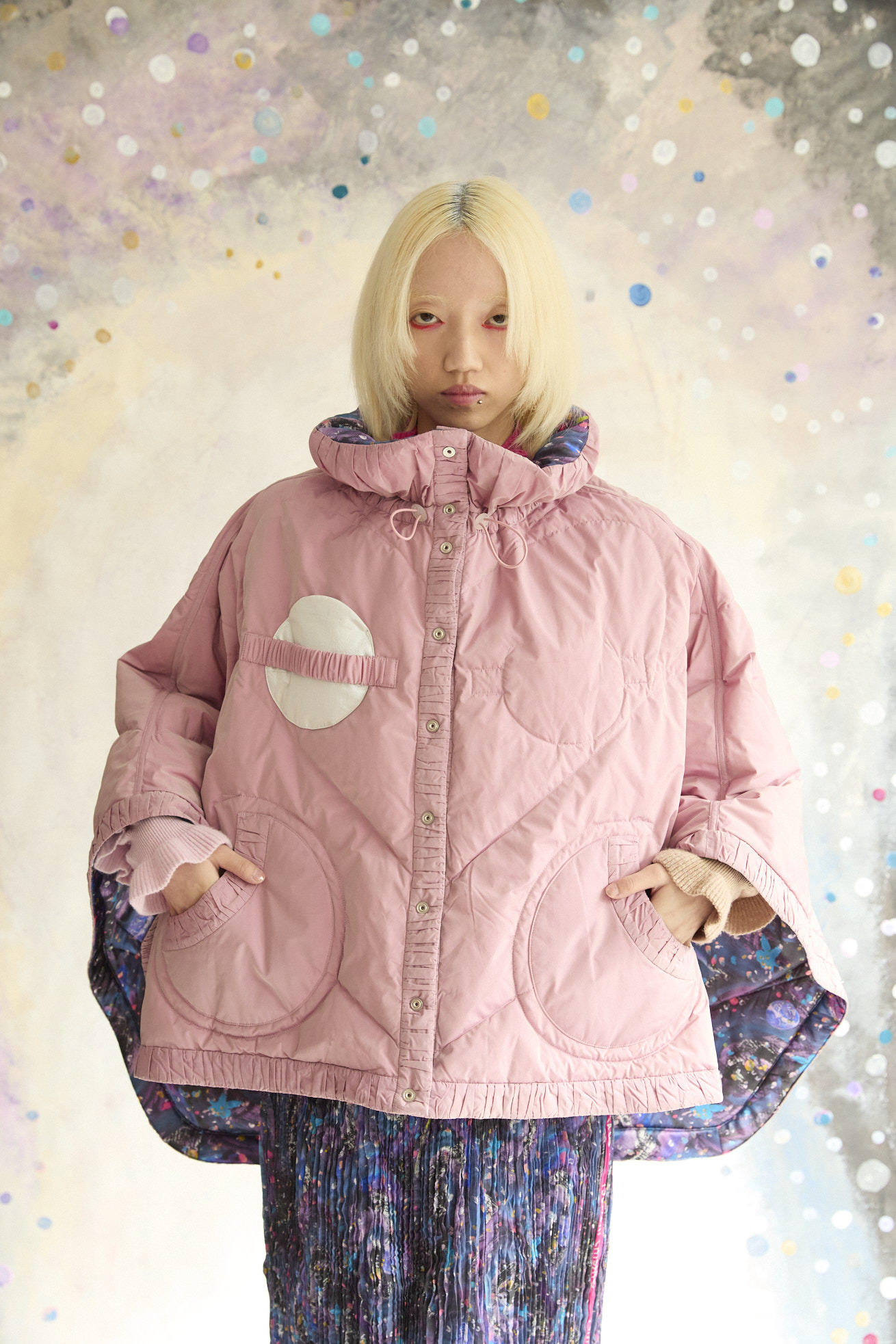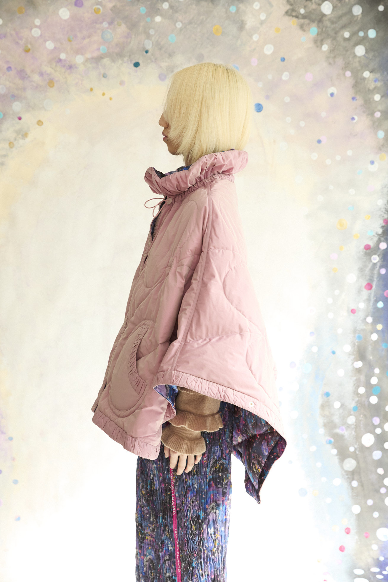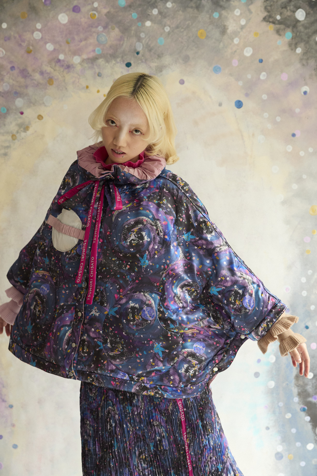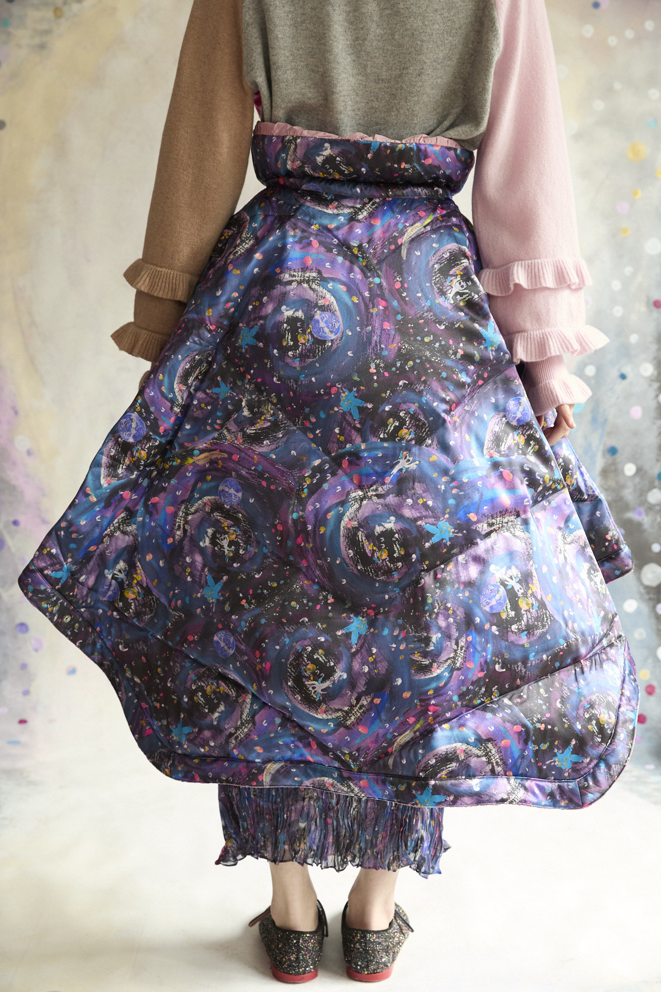 高さのあるギャザー襟がアクセントのリバーシブルダウンポンチョ。 襟は内側のゴムと表のプリント紐でシルエットの調整が可能です。 Andromeda Printのシルクサテンを使用し、カラフルでミステリアスな1枚に仕上げました。無地面も月や惑星、ハートのステッチが目を惹くデザインです。 防寒着としてはもちろん、ドレッシーでデザイン性の高いアイテムです。 スカートとしてのアレンジもお楽しみください。 <Andromeda > たくさんの星が集まるアンドロメダ星雲、いくつもの銀河が交差する世界をイメージしたプリントです。 よく見るとアンドロメダ銀河の間を駆け抜ける銀河鉄道や、ネオキャットの姿が見え、楽しく遊び心のあるキュートな一枚に仕上げました。 たくさんの星を思わせるカラフルな描写と重なり合う色が織りなすファンタジー感溢れるテキスタイルです。 ケア方法:ドライクリーニング 着用モデル身長:165cm 着用サイズ:2(M) ※表記のサイズはサンプル商品での計測の為、若干の誤差が生じます。予めご了承ください。 ※完全受注生産の為、オーダー後の変更・キャンセルはお受けしておりません。予めご了承ください。