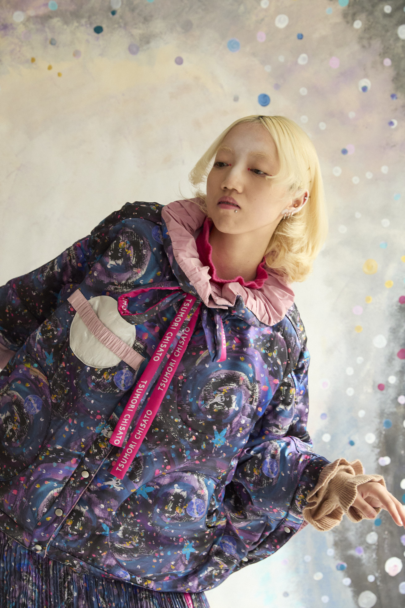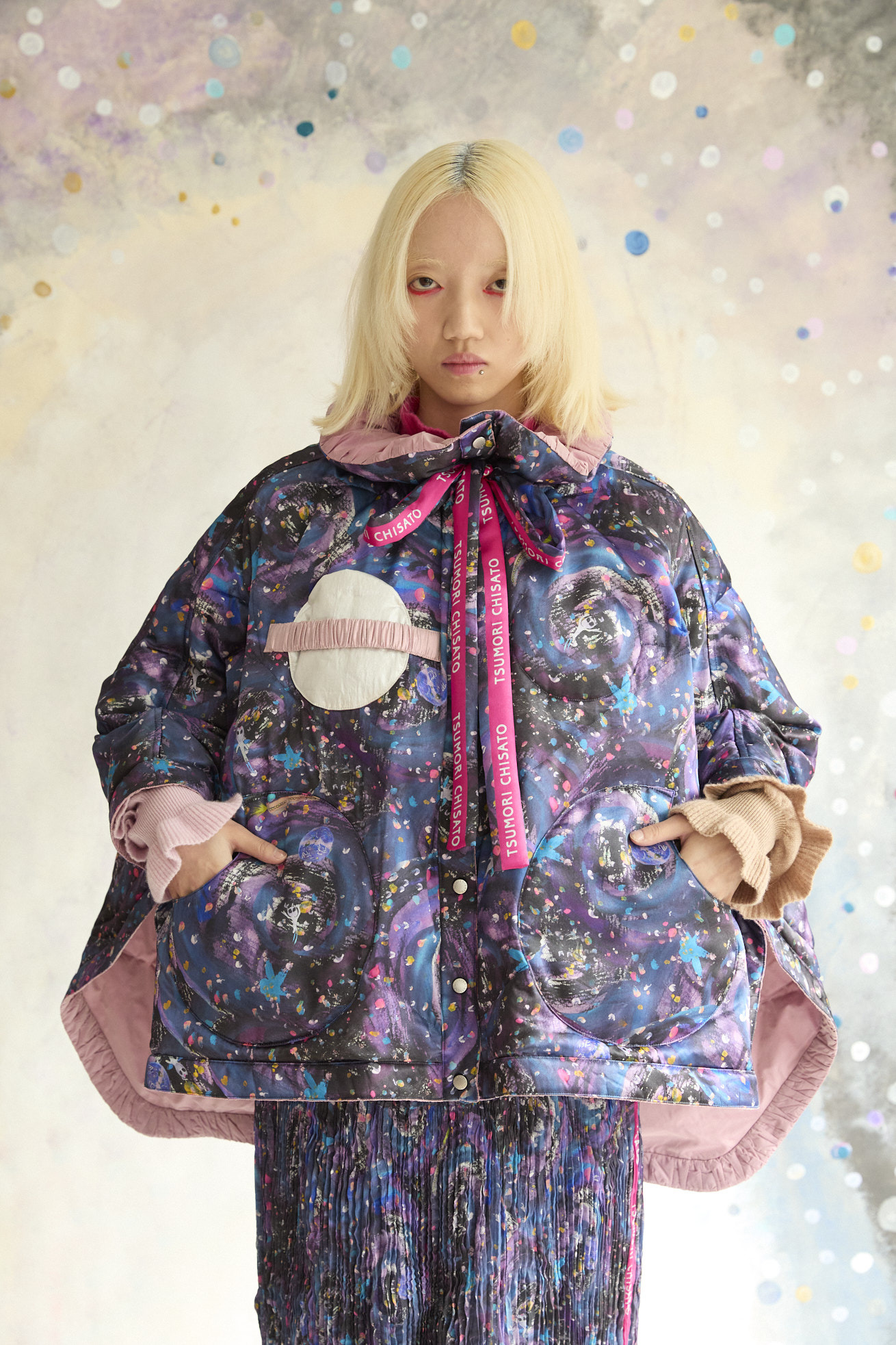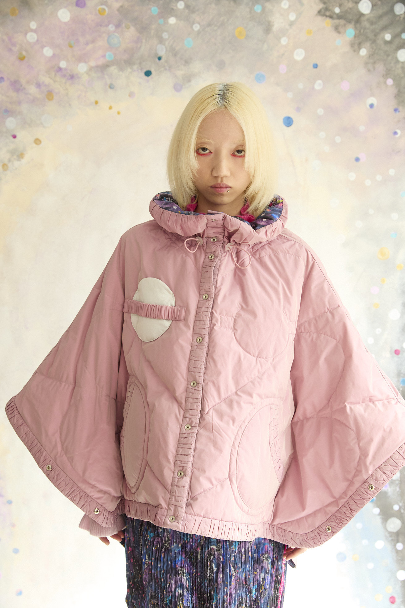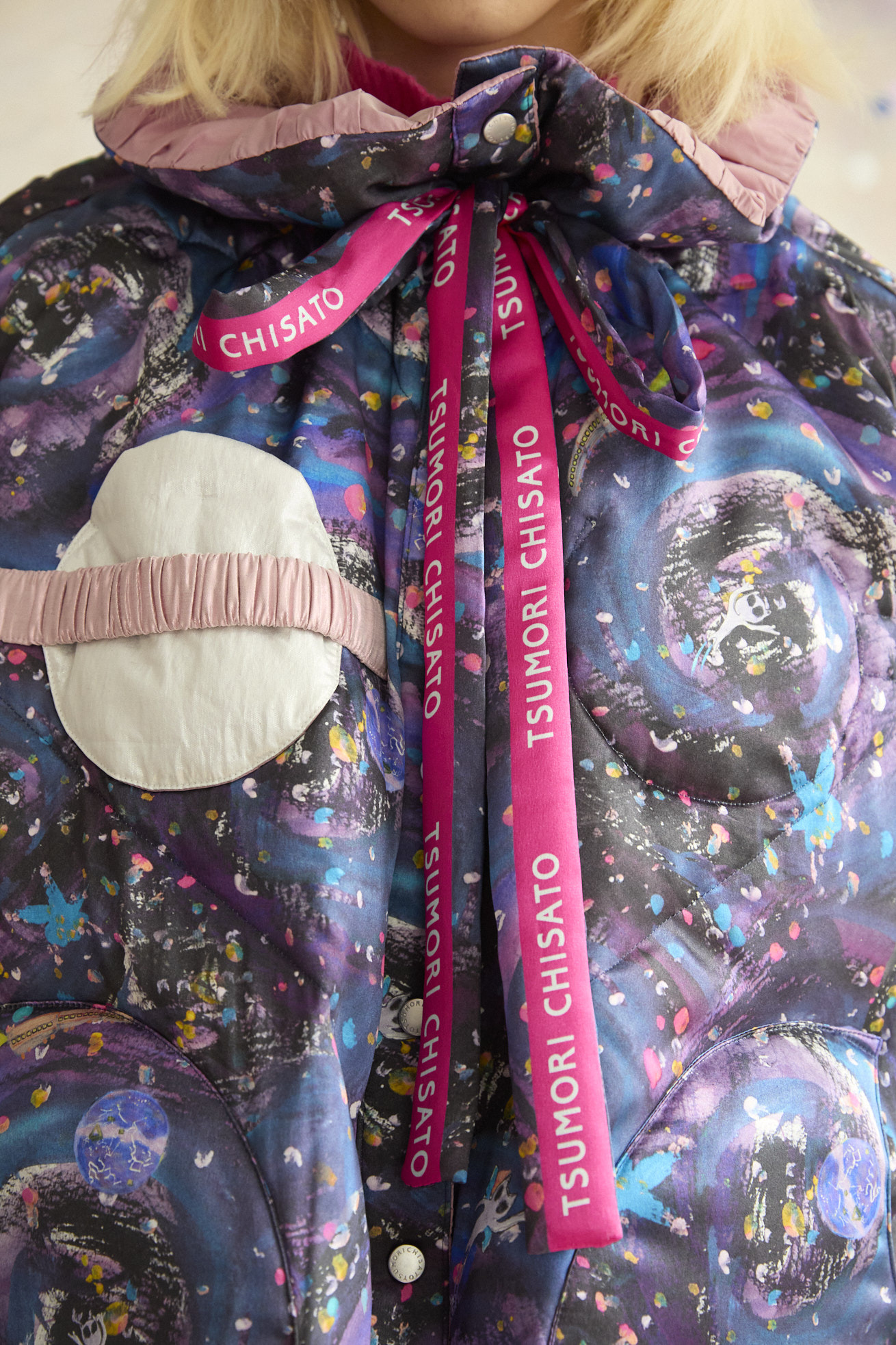 高さのあるギャザー襟がアクセントのリバーシブルダウンポンチョ。 襟は内側のゴムと表のプリント紐でシルエットの調整が可能です。 Andromeda Printのシルクサテンを使用し、カラフルでミステリアスな1枚に仕上げました。無地面も月や惑星、ハートのステッチが目を惹くデザインです。 防寒着としてはもちろん、ドレッシーでデザイン性の高いアイテムです。 スカートとしてのアレンジもお楽しみください。 <Andromeda > たくさんの星が集まるアンドロメダ星雲、いくつもの銀河が交差する世界をイメージしたプリントです。 よく見るとアンドロメダ銀河の間を駆け抜ける銀河鉄道や、ネオキャットの姿が見え、楽しく遊び心のあるキュートな一枚に仕上げました。 たくさんの星を思わせるカラフルな描写と重なり合う色が織りなすファンタジー感溢れるテキスタイルです。 ケア方法:ドライクリーニング 着用モデル身長:165cm 着用サイズ:2(M) ※表記のサイズはサンプル商品での計測の為、若干の誤差が生じます。予めご了承ください。 ※完全受注生産の為、オーダー後の変更・キャンセルはお受けしておりません。予めご了承ください。