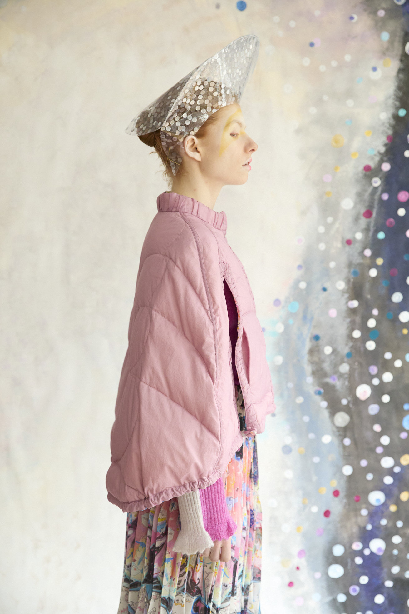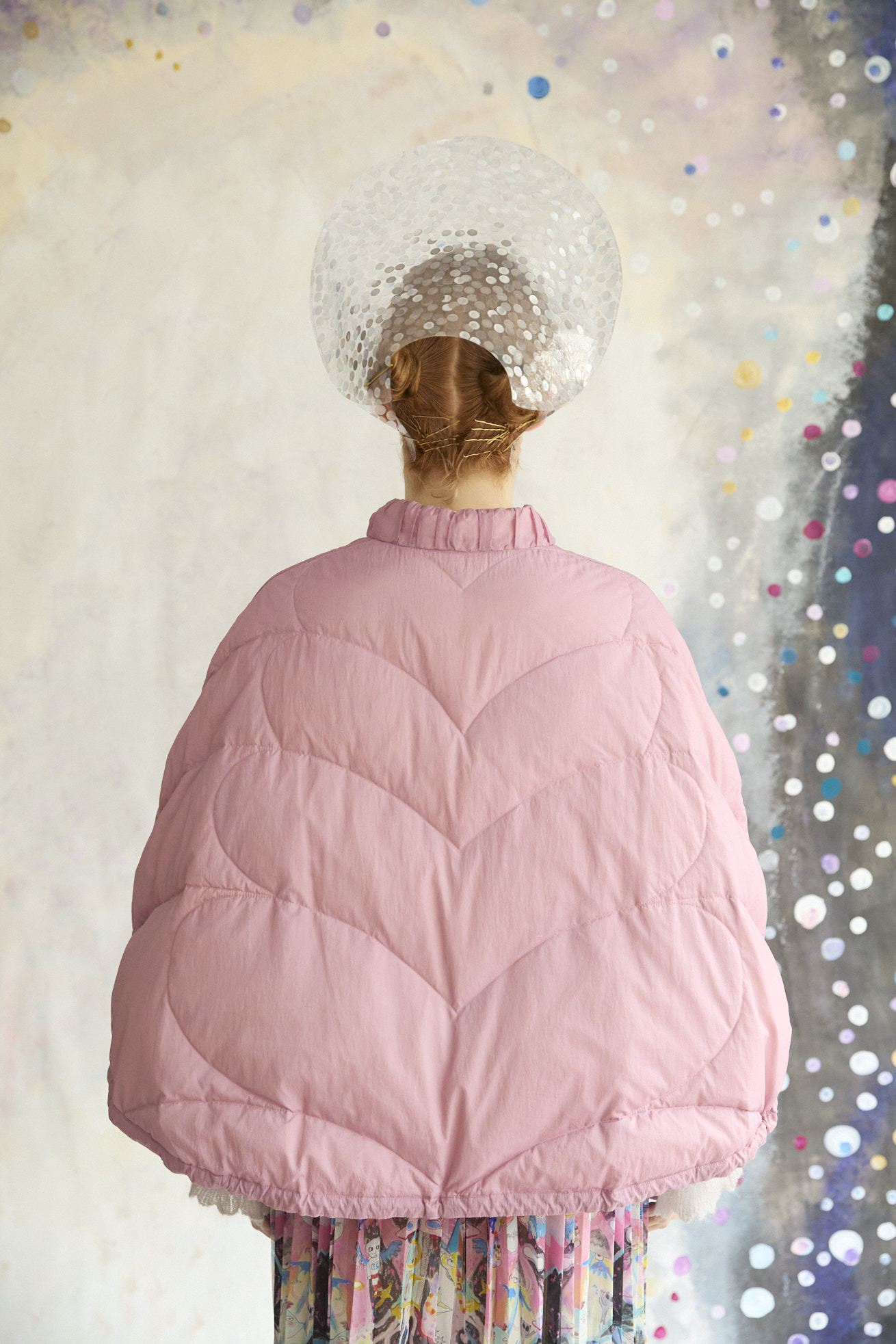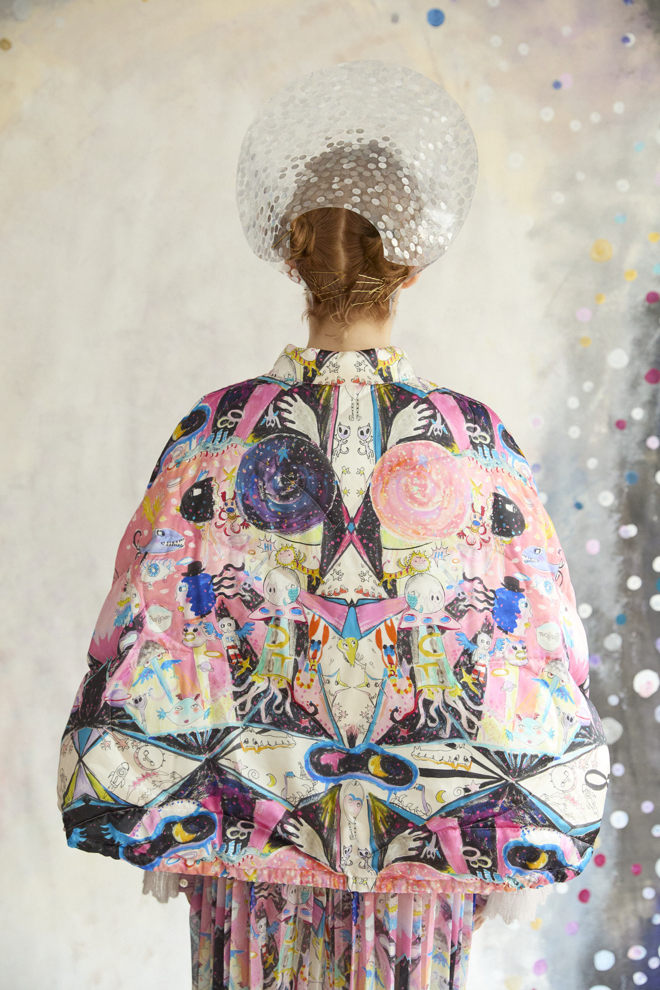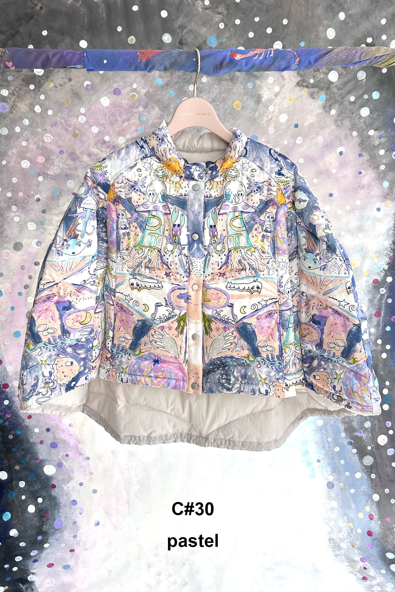 Dancing universeをシルクサテンにプリントしたケープ型ライトダウン。 コンパクトなスタンドカラーと丸くふくらみのあるシルエットが特徴です。 リバーシブルで着用でき、プリント面はもちろん、無地もハートのステッチや襟元、袖に合わせたギャザー布がデザインポイントです。 裾に紐を通し、絞ることでシルエットのアレンジや防寒性を高めることができます。 <Dancing universe> 手の翼を持った魚、足の生えたマンボウ、ウーパールーパーのようなタコ、猫の宇宙飛行士、「Bonjour」と挨拶をする帽子を被った不思議な生き物。 猫宇宙人やハート型の生き物、ライオンのような猫、ロケットに乗った猫や半魚人など、、、 鏡のようにきらめく幾何学的な宇宙の世界に、個性豊かな不思議な生き物たちが現れます。 躍動感のある踊るような宇宙の世界は、見るたびに新しいキャラクターとの出会いを楽しめる1枚。 鉛筆やペン、水彩で描いたタッチをそのままの雰囲気でインクジェットプリントで表現しています。 ケア方法:ドライクリーニング 着用モデル身長:170cm 着用サイズ:2(M) ※表記のサイズはサンプル商品での計測の為、若干の誤差が生じます。予めご了承ください。 ※完全受注生産の為、オーダー後の変更・キャンセルはお受けしておりません。予めご了承ください。