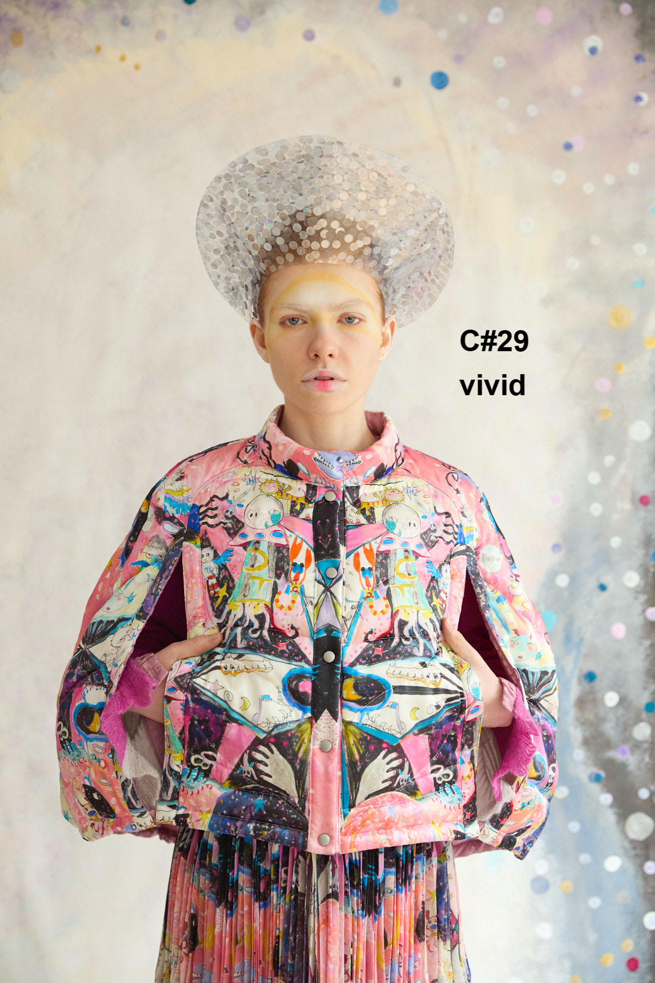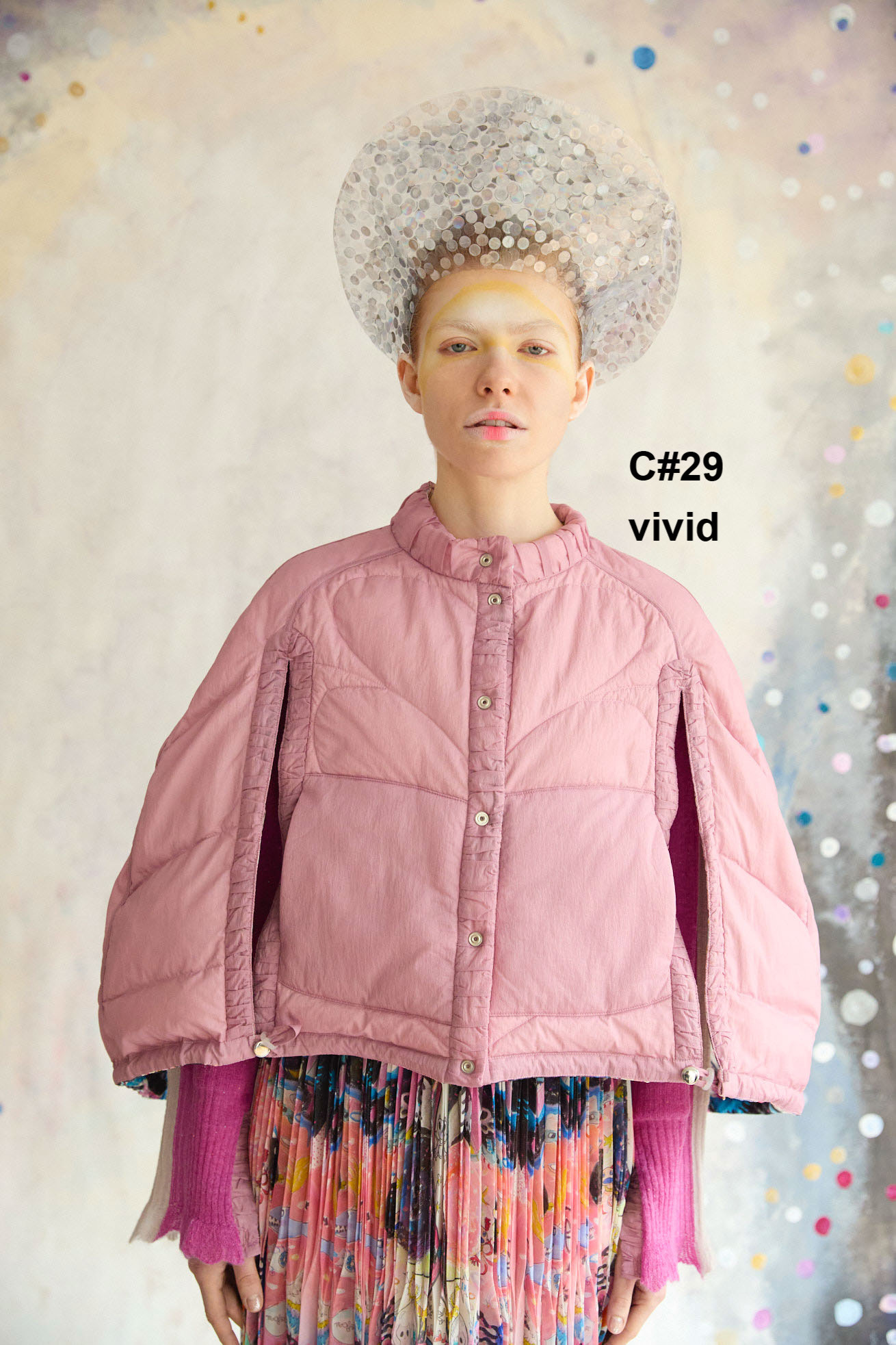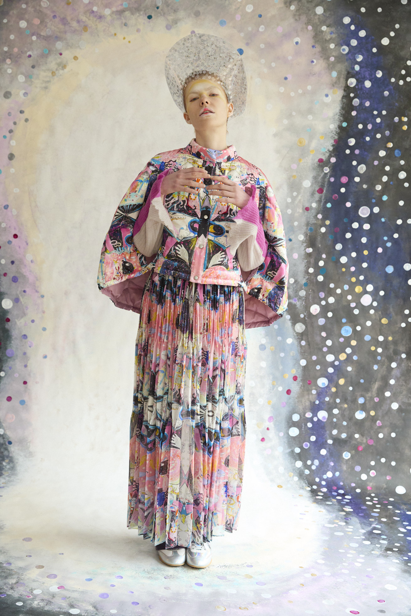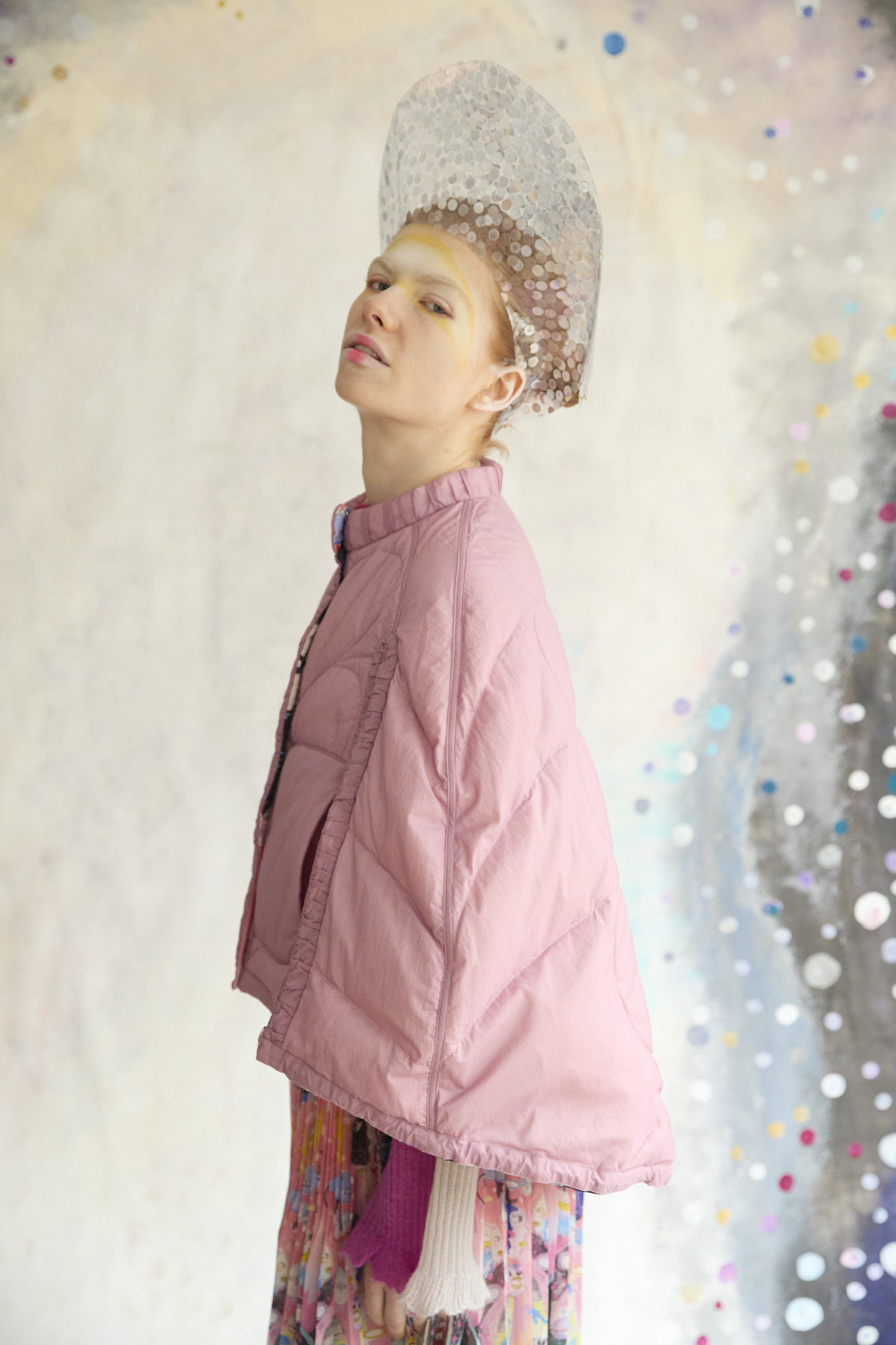 Dancing universeをシルクサテンにプリントしたケープ型ライトダウン。 コンパクトなスタンドカラーと丸くふくらみのあるシルエットが特徴です。 リバーシブルで着用でき、プリント面はもちろん、無地もハートのステッチや襟元、袖に合わせたギャザー布がデザインポイントです。 裾に紐を通し、絞ることでシルエットのアレンジや防寒性を高めることができます。 <Dancing universe> 手の翼を持った魚、足の生えたマンボウ、ウーパールーパーのようなタコ、猫の宇宙飛行士、「Bonjour」と挨拶をする帽子を被った不思議な生き物。 猫宇宙人やハート型の生き物、ライオンのような猫、ロケットに乗った猫や半魚人など、、、 鏡のようにきらめく幾何学的な宇宙の世界に、個性豊かな不思議な生き物たちが現れます。 躍動感のある踊るような宇宙の世界は、見るたびに新しいキャラクターとの出会いを楽しめる1枚。 鉛筆やペン、水彩で描いたタッチをそのままの雰囲気でインクジェットプリントで表現しています。 ケア方法:ドライクリーニング 着用モデル身長:170cm 着用サイズ:2(M) ※表記のサイズはサンプル商品での計測の為、若干の誤差が生じます。予めご了承ください。 ※完全受注生産の為、オーダー後の変更・キャンセルはお受けしておりません。予めご了承ください。