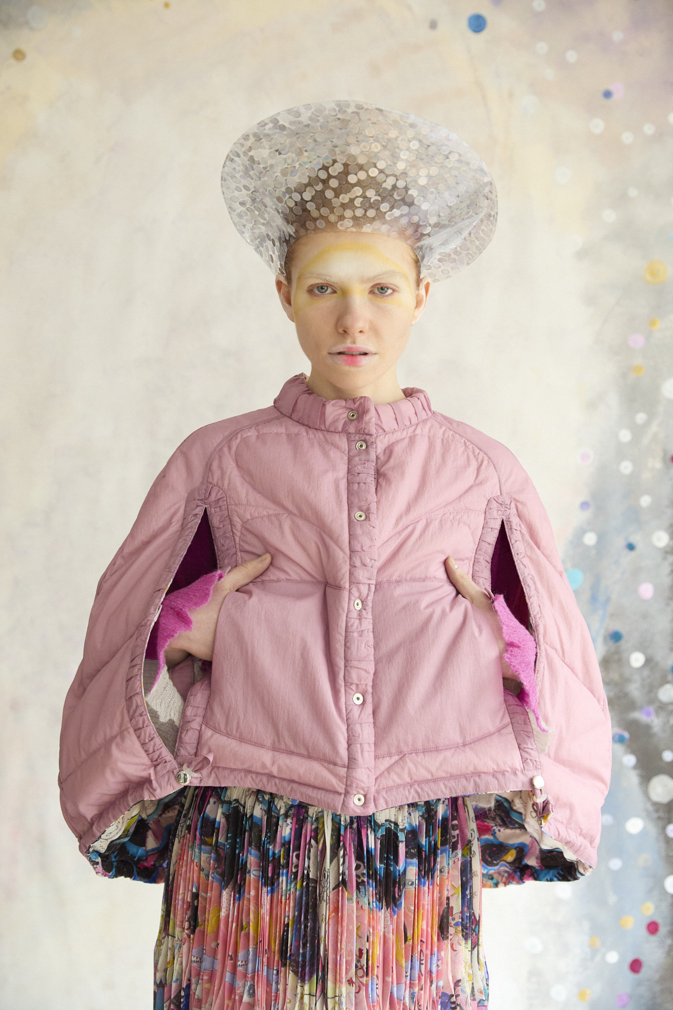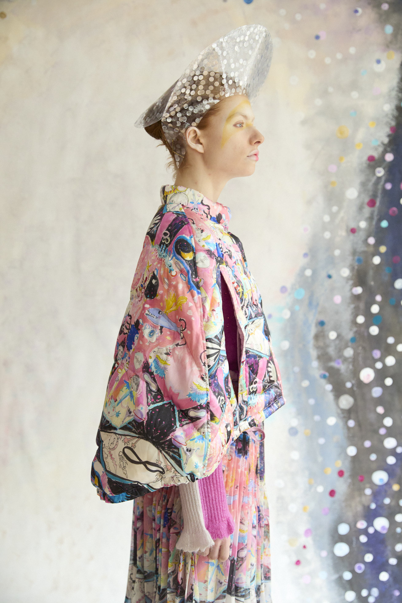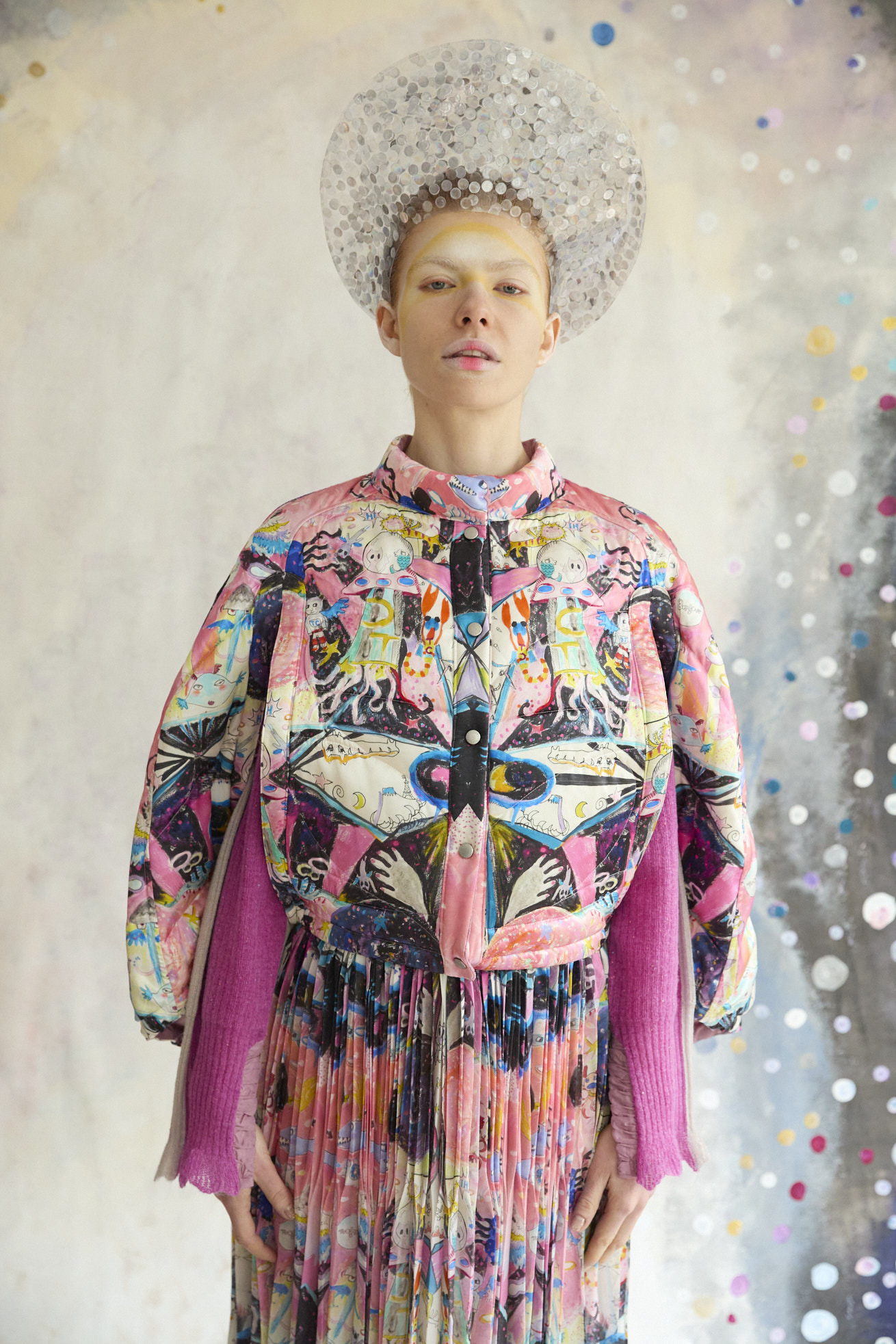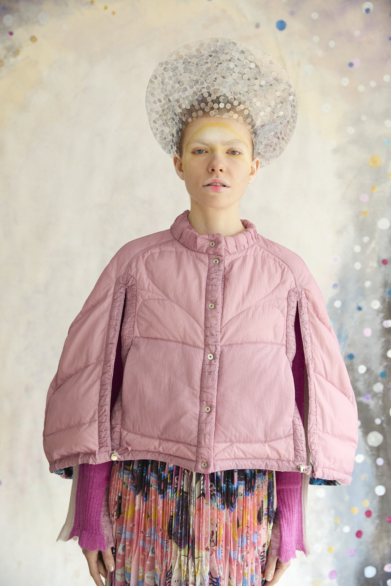 Dancing universeをシルクサテンにプリントしたケープ型ライトダウン。 コンパクトなスタンドカラーと丸くふくらみのあるシルエットが特徴です。 リバーシブルで着用でき、プリント面はもちろん、無地もハートのステッチや襟元、袖に合わせたギャザー布がデザインポイントです。 裾に紐を通し、絞ることでシルエットのアレンジや防寒性を高めることができます。 <Dancing universe> 手の翼を持った魚、足の生えたマンボウ、ウーパールーパーのようなタコ、猫の宇宙飛行士、「Bonjour」と挨拶をする帽子を被った不思議な生き物。 猫宇宙人やハート型の生き物、ライオンのような猫、ロケットに乗った猫や半魚人など、、、 鏡のようにきらめく幾何学的な宇宙の世界に、個性豊かな不思議な生き物たちが現れます。 躍動感のある踊るような宇宙の世界は、見るたびに新しいキャラクターとの出会いを楽しめる1枚。 鉛筆やペン、水彩で描いたタッチをそのままの雰囲気でインクジェットプリントで表現しています。 ケア方法:ドライクリーニング 着用モデル身長:170cm 着用サイズ:2(M) ※表記のサイズはサンプル商品での計測の為、若干の誤差が生じます。予めご了承ください。 ※完全受注生産の為、オーダー後の変更・キャンセルはお受けしておりません。予めご了承ください。