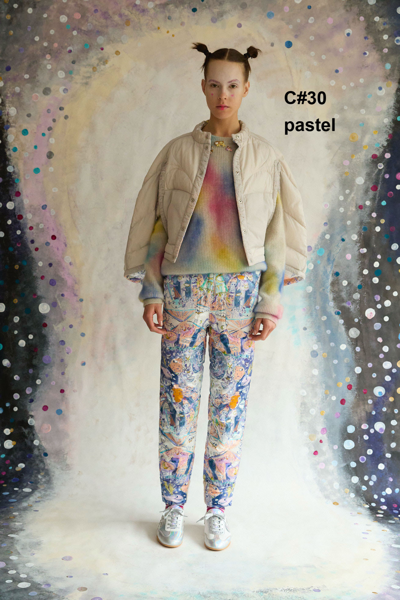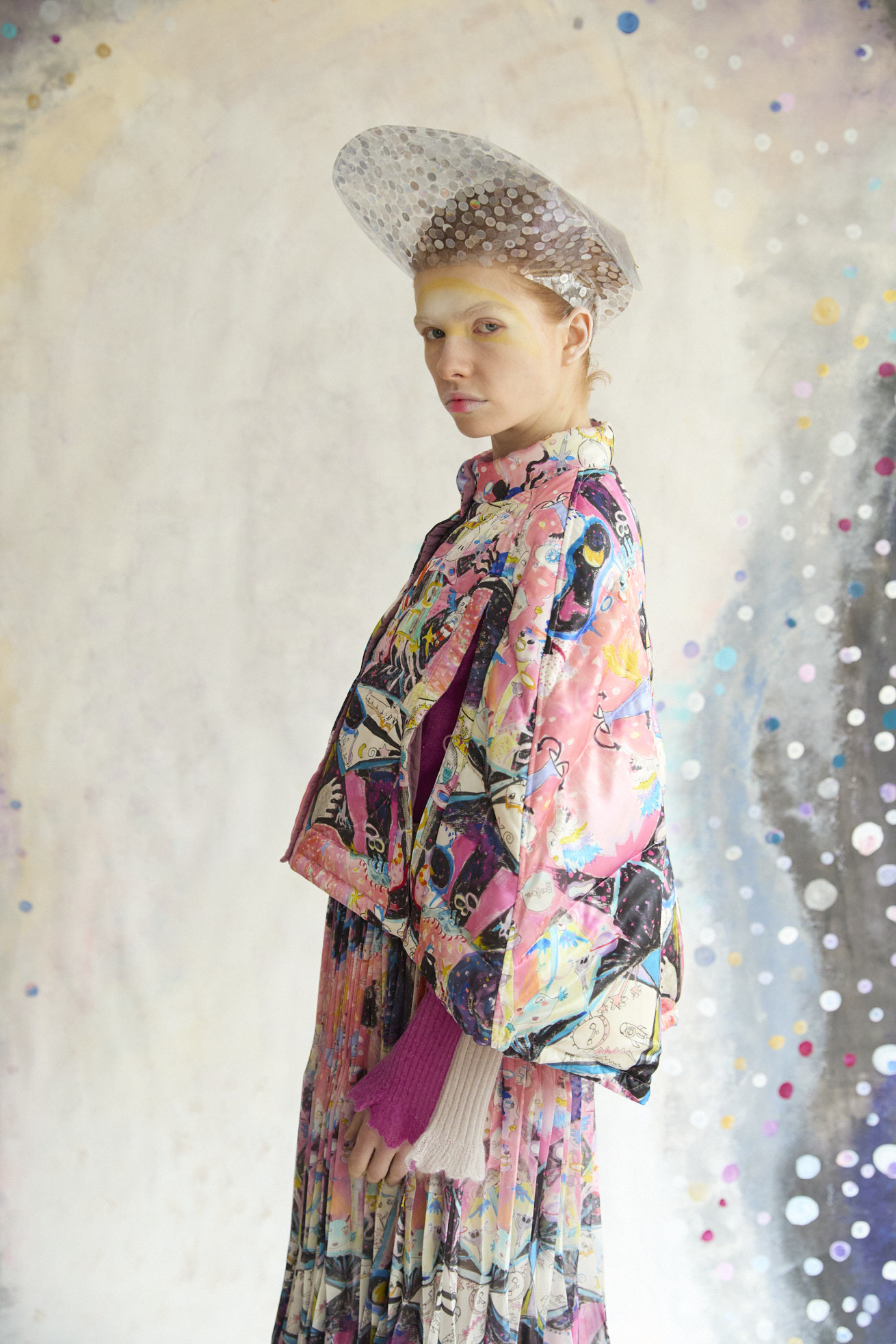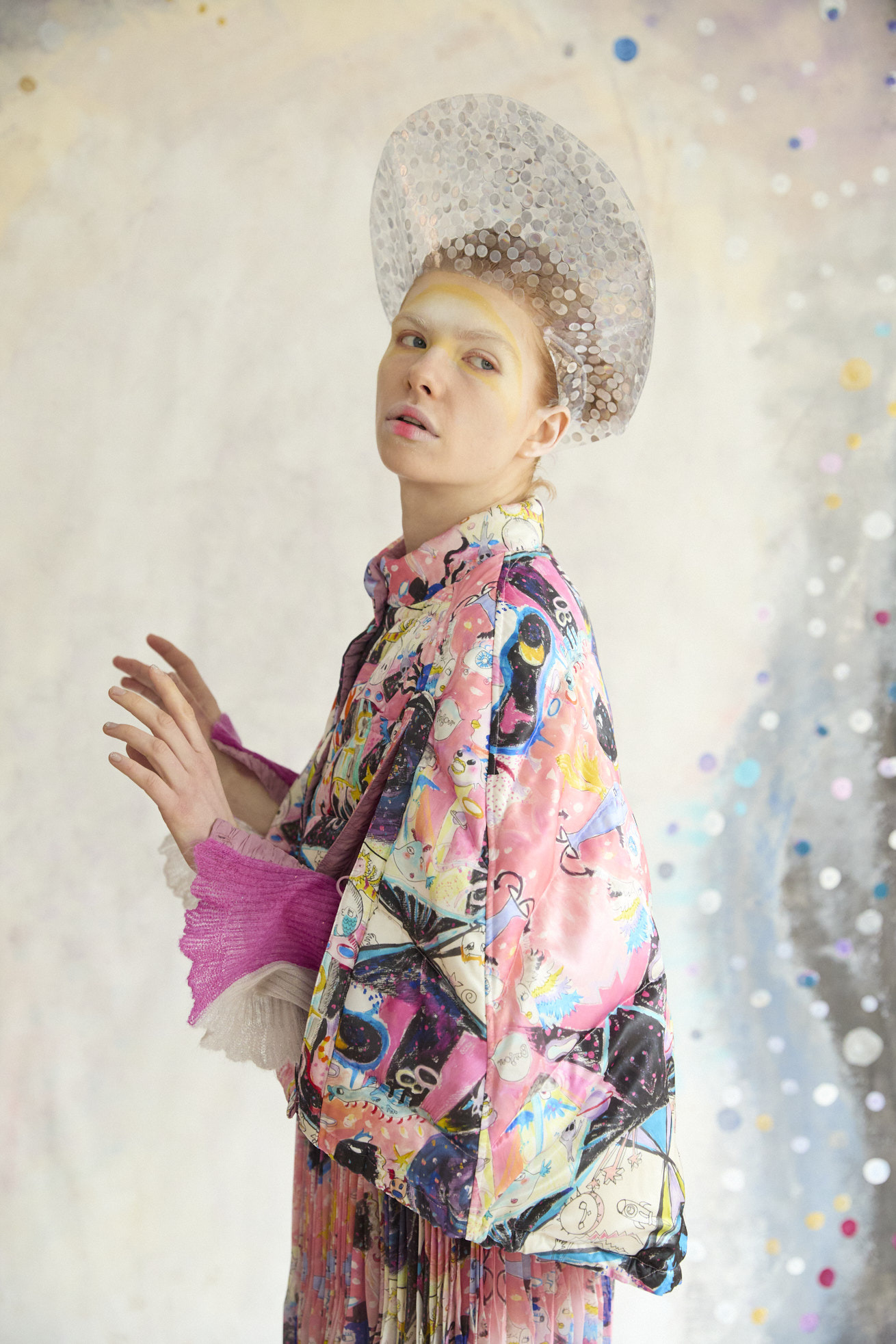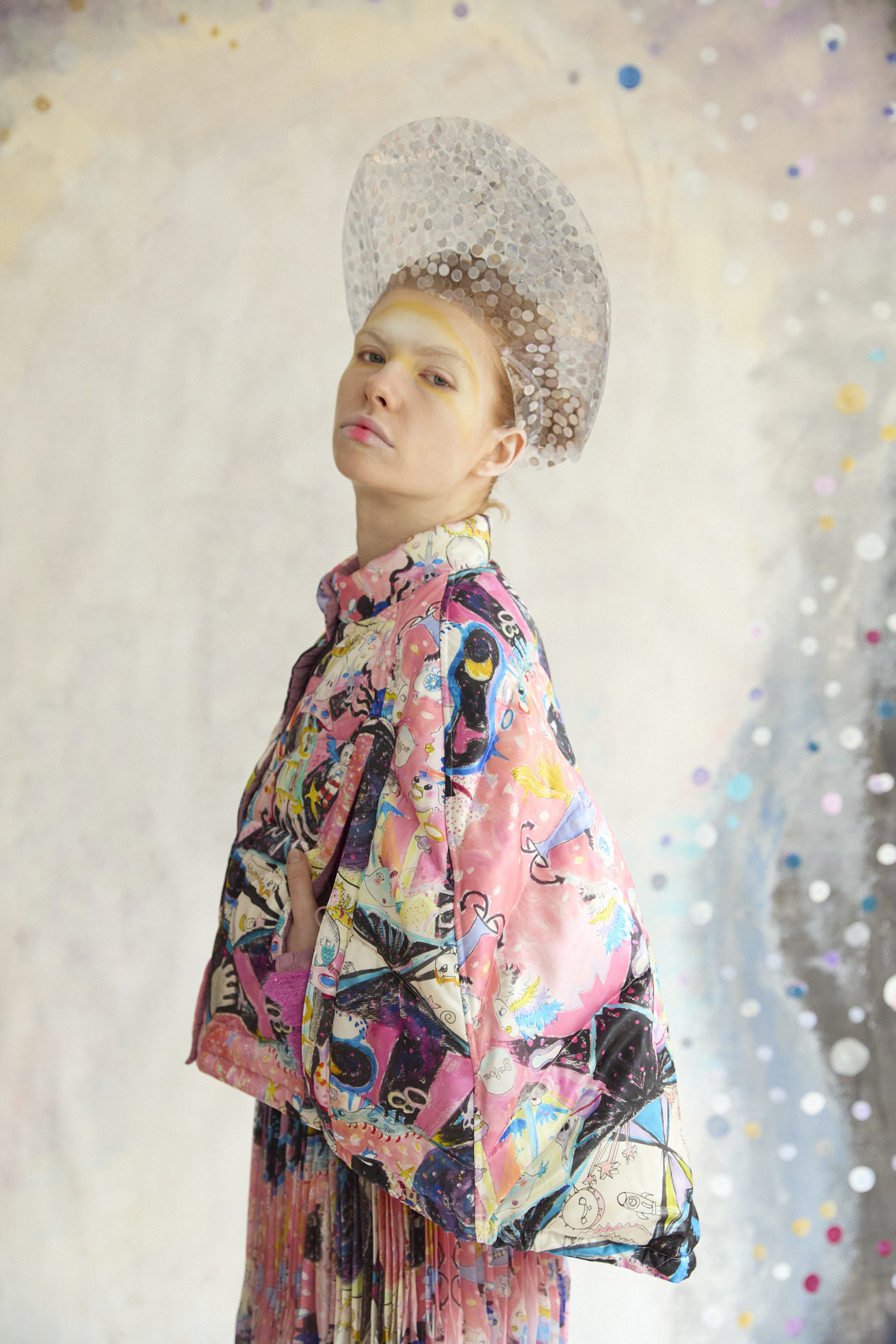 Dancing universeをシルクサテンにプリントしたケープ型ライトダウン。 コンパクトなスタンドカラーと丸くふくらみのあるシルエットが特徴です。 リバーシブルで着用でき、プリント面はもちろん、無地もハートのステッチや襟元、袖に合わせたギャザー布がデザインポイントです。 裾に紐を通し、絞ることでシルエットのアレンジや防寒性を高めることができます。 <Dancing universe> 手の翼を持った魚、足の生えたマンボウ、ウーパールーパーのようなタコ、猫の宇宙飛行士、「Bonjour」と挨拶をする帽子を被った不思議な生き物。 猫宇宙人やハート型の生き物、ライオンのような猫、ロケットに乗った猫や半魚人など、、、 鏡のようにきらめく幾何学的な宇宙の世界に、個性豊かな不思議な生き物たちが現れます。 躍動感のある踊るような宇宙の世界は、見るたびに新しいキャラクターとの出会いを楽しめる1枚。 鉛筆やペン、水彩で描いたタッチをそのままの雰囲気でインクジェットプリントで表現しています。 ケア方法:ドライクリーニング 着用モデル身長:170cm 着用サイズ:2(M) ※表記のサイズはサンプル商品での計測の為、若干の誤差が生じます。予めご了承ください。 ※完全受注生産の為、オーダー後の変更・キャンセルはお受けしておりません。予めご了承ください。