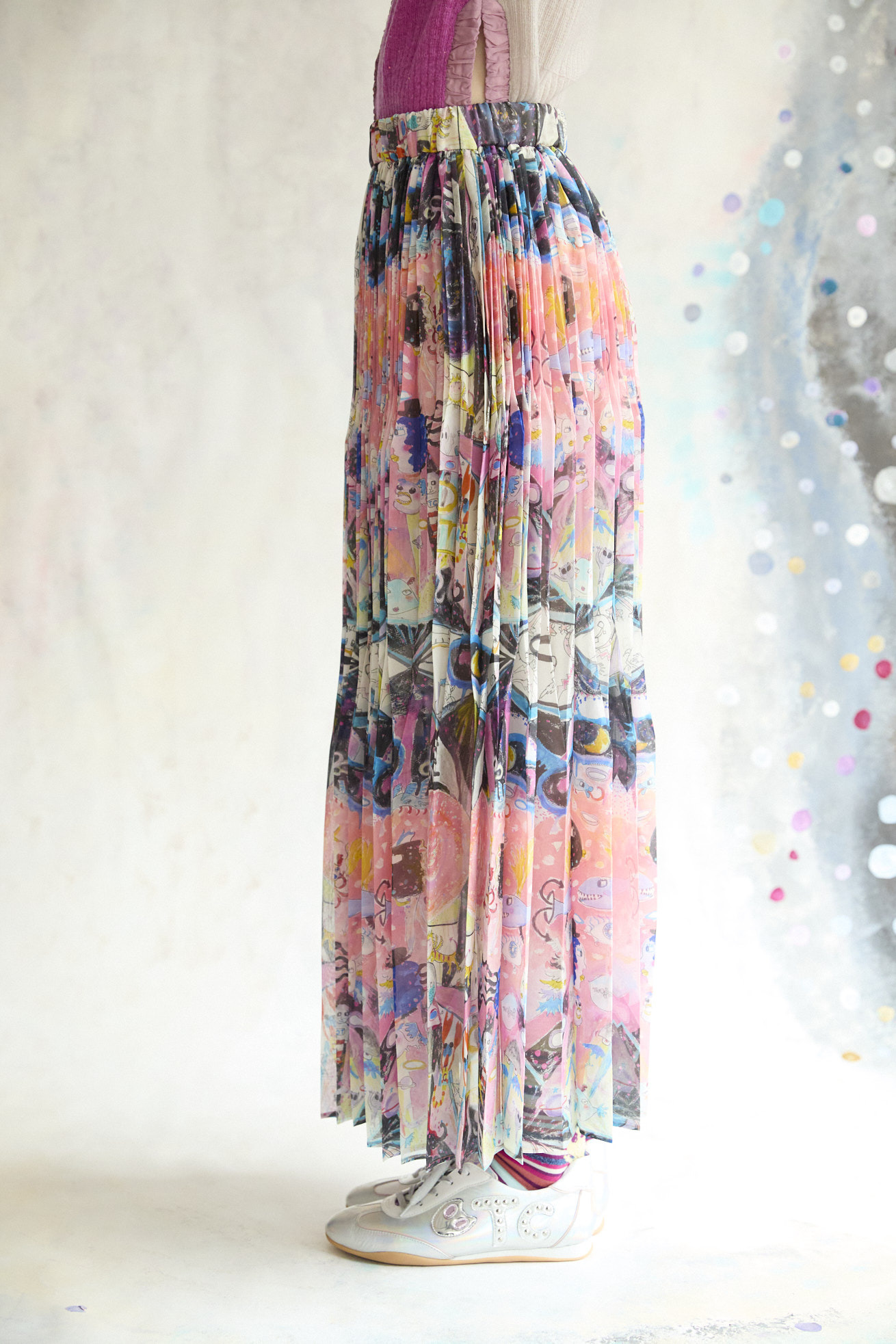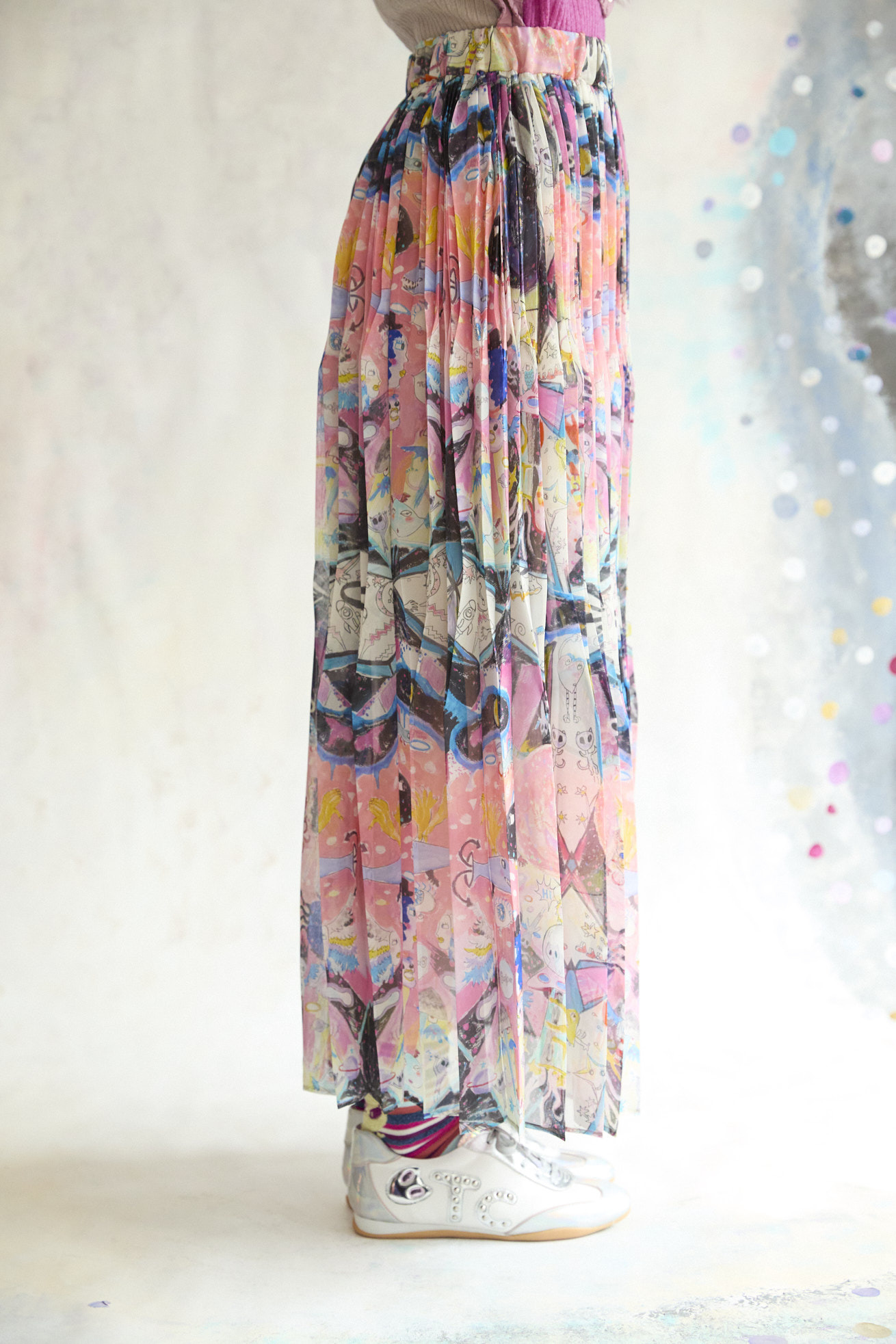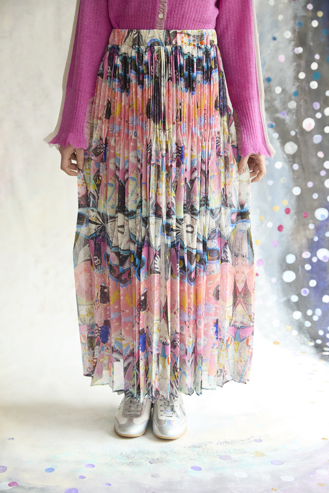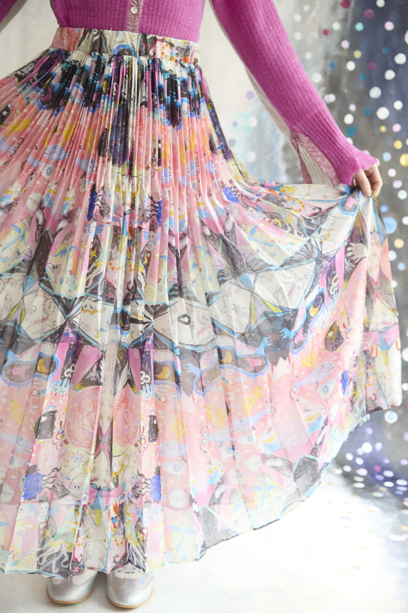 軽やかなシルクシフォン素材を贅沢に使用した、Dancing universeの総柄プリーツロングスカート。 シルクシフォンの華やかさと軽やかさを合わせ、歩くたびにふわりと揺れる繊細なプリーツが、女性らしい1枚です。 透け感のあるエアリーな質感と、奥行きのあるデザインが印象的。 プリーツは手作業で一点ずつハンドプリーツをかけた手の込んだアイテムです。手作業ならではの均一すぎないプリーツが、奥行きと陰影を生み出します。 ウエストがゴム仕様で履きやすく、インナースカート付き。 <Dancing universe> 手の翼を持った魚、足の生えたマンボウ、ウーパールーパーのようなタコ、猫の宇宙飛行士、「Bonjour」と挨拶をする帽子を被った不思議な生き物。 猫宇宙人やハート型の生き物、ライオンのような猫、ロケットに乗った猫や半魚人など、、、 鏡のようにきらめく幾何学的な宇宙の世界に、個性豊かな不思議な生き物たちが現れます。 躍動感のある踊るような宇宙の世界は、見るたびに新しいキャラクターとの出会いを楽しめる1枚。 鉛筆やペン、水彩で描いたタッチをそのままの雰囲気でインクジェットプリントで表現しています。 ケア方法:ドライクリーニング 着用モデル身長:170cm 着用サイズ:2(M) ※表記のサイズはサンプル商品での計測の為、若干の誤差が生じます。予めご了承ください。 ※完全受注生産の為、オーダー後の変更・キャンセルはお受けしておりません。予めご了承ください。