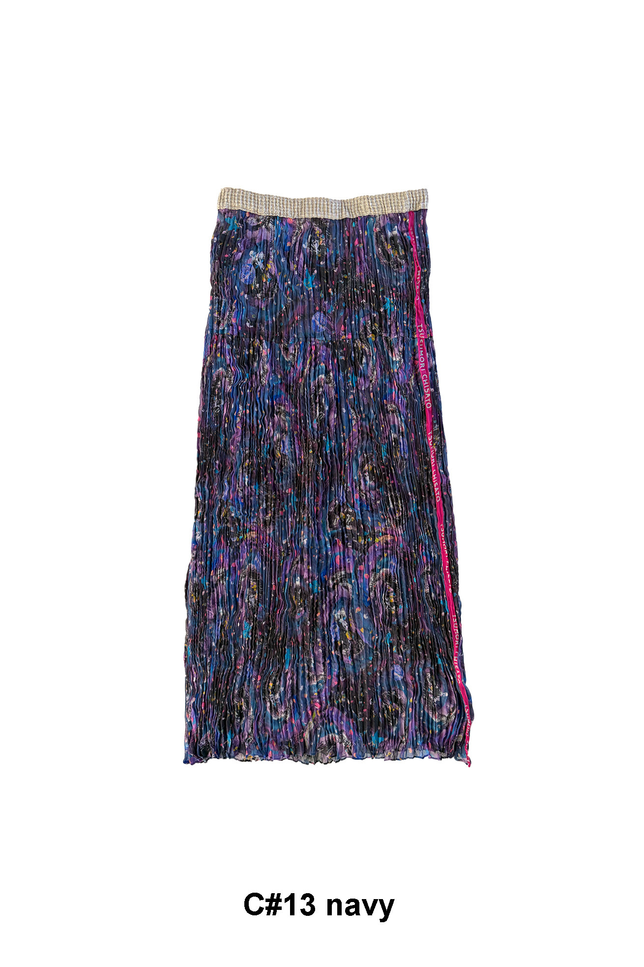 Andromeda Printのシルクシフォンを使用したプリーツスカート。 生地をたっぷり使い、細かいプリーツに仕上げることで、スッキリとしたラインと動きやすさの両立を実現。嫌なフィット感がなく着用できます。 プリーツは手作業で一点ずつハンドプリーツをかけた手の込んだアイテムです。手作業ならではの均一すぎないプリーツが、奥行きと陰影を生み出します。 ラメ入りのウエストゴム、サイドの配色になったロゴのラインがアクセントになっています。 <Andromeda > たくさんの星が集まるアンドロメダ星雲、いくつもの銀河が交差する世界をイメージしたプリントです。 よく見るとアンドロメダ銀河の間を駆け抜ける銀河鉄道や、ネオキャットの姿が見え、楽しく遊び心のあるキュートな一枚に仕上げました。 たくさんの星を思わせるカラフルな描写と重なり合う色が織りなすファンタジー感溢れるテキスタイルです。 ケア方法:ドライクリーニング 着用モデル身長:165cm 着用サイズ:2(M) ※表記のサイズはサンプル商品での計測の為、若干の誤差が生じます。予めご了承ください。 ※完全受注生産の為、オーダー後の変更・キャンセルはお受けしておりません。予めご了承ください。