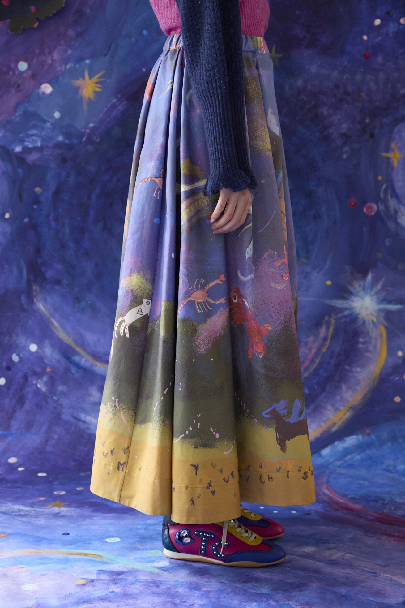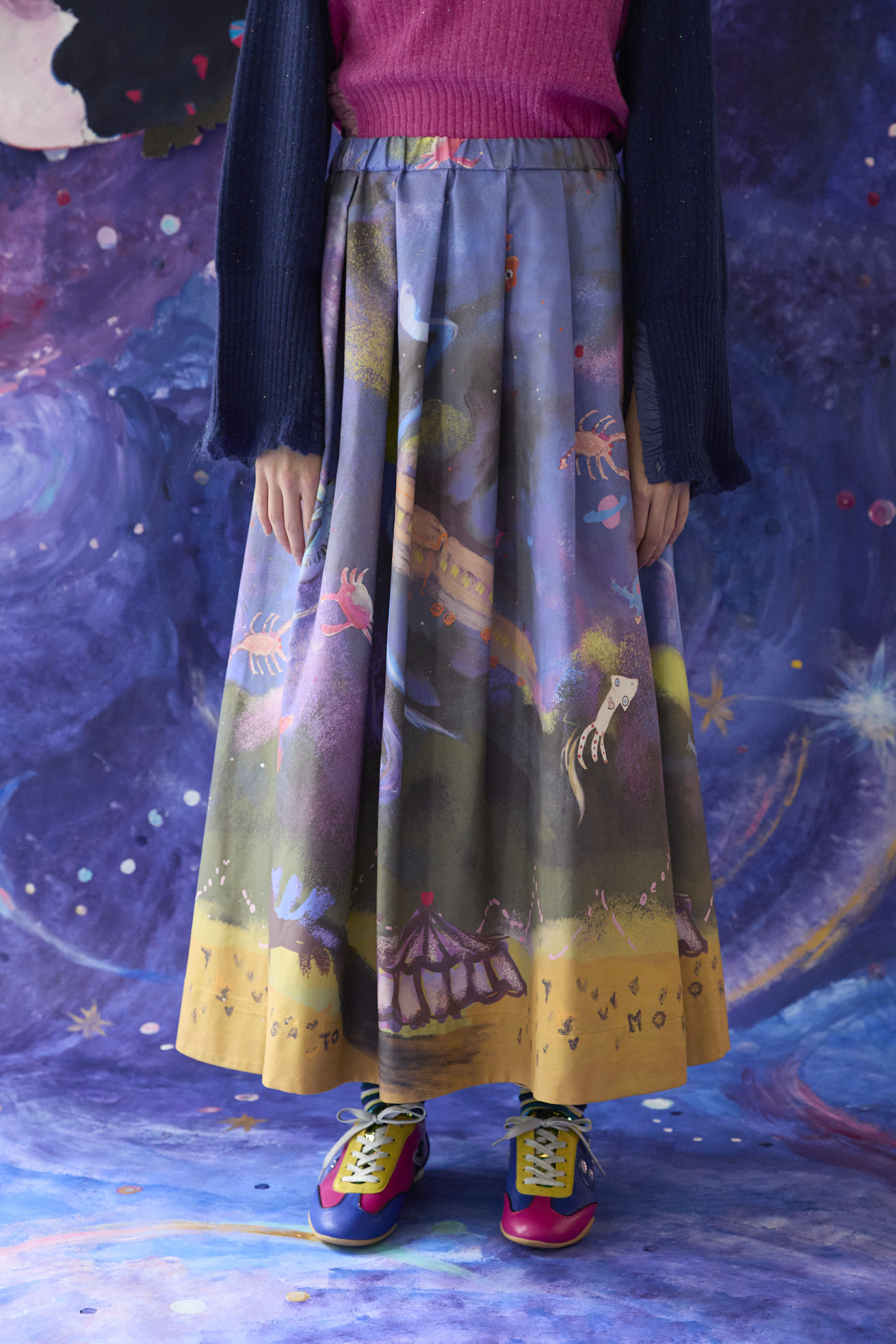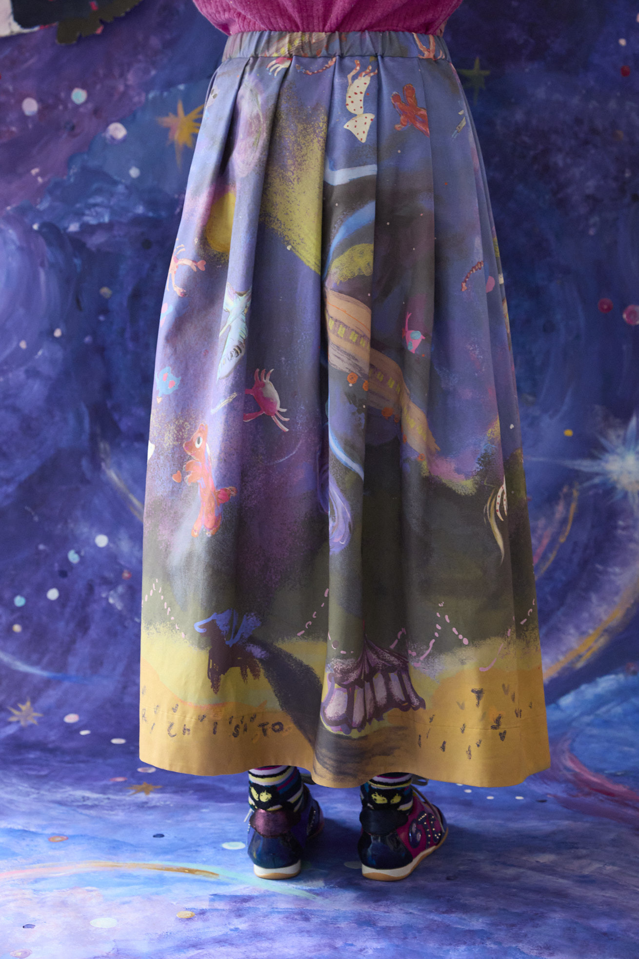 Space trainのキュプラコットンギャバを使用したタック入りフレアスカート。 ウエストはゴム仕様で履きやすく、内側に紐を通してサイズ感を調整できます。 コットンキュプラならではのきれいな落ち感と立体的なシルエット、着用時のシワが目立ちにくいのもポイントです。 生地分量がありながら重くなく、広がりすぎないシルエットに設計しています。 <Space train > 大きな翼を広げた白鳥、ハートを持った熊や蟹、しっぽがハート型のさそり、キュートなイカや星雲から顔を出すネオキャットなど、、、 空の星座を思わせる生き物や、空想の宇宙の生き物たちが踊るようにふわふわと飛び交う銀河の世界を旅をする銀河鉄道の列車。 大きく広がる大地にはペガサスと不思議なテントがたたずみ、物語のワンシーンのようなファンタジー溢れる景色が広がります。 手描きならではの線や色のニュアンスを生かし、インクジェットプリントで表現しました。 素材はしなやかで程よい光沢感のあるキュプラコットンギャバを使用。京都でプリント加工をしています。 ケア方法:ドライクリーニング 着用モデル身長:173cm 着用サイズ:2(M) ※生地のプリントの出方は商品ごとに異なります。柄はお選びいただけませんので予めご了承ください。 ※表記のサイズはサンプル商品での計測の為、若干の誤差が生じます。予めご了承ください。 ※完全受注生産の為、オーダー後の変更・キャンセルはお受けしておりません。予めご了承ください。