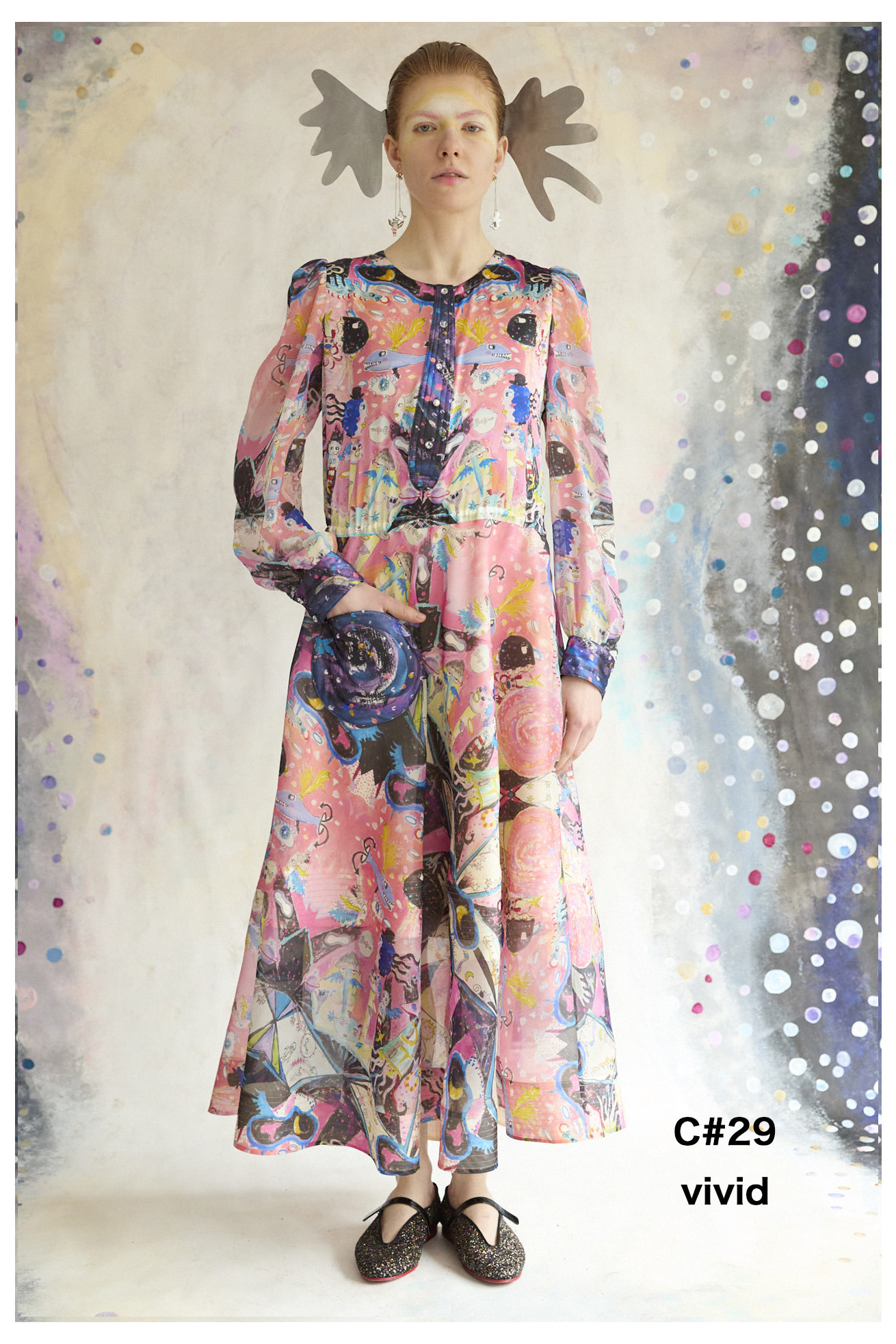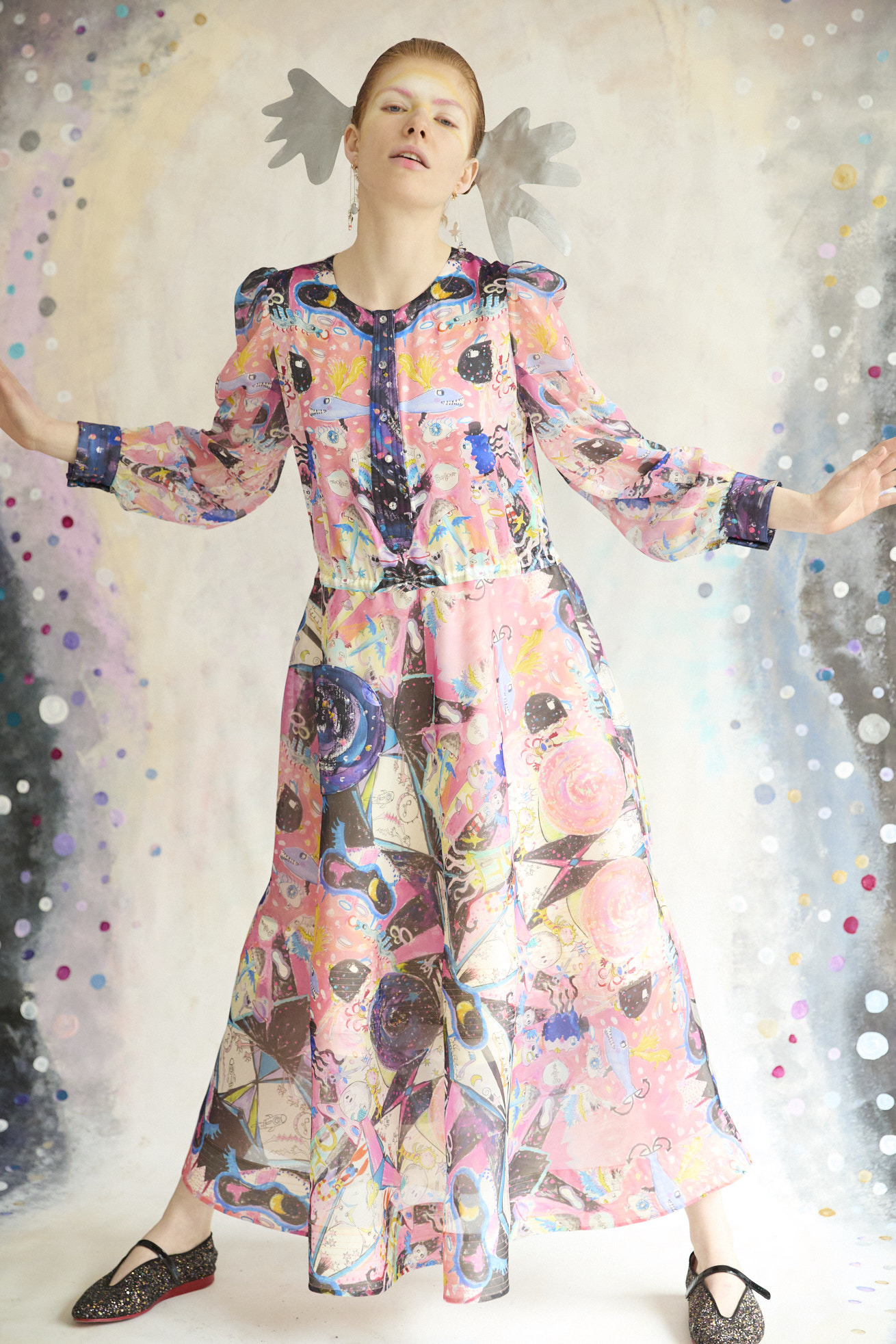 シルクシフォン、オーガンジー、サテンのDancing universe生地を合わせたノーカラーのロングドレス。 身頃には光沢感と透け感を気にせず着れるシルクサテン、袖は軽さのあるシルクシフォン、スカートはふんわりとナチュラルなハリ感がキレイなシルクオーガンジーを使用しています。 スカートは裾にかけて2ヶ所、太めのステッチを入れることで広がりすぎずにキレイなシルエットを作っています。 前立てとポケットにはAndromeda生地を合わせアクセントに。ウエスト内側にはゴムとストッパーをつけ、シルエットを調整できます。 スカート部分のみ裏地付きで1枚で着用できます。 <Dancing universe> 手の翼を持った魚、足の生えたマンボウ、ウーパールーパーのようなタコ、猫の宇宙飛行士、「Bonjour」と挨拶をする帽子を被った不思議な生き物。 猫宇宙人やハート型の生き物、ライオンのような猫、ロケットに乗った猫や半魚人など、、、 鏡のようにきらめく幾何学的な宇宙の世界に、個性豊かな不思議な生き物たちが現れます。 躍動感のある踊るような宇宙の世界は、見るたびに新しいキャラクターとの出会いを楽しめる1枚。 鉛筆やペン、水彩で描いたタッチをそのままの雰囲気でインクジェットプリントで表現しています。 <Andromeda > たくさんの星が集まるアンドロメダ星雲、いくつもの銀河が交差する世界をイメージしたプリントです。 よく見るとアンドロメダ銀河の間を駆け抜ける銀河鉄道や、ネオキャットの姿が見え、楽しく遊び心のあるキュートな一枚に仕上げました。 たくさんの星を思わせるカラフルな描写と重なり合う色が織りなすファンタジー感溢れるテキスタイルです。 ケア方法:ドライクリーニング 着用モデル身長:170cm 着用サイズ:2(M) ※表記のサイズはサンプル商品での計測の為、若干の誤差が生じます。予めご了承ください。 ※完全受注生産の為、オーダー後の変更・キャンセルはお受けしておりません。予めご了承ください。