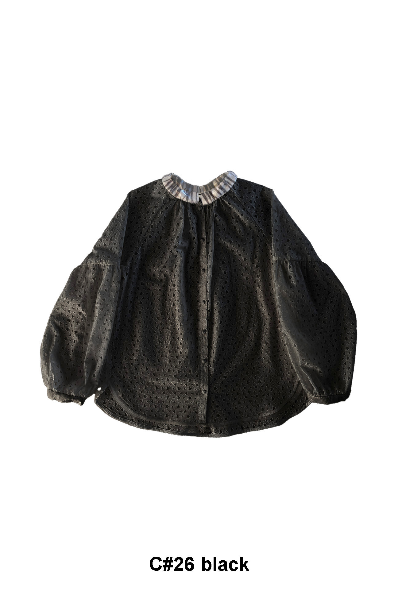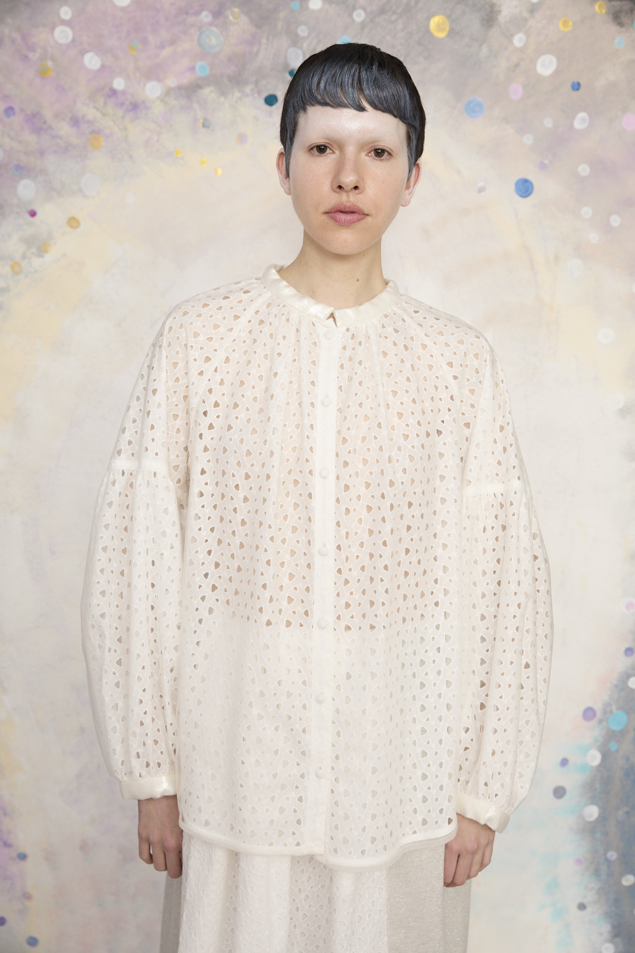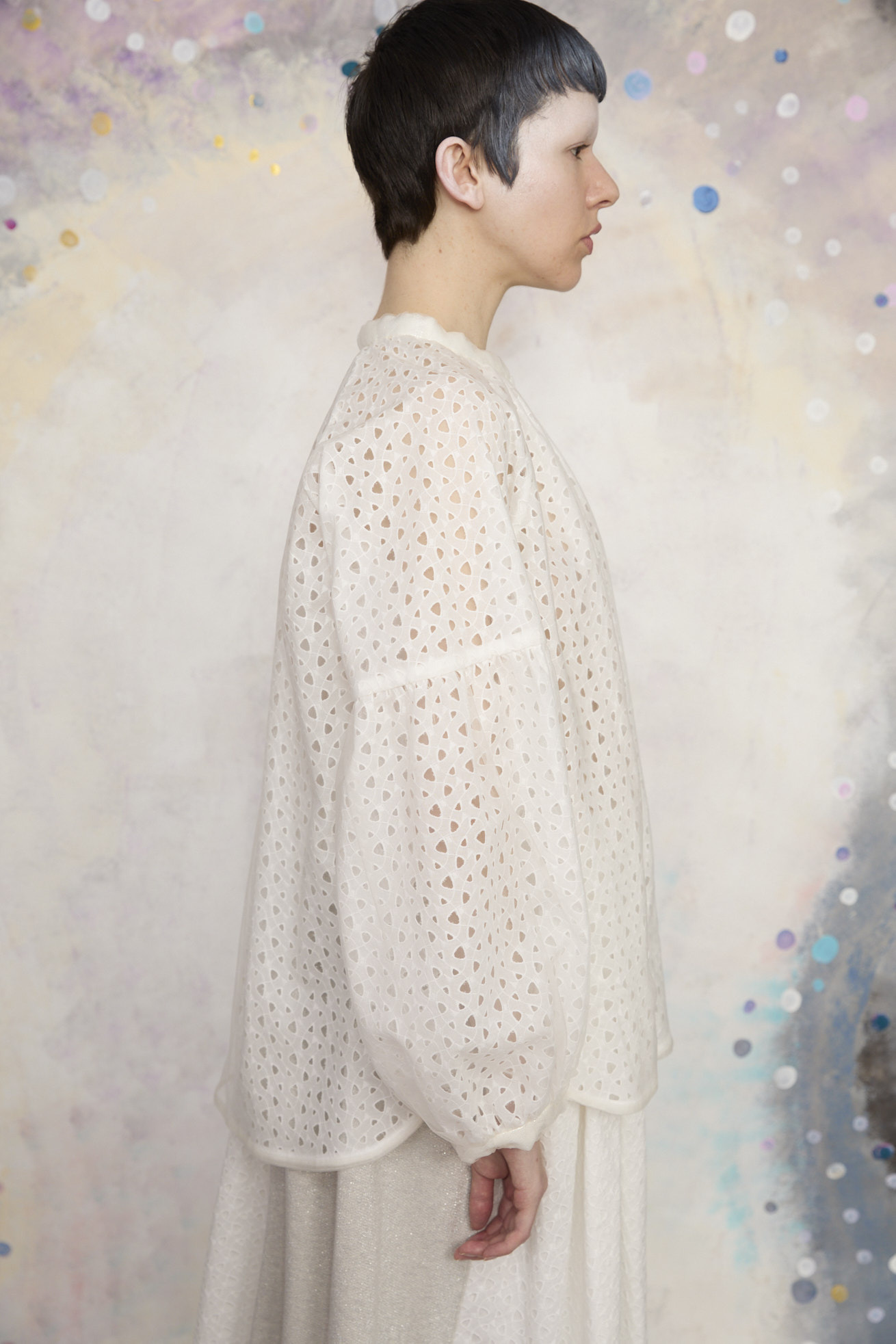 袖の切り替えから広がるゆったりシルエットのスタンドカラーシャツ。 特徴的な生地は、三角形のくるくるとしたモチーフが連なった、グラフィカルなコットン100%のレース生地。一筆書きのように続くラインがリズムを生み、どこか星の軌道図を思わせるさりげない遊び心のある柄に仕上がっています。このレース生地の上にナイロンチュールを重ねることで柄をやわらかく包み込み、透け感に軽さとまとまりをプラスしています。 サイドの丸いスリット、襟元や袖口にラメ生地を合わせてスペイシー感とアクセントを加えています。 長めの着丈で1枚でも、羽織としてもご利用いただけます。 ケア方法:ドライクリーニング 着用モデル身長:173cm 着用サイズ:2(M) ※表記のサイズはサンプル商品での計測の為、若干の誤差が生じます。予めご了承ください。 ※完全受注生産の為、オーダー後の変更・キャンセルはお受けしておりません。予めご了承ください。