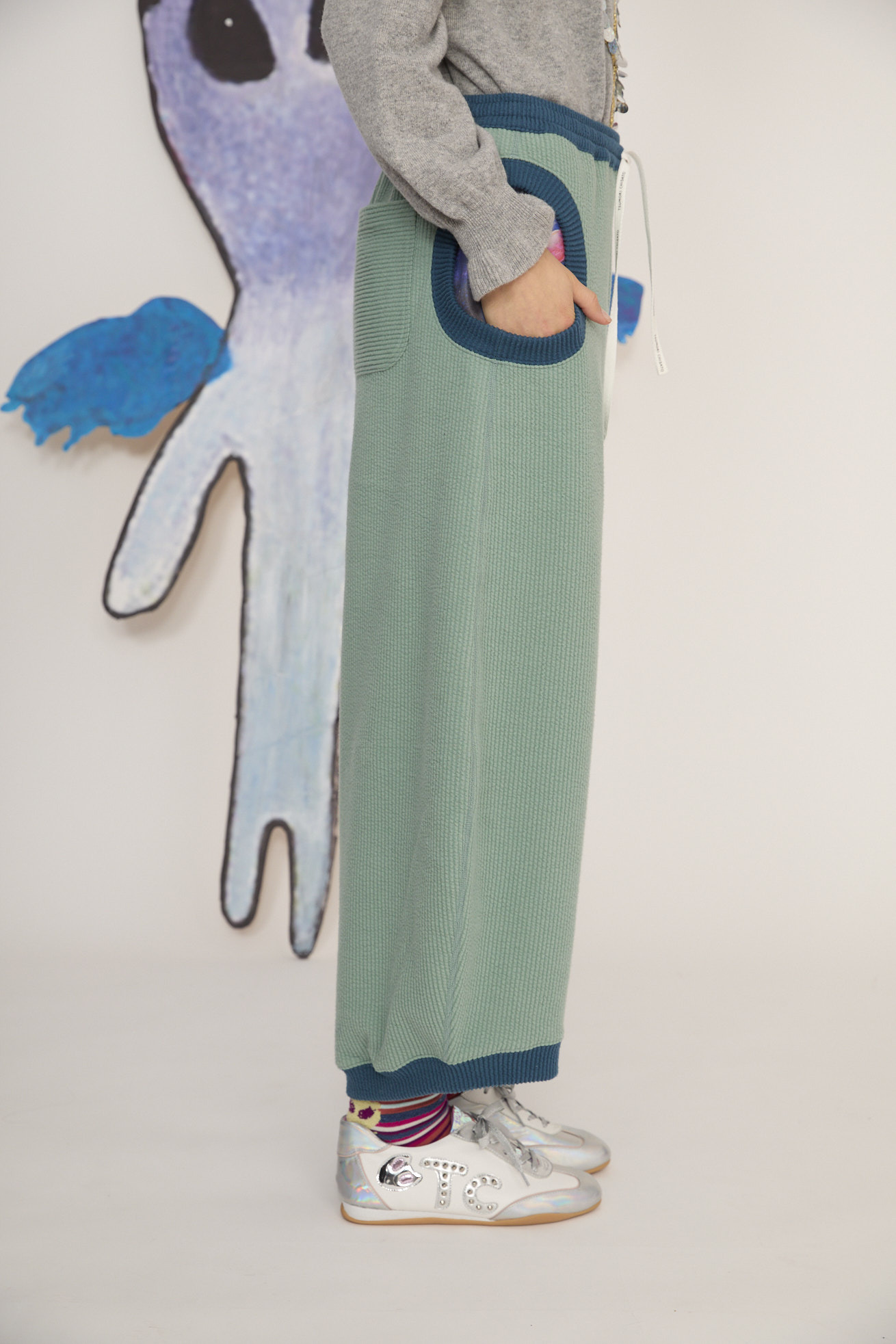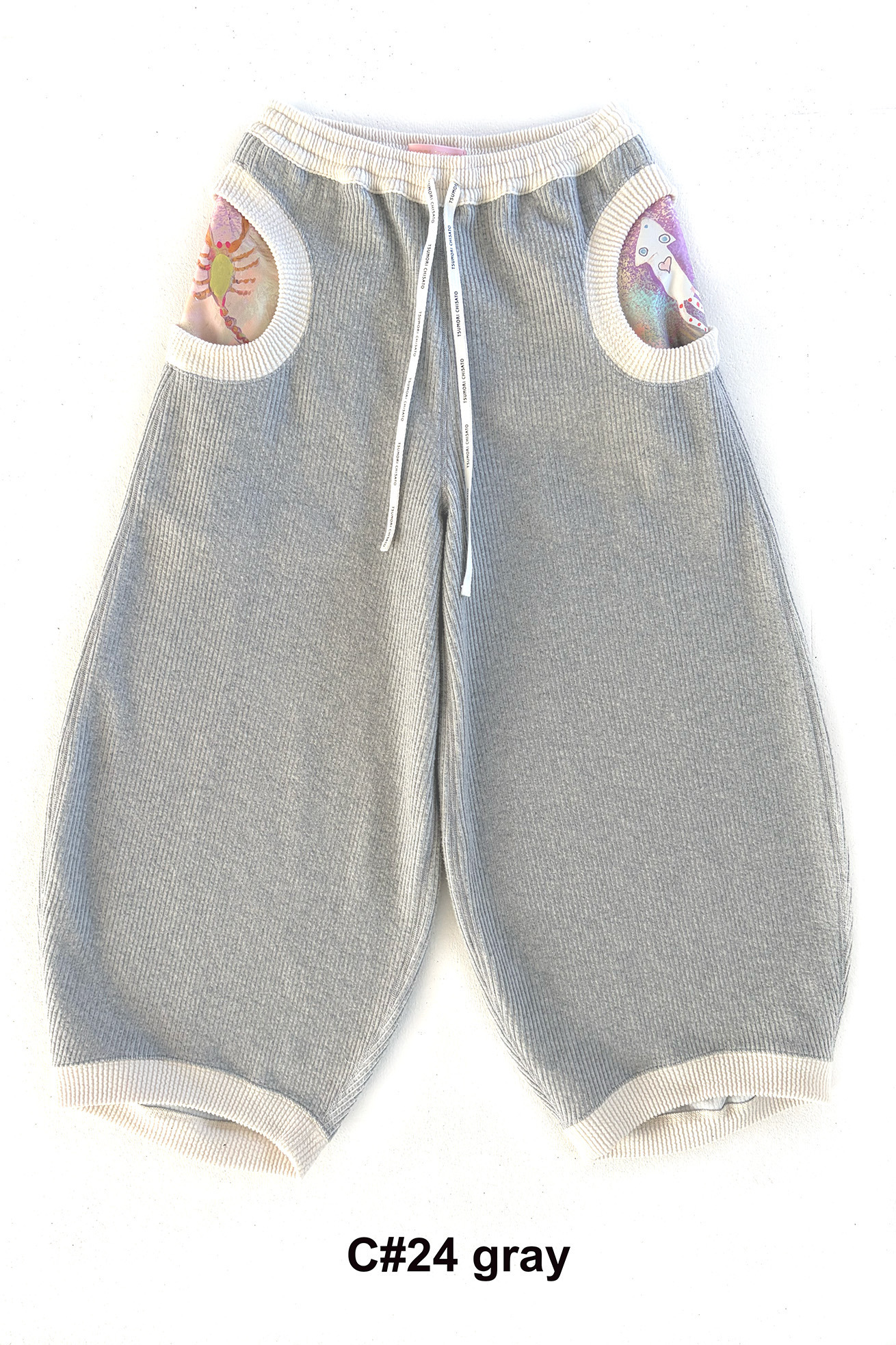丸みがあるコクーン型のゆったりシルエットがツモリチサトらしいイージーパンツ。 ウエスト、裾、丸いポケットを配色にしてアクセントに。 ポケットの中には<Space train >生地を合わせて、キャラクターを覗かせています。 リブのような表面感に起毛をかけることで温かみをプラスした生地を使用しています。 やわらかい生地感と、ウエストはゴム仕様で履きやすく、デイリーに着まわしやすいパンツです。 <Space train > 大きな翼を広げた白鳥、ハートを持った熊や蟹、しっぽがハート型のさそり、キュートなイカや星雲から顔を出すネオキャットなど、、、 空の星座を思わせる生き物や、空想の宇宙の生き物たちが踊るようにふわふわと飛び交う銀河の世界を旅をする銀河鉄道の列車。 大きく広がる大地にはペガサスと不思議なテントがたたずみ、物語のワンシーンのようなファンタジー溢れる景色が広がります。 手描きならではの線や色のニュアンスを生かし、インクジェットプリントで表現しました。 素材はしなやかで程よい光沢感のあるキュプラコットンギャバを使用。京都でプリント加工をしています。 ケア方法:手洗い可能 着用モデル身長: C/#10:175cm / C/#02:170cm 着用サイズ:2(M) ※ポケット生地のプリントの出方は商品ごとに異なります。柄はお選びいただけませんので予めご了承ください。 ※表記のサイズはサンプル商品での計測の為、若干の誤差が生じます。予めご了承ください。 ※完全受注生産の為、オーダー後の変更・キャンセルはお受けしておりません。予めご了承ください。