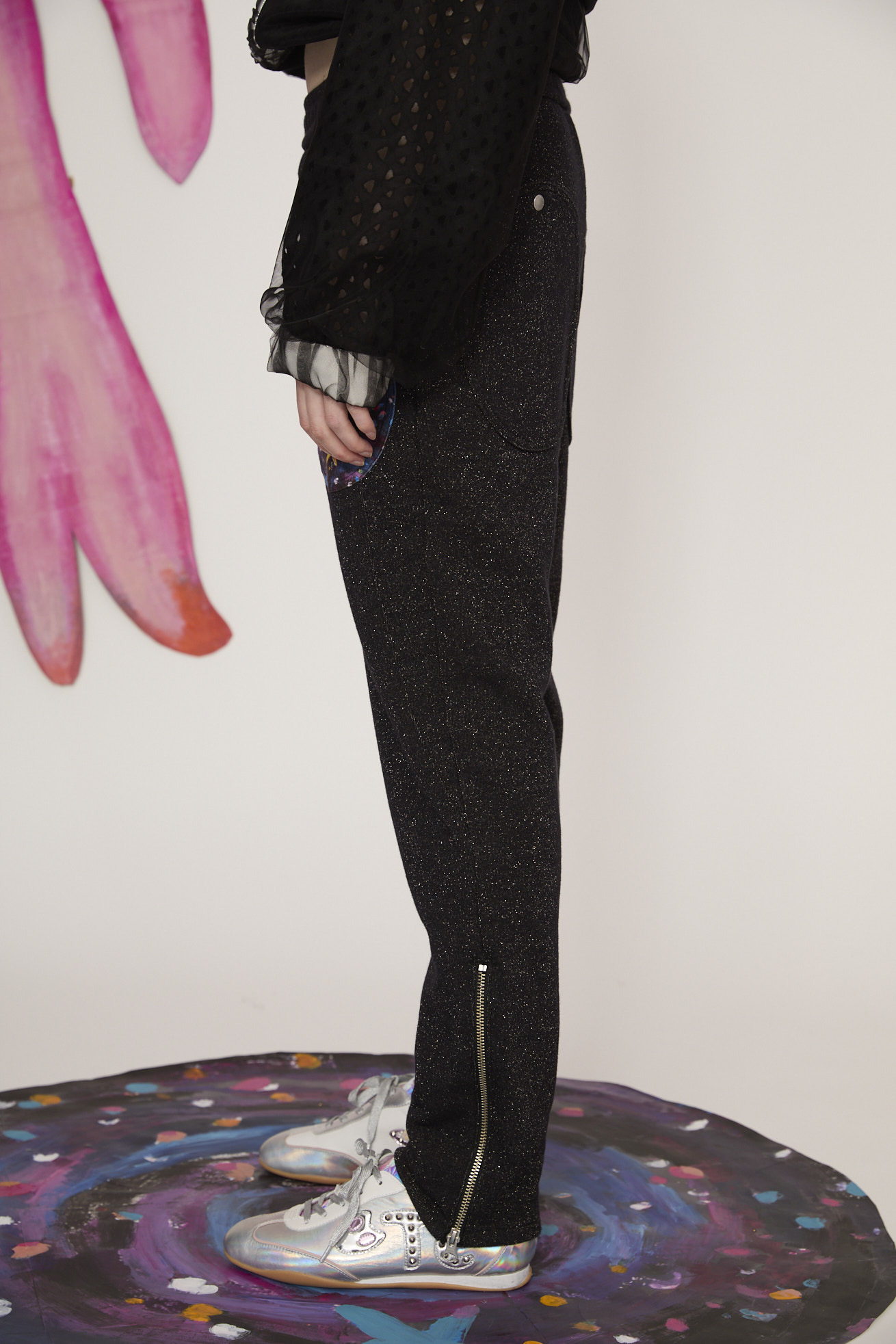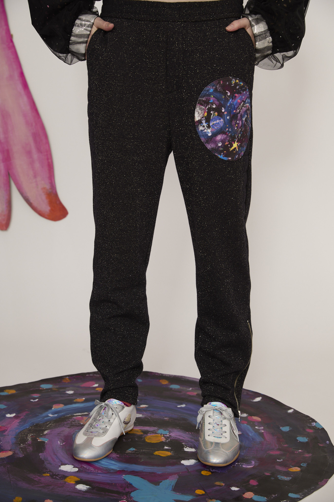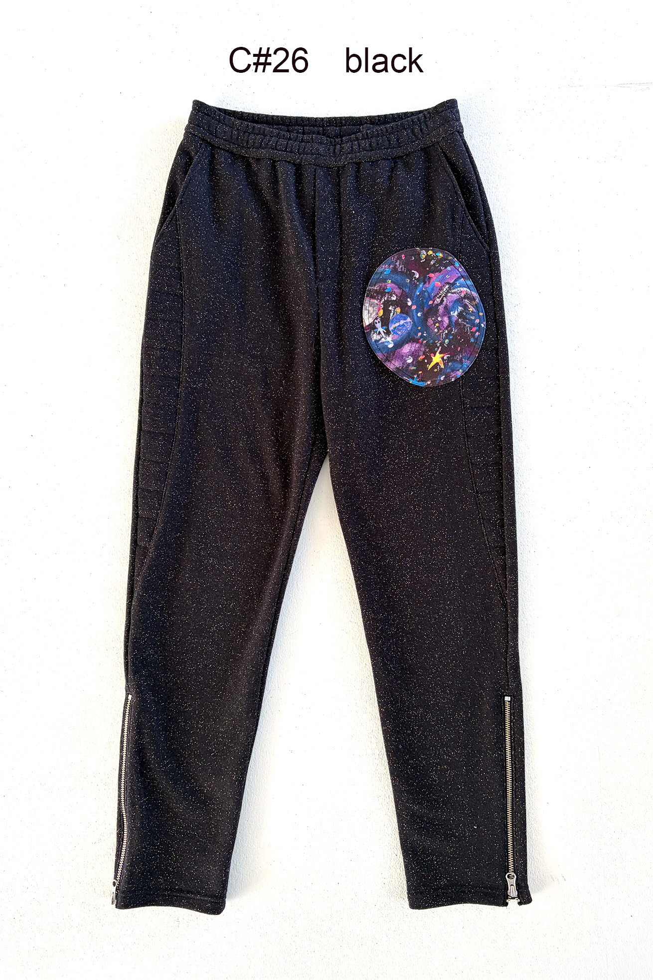 キラキラと輝くラメ糸が存在感のある裏毛パンツ。 サイドにはライン状にステッチを入れてアクセントに。 裾のファスナーや惑星、猫宇宙人の目をイメージした前後のポケットなど、ジャージーパンツながら、デザインポイントが詰まった1本です。 ウエストはゴム仕様で紐で調整ができます。 不純物や短い繊維を取り除いた上質な綿糸を使用することで、ふっくらと柔らかな風合いに仕上げています。 ラメ糸が肌面に響かないように設計されているため、ラメ特有のチクチク感がなく、快適な着心地をお楽しみいただけます。 ケア方法:手洗い可能 着用モデル身長:173cm 着用サイズ:2(M) ※表記のサイズはサンプル商品での計測の為、若干の誤差が生じます。予めご了承ください。 ※完全受注生産の為、オーダー後の変更・キャンセルはお受けしておりません。予めご了承ください。