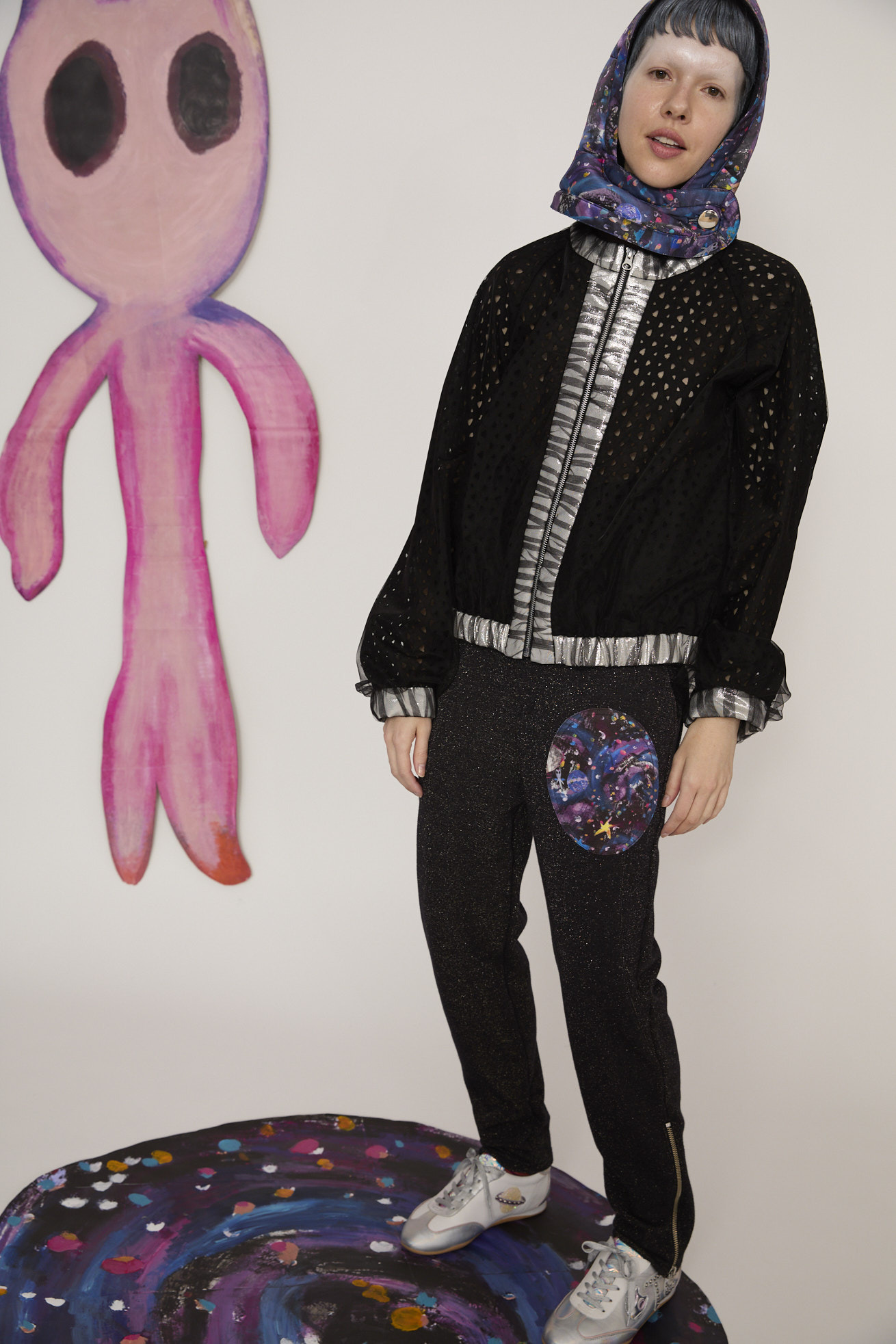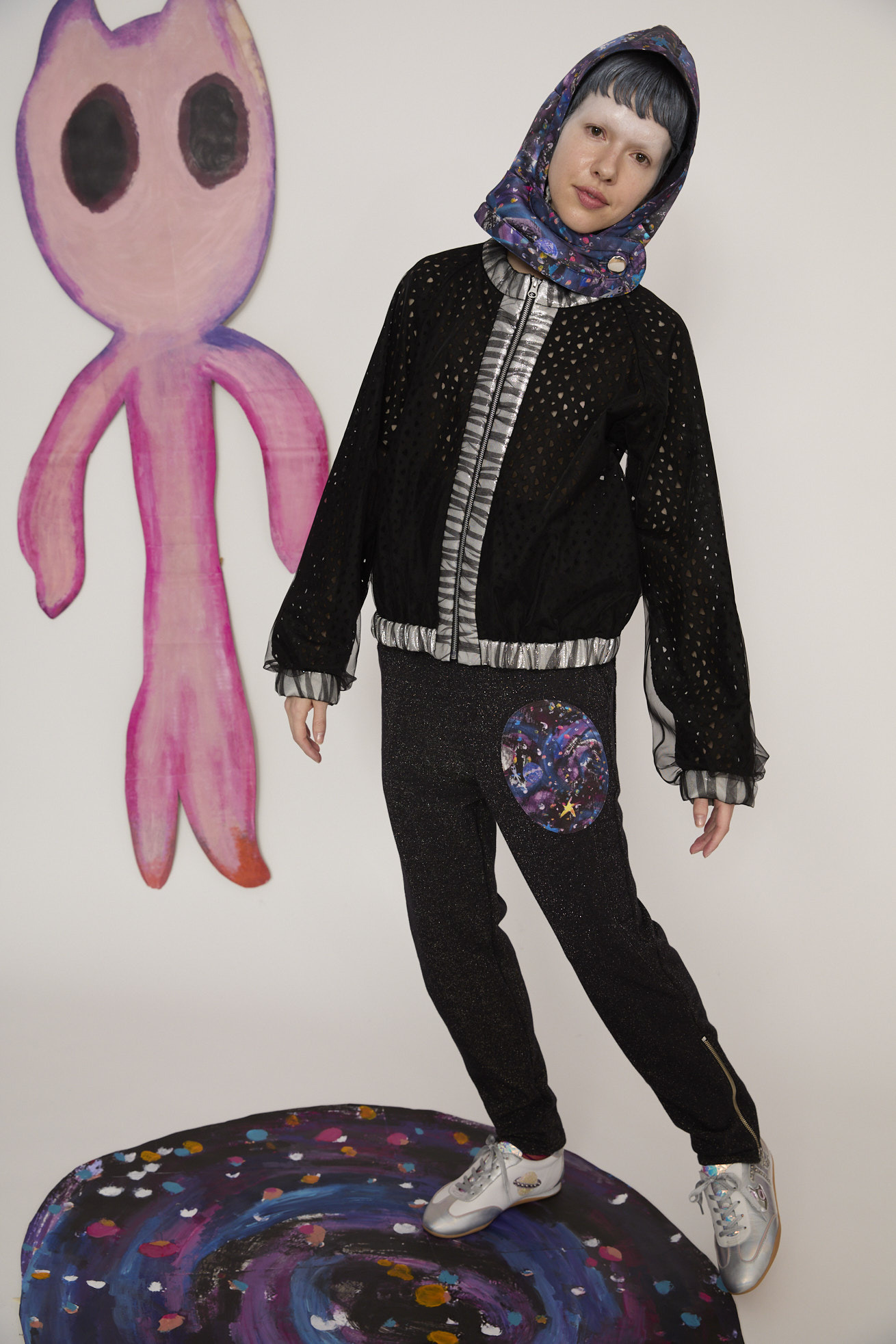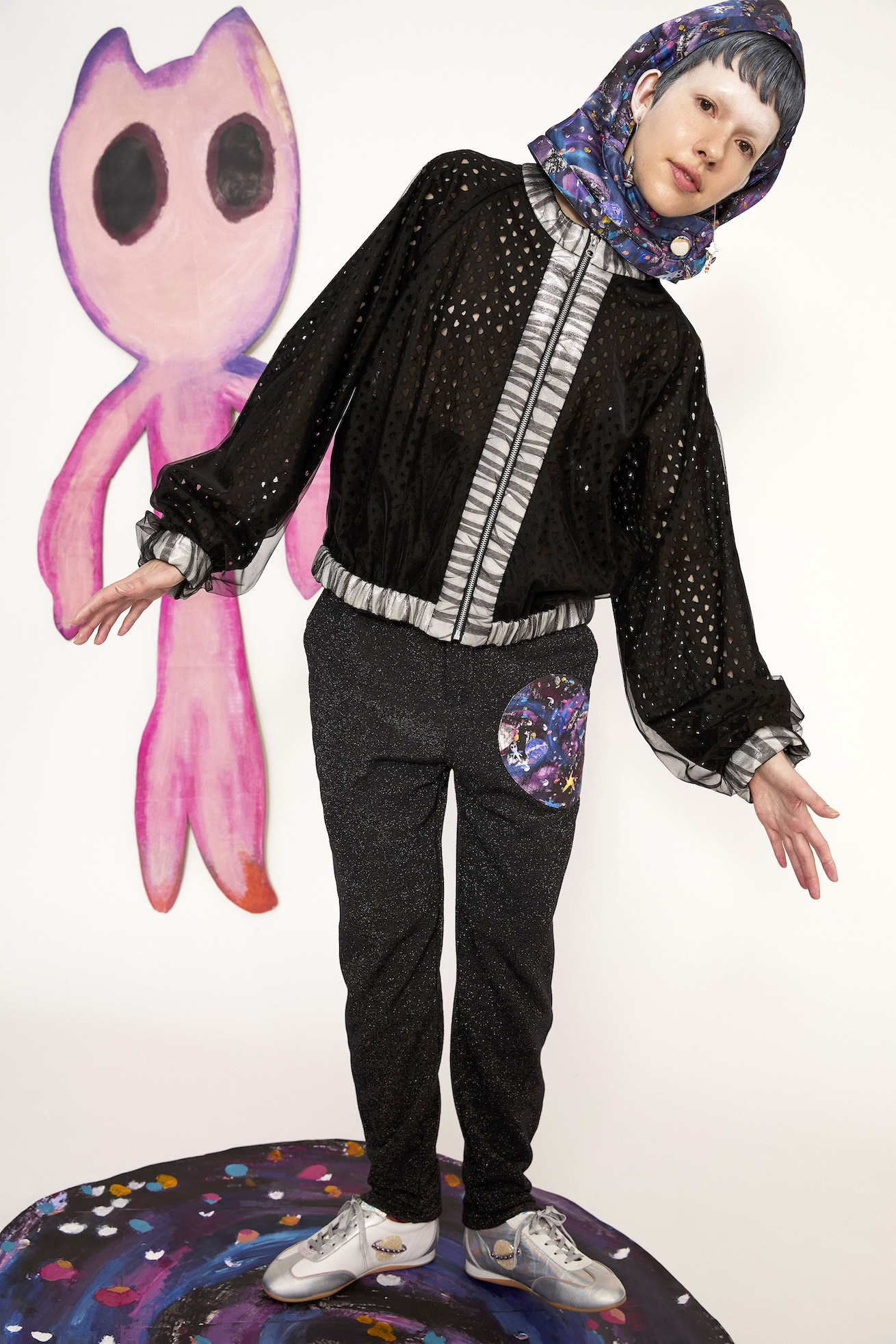 キラキラと輝くラメ糸が存在感のある裏毛パンツ。 サイドにはライン状にステッチを入れてアクセントに。 裾のファスナーや惑星、猫宇宙人の目をイメージした前後のポケットなど、ジャージーパンツながら、デザインポイントが詰まった1本です。 ウエストはゴム仕様で紐で調整ができます。 不純物や短い繊維を取り除いた上質な綿糸を使用することで、ふっくらと柔らかな風合いに仕上げています。 ラメ糸が肌面に響かないように設計されているため、ラメ特有のチクチク感がなく、快適な着心地をお楽しみいただけます。 ケア方法:手洗い可能 着用モデル身長:173cm 着用サイズ:2(M) ※表記のサイズはサンプル商品での計測の為、若干の誤差が生じます。予めご了承ください。 ※完全受注生産の為、オーダー後の変更・キャンセルはお受けしておりません。予めご了承ください。