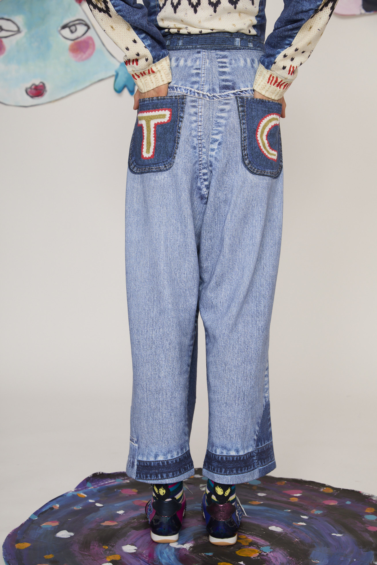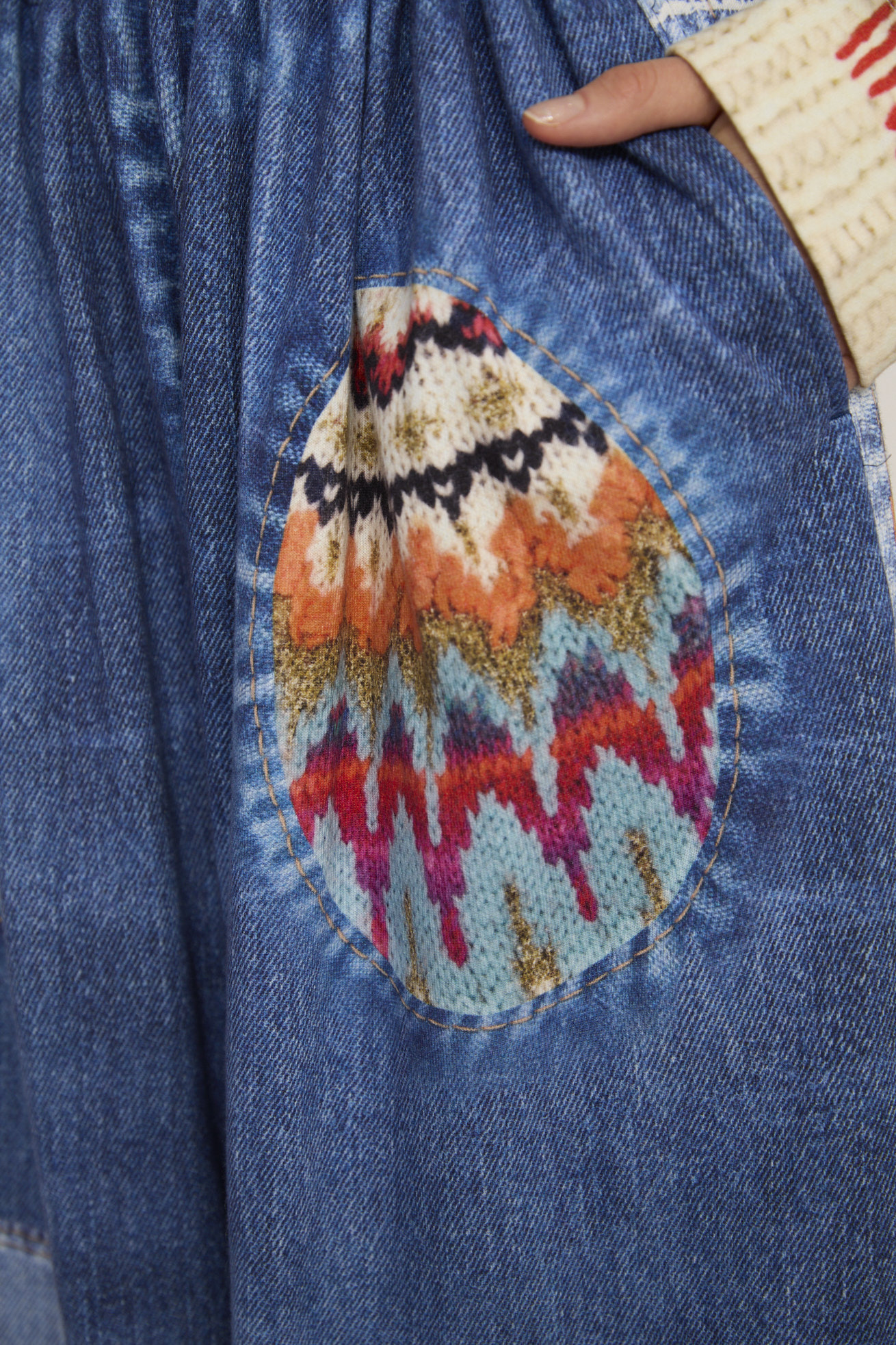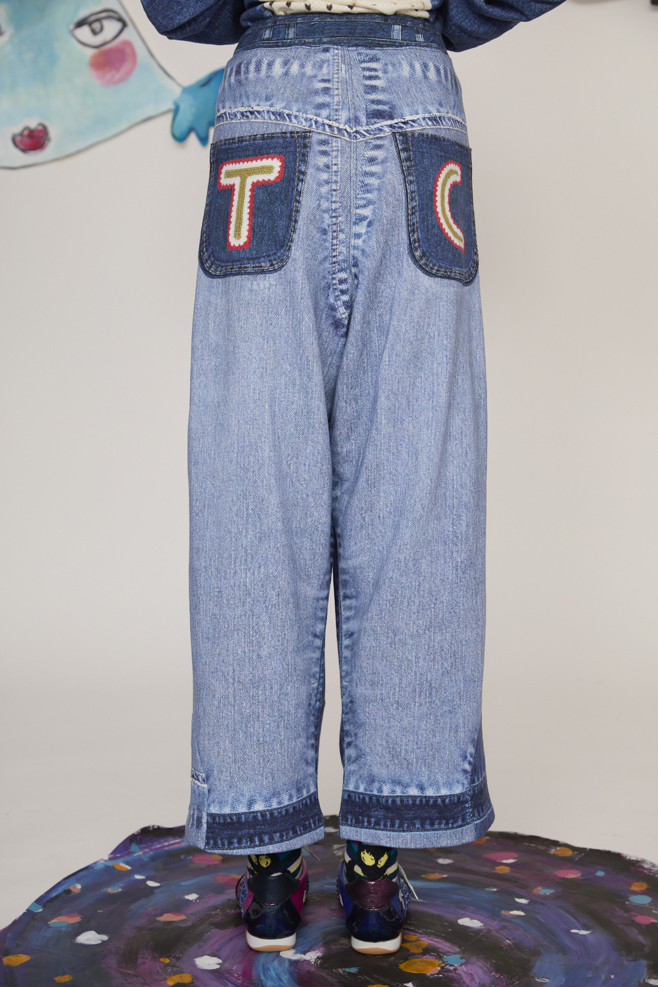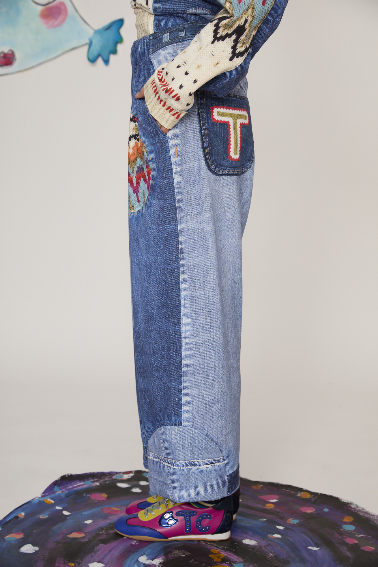 デニムとニットを組み合わせたように見える、トロンプルイユプリントのワイドパンツ。 デニムのストーンウォッシュ感やブリーチ感、ステッチやボタン、パッカリングといったディテールに加え、ニットの編み地やリブ編み、かぎ針編み、手編みの表情まですべてをプリントで表現しています。 土星のようなモチーフを取り入れた、だまし絵のパッチワークもアクセント。 一見すると本物のデニムとニットを組み合わせたように見えますが、実は裏毛素材という見た目とのギャップも楽しい一枚です。 プリントだけでなく、ウエストの前後のプリント切り替えを前に入れ込むことで、スッキリとしたデニムの立体感に近いシルエットを目指しました。 同じプリントのトップスとのセットアップだけでなく、通常のデニムとしてコーディネートが組みやすいアイテムです。 伸縮性があるコットン100%のミニ裏毛を使用し、柔らかく軽い着用感が特徴です。 ウエストゴム仕様で履きやすく、前後にリアルなポケット付きでデイリーに活躍するアイテムに仕上げました。 プリントは福井県で行っています。 ケア方法:手洗い可能 着用モデル身長:175cm 着用サイズ:2(M) ※表記のサイズはサンプル商品での計測の為、若干の誤差が生じます。予めご了承ください。 ※完全受注生産の為、オーダー後の変更・キャンセルはお受けしておりません。予めご了承ください。