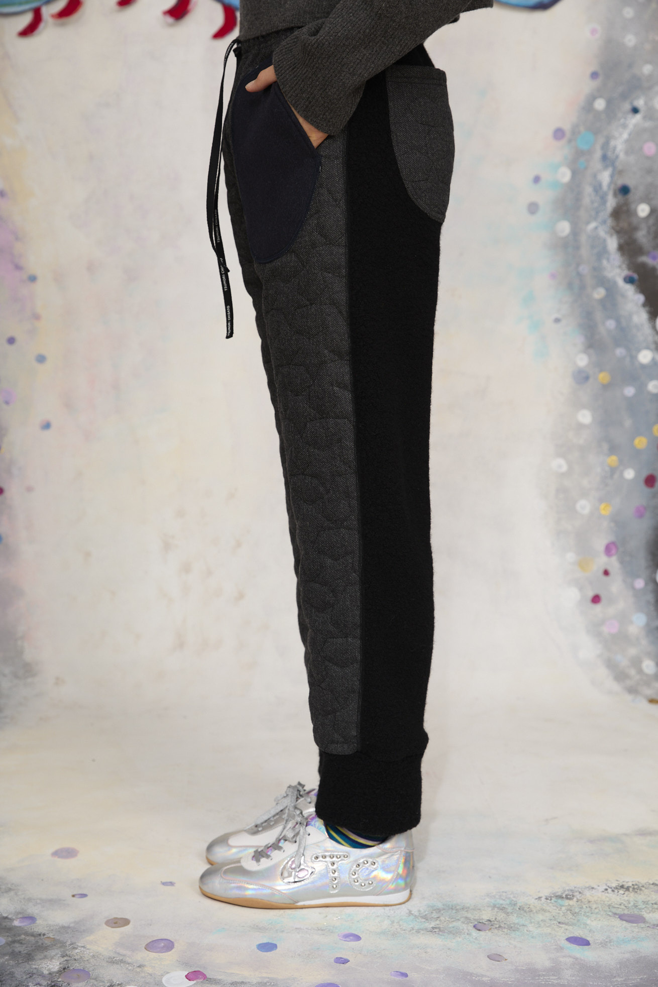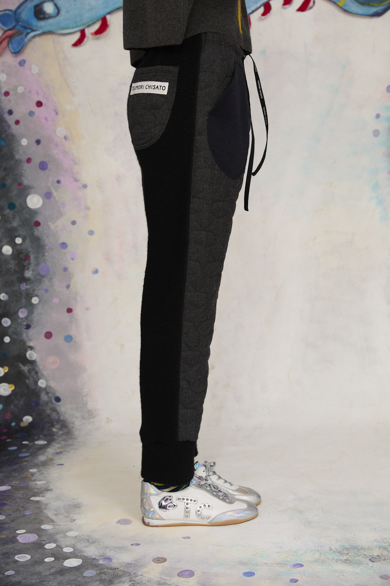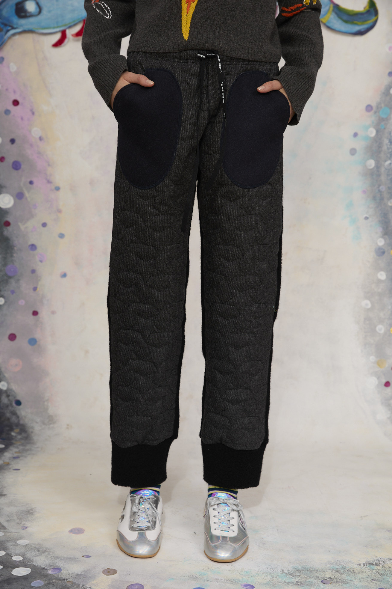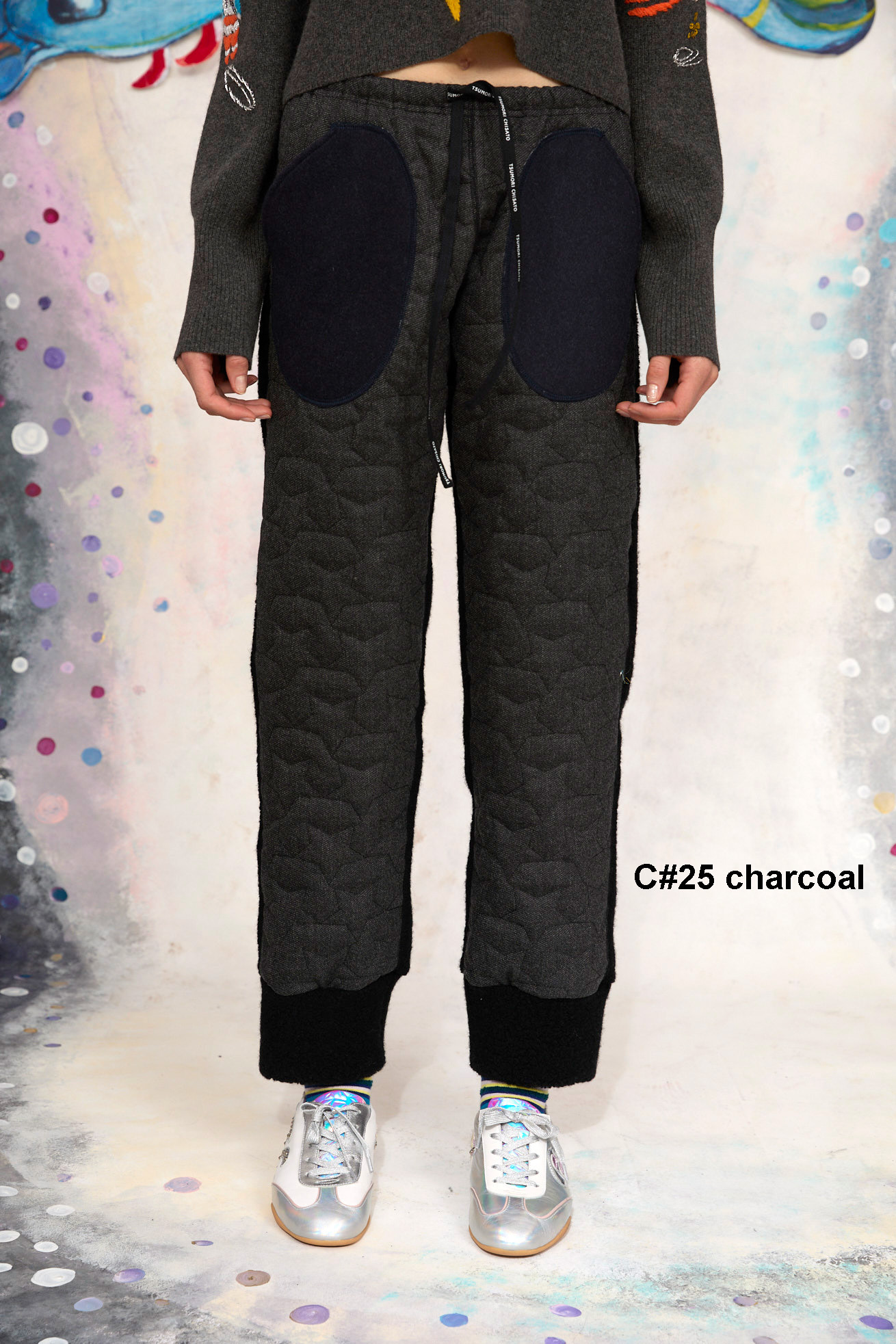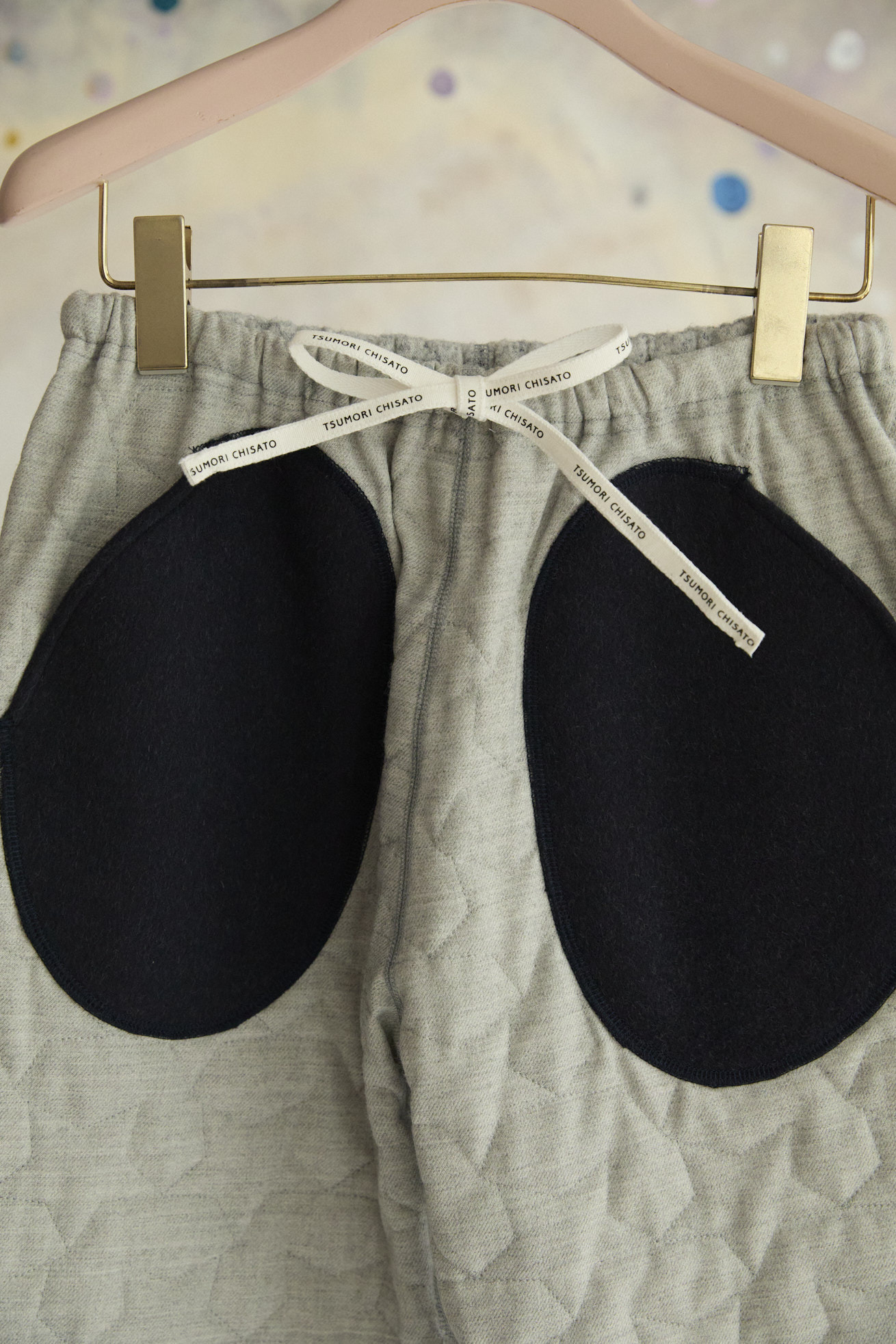 定番のジョガーパンツから、前後に異素材を合わせた新しいデザインが登場。 前面は、程よい厚みのウールレーヨンツイル素材を星型にキルト加工しています。 中綿とキルト加工をすることで、ハリ感と保温性の高い素材に仕上げました。 後ろにはやわらかいウール、コットンの素材を合わせています。 キルト独特のぷくぷく感がありつつ、着用すると太くならず、やわらかくて履きやすいのもポイントです。 ポケットの切り替えは、猫宇宙人の目をイメージしています。 ケア方法:ドライクリーニング 着用モデル身長:173cm 着用サイズ:2(M) ※表記のサイズはサンプル商品での計測の為、若干の誤差が生じます。予めご了承ください。 ※完全受注生産の為、オーダー後の変更・キャンセルはお受けしておりません。予めご了承ください。
