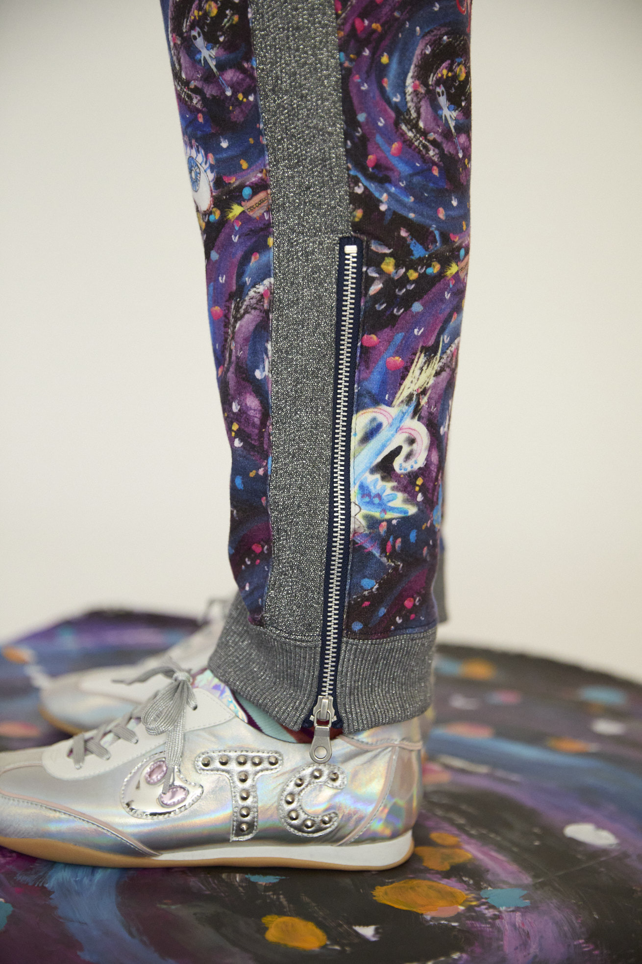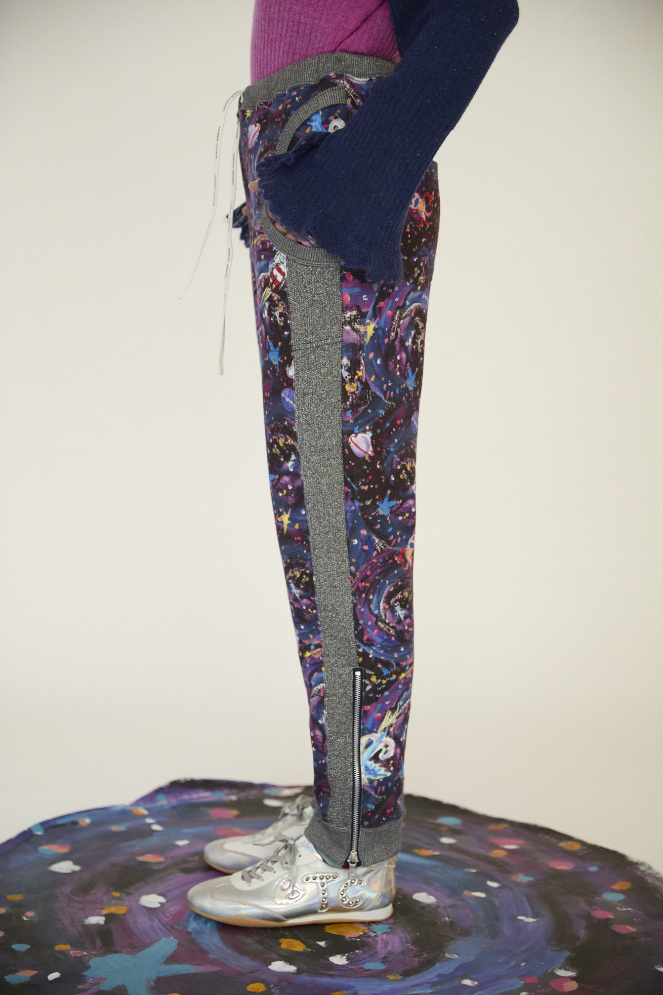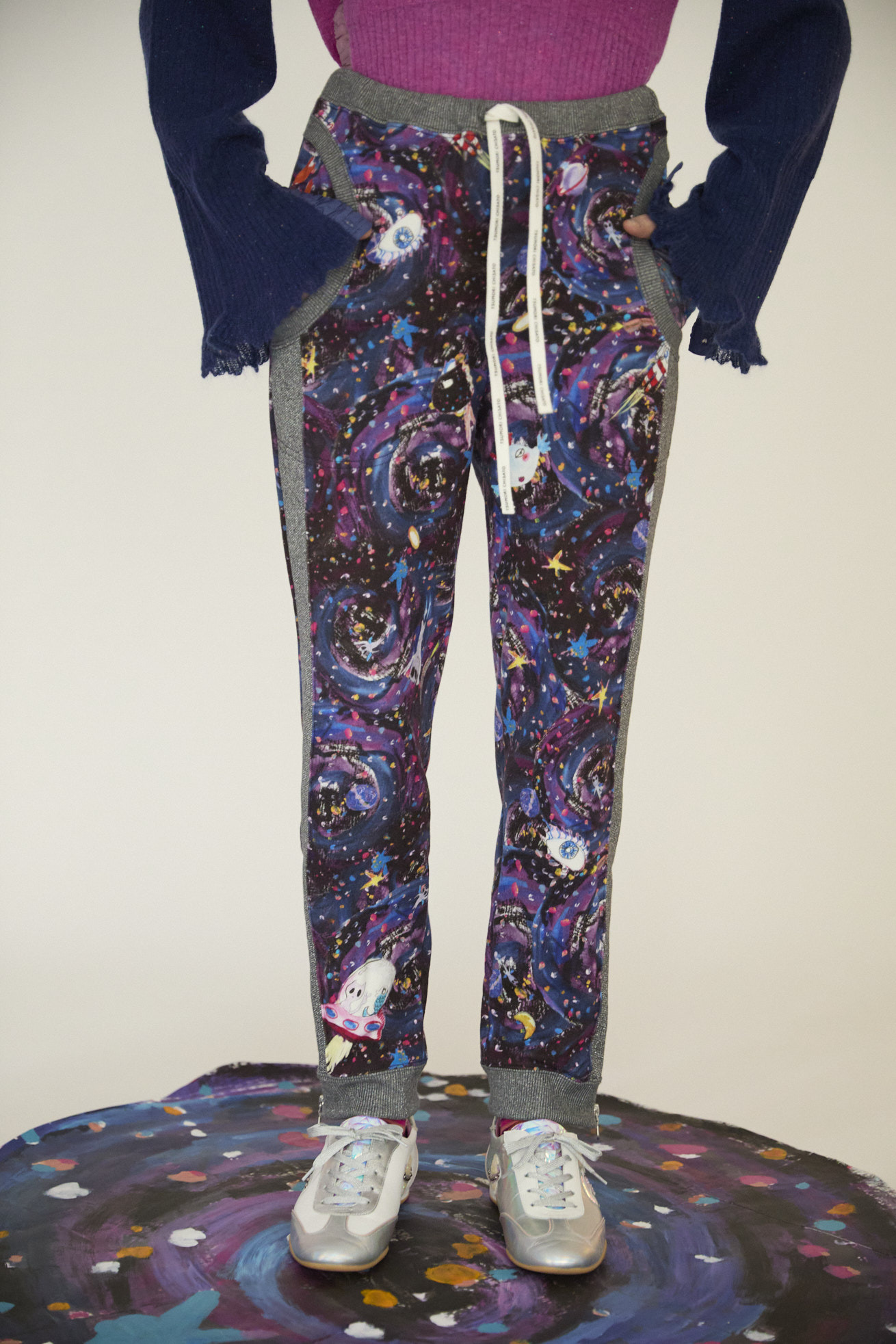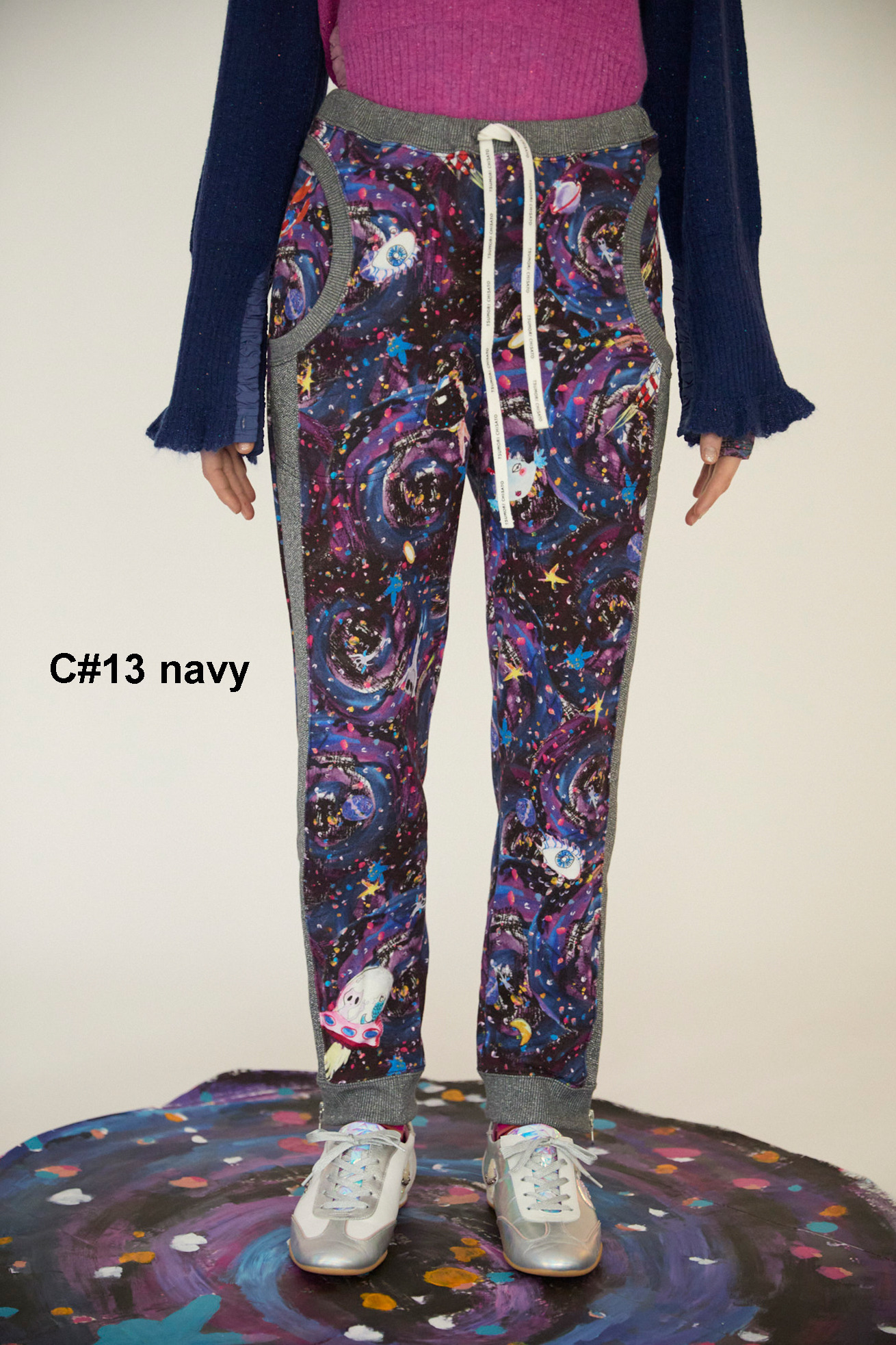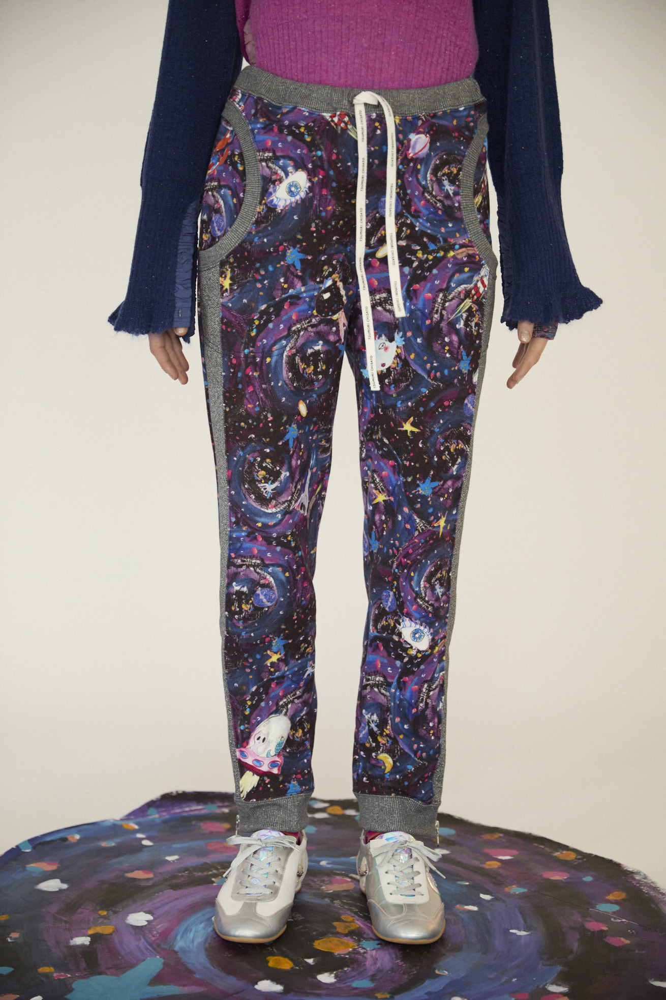 Andromeda Printをコットン100%のミニ裏毛にのせたジャージーパンツ。 サイドとポケットに合わせたラメ生地がアクセントになっていて、今シーズンらしいスペイシー感のある仕上がりになっています。 定番の形に裾ファスナーを加え、いつもよりも薄手の裏毛を使用することで、柔らかい履き心地で動きやすさがアップしています。 <Andromeda > たくさんの星が集まるアンドロメダ星雲や、いくつもの銀河が交差する世界をイメージした、ファンタジーあふれるプリントです。手の翼を持った魚、足の生えたマンボウ、猫の宇宙飛行士などの不思議な生き物も浮遊しています。 よく見ると、アンドロメダ銀河の間を駆け抜ける銀河鉄道や、猫宇宙人の姿が隠れており、眺めるたびに新しい発見がある、遊び心のある一枚に仕上げました。 たくさんの星を思わせるカラフルな描写と、重なり合う色彩が織りなす、ツモリチサトらしい物語性のあるテキスタイルです。 プリントは福井でインクジェットプリントを施し、色の重なりやタッチを丁寧に表現しています。 ケア方法:手洗い可能 着用モデル身長:170cm 着用サイズ:2(M) ※表記のサイズはサンプル商品での計測の為、若干の誤差が生じます。予めご了承ください。 ※完全受注生産の為、オーダー後の変更・キャンセルはお受けしておりません。予めご了承ください。