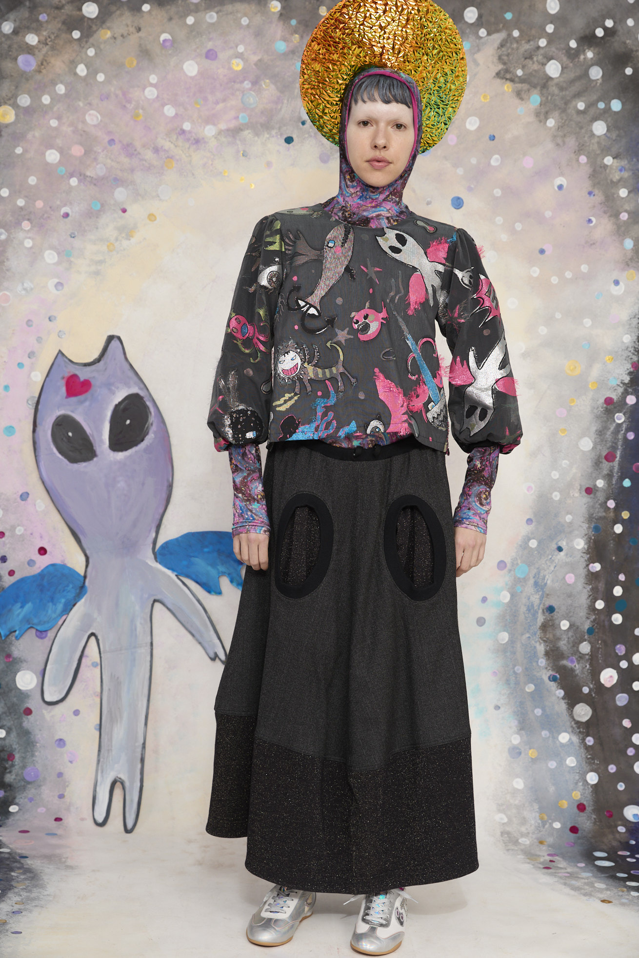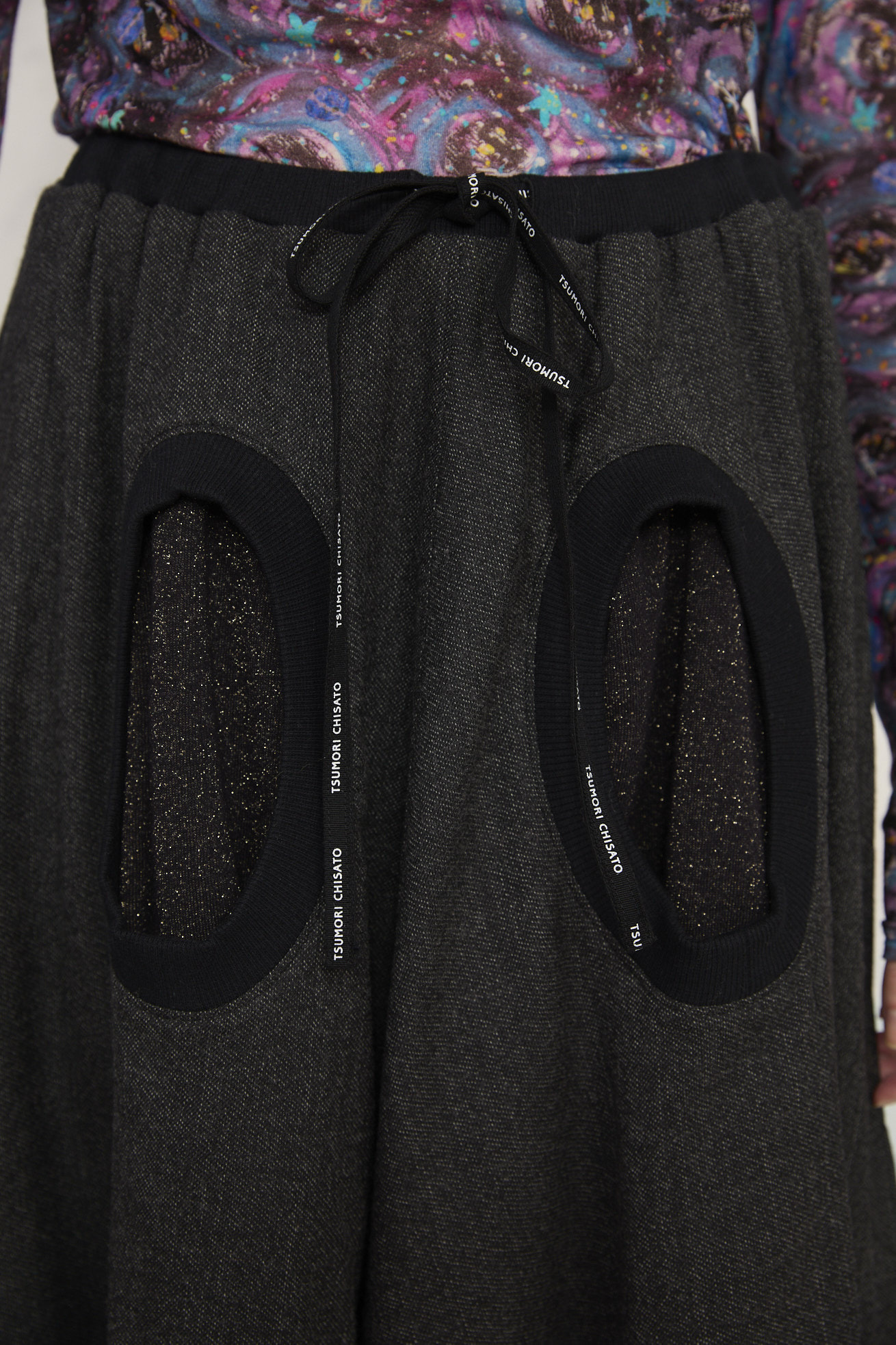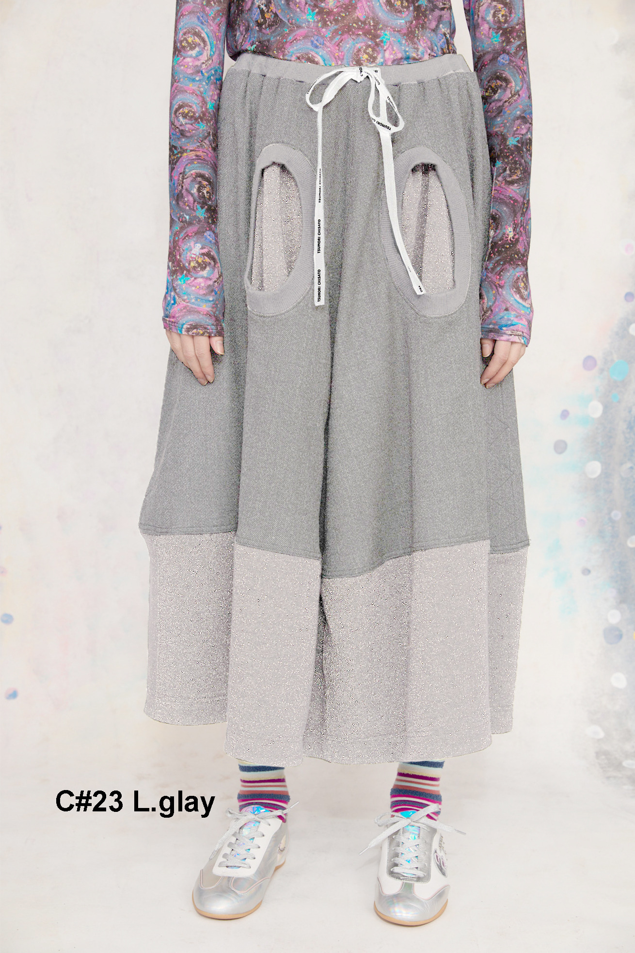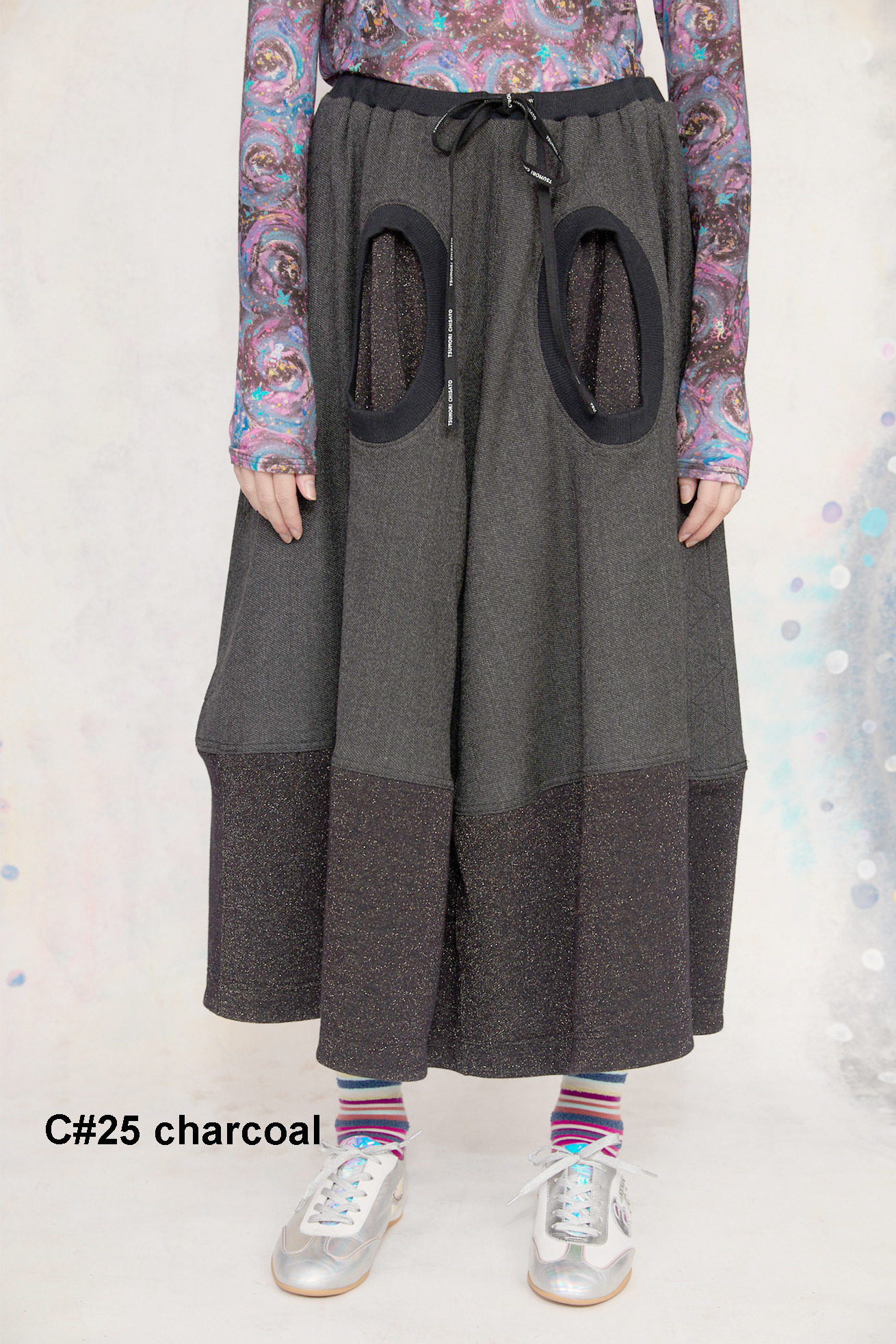 杢調のウールレーヨン素材とラメ裏毛を合わせたロングスカート。 ウール特有の暖かみと、レーヨンならではのしなやかな落ち感を兼ね備えた、上質な風合いが魅力です。 生地の持つ美しいドレープ性を活かし、分量をたっぷりと贅沢に使用。 ギャザーを寄せることで、ふんわりと立体感がありながら広がりすぎず、華やかなシルエットに仕上げました。 丸いポケットは猫宇宙人の目をイメージしています。 ケア方法:ドライクリーニング 着用モデル身長:173cm 着用サイズ:2(M) ※表記のサイズはサンプル商品での計測の為、若干の誤差が生じます。予めご了承ください。 ※完全受注生産の為、オーダー後の変更・キャンセルはお受けしておりません。予めご了承ください。