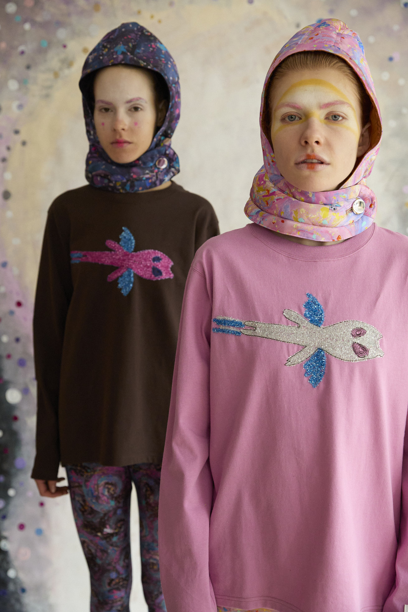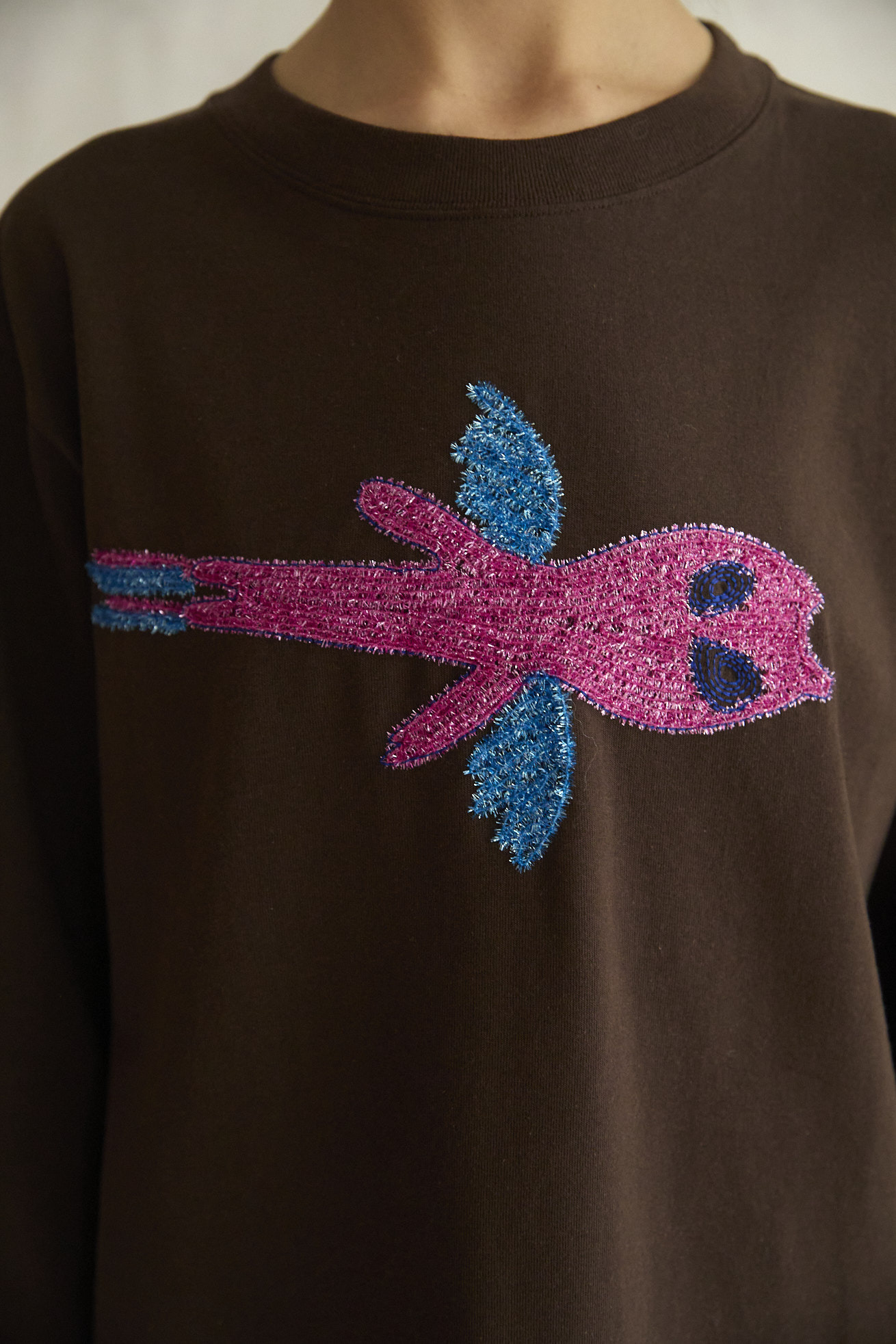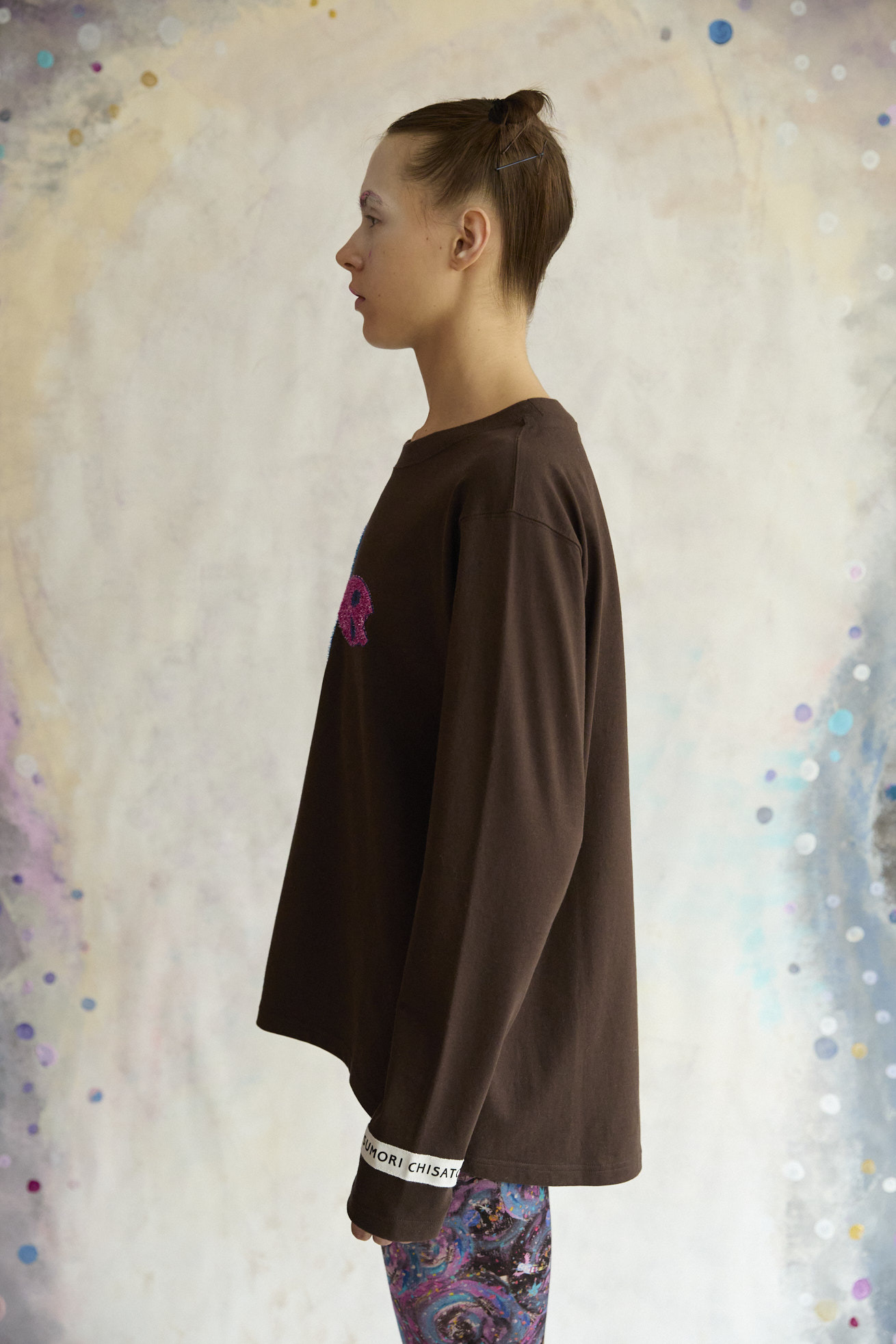 無限の宇宙を勢いよく飛び回る、羽の生えた猫宇宙人をラメモールを使用してコード刺繍で表現した長袖Tシャツ。 目が回っているのか、ぐるぐるした瞳が印象的。 シンプルなデザインで1枚でもインナーとしても便利なアイテムです。 ベース素材は空紡糸を使用しています。空気の力で紡績しているため、ボリューム感がありながらもドライタッチで程よく硬めの風合いです。 袖のロゴテープもアクセントになっています。 ケア方法:手洗い可能 着用モデル身長: C/#02:173cm / C/#05:175cm 着用サイズ:2(M) ※表記のサイズはサンプル商品での計測の為、若干の誤差が生じます。予めご了承ください。 ※完全受注生産の為、オーダー後の変更・キャンセルはお受けしておりません。予めご了承ください。