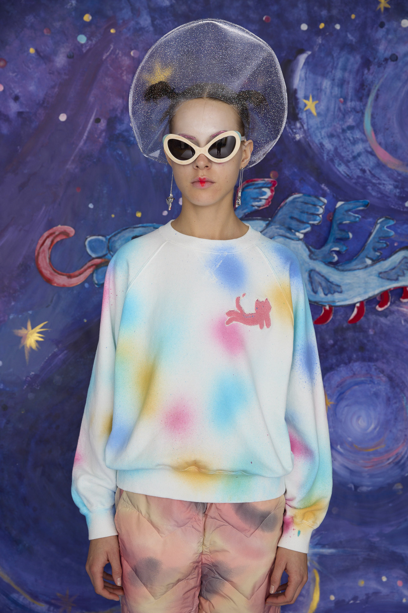 定番のキラネコ裏毛に4色の染料をスプレーのように吹きつけて、今シーズンのスペイシー感のあるアイテムに。 ふわっと重なり合う色彩が銀河の世界のように広がり、軽やかでカラフルな表情に仕上げています。 岡山県で一点一点、手作業による染色加工を施しており、一枚一枚が異なる表情を持つ、特別感のあるアイテムです。 手染めならではの風合いを大切にしているため、染め上がりや色の出方には個体差が生じます。 一点ずつ染め方や色の表情が異なりますので、あらかじめご了承ください。 ベースの裏毛生地は希少性の高い丸編み機(アズマ裏毛機)を使用して、ゆっくりと編み上げ、空気を含んだようなふっくら柔らかい風合いが特徴です。 生地は厚すぎず、3シーズン着用いただけるアイテムです。 ケア方法:手洗い可能 着用モデル身長:175cm / 173cm 着用サイズ:2(M) ※表記のサイズはサンプル商品での計測の為、若干の誤差が生じます。予めご了承ください。 ※完全受注生産の為、オーダー後の変更・キャンセルはお受けしておりません。予めご了承ください。