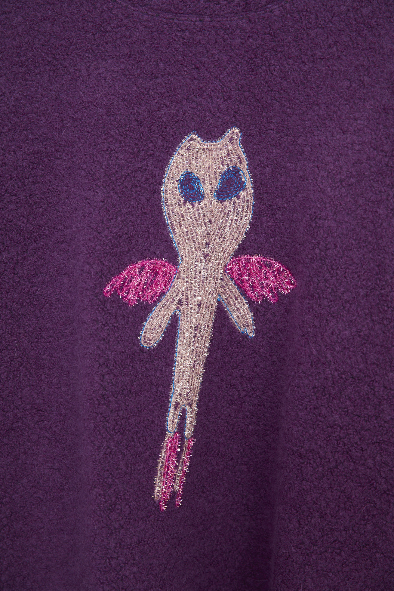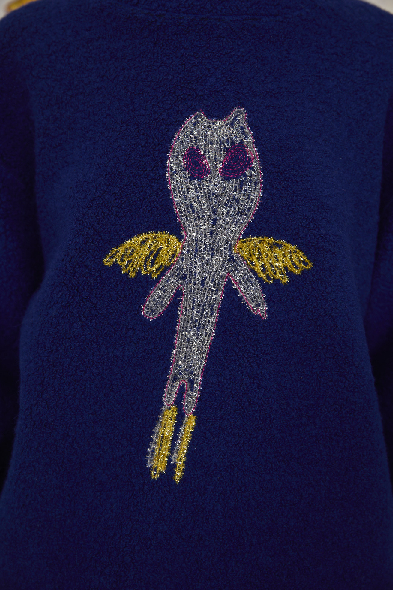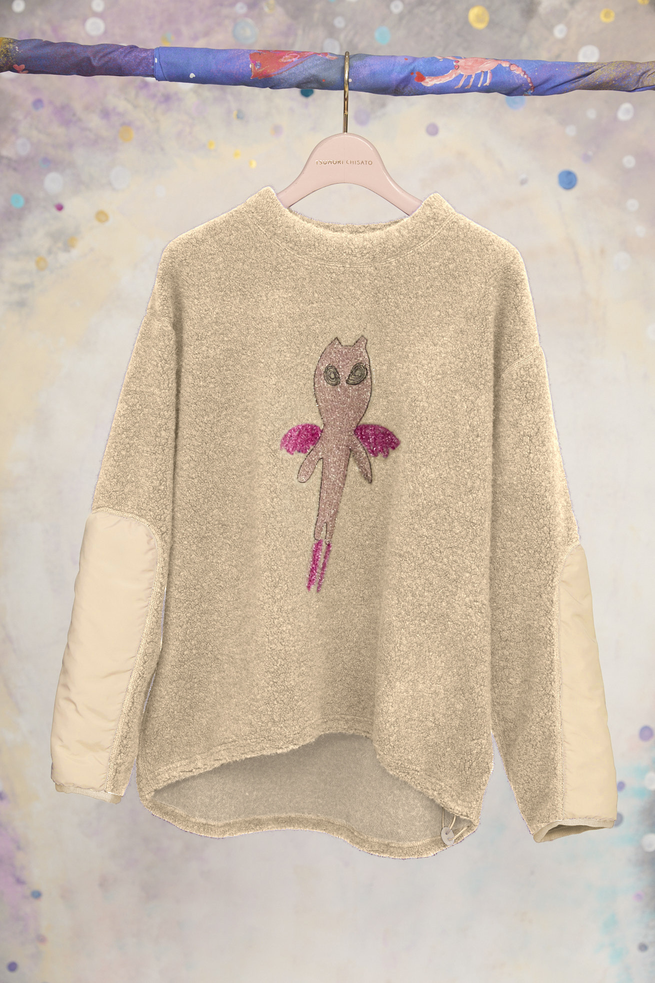 もこもこした見た目とソフトな着心地のパイル風生地を使用した長袖プルオーバー。 ベースにはウールの太番手を使用し、丸編み機で空気と一緒に編むことで、ふんわり体を包み込むような軽い着心地に仕上げています。 袖に綿を入れて異素材の生地を合わせることでスペイシーな印象に。 フロントには無限の宇宙を勢いよく飛び回る、羽の生えた猫宇宙人をラメモールを使用してコード刺繍で表現。 目が回っているのか、ぐるぐるした瞳が印象的。 裾にゴムを通し、絞ることで保温性を高め、シルエットのアレンジが出来ます。 ケア方法:ドライクリーニング 着用モデル身長:175cm 着用サイズ:2(M) ※表記のサイズはサンプル商品での計測の為、若干の誤差が生じます。予めご了承ください。 ※完全受注生産の為、オーダー後の変更・キャンセルはお受けしておりません。予めご了承ください。