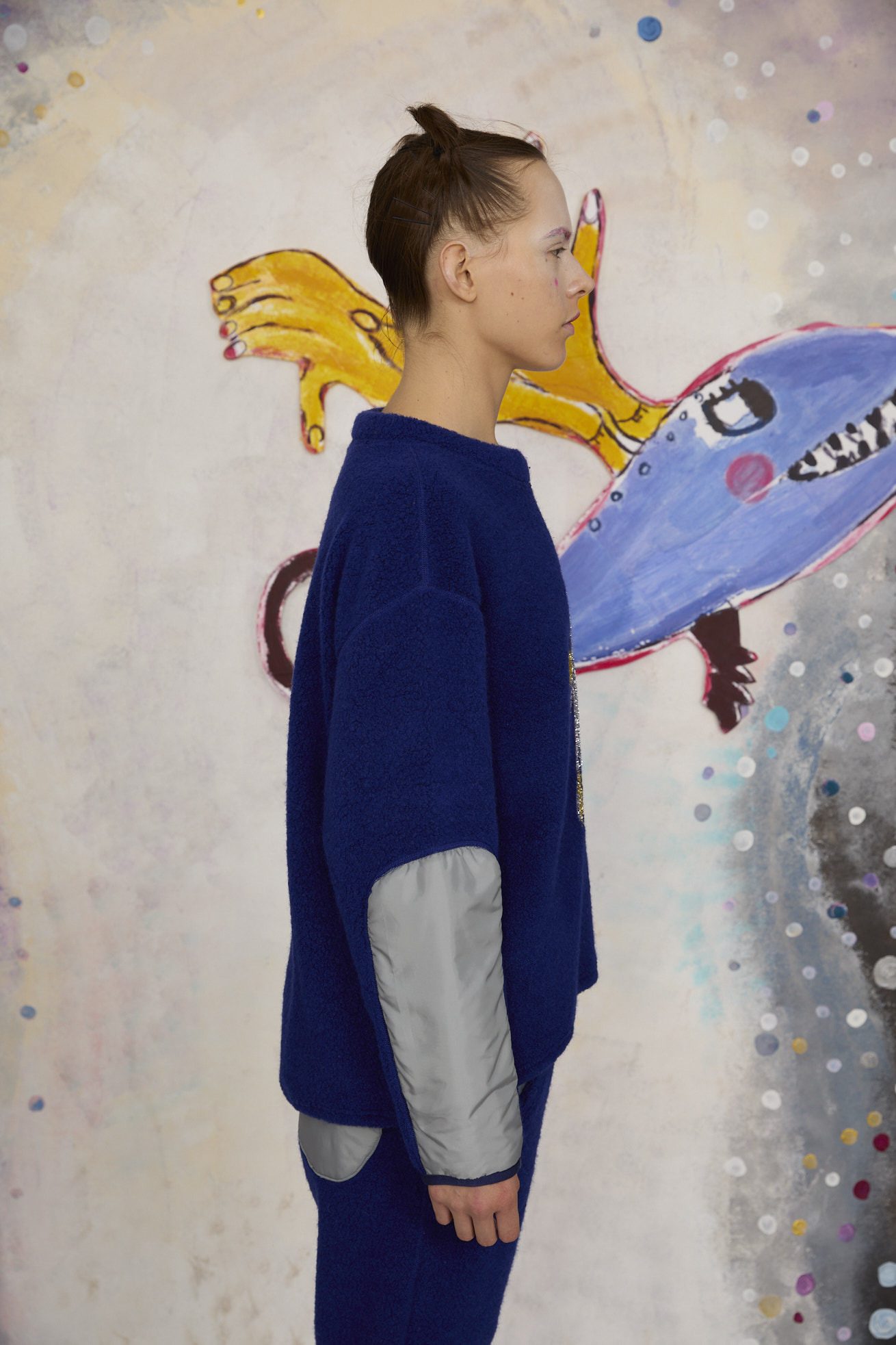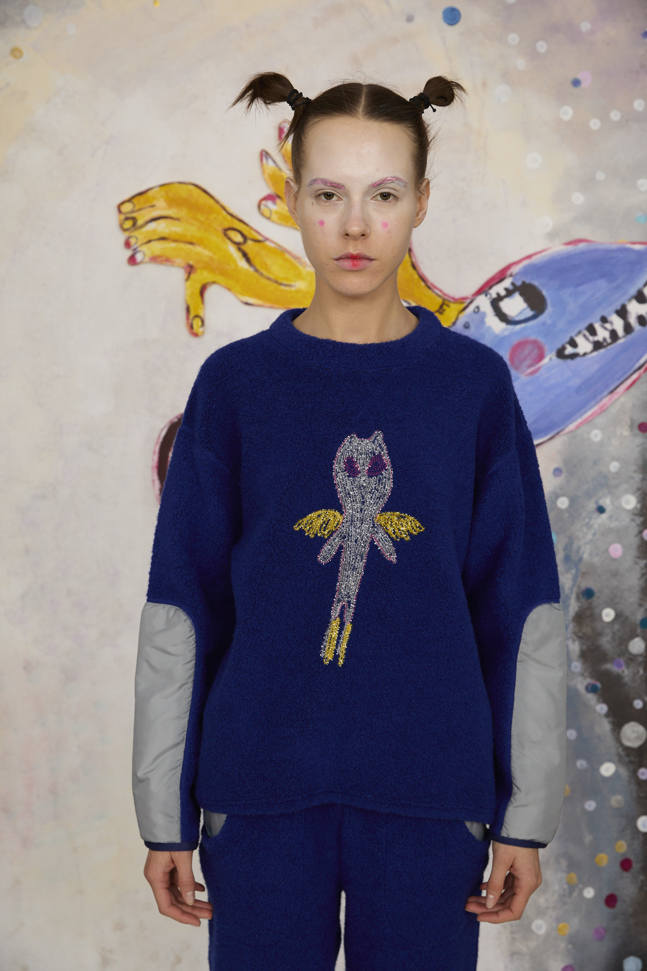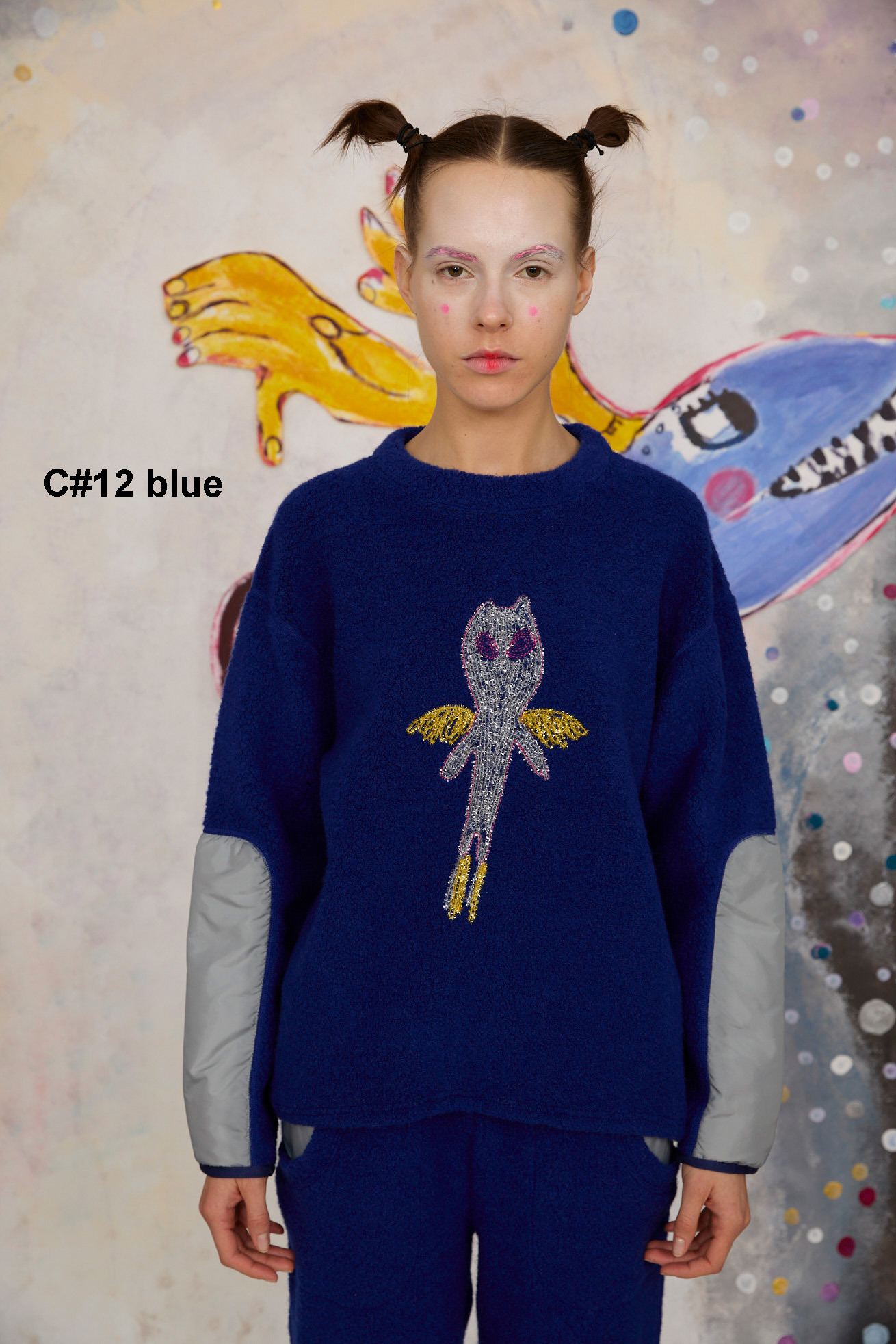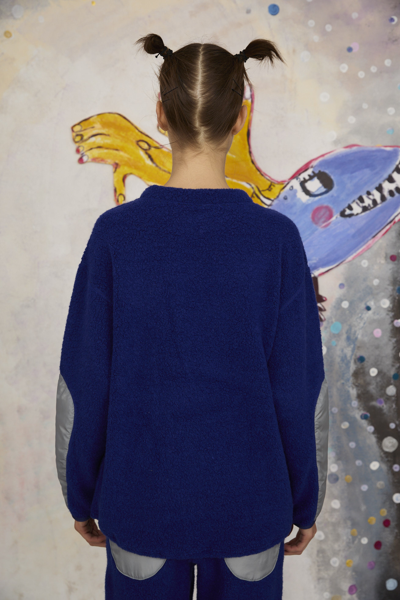 もこもこした見た目とソフトな着心地のパイル風生地を使用した長袖プルオーバー。 ベースにはウールの太番手を使用し、丸編み機で空気と一緒に編むことで、ふんわり体を包み込むような軽い着心地に仕上げています。 袖に綿を入れて異素材の生地を合わせることでスペイシーな印象に。 フロントには無限の宇宙を勢いよく飛び回る、羽の生えた猫宇宙人をラメモールを使用してコード刺繍で表現。 目が回っているのか、ぐるぐるした瞳が印象的。 裾にゴムを通し、絞ることで保温性を高め、シルエットのアレンジが出来ます。 ケア方法:ドライクリーニング 着用モデル身長:175cm 着用サイズ:2(M) ※表記のサイズはサンプル商品での計測の為、若干の誤差が生じます。予めご了承ください。 ※完全受注生産の為、オーダー後の変更・キャンセルはお受けしておりません。予めご了承ください。