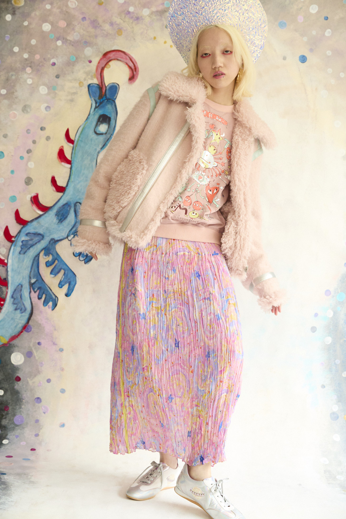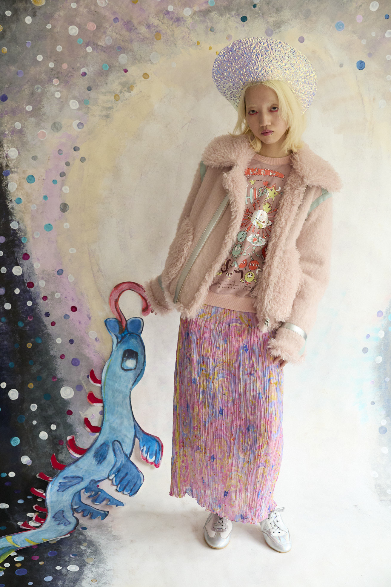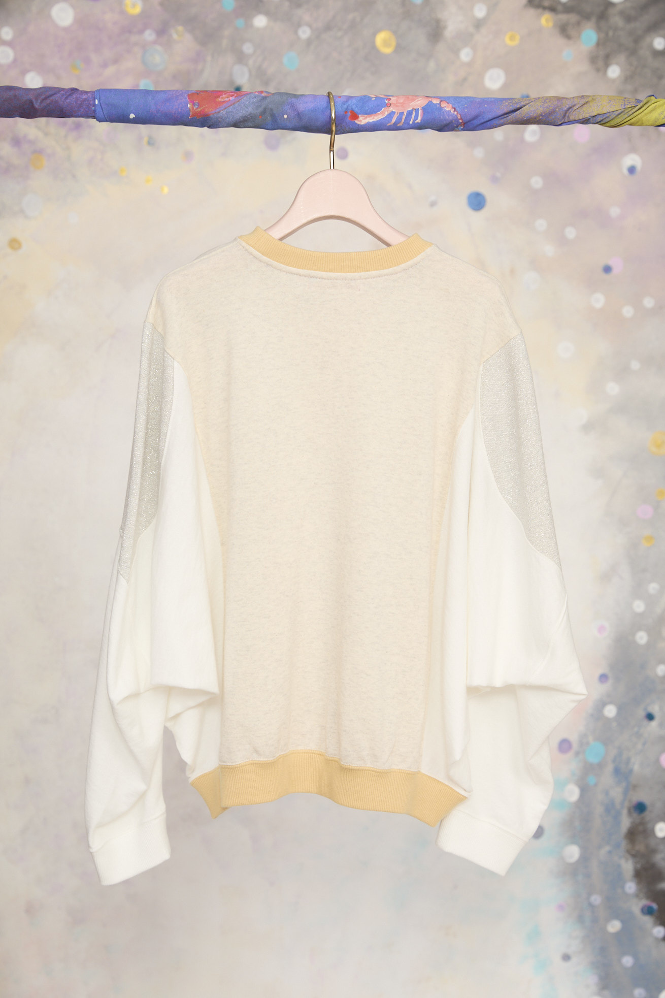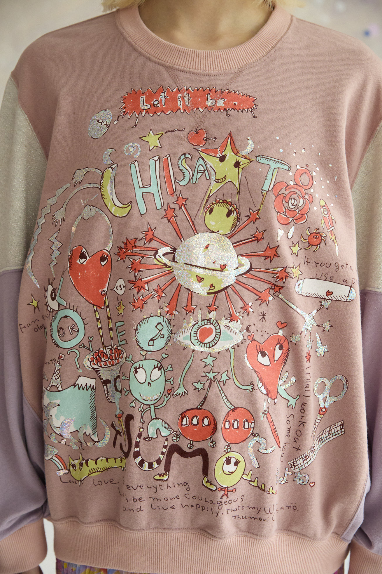 ハートの顔、翼の生えた不思議な生き物や猫宇宙人、富士山、足の生えた文字たち。 「Let it be !」「Live happily」「だよね」など、津森千里の口癖のようなおしゃべり言葉を散りばめた、さまざまなモチーフがぎゅっと詰まった、キュートで物語性のあるプリントです。 自由に描かれたイラストと、遊び心あふれる言葉たちが重なり、見ているだけで楽しいツモリチサトらしい世界観を表現しています。 色の組み合わせや、ピカピカとした箔プリントのきらめきもポイント。 プリントに奥行きと華やかさをプラスし、スタイリングの主役になる存在感のある一枚に仕上げています。 素材には、軽さとやわらかさが特徴のガーゼ裏毛を使用。 肌なじみがよく、リラックス感のある着心地で、シーズンを通して楽しめる素材感です。 袖に合わせたラメ裏毛、カラーによって違う配色もデザインポイントです。 プリントは京都でシルクスクリーンプリントを施し、細かな線や箔の表情まで丁寧に表現しています。 ケア方法:手洗い可能 着用モデル身長:165cm 着用サイズ:2(M) ※表記のサイズはサンプル商品での計測の為、若干の誤差が生じます。予めご了承ください。 ※完全受注生産の為、オーダー後の変更・キャンセルはお受けしておりません。予めご了承ください。