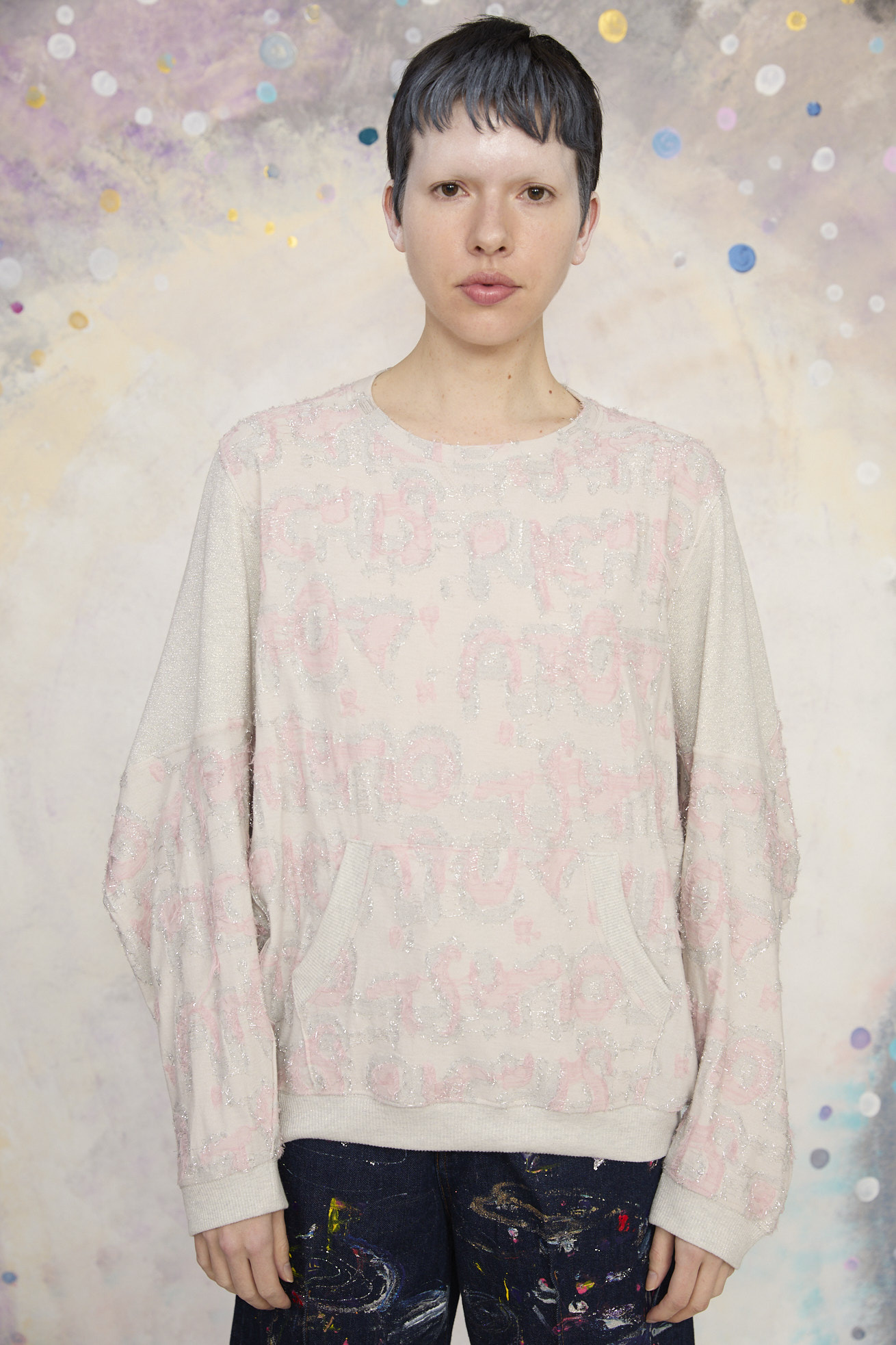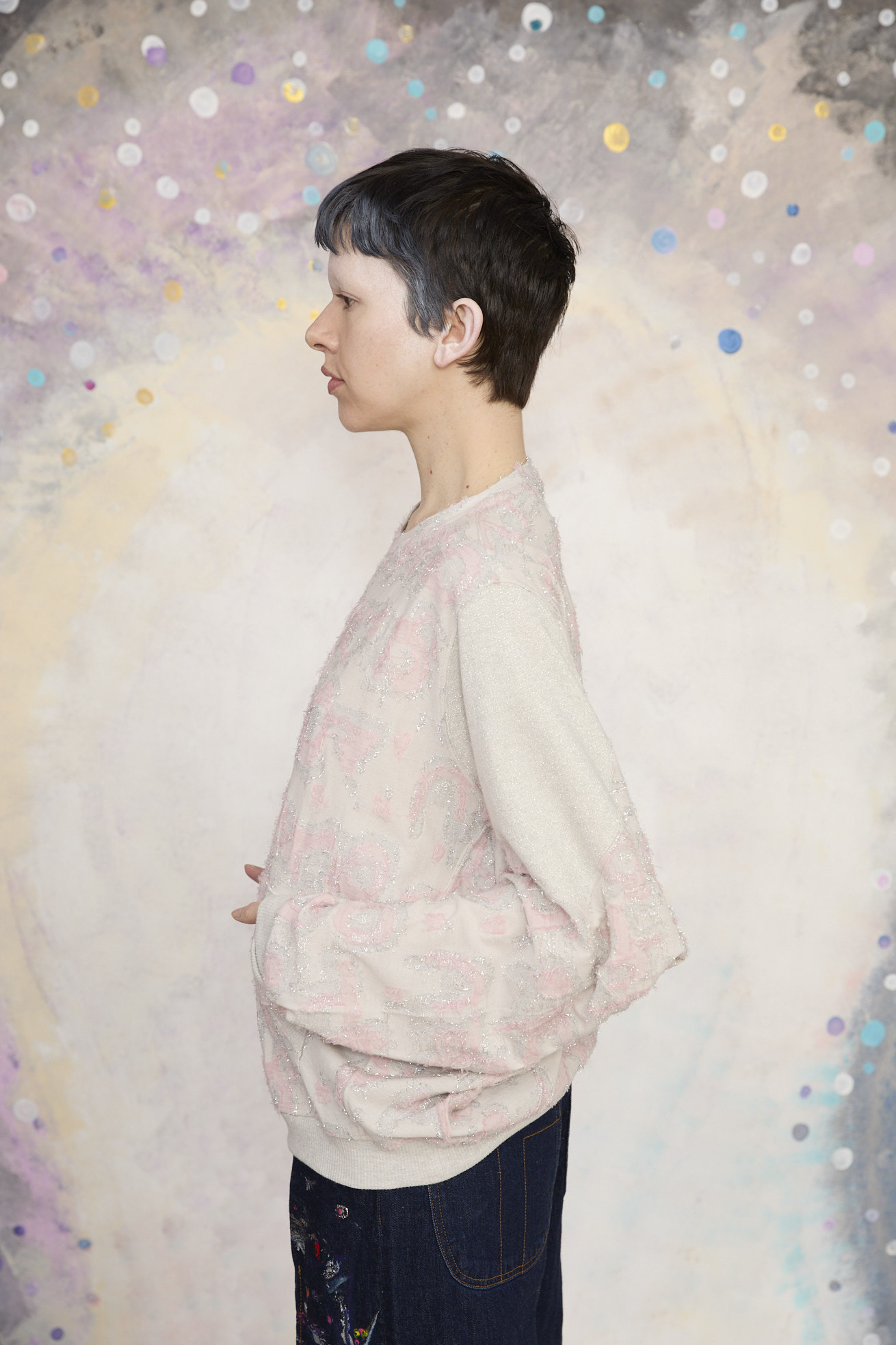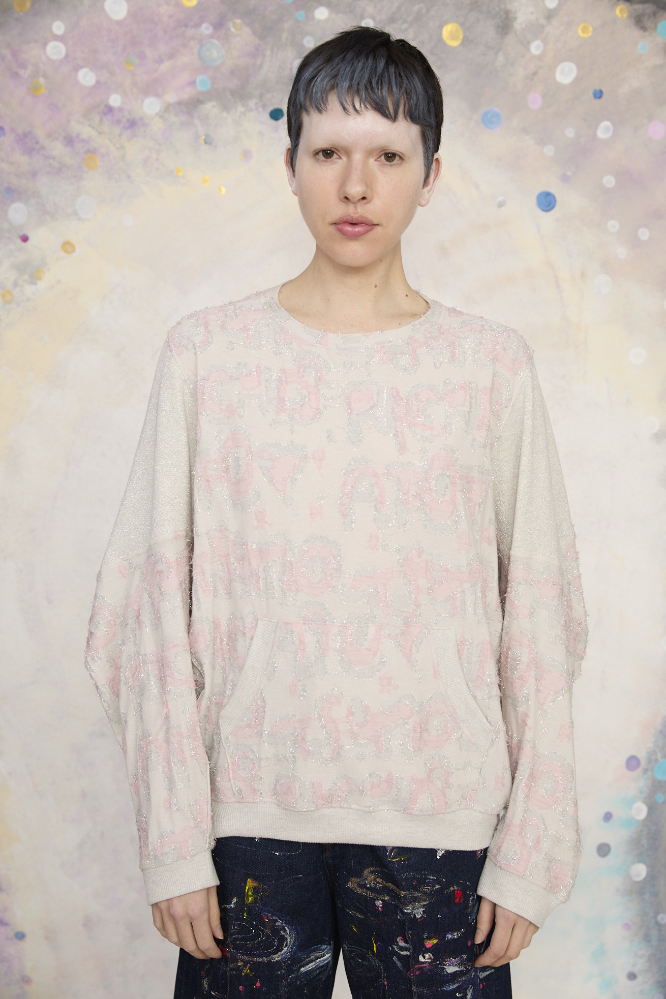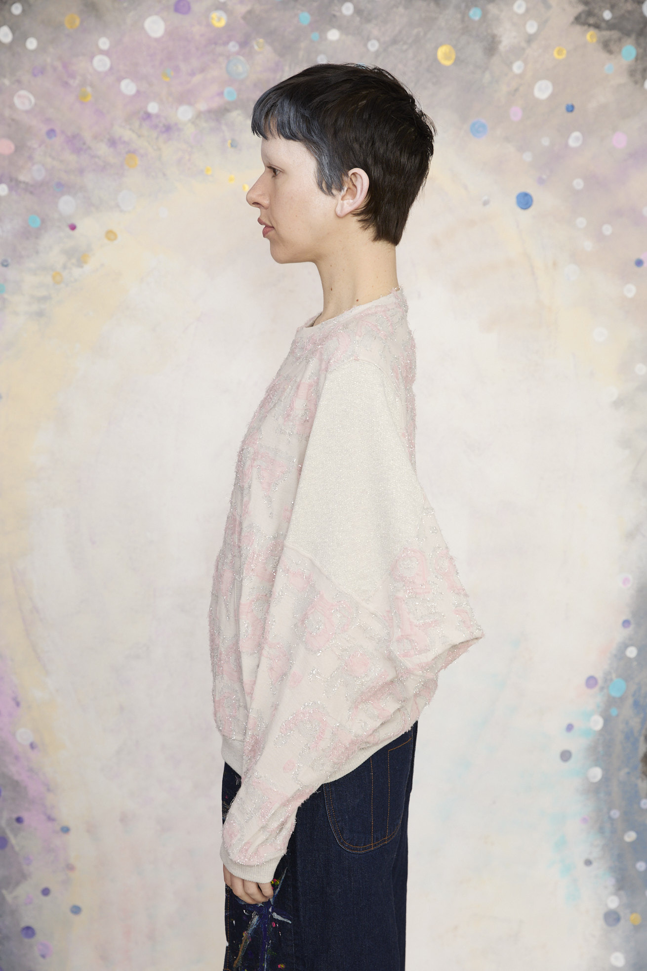 やさしく光るシルバーのラメ糸と、カットジャカードの風合いが目を惹くラグランスリーブのトップス。 コットンベースで薄手の生地感なので、着用期間が長くご利用いただけます。 ラフな手書きロゴを、キラキラのシルバーラメ糸とピンクの糸で、スペイシーでありつつ可愛らしい印象に仕上げました。 ゆったりとしたサイズ感で、カジュアルなコーディネートにもオススメです。 ※カットジャガードの特性上、カット残りがあります。着用時は引っ掛かけにご注意ください。 ケア方法:手洗い可能 着用モデル身長:173cm 着用サイズ:2(M) ※表記のサイズはサンプル商品での計測の為、若干の誤差が生じます。予めご了承ください。 ※完全受注生産の為、オーダー後の変更・キャンセルはお受けしておりません。予めご了承ください。