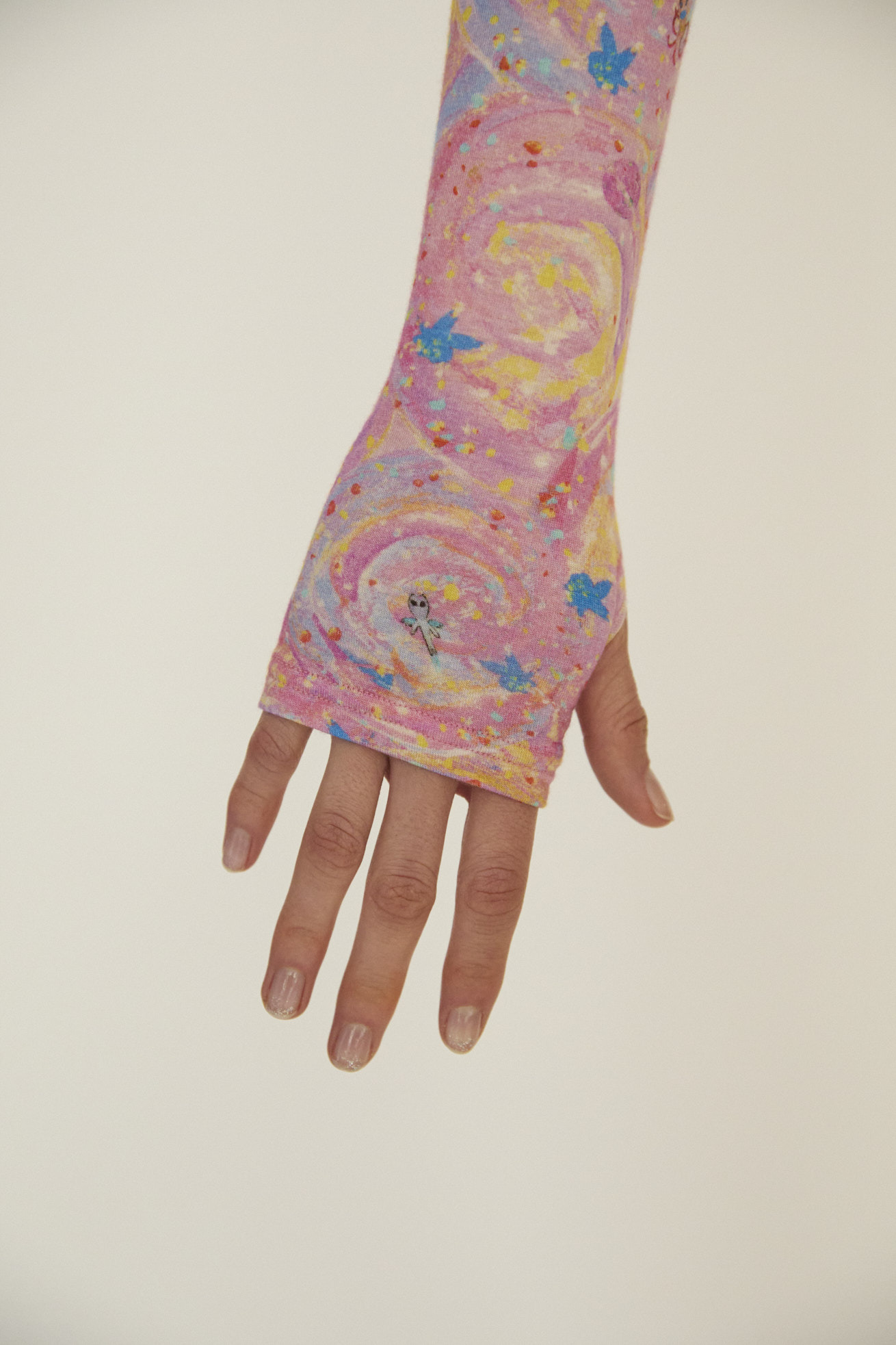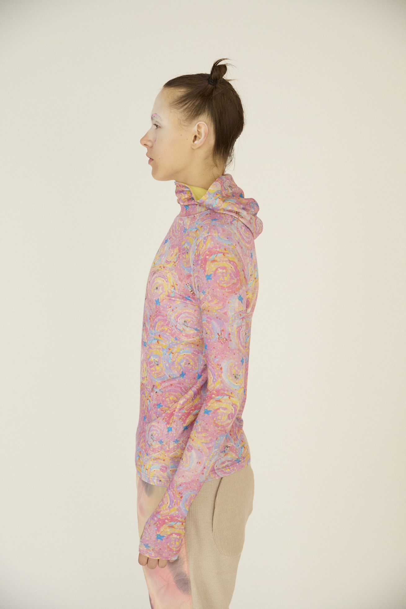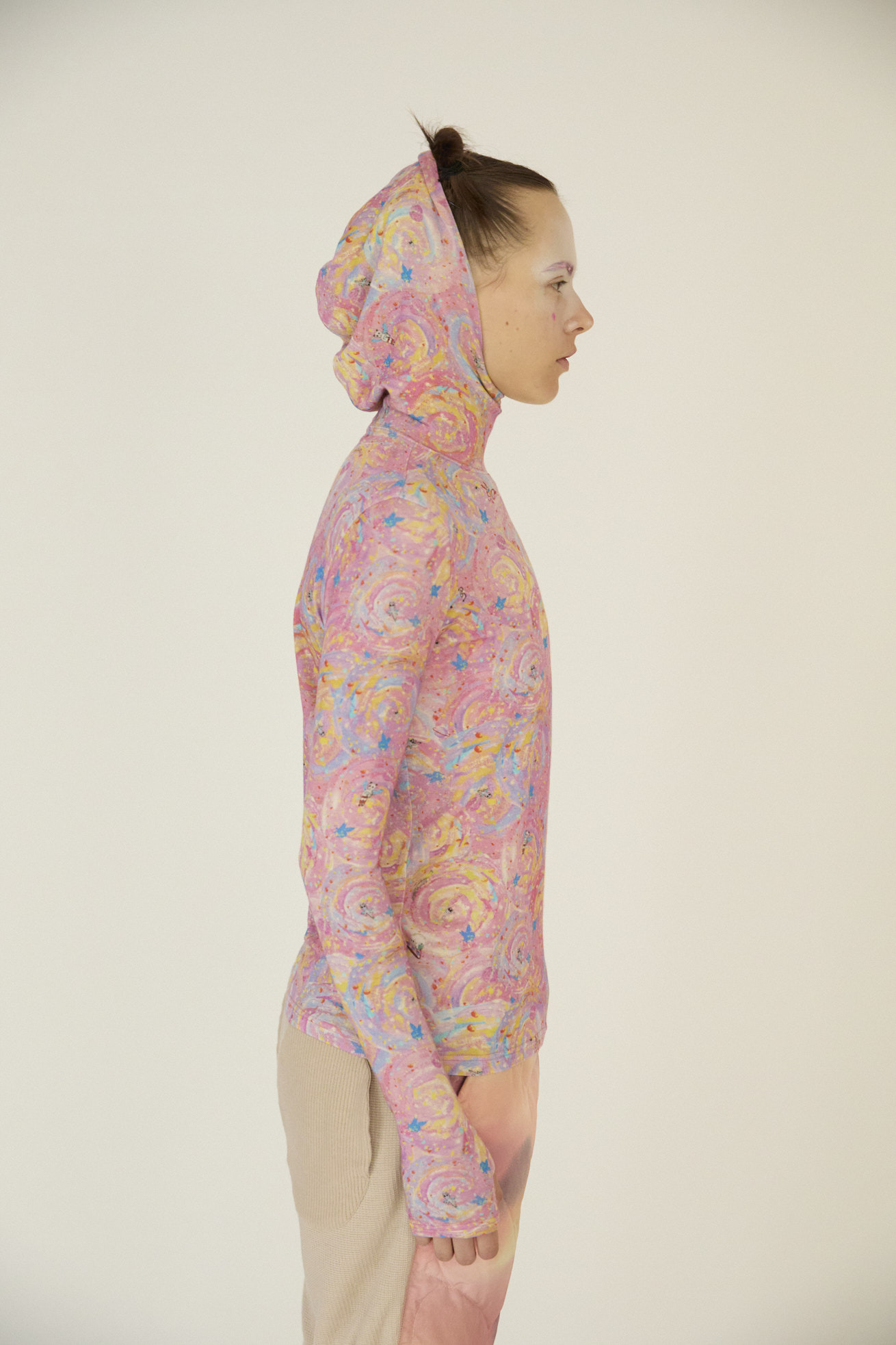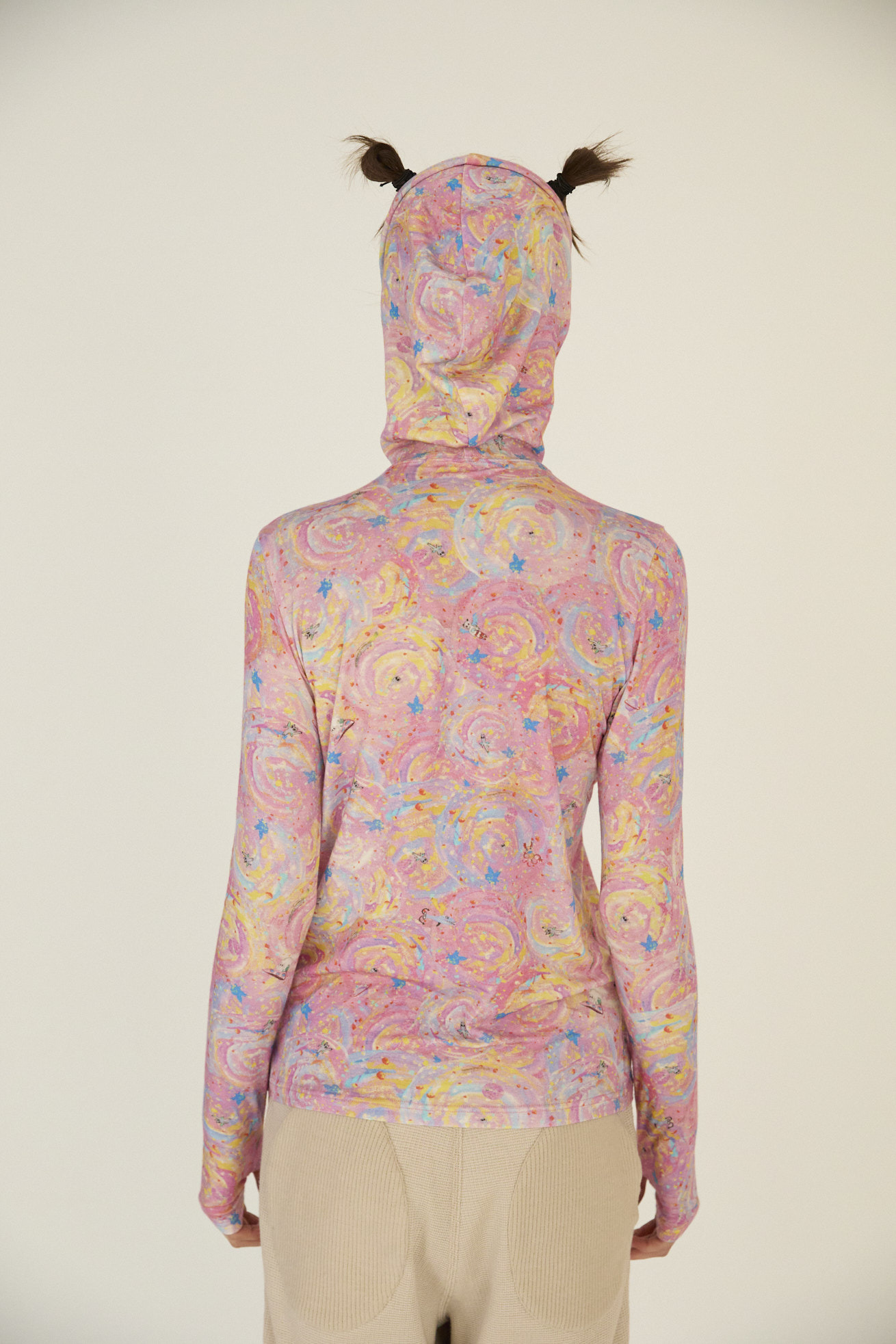 肌触りがなめらかで伸縮性の高いテンセルベア天竺を使用したフード付きトップス。 フィット感がありながら、いやな締め付けがなくインナーウェアとしてご利用いただけます。 長めの袖のデザインが、重ね着をした時にもアクセントとなり存在感のあるアイテムです。 プリントはたくさんの星が集まるアンドロメダ星雲や、いくつもの銀河が交差する世界をイメージしたファンタジーあふれるAndromeda Print。 手の翼を持った魚、足の生えたマンボウ、猫の宇宙飛行士などの不思議な生き物も浮遊しています。 よく見るとアンドロメダ銀河の間を駆け抜ける銀河鉄道や、猫宇宙人の姿が隠れており、眺めるたびに新しい発見がある遊び心のある一枚に仕上げました。 たくさんの星を思わせるカラフルな描写と重なり合う色彩が織りなす、ツモリチサトらしい物語性のあるテキスタイルです。 ※プリント柄の出方はランダムです。予めご了承ください。 ケア方法:手洗い可 着用モデル身長:175cm 着用サイズ:2(M) ※表記のサイズはサンプル商品での計測の為、若干の誤差が生じます。予めご了承ください。 ※完全受注生産の為、オーダー後の変更・キャンセルはお受けしておりません。予めご了承ください。