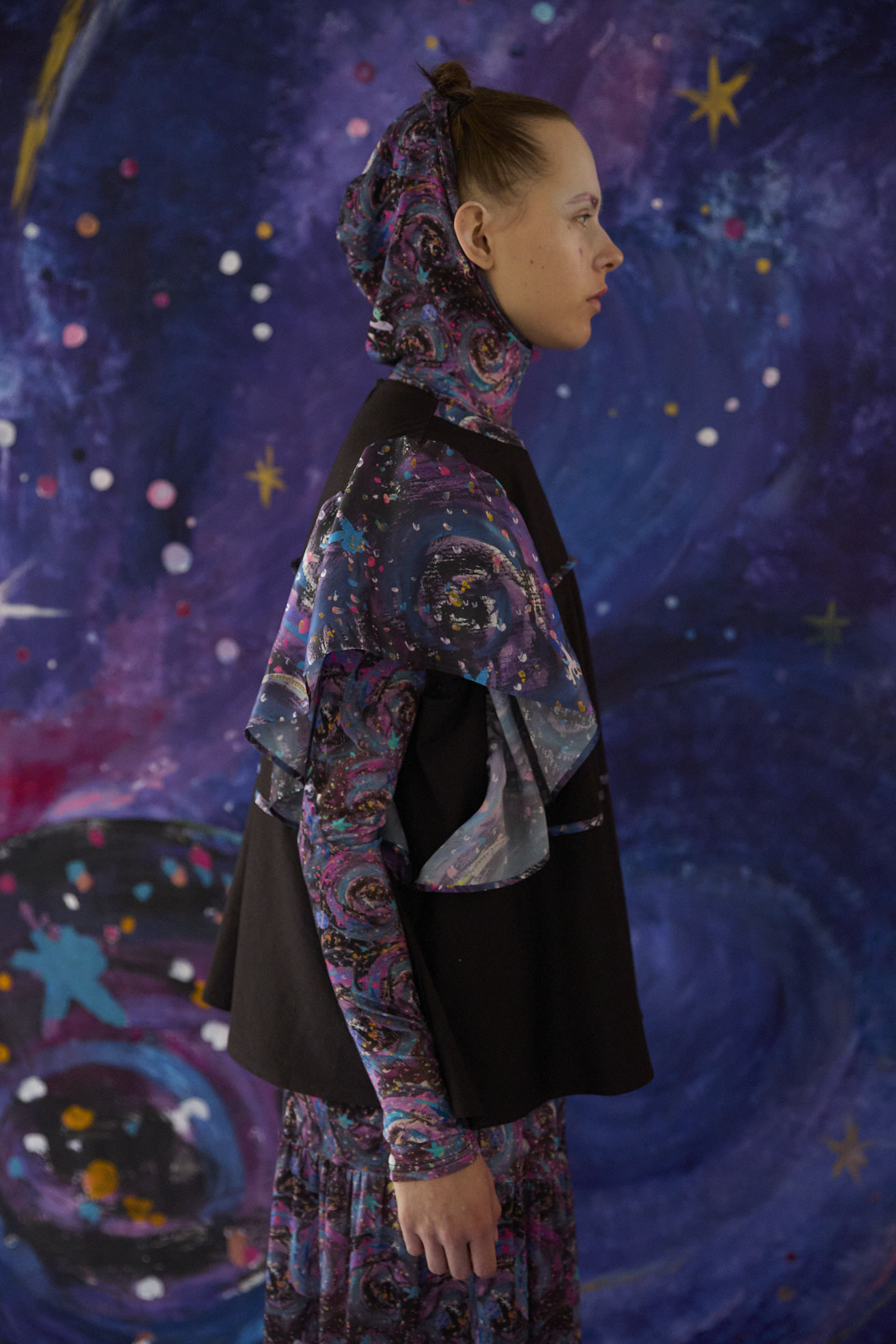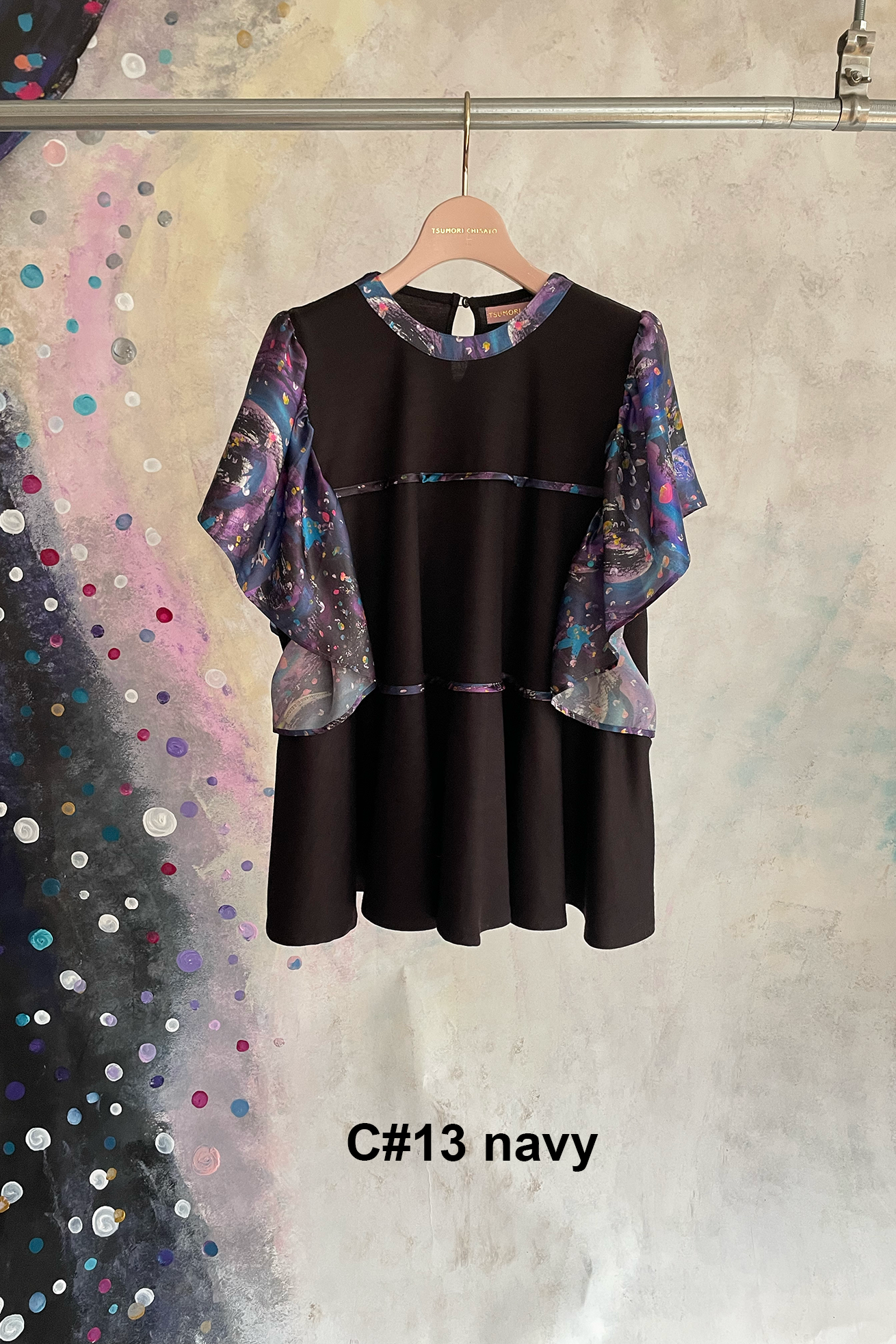 なめらかな肌触りと伸縮性の高いウール100%の生地をベースに、シルクサテンのAndromeda Printを袖と身頃にライン状にパイピングをしたトップス。 コンパクトな襟開きとAラインに広がるシルエットのバランスが女性らしいアイテムです。 重ね着もしやすいデザインなので、インナーと合わせてコーディネートをお楽しみください。 <Andromeda > たくさんの星が集まるアンドロメダ星雲や、いくつもの銀河が交差する世界をイメージした、ファンタジーあふれるプリントです。手の翼を持った魚、足の生えたマンボウ、猫の宇宙飛行士などの不思議な生き物も浮遊しています。 よく見ると、アンドロメダ銀河の間を駆け抜ける銀河鉄道や、猫宇宙人の姿が隠れており、眺めるたびに新しい発見がある、遊び心のある一枚に仕上げました。 たくさんの星を思わせるカラフルな描写と、重なり合う色彩が織りなす、ツモリチサトらしい物語性のあるテキスタイルです。 プリントは福井でインクジェットプリントを施し、色の重なりやタッチを丁寧に表現しています。 ケア方法:ドライクリーニング 着用モデル身長:175cm 着用サイズ:2(M) ※表記のサイズはサンプル商品での計測の為、若干の誤差が生じます。予めご了承ください。 ※完全受注生産の為、オーダー後の変更・キャンセルはお受けしておりません。予めご了承ください。