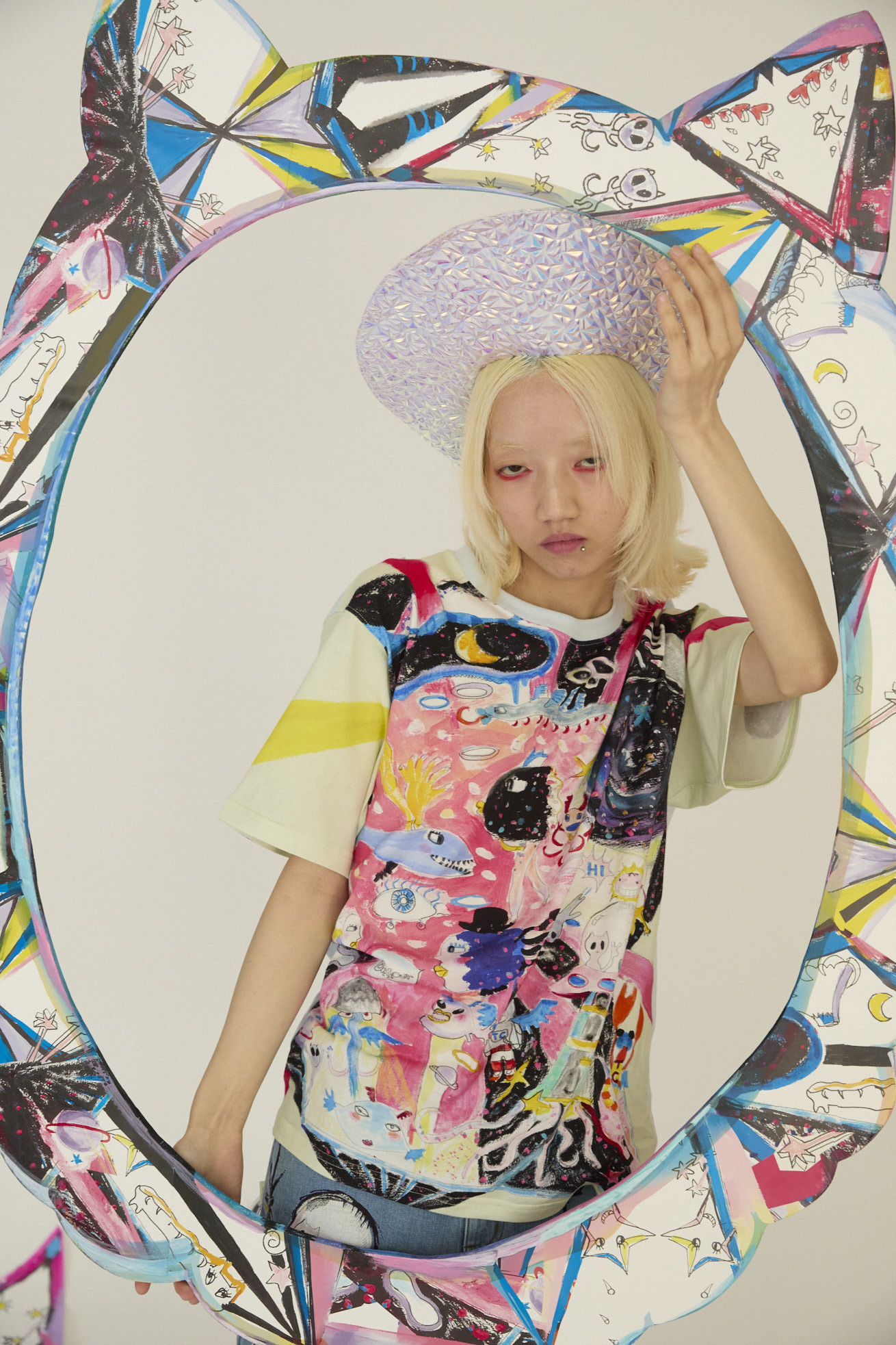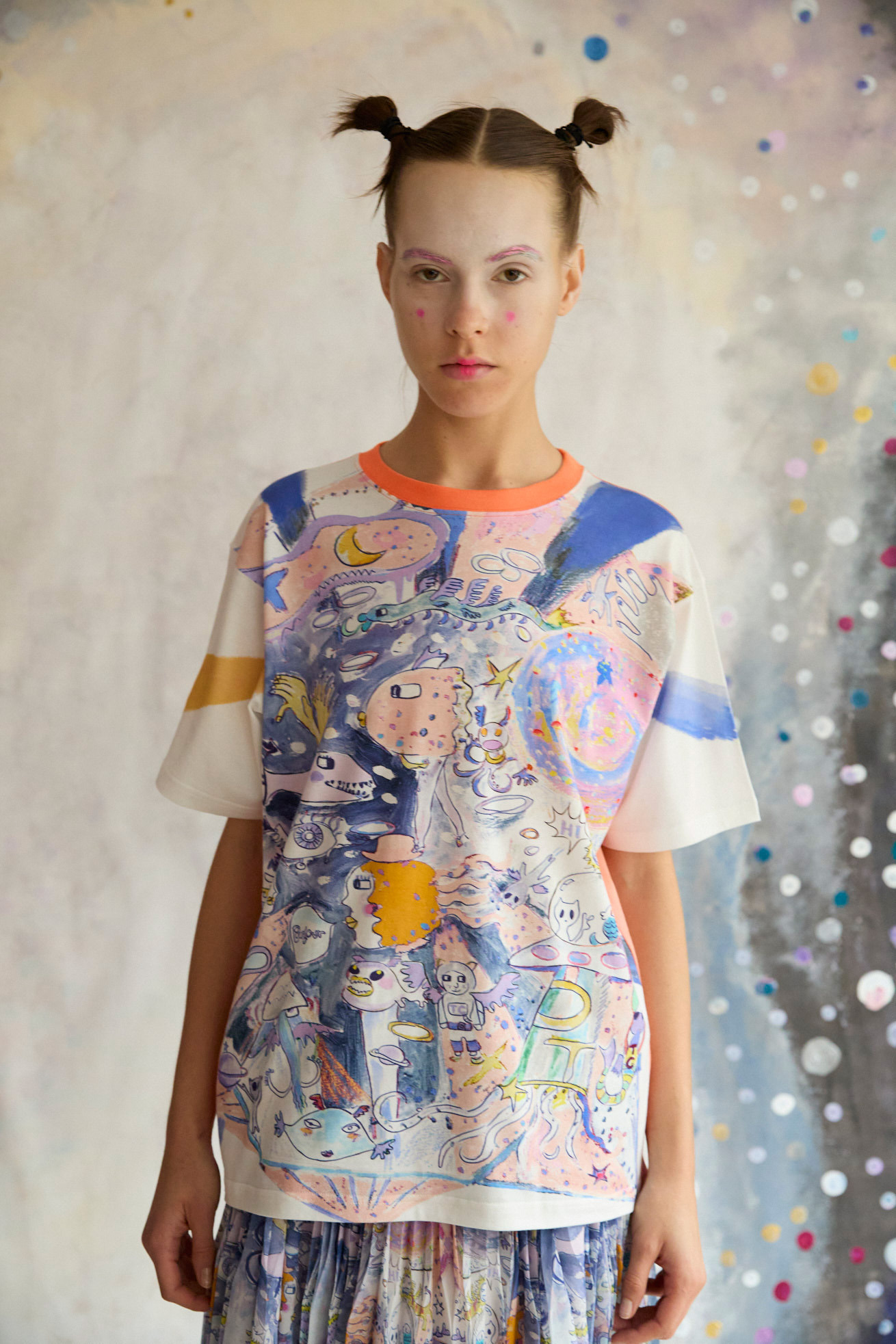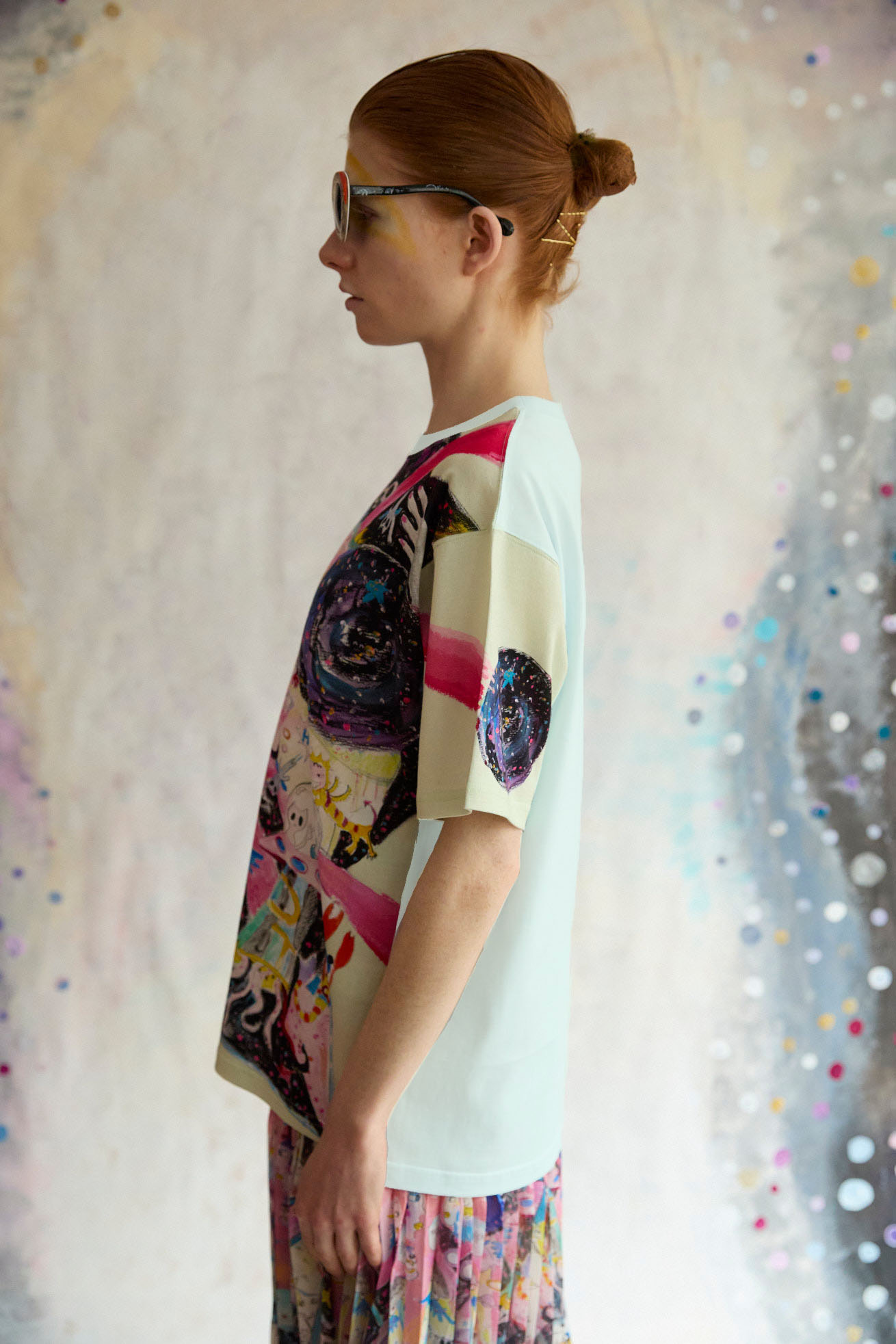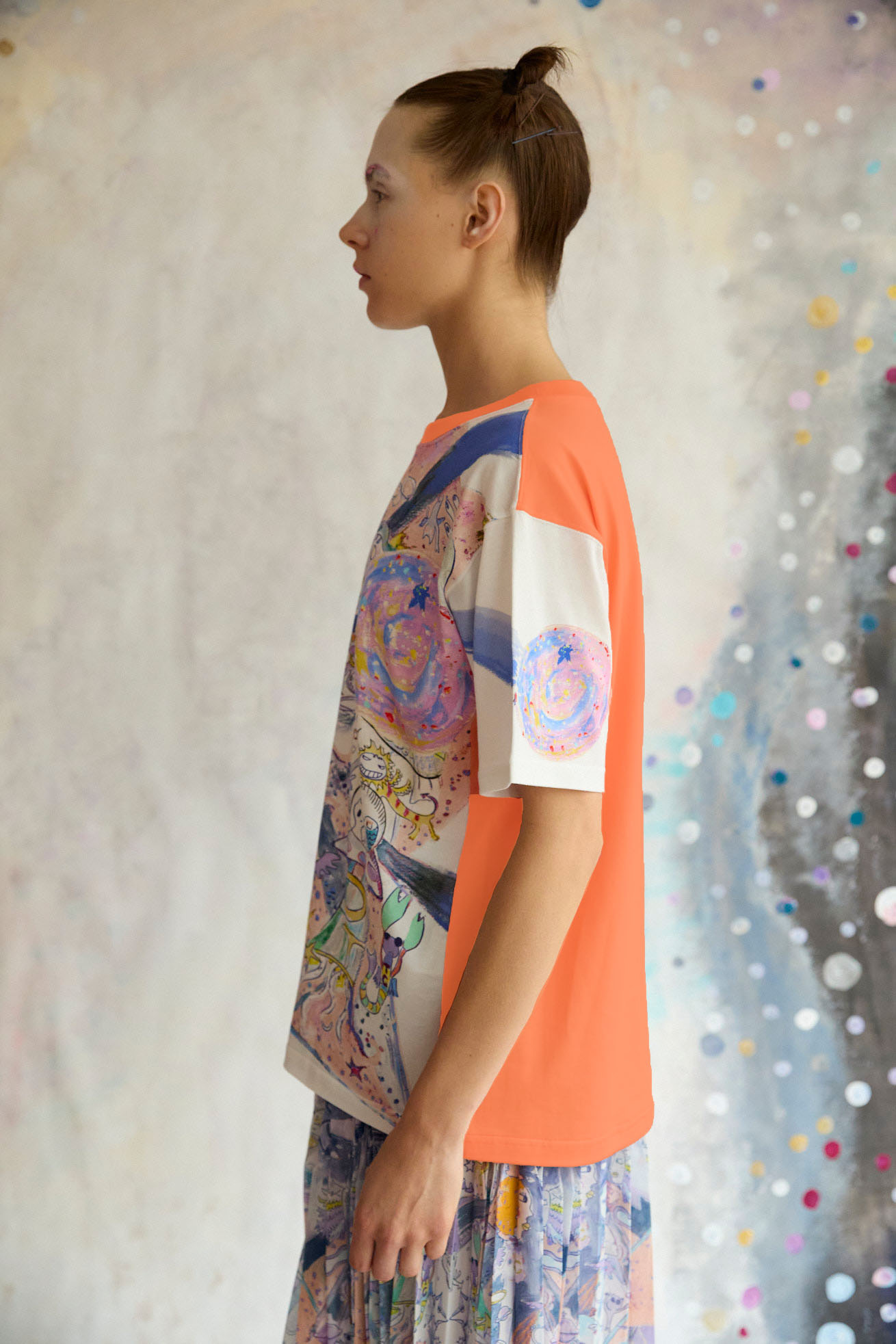 手の翼を持った魚、足の生えたマンボウ、ウーパールーパーのようなタコ、猫の宇宙飛行士、「Bonjour」と挨拶をする帽子を被った不思議な生き物。 猫宇宙人やハート型の生き物、ライオンのような猫、ロケットに乗った猫や半魚人など、、、鏡のようにきらめく幾何学的な宇宙の世界に、個性豊かな不思議な生き物たちが現れます。 躍動感のある踊るような宇宙の世界は、見るたびに新しいキャラクターとの出会いを楽しめる1枚。鉛筆やペン、水彩で描いたタッチを、そのままの雰囲気でインクジェットプリントで表現しています。 なめらかで柔らかいコットンレーヨンの素材を使用し、ベーシックなデザインのTシャツに仕上げました。 袖部分にも入ったプリントや背面にもカラーを合わせ、透け感を気にせずご利用いただけます。 プリントは京都で加工をしています。 ケア方法:ドライクリーニング 着用モデル身長:C/#30:175cm / C/#29:170cm / C/#29:165cm 着用サイズ:2(M) ※表記のサイズはサンプル商品での計測の為、若干の誤差が生じます。予めご了承ください。 ※完全受注生産の為、オーダー後の変更・キャンセルはお受けしておりません。予めご了承ください。
