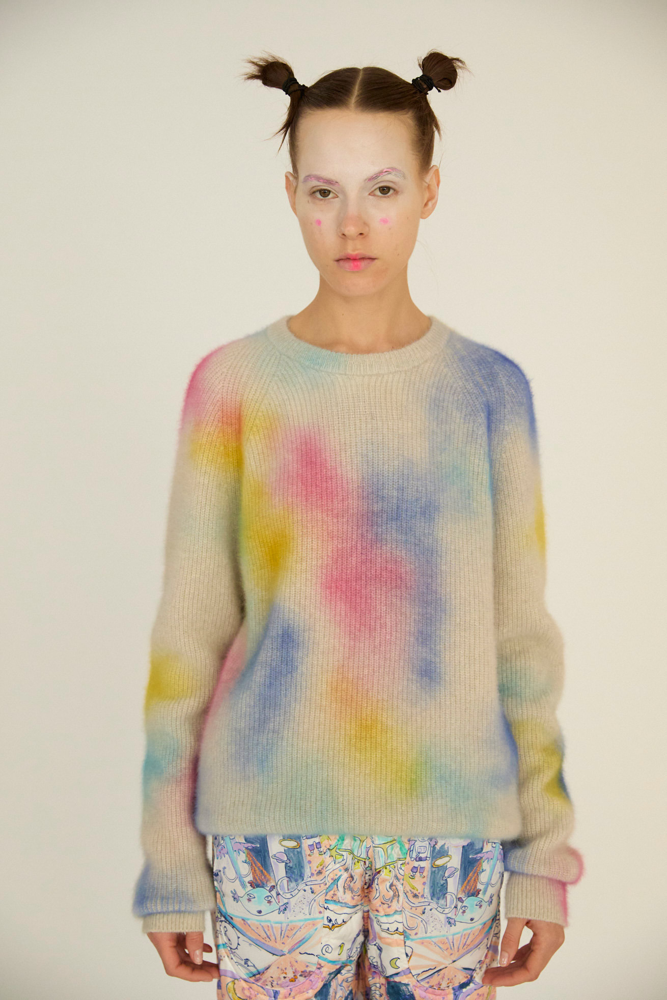 定番のBLUE FOXセーターにスプレー染めが新登場。 毛が柔らかく、へアリー感がありながら直接肌に触れても気持ちがよく、保温力の高さが特徴のブルーフォックス。 オーバーサイズに仕上げ、男女兼用でご利用いただけます。 染色は4色の染料をスプレーのように吹きつけて加工をしています。 ふわっと重なり合う色彩が銀河の世界のように広がり、軽やかでカラフルな表情に仕上げています。 東京都で一点一点、手作業による染色加工を施しており、一枚一枚が異なる表情をもつ特別感のあるアイテムです。 手染めならではの風合いを大切にしているため、染め上がりや色の出方には個体差が生じます。 ケア方法:ドライクリーニング 着用モデル身長:175cm 着用サイズ:2(M) ※表記のサイズはサンプル商品での計測の為、若干の誤差が生じます。予めご了承ください。 ※完全受注生産の為、オーダー後の変更・キャンセルはお受けしておりません。予めご了承ください。