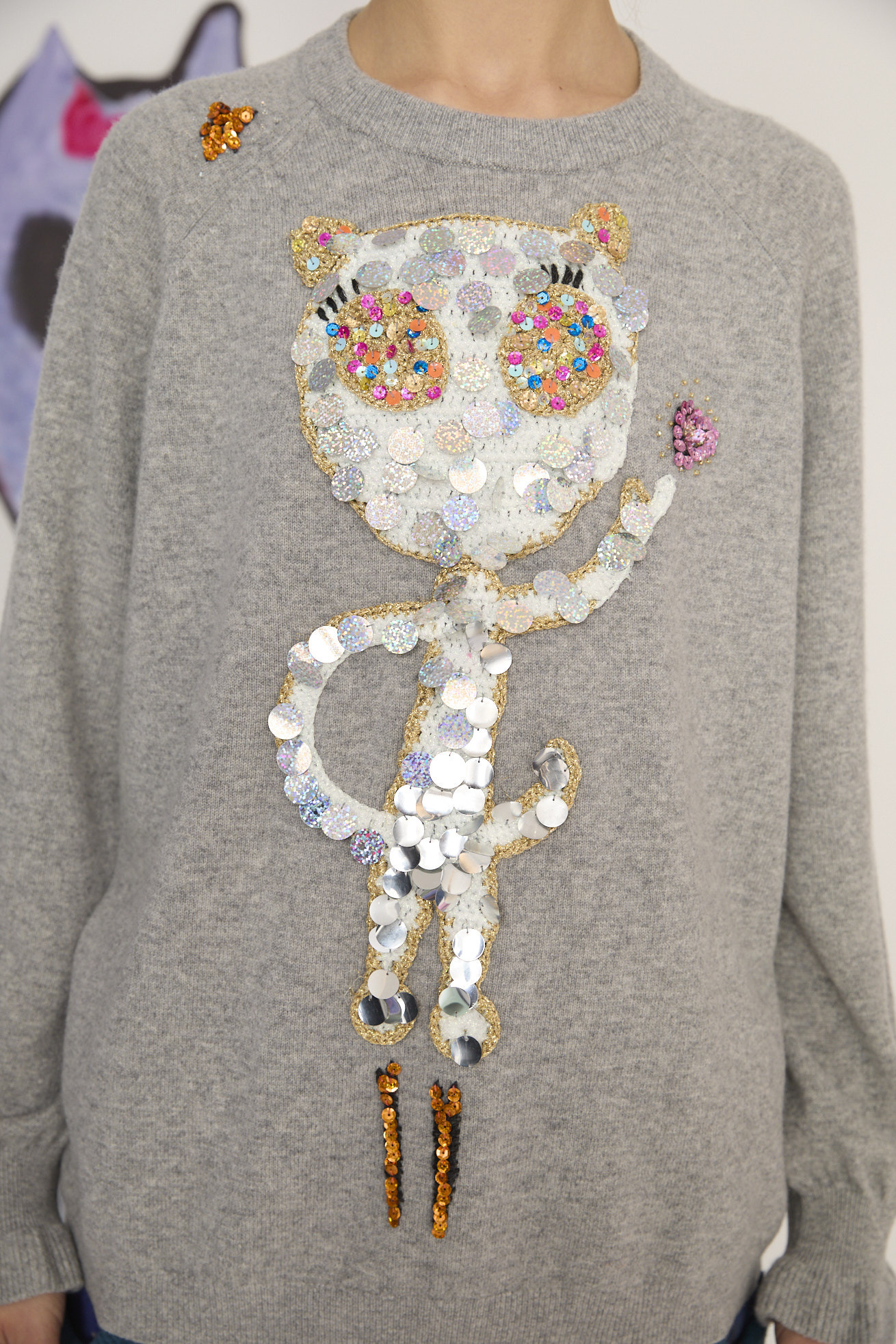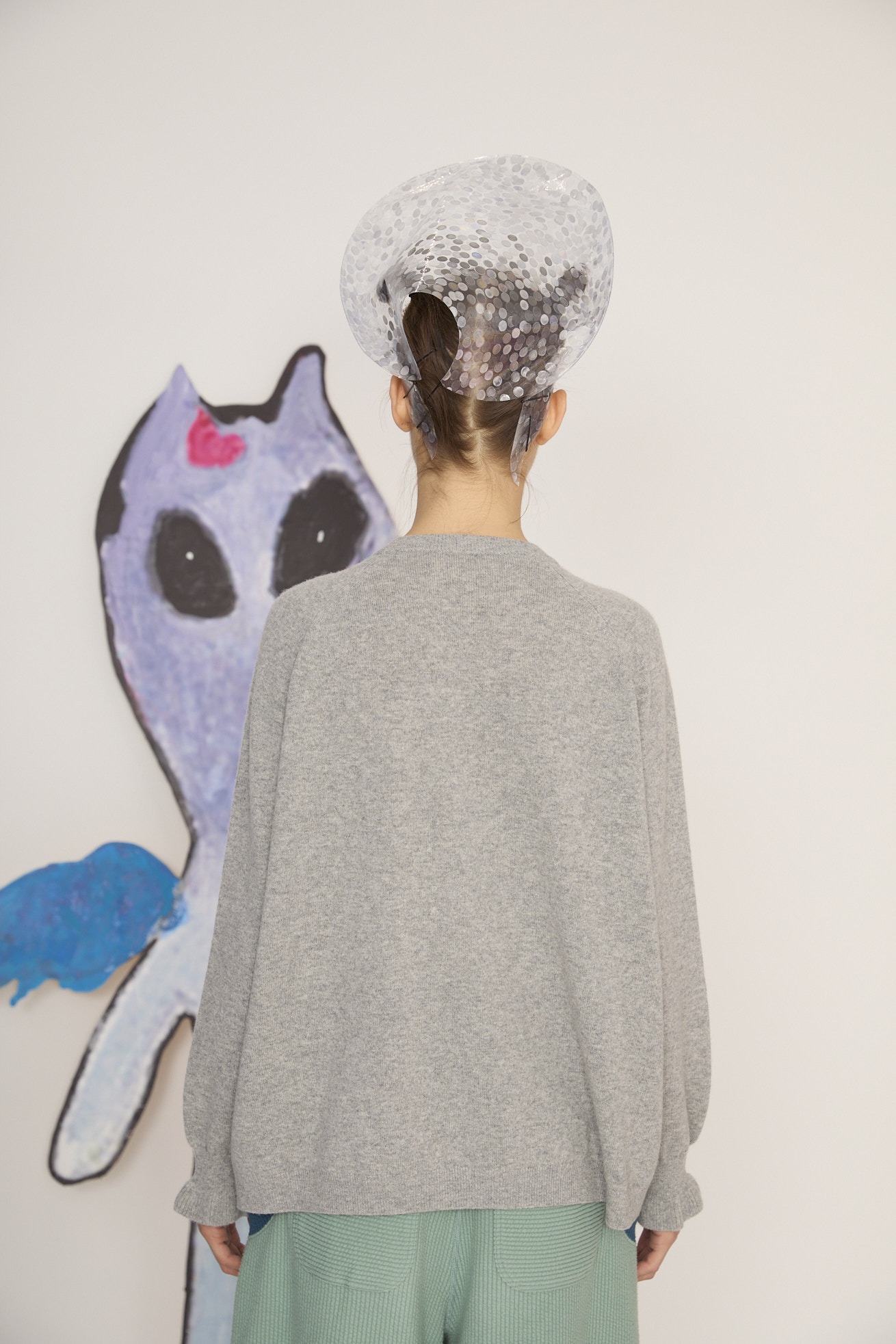 今シーズンのキーキャラクターである「猫宇宙人」が大胆に登場するニット。 猫宇宙人はラメ糸をベースに、大小のキラキラ光るスパンコールをプラスして手編みで作っています。 ベースのニットには繊維が極細で軽く、滑らかな肌触りが特長の上質なスーパーファインメリノウールを使用することで、二ット独特のチクチク感が少なく着心地の良いアイテムに仕上げています。 また、薄手に仕上げることで1枚でもインナーとしてもごわつかずに着用できます。 袖口のリブから広がるフリルデザインもポイントです。 ケア方法:ドライクリーニング 着用モデル身長: C/#18:165cm / C/#23:175cm 着用サイズ:2(M) ※表記のサイズはサンプル商品での計測の為、若干の誤差が生じます。予めご了承ください。 ※完全受注生産の為、オーダー後の変更・キャンセルはお受けしておりません。予めご了承ください。
