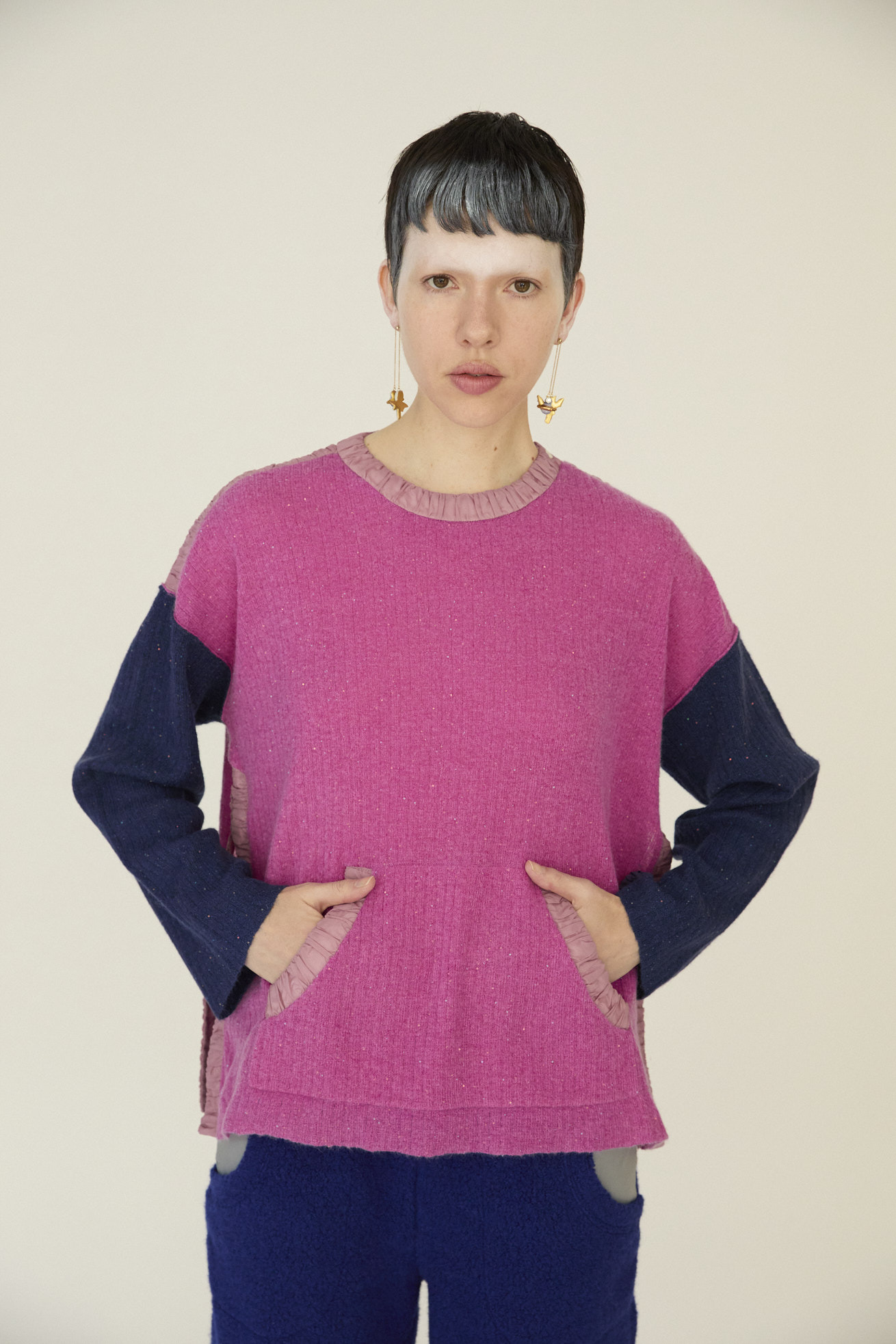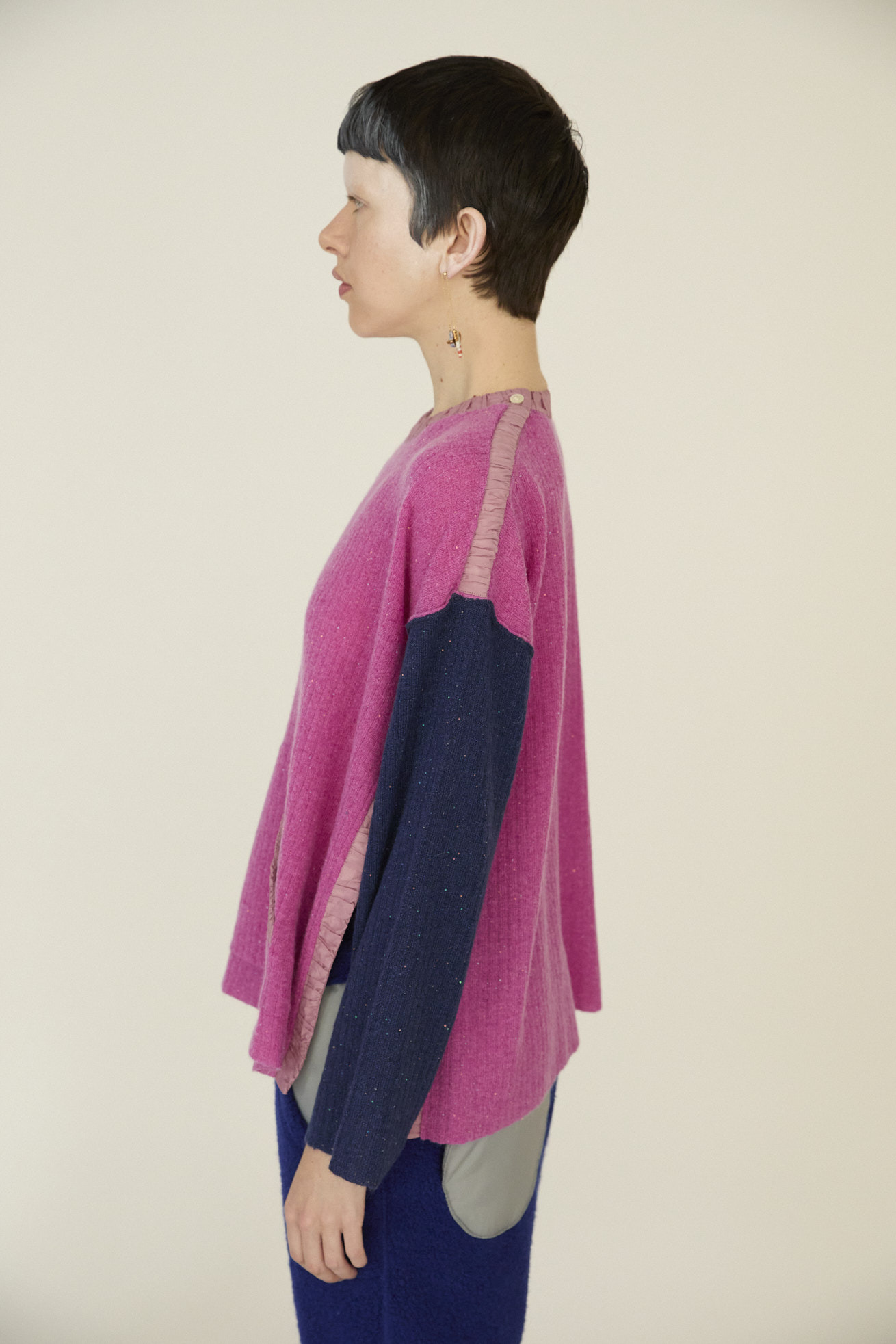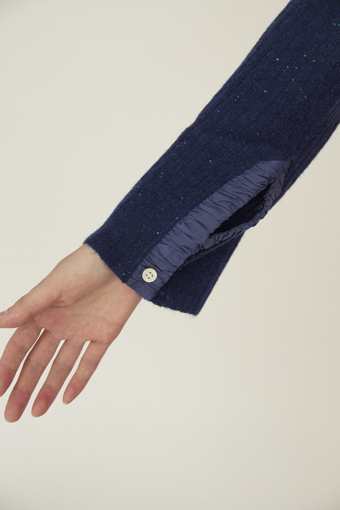 ふんわり軽いモヘアヤーンに小さなスパンコールを編み込んで作ったオーバーサイズニット。 袖の配色と襟元、袖、サイドスリット、ポケットにナイロン地のギャザー布を合わせた、異素材ミックスのデザインがポイントです。 軽い着心地と、動くたびにさり気なくきらめく素材感がコーディネートのアクセントになります。 深めのサイドスリットが抜け感をつくっています。 ケア方法:ドライクリーニング 着用モデル身長:173cm 着用サイズ:2(M) ※表記のサイズはサンプル商品での計測の為、若干の誤差が生じます。予めご了承ください。 ※完全受注生産の為、オーダー後の変更・キャンセルはお受けしておりません。予めご了承ください。