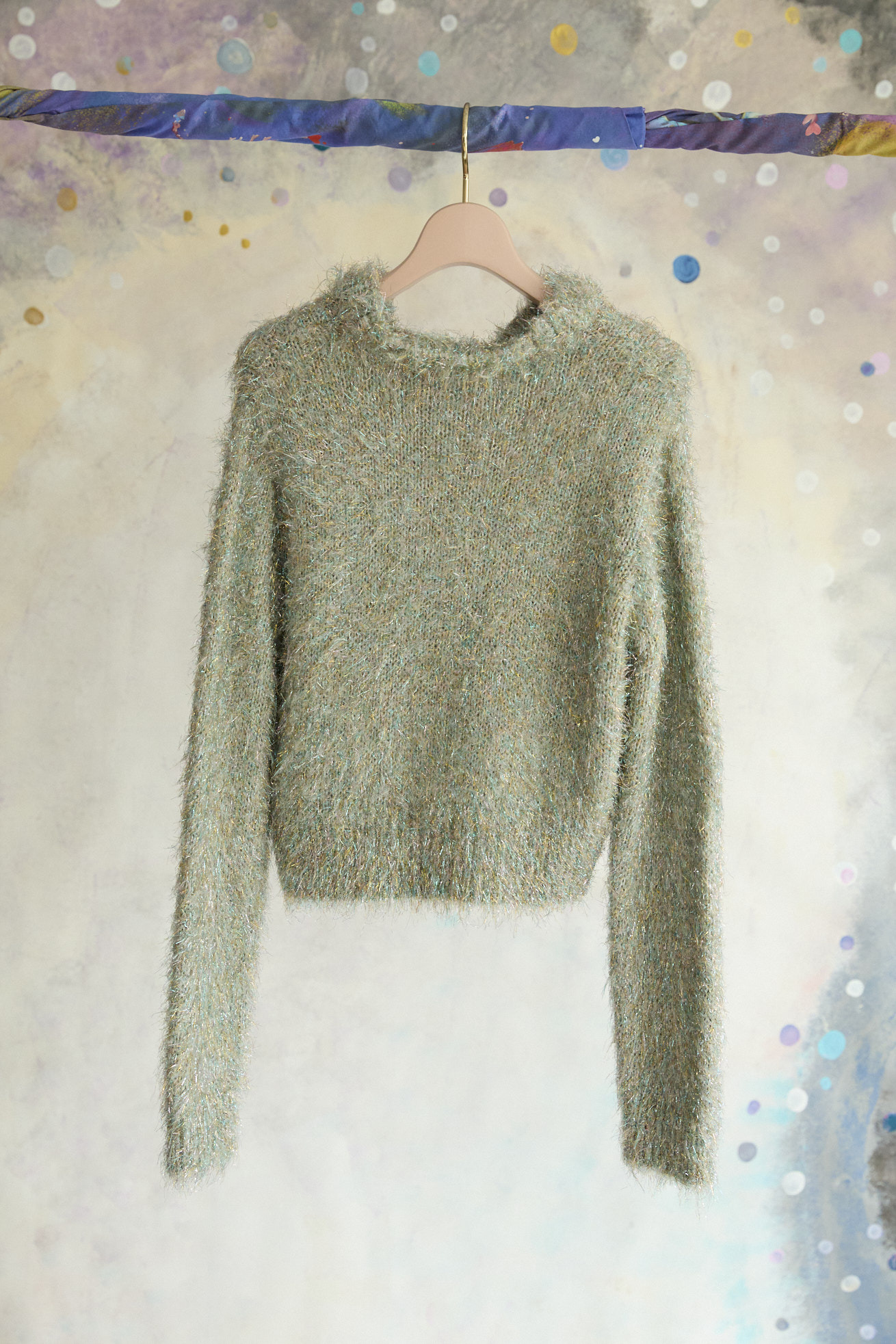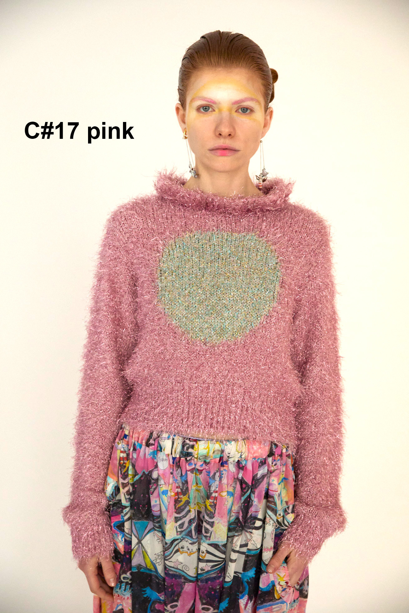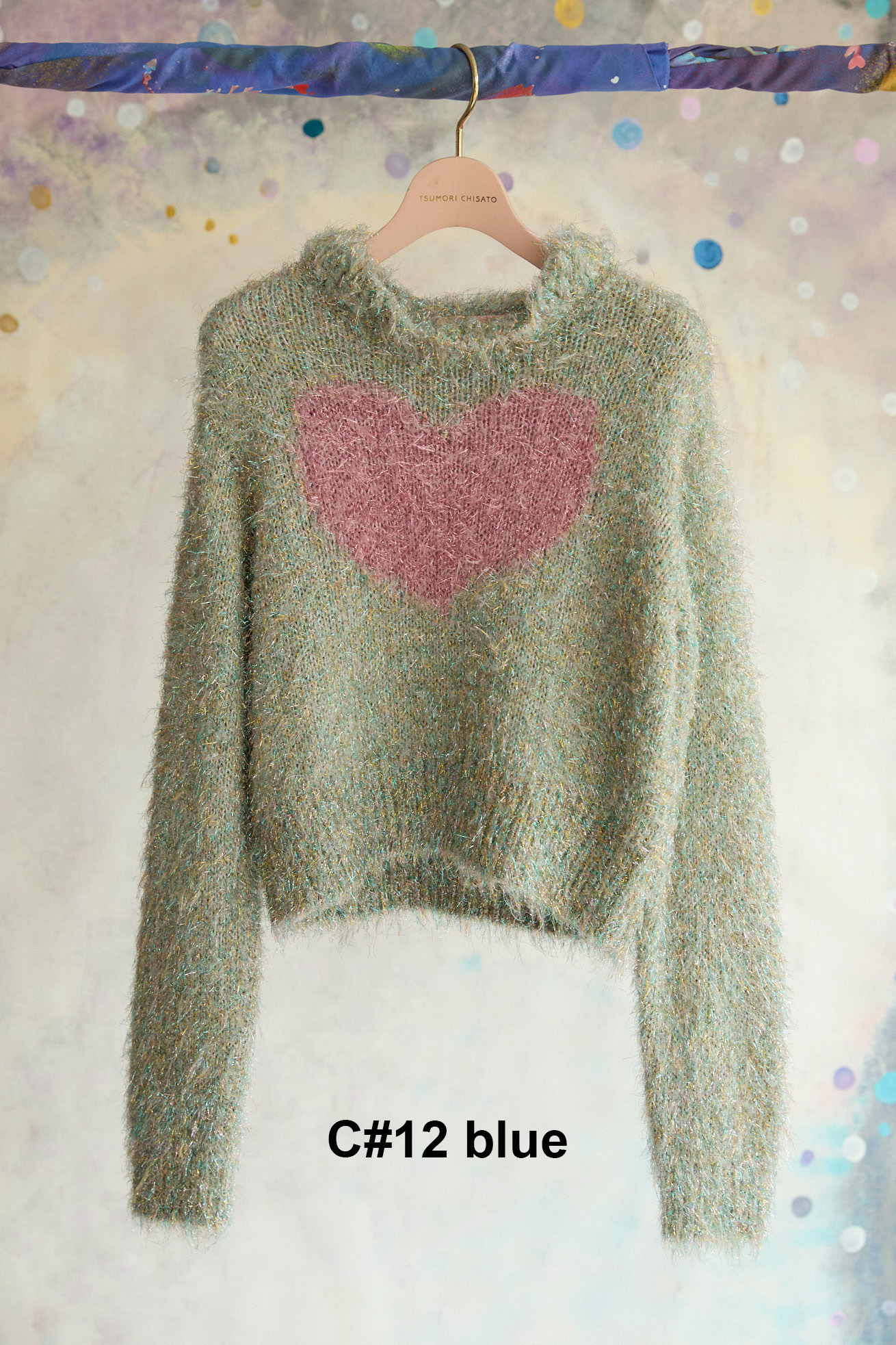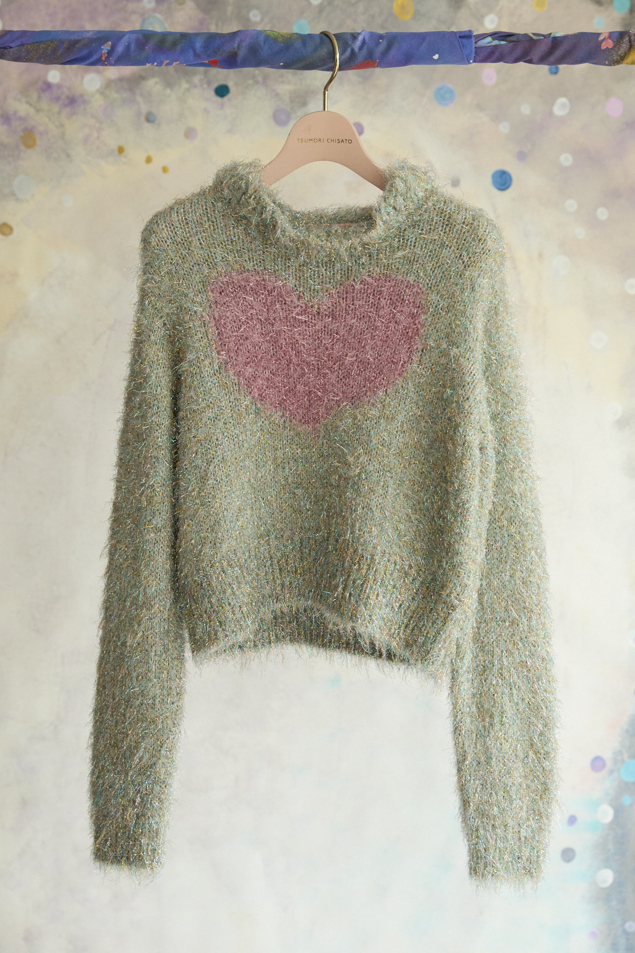 キラキラと存在感のあるラメ糸をファーヤーン状に加工したオリジナル糸で編んだショート丈ニット。 襟のフリルとラメ感がゴージャスな印象です。コンパクトなデザインですが、柔らかく嫌なフィット感がないニットです。 カラーによって異なる、マルとハートの切り替えがアクセントになっています。 ※素材の特性上、編み地の穴が広がって見える場合があります。(ファーの毛の乱れなど)引っかけにはご注意ください。 ケア方法:ドライクリーニング 着用モデル身長:170cm 着用サイズ:2(M) ※表記のサイズはサンプル商品での計測の為、若干の誤差が生じます。予めご了承ください。 ※完全受注生産の為、オーダー後の変更・キャンセルはお受けしておりません。予めご了承ください。