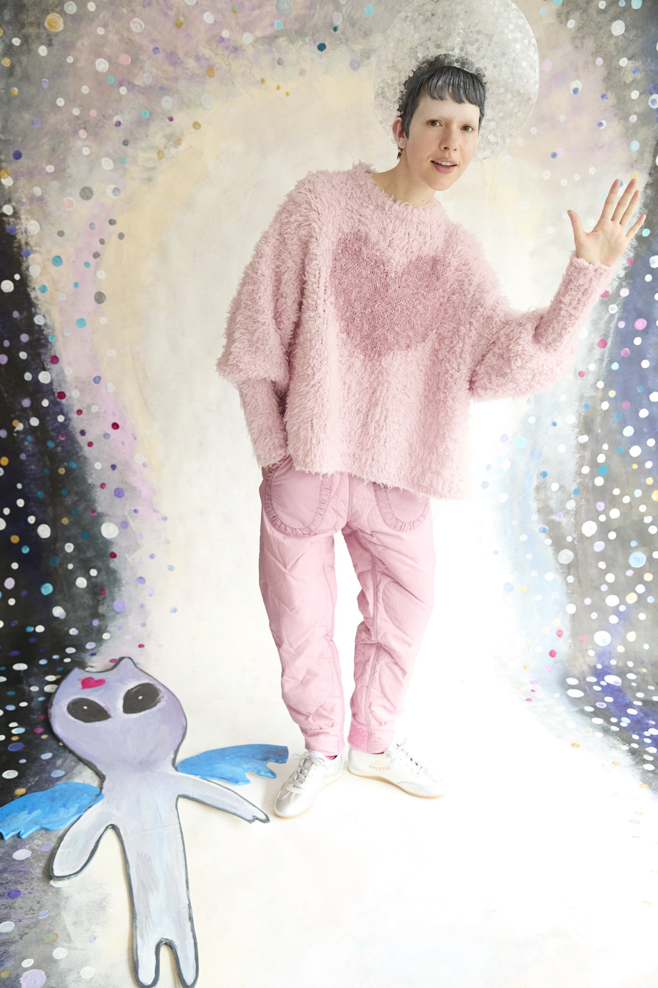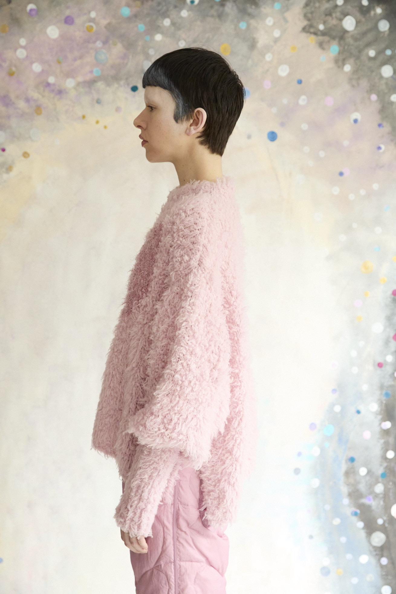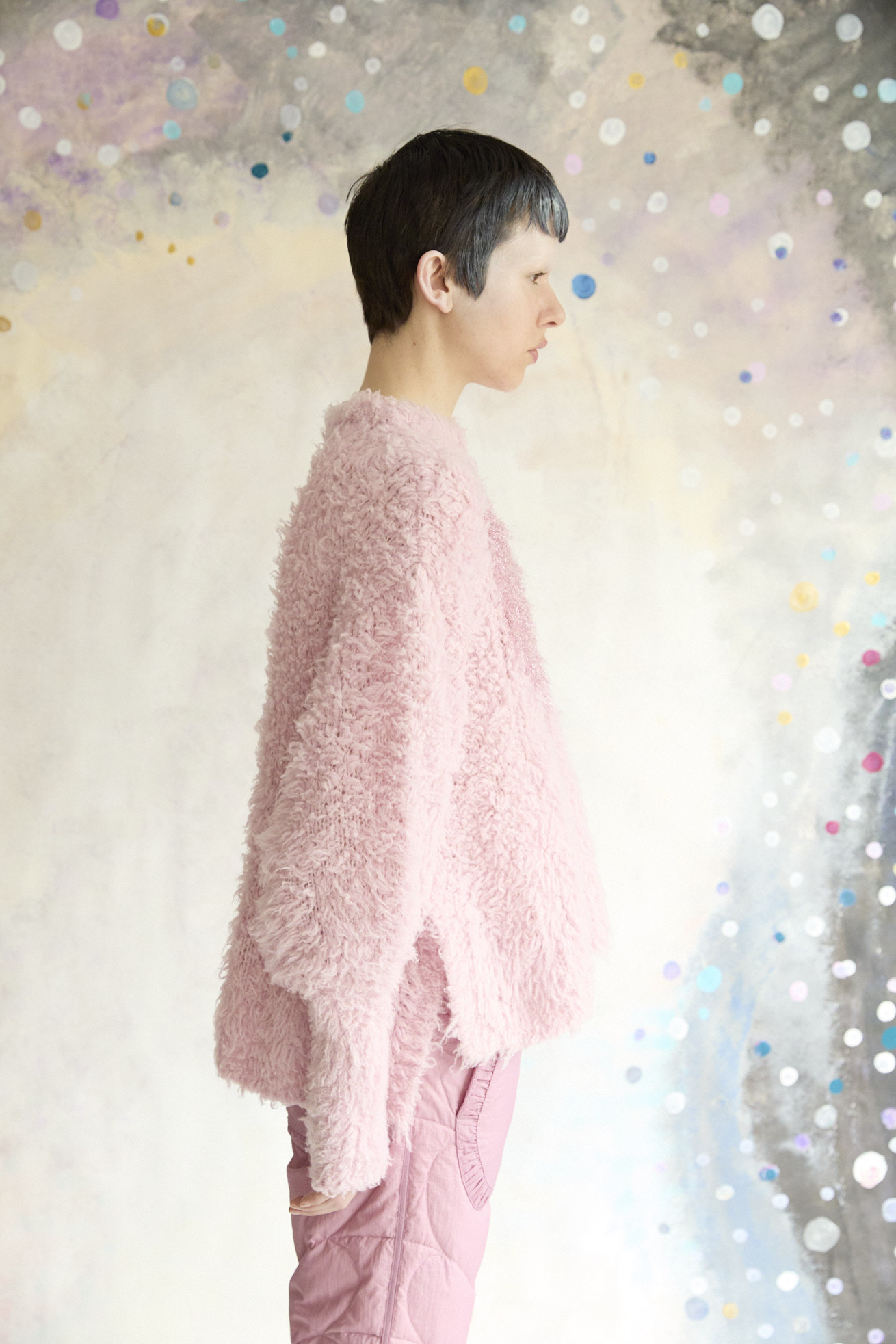 フロントのマルとハートの切り替えがポイントのオーバーサイズニット。 ベースにはカシミヤとウールをブレンドしたオリジナルファーヤーン、マルとハート部分にはオリジナルラメファーヤーンを使用しています。 なめらかで軽く、包み込まれるようなカシミヤウールファーは着心地がとても良く、しっかりあたたかいのが特徴です。 深めのスリットと前後差のある着丈、袖のリブを長めにとることで、メリハリのあるシルエットになり、オーバーサイズながらまとまりのあるニットに仕上げています。 ※素材の特性上、編み地の穴が広がって見える場合があります。(ファーの毛の乱れなど)引っかけにはご注意ください。 ケア方法:ドライクリーニング 着用モデル身長:173cm 着用サイズ:2(M) ※表記のサイズはサンプル商品での計測の為、若干の誤差が生じます。予めご了承ください。 ※完全受注生産の為、オーダー後の変更・キャンセルはお受けしておりません。予めご了承ください。