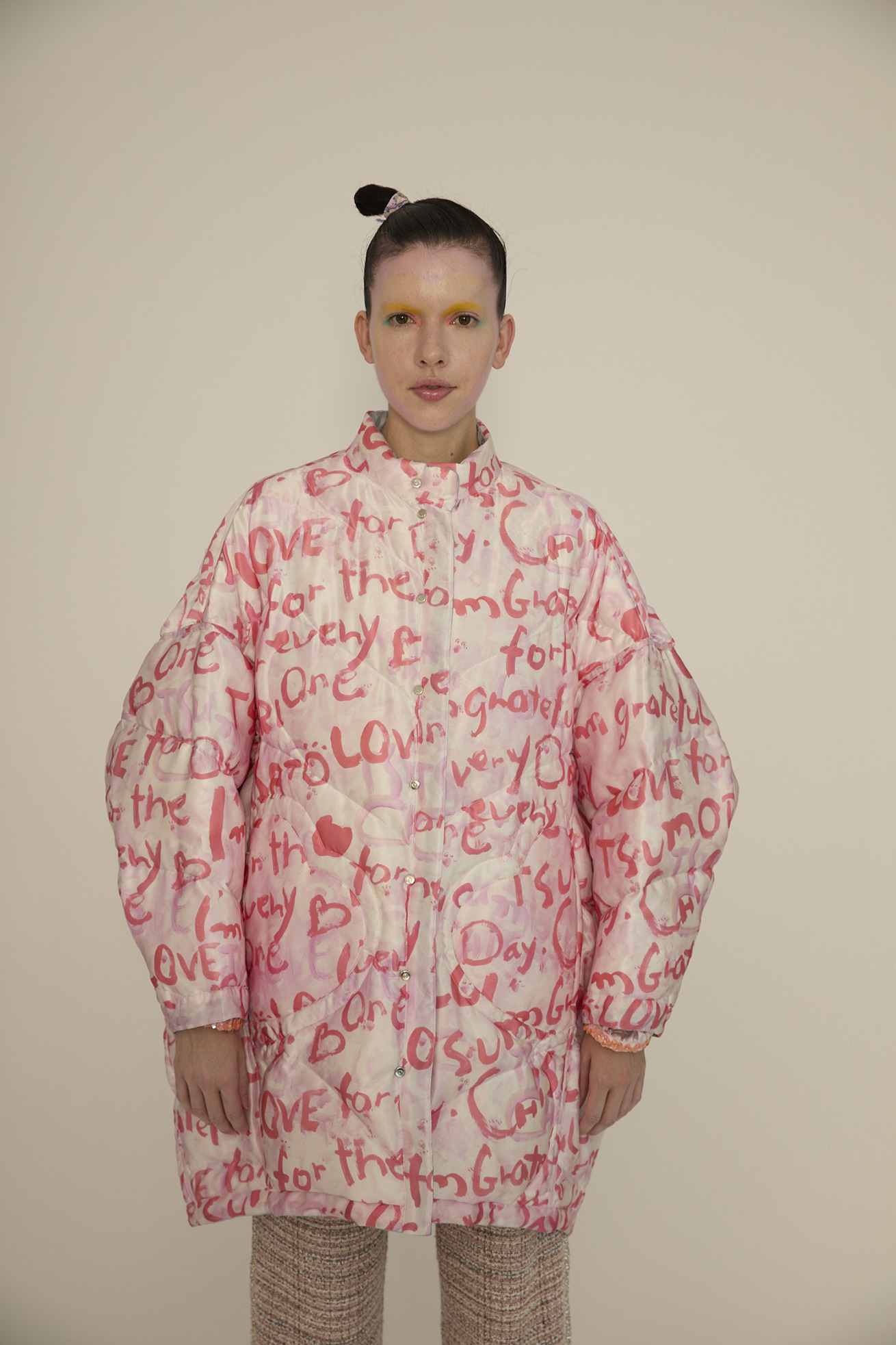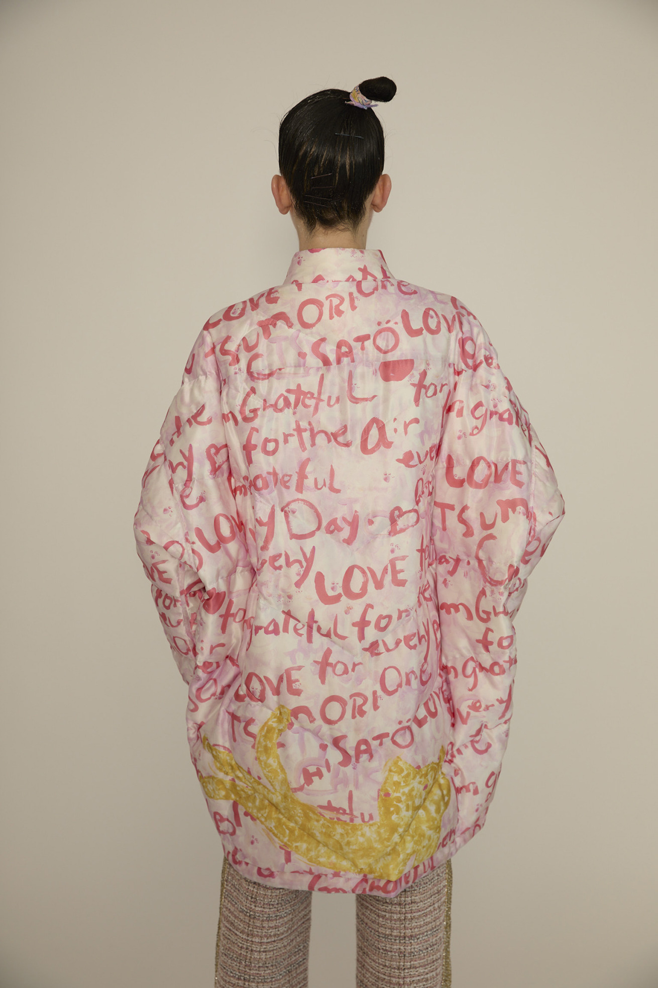 Messageprintの総柄ライトダウンコート。 ドルマンスリーブで立体感があり、他にはない特徴的な丸いシルエットに仕上げています。 シャーリングを寄せたスタンド襟、前立てもポイントです。 リバーシブルで着用でき、全体とポケットに入ったハートのステッチが、無地を表にしてもアクセントになり、どちらも違った楽しみ方のできるアイテムです。 【Messageprint】 I’mgratefulforeverything.I’mgratefulfor… 沢山の色を使って綴った、感謝のメッセージで埋めつくしたテキスタイル。 TSUMORICHISATOのアイコン、筆タッチの大きなキラネコもポイントです。 柔らかく光沢感のあるシルクサテンに中国でインクジェットプリントをしています。 ケア方法:ドライクリーニング ※着用モデル身長:173cm ※着用サイズ:2(M)