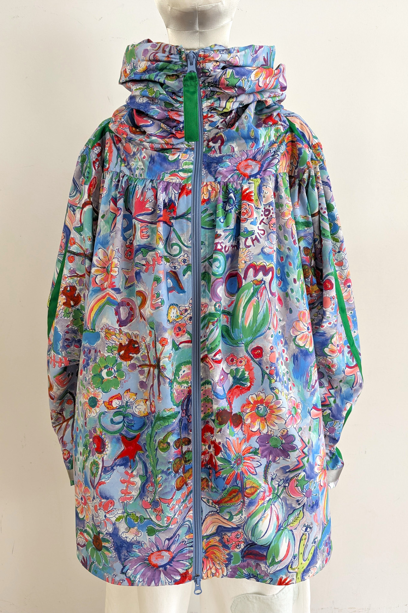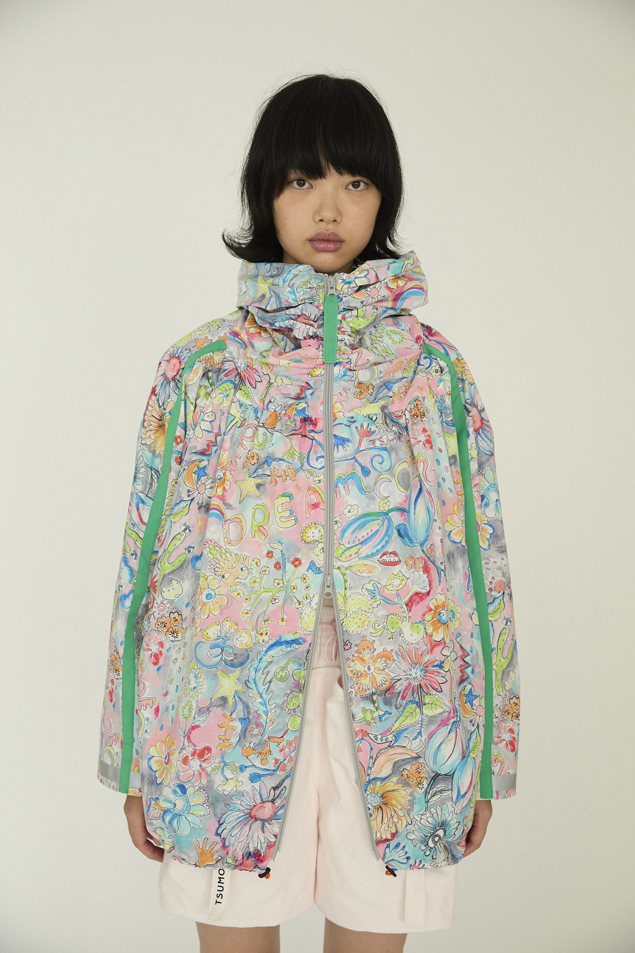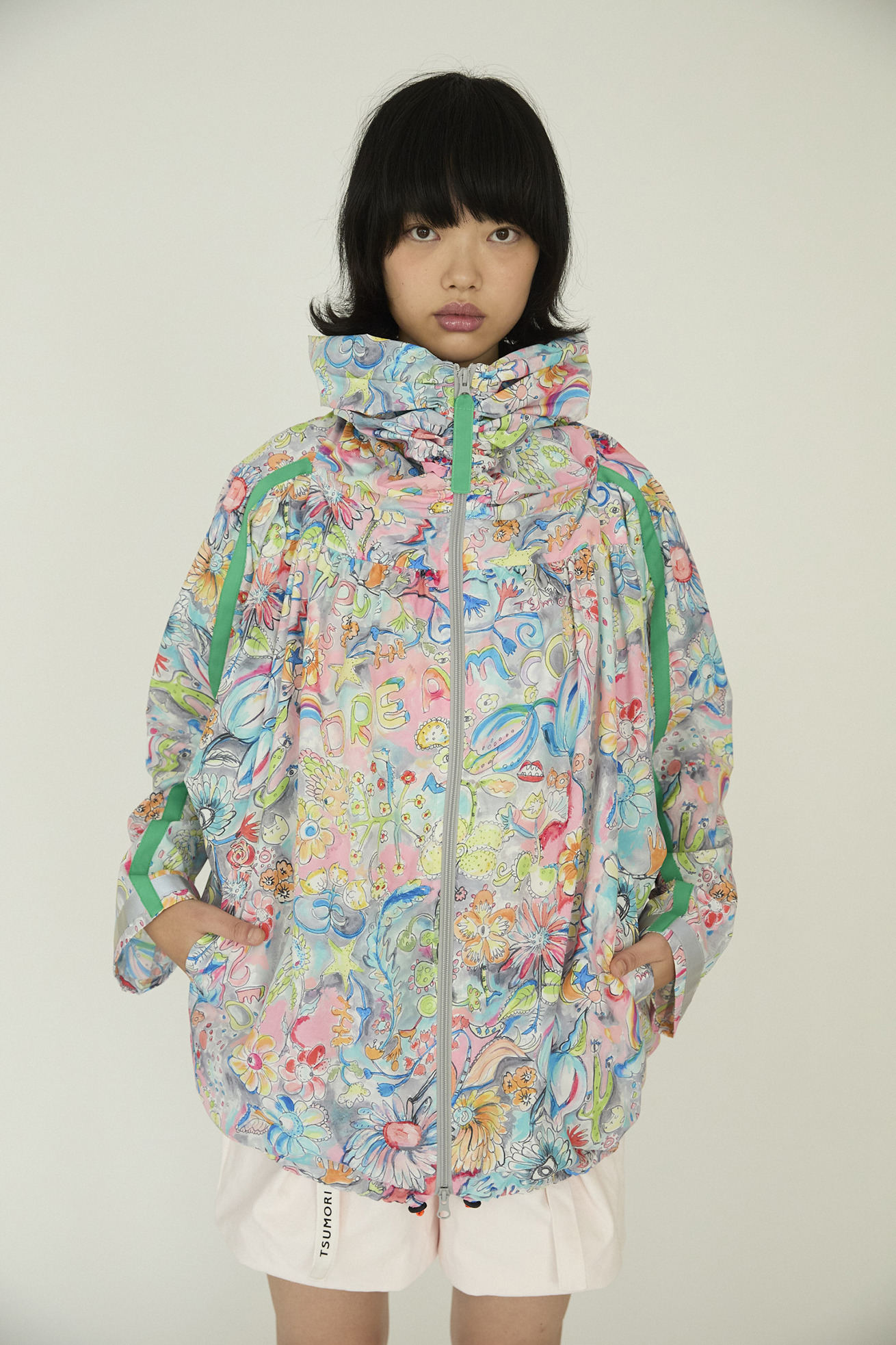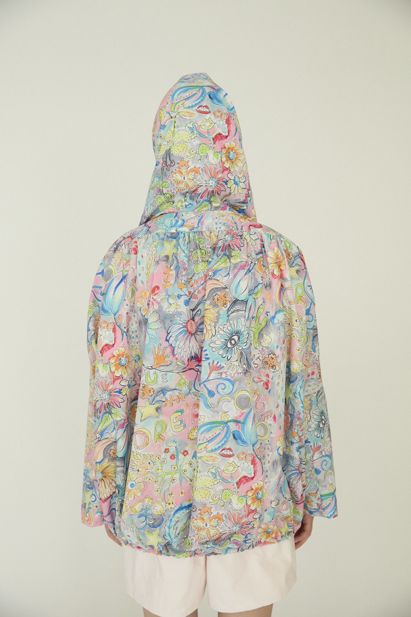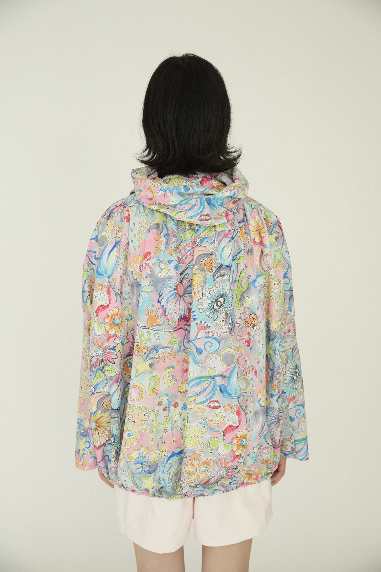 襟に細かくギャザーを入れ、くしゅくしゅとたまるデザインが特徴の定番ジャケットです。 ゆったりとお尻まで覆う着丈で男女兼用でご利用いただけます。 素材はポリエステル100%でありながら、天然繊維のようなサラッと柔らかい風合いが特徴の薄手タフタを使用。 弱撥水加工で水を弾き、薄手で軽く、裏地なしの仕立てにするこでコンパクトにたたんで持ち運びにも便利です。 ※長時間放置すると水が染み込みますのでご注意ください。 【Dreamy bloom taffeta】 踊るように咲くロマンティックでカラフルな花と立体的な「Dream comes true」の文字。 よく見ると、手を振っているような葉っぱや足が生えた花、目や唇のような花たち。 丁寧で繊細なタッチをそのままに京都で転写プリントしました。 それぞれのカラーバランスにこだわったカラーバリエーションもポイントです。 ケア方法:手洗い可能 ※着用モデル身長:174cm ※着用サイズ: 2(M)
