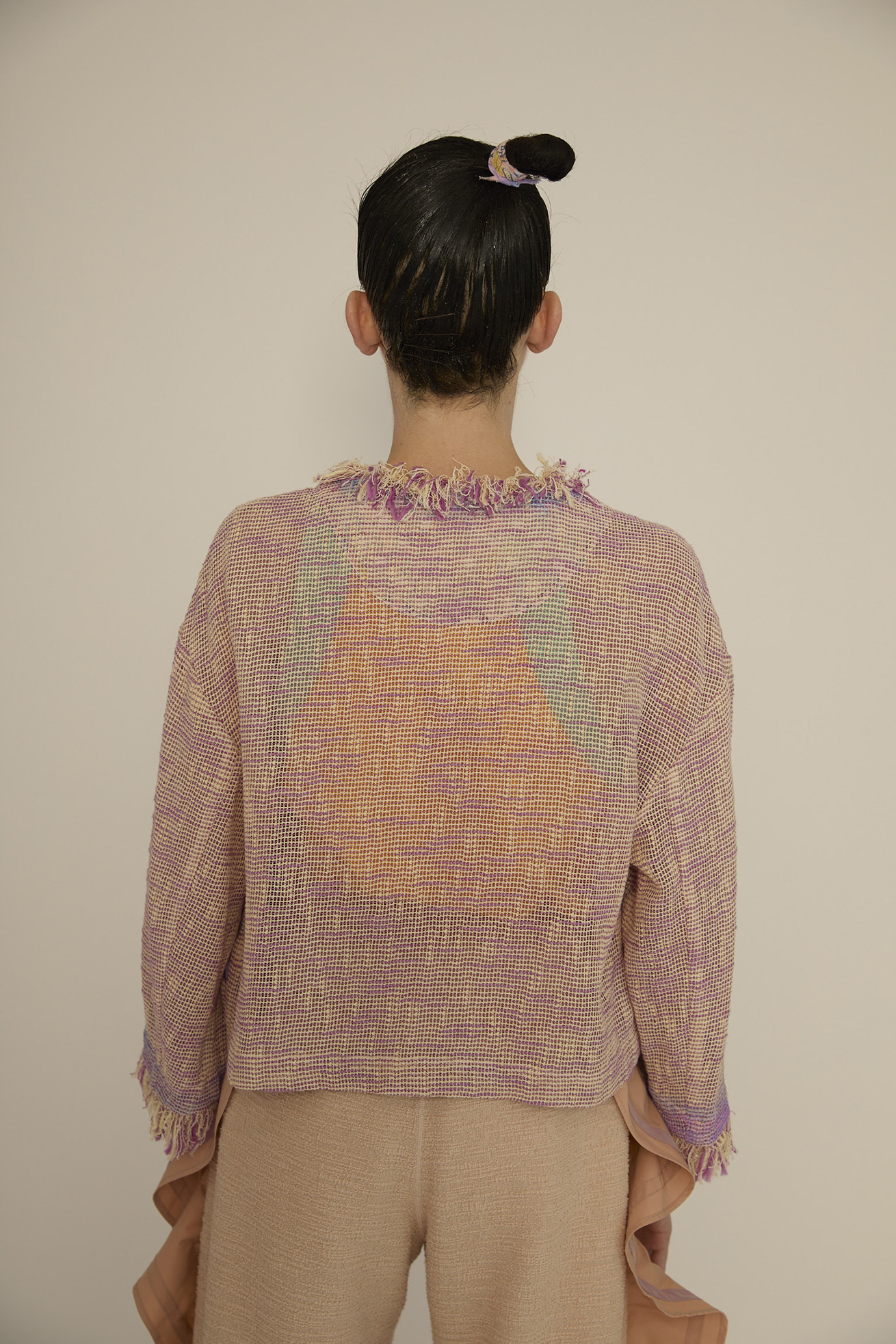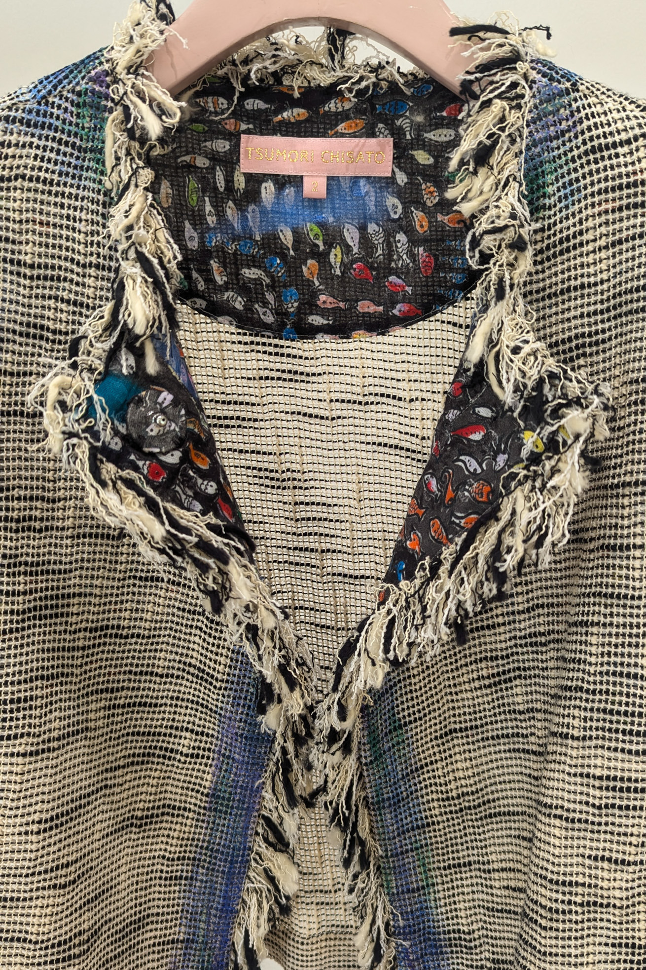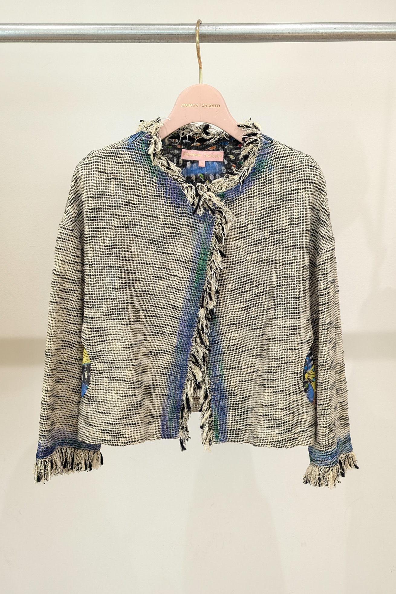 フリンジ使いが特徴的なノーカラージャケットです。 軽くて透け感が特徴的なベースの生地は経糸、緯糸にコットンスラブ糸を使用し、さらに緯糸に和紙の糸を並べることで清涼感溢れる生地です。 ジャケットのきちんと感がありながら、軽く夏でも着やすいジャケットです。 からみ織という技術で織り上げた、透け感が春夏らしい素材です。愛知県で作っています。 ポケット、襟、前立ての裏地にDancing fish paradeを使用しアクセントにしています。 【Dancing fish parade】 カラフルな魚たちが踊るように泳ぐ海の中。小さな魚たちが集まって作るLOVEやHAPPY、ネコ型やハート型が楽しいテキスタイルです。 1匹1匹丁寧なタッチで描かれ、よく見るといろんな表情の魚たちを見つけられる一枚です。カラーコンビネーションにもこだわりました。 少し透け感がある、肌触りの良いコットンの水玉カットジャカード生地に京都でインクジェットプリントをしています。 ケア方法:ドライクリーニング ※着用モデル身長:173cm ※着用サイズ: 2(M)