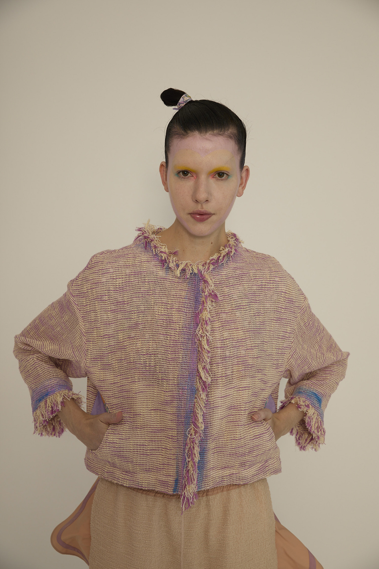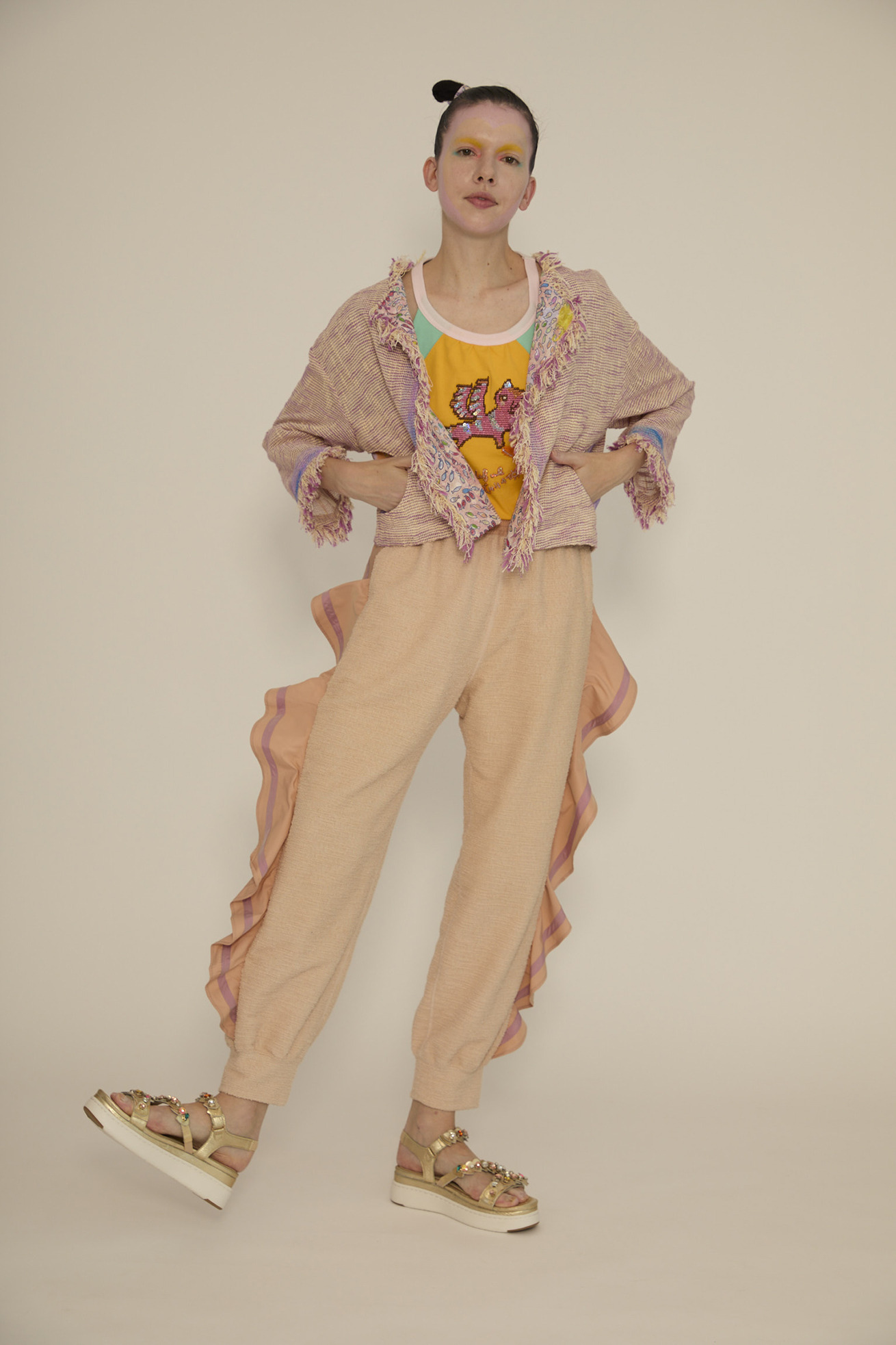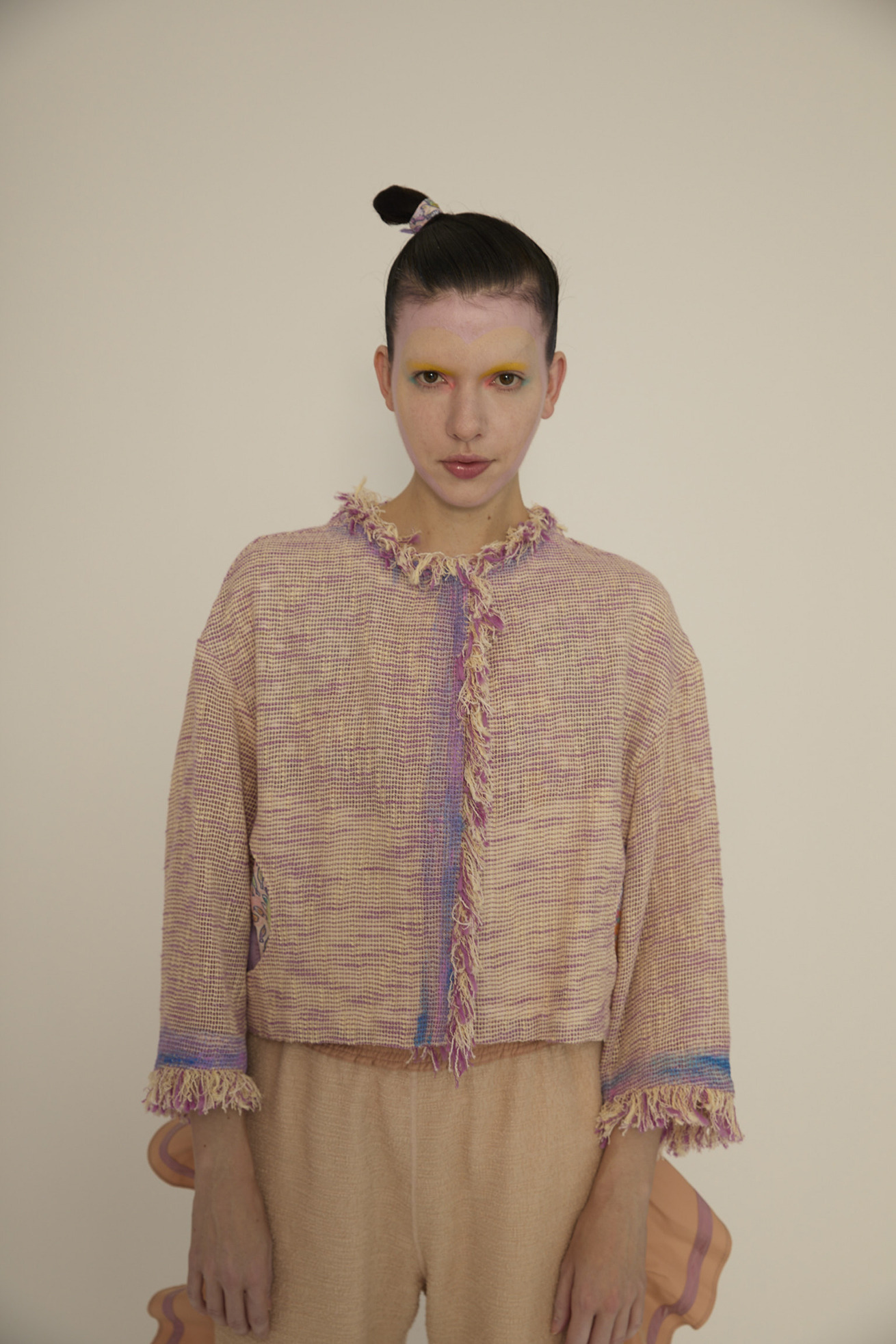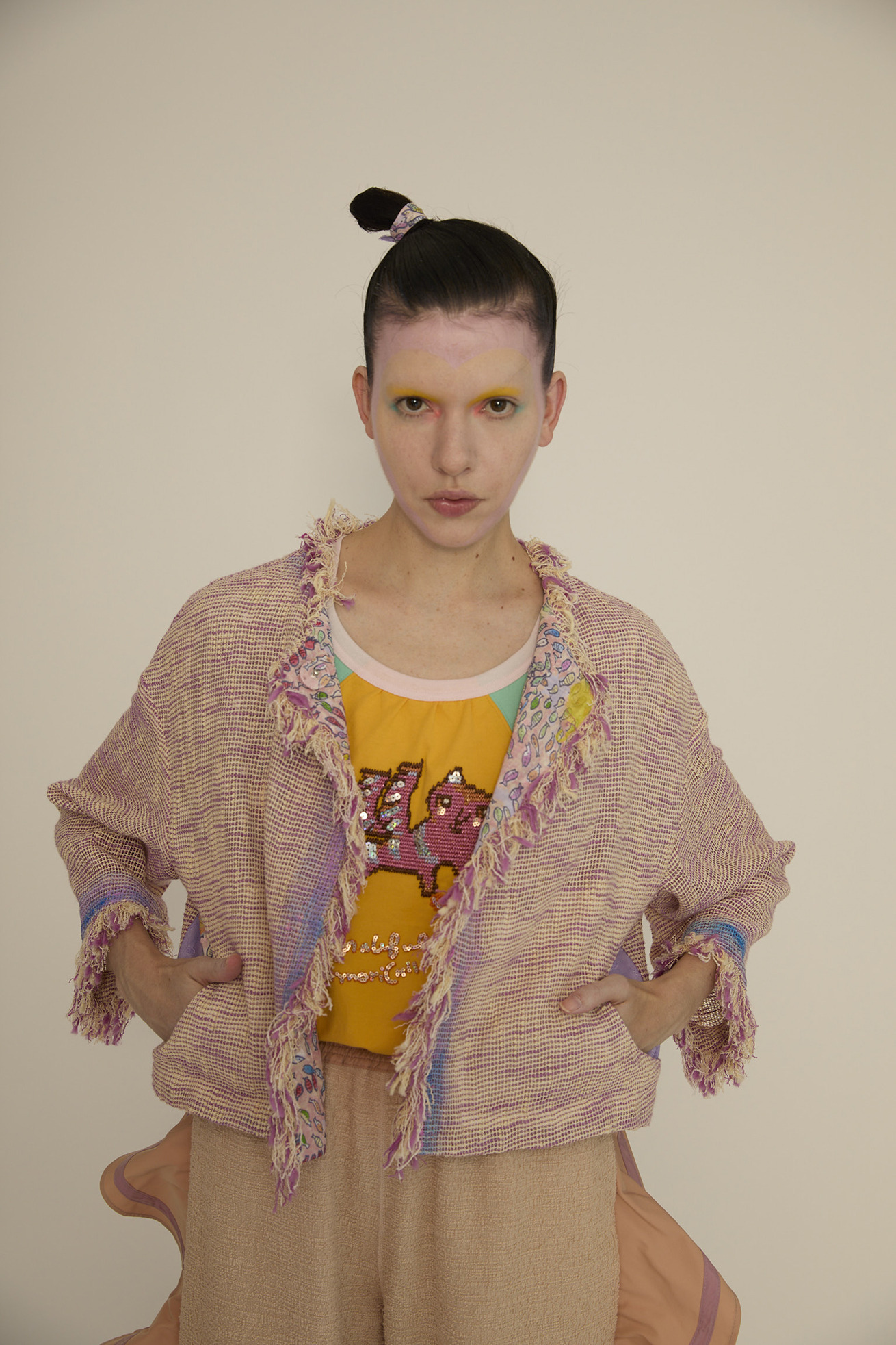 フリンジ使いが特徴的なノーカラージャケットです。 軽くて透け感が特徴的なベースの生地は経糸、緯糸にコットンスラブ糸を使用し、さらに緯糸に和紙の糸を並べることで清涼感溢れる生地です。 ジャケットのきちんと感がありながら、軽く夏でも着やすいジャケットです。 からみ織という技術で織り上げた、透け感が春夏らしい素材です。愛知県で作っています。 ポケット、襟、前立ての裏地にDancing fish paradeを使用しアクセントにしています。 【Dancing fish parade】 カラフルな魚たちが踊るように泳ぐ海の中。小さな魚たちが集まって作るLOVEやHAPPY、ネコ型やハート型が楽しいテキスタイルです。 1匹1匹丁寧なタッチで描かれ、よく見るといろんな表情の魚たちを見つけられる一枚です。カラーコンビネーションにもこだわりました。 少し透け感がある、肌触りの良いコットンの水玉カットジャカード生地に京都でインクジェットプリントをしています。 ケア方法:ドライクリーニング ※着用モデル身長:173cm ※着用サイズ: 2(M)