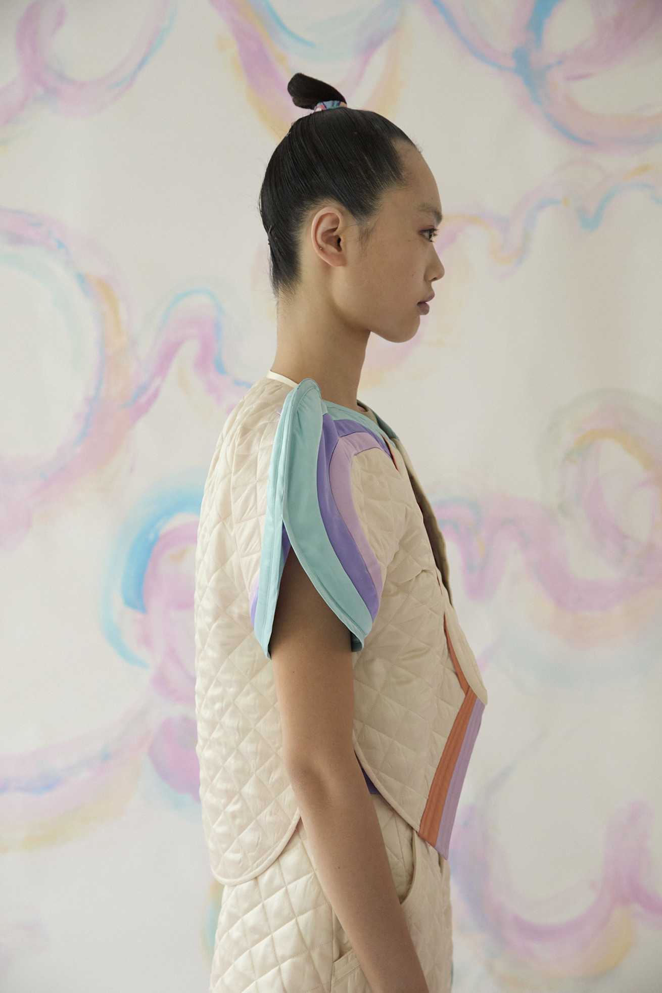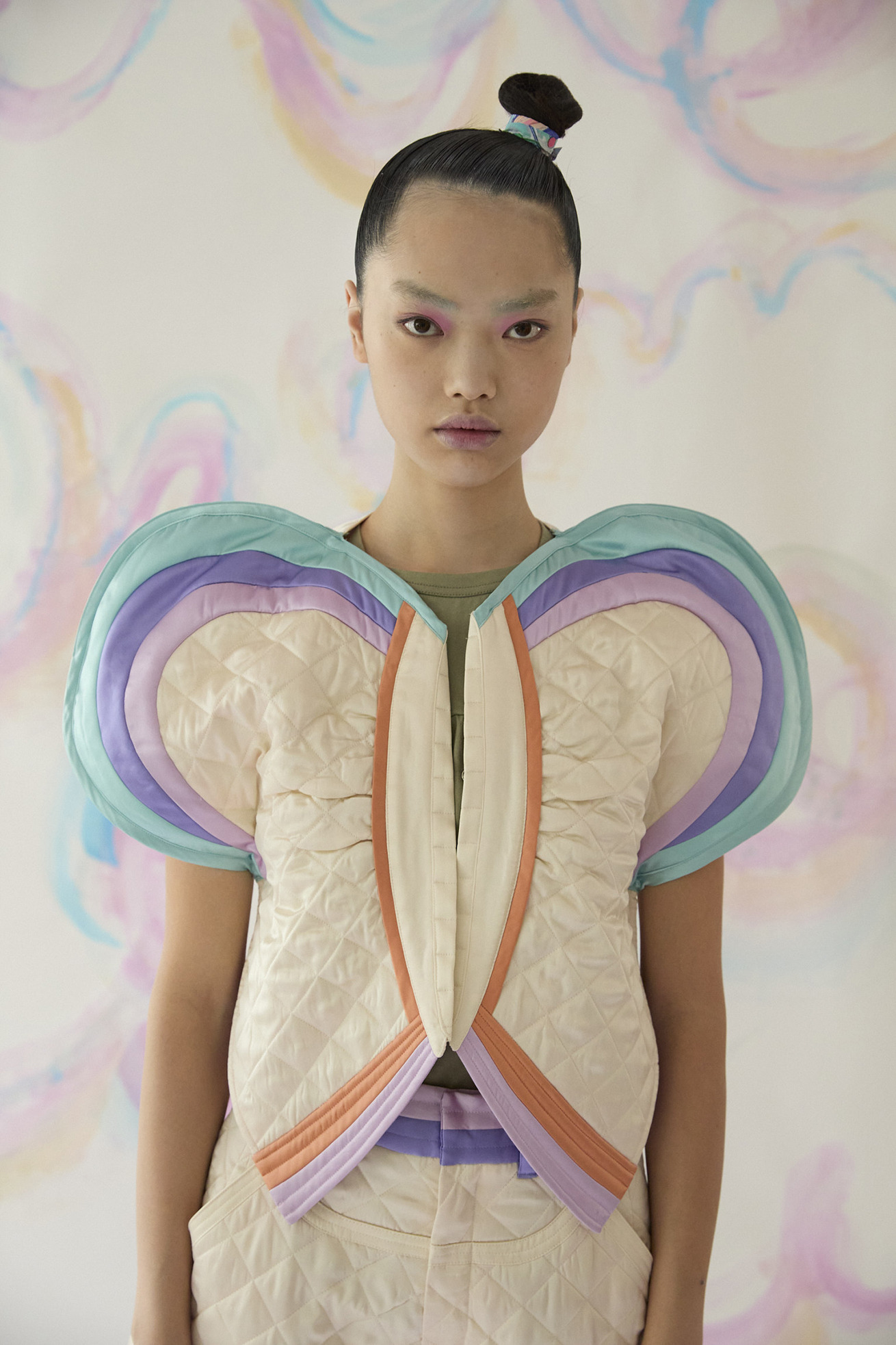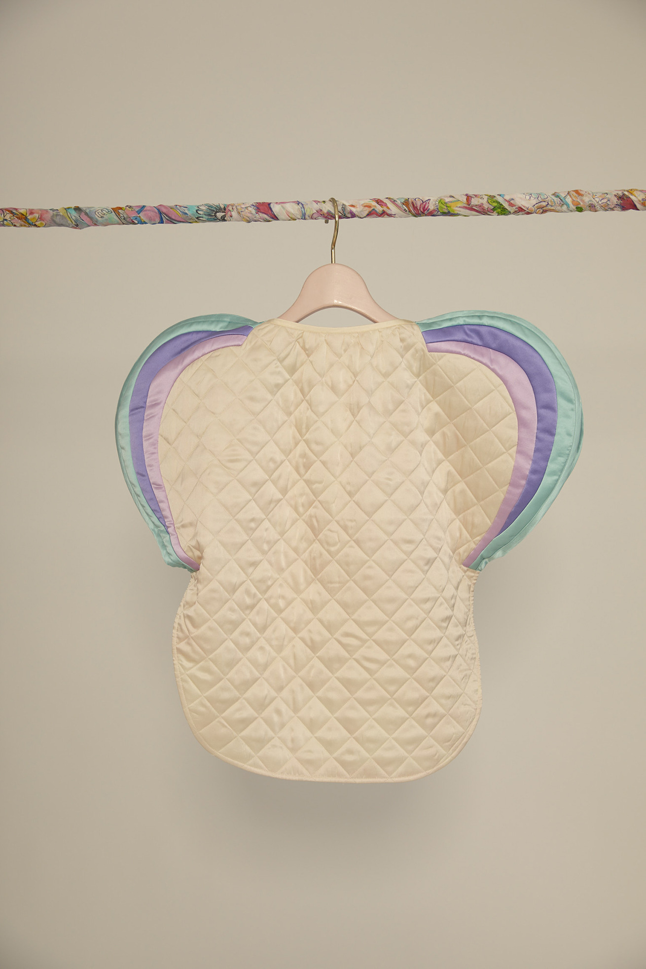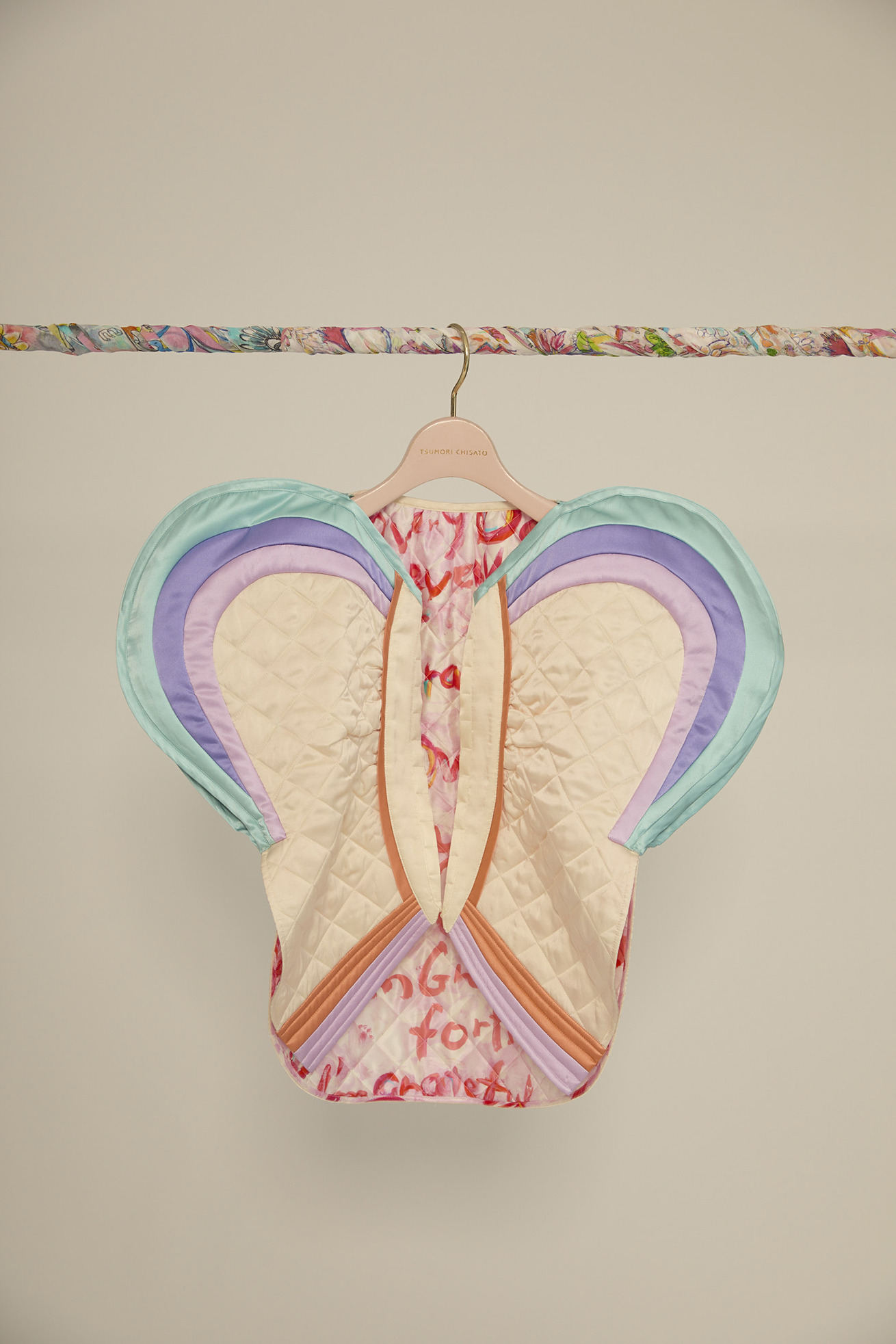 丸く立体的な袖のデザインが特徴的な中綿キルティングジャケットです。 裏地にはMessage printを合わせています。 袖の配色で虹をイメージし、やさしいカラーリングがポイントです。 【Message print】 I’m grateful for everything. I’m grateful for… 沢山の色を使って綴った、感謝のメッセージで埋めつくしたテキスタイル。 TSUMORI CHISATOのアイコン、筆タッチの大きなキラネコもポイントです。 柔らかく光沢感のあるシルクサテンに中国でインクジェットプリントをしています。 ケア方法:ドライクリーニング ※着用モデル身長:174cm ※着用サイズ: 2(M)