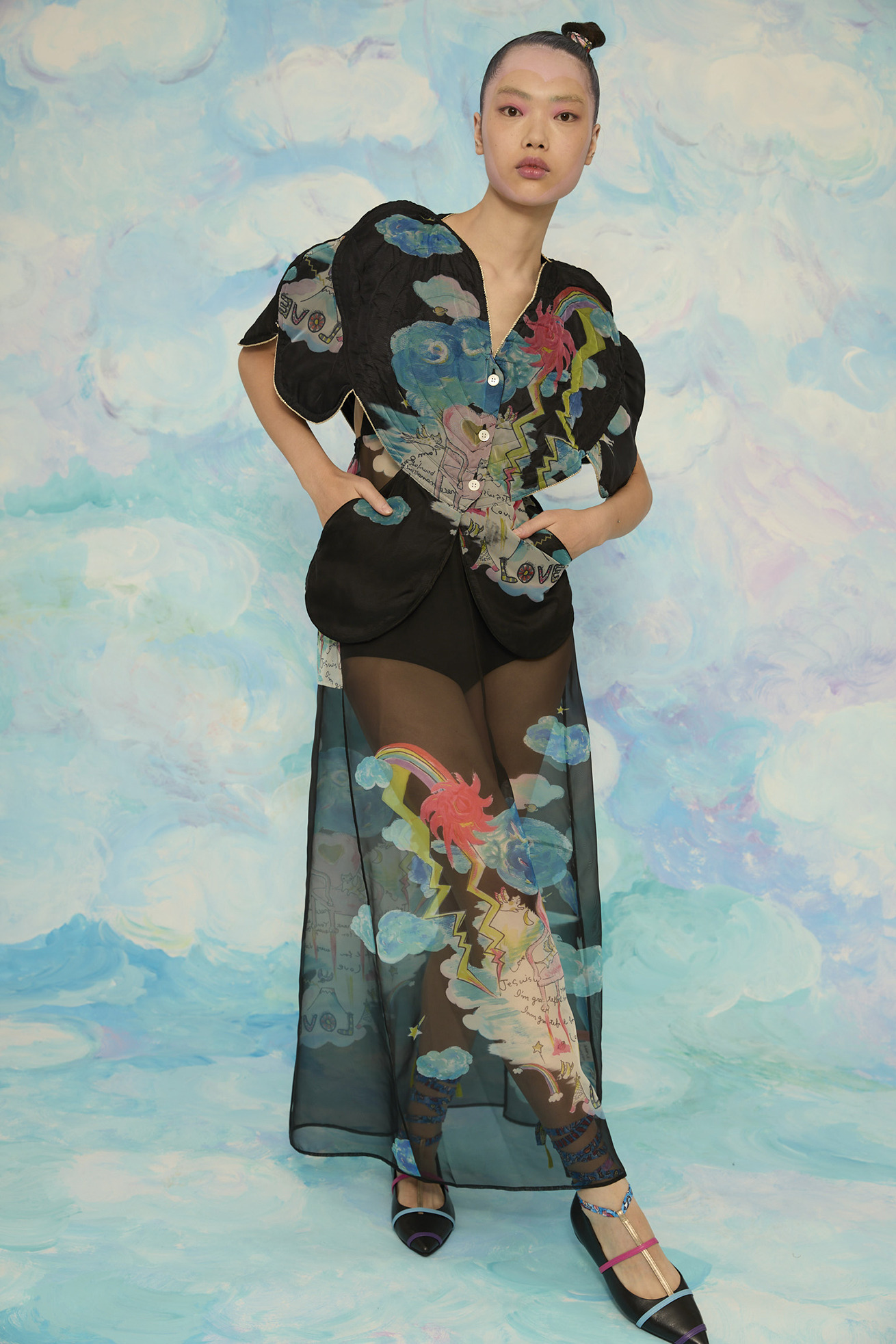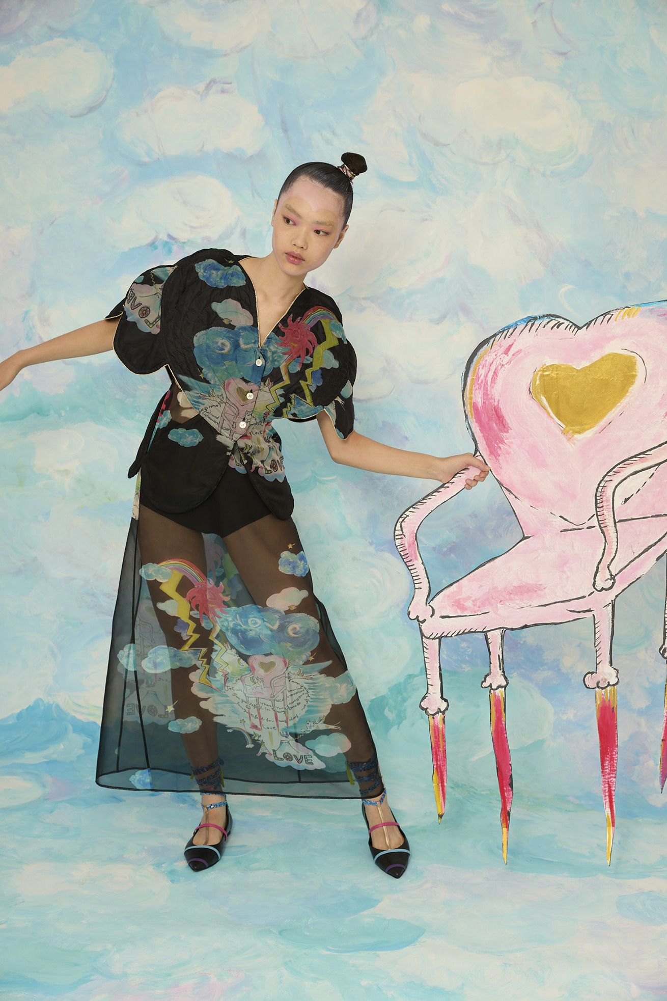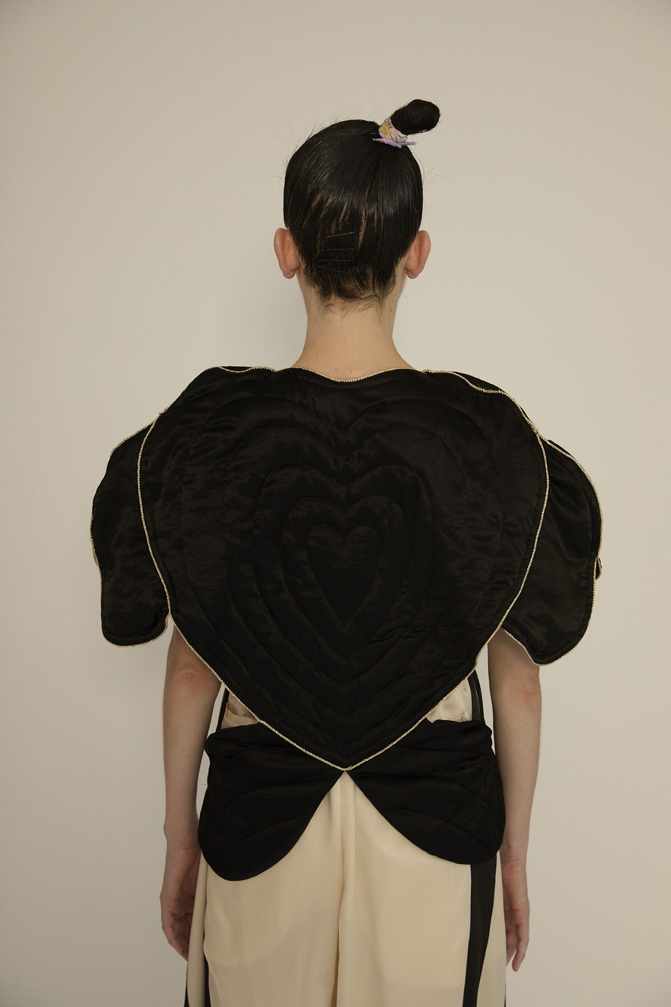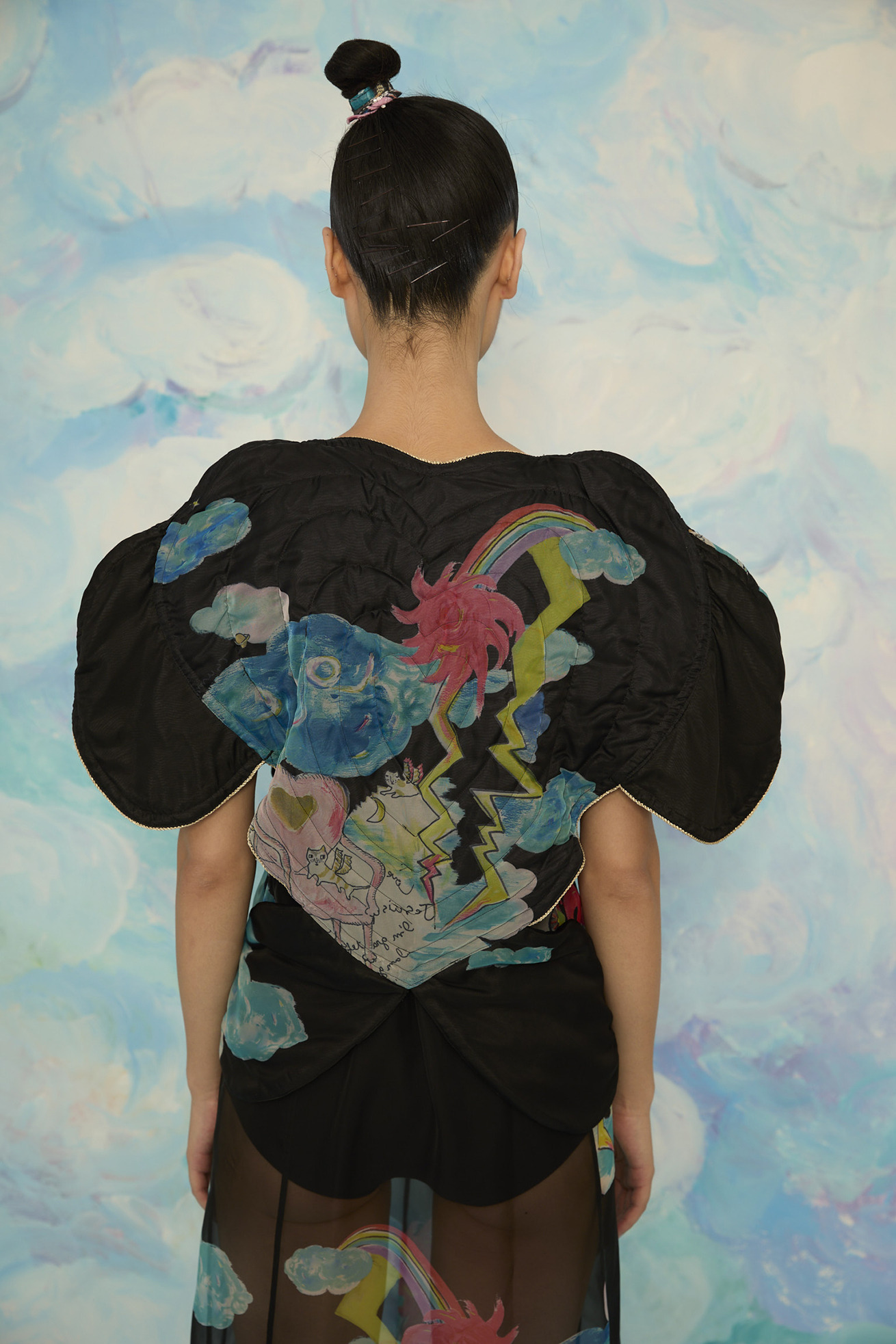 大きなハートの切り替えがキュートなキルティングのジレです。 立体感のあるシルエットがほかにはない特別なアイテムです。 リバーシブル仕様でCat's chair organdyと光沢のあるブラックの単色、どちらも違った雰囲気でお楽しみいただけます。 ハートの形に合わせてウエストはタイトに、メリハリのあるラインがコーディネートをカッコよくする1枚です。ゴールドのラメ糸のパイピングもアクセントになっています。 【Cat's chair organdy】 富士山や東京タワーのさらに高い空の上。たくさんの雲とお日様、虹から光るイナヅマ。 空飛ぶAngel catたちはハート型の椅子に駆け寄ったり座ったり。手書きで綴った感謝のメッセージもポイントです。 リサイクル素材のポリエステルオーガンジーに、筆のタッチをそのまま京都で転写プリントしています。 ケア方法:手洗い可能 ※着用モデル身長:174cm ※着用サイズ: 2(M)
