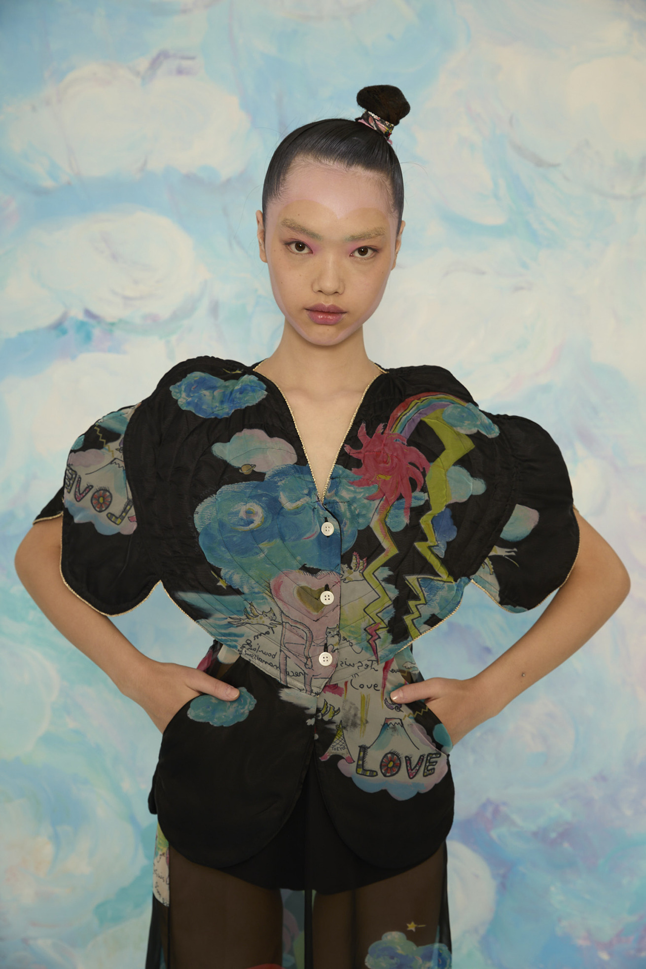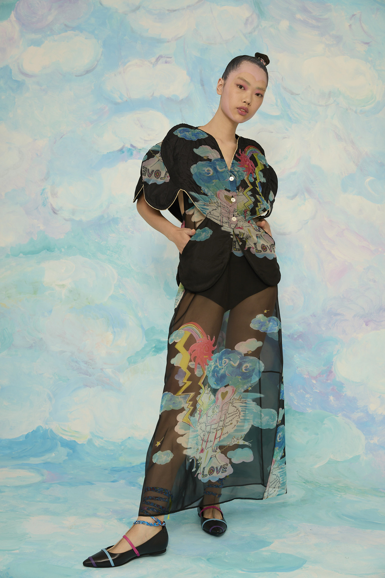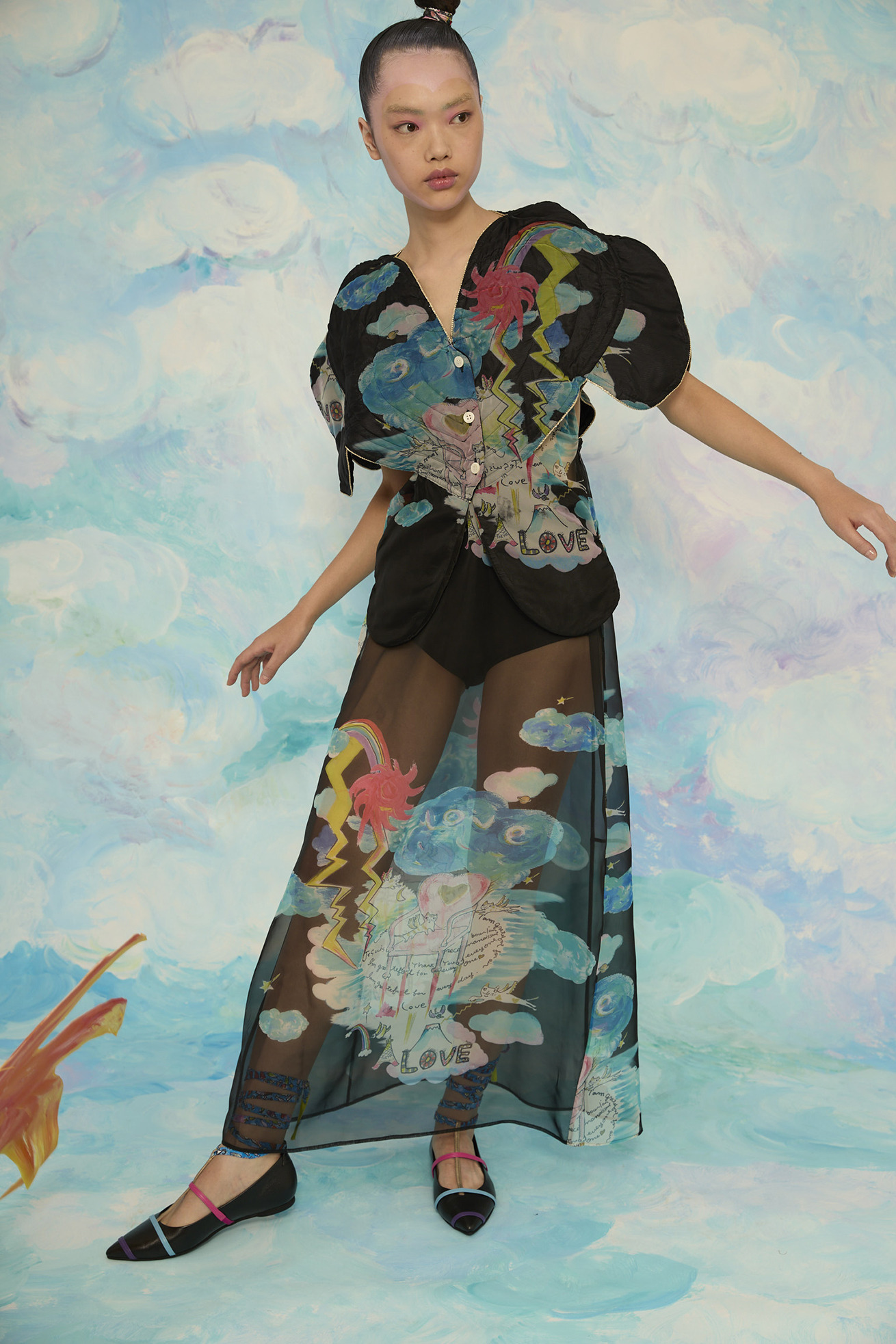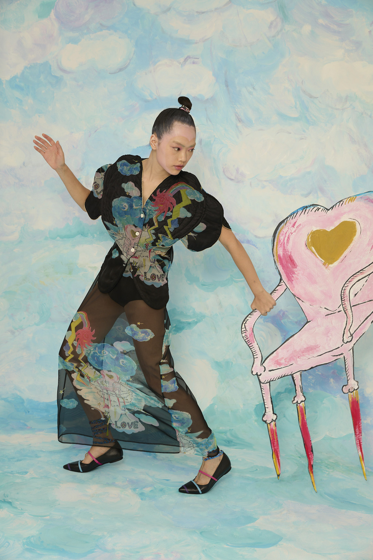 大きなハートの切り替えがキュートなキルティングのジレです。 立体感のあるシルエットがほかにはない特別なアイテムです。 リバーシブル仕様でCat's chair organdyと光沢のあるブラックの単色、どちらも違った雰囲気でお楽しみいただけます。 ハートの形に合わせてウエストはタイトに、メリハリのあるラインがコーディネートをカッコよくする1枚です。ゴールドのラメ糸のパイピングもアクセントになっています。 【Cat's chair organdy】 富士山や東京タワーのさらに高い空の上。たくさんの雲とお日様、虹から光るイナヅマ。 空飛ぶAngel catたちはハート型の椅子に駆け寄ったり座ったり。手書きで綴った感謝のメッセージもポイントです。 リサイクル素材のポリエステルオーガンジーに、筆のタッチをそのまま京都で転写プリントしています。 ケア方法:手洗い可能 ※着用モデル身長:174cm ※着用サイズ: 2(M)