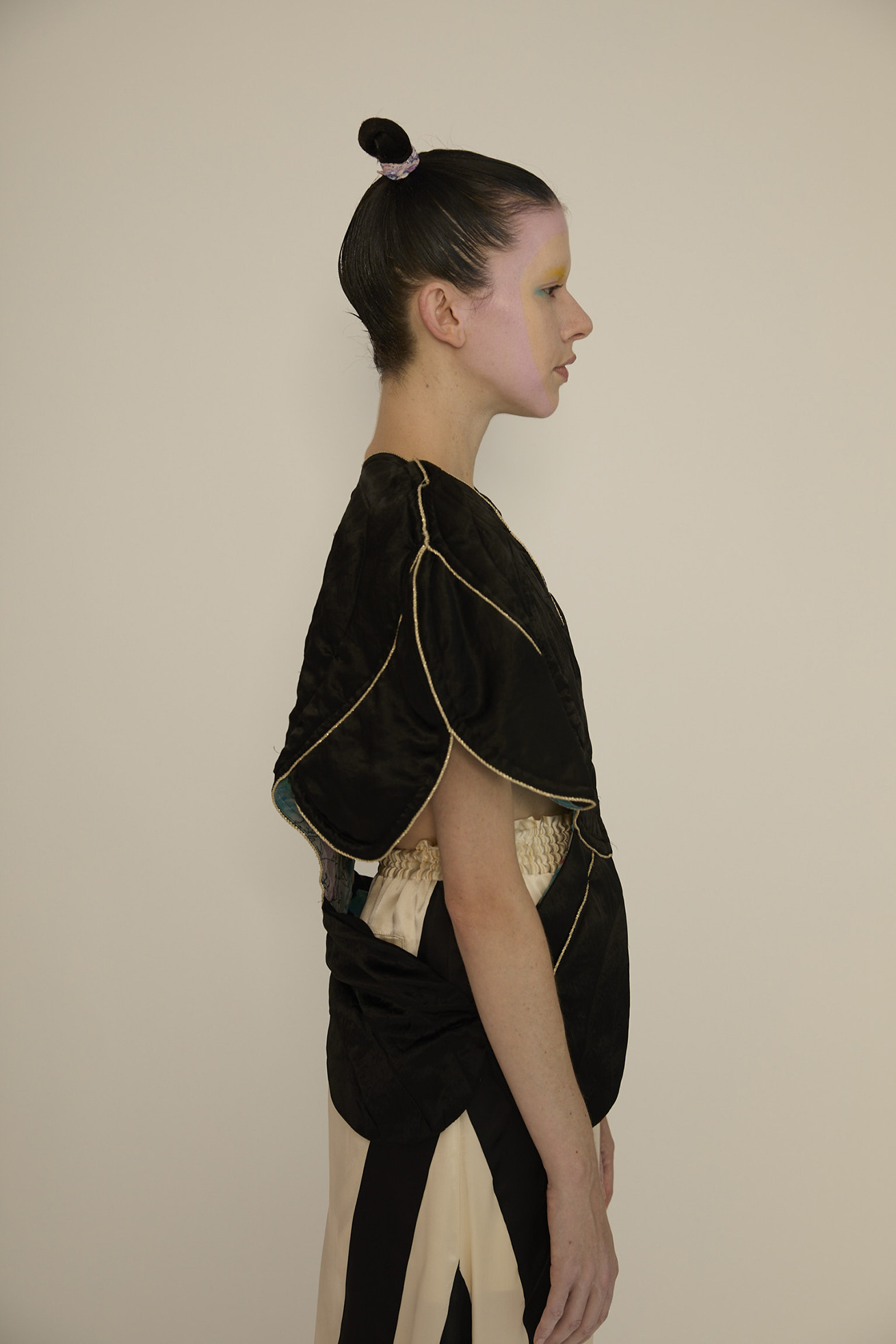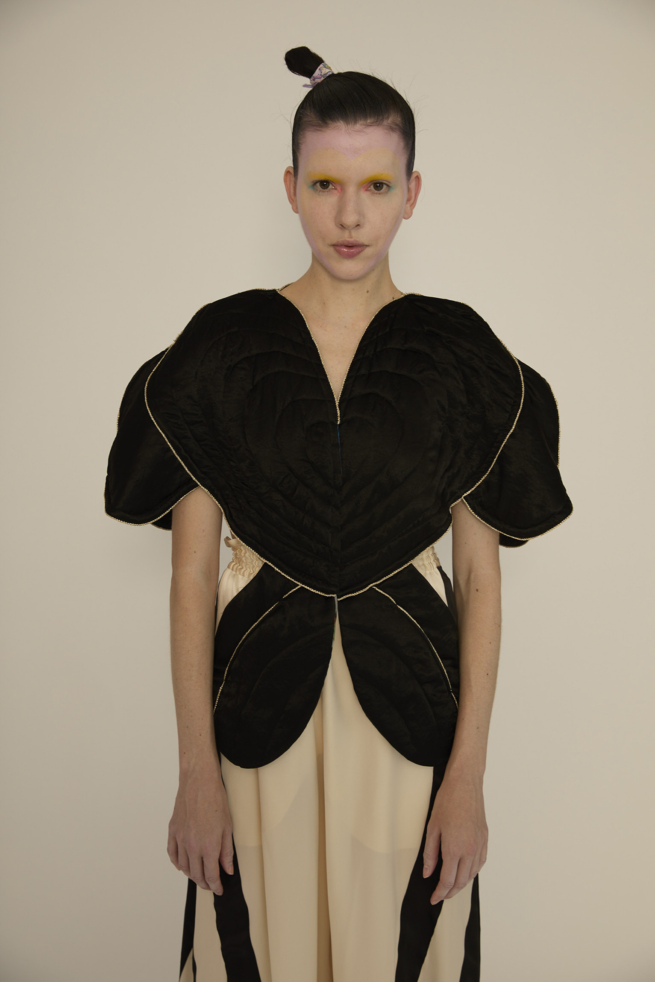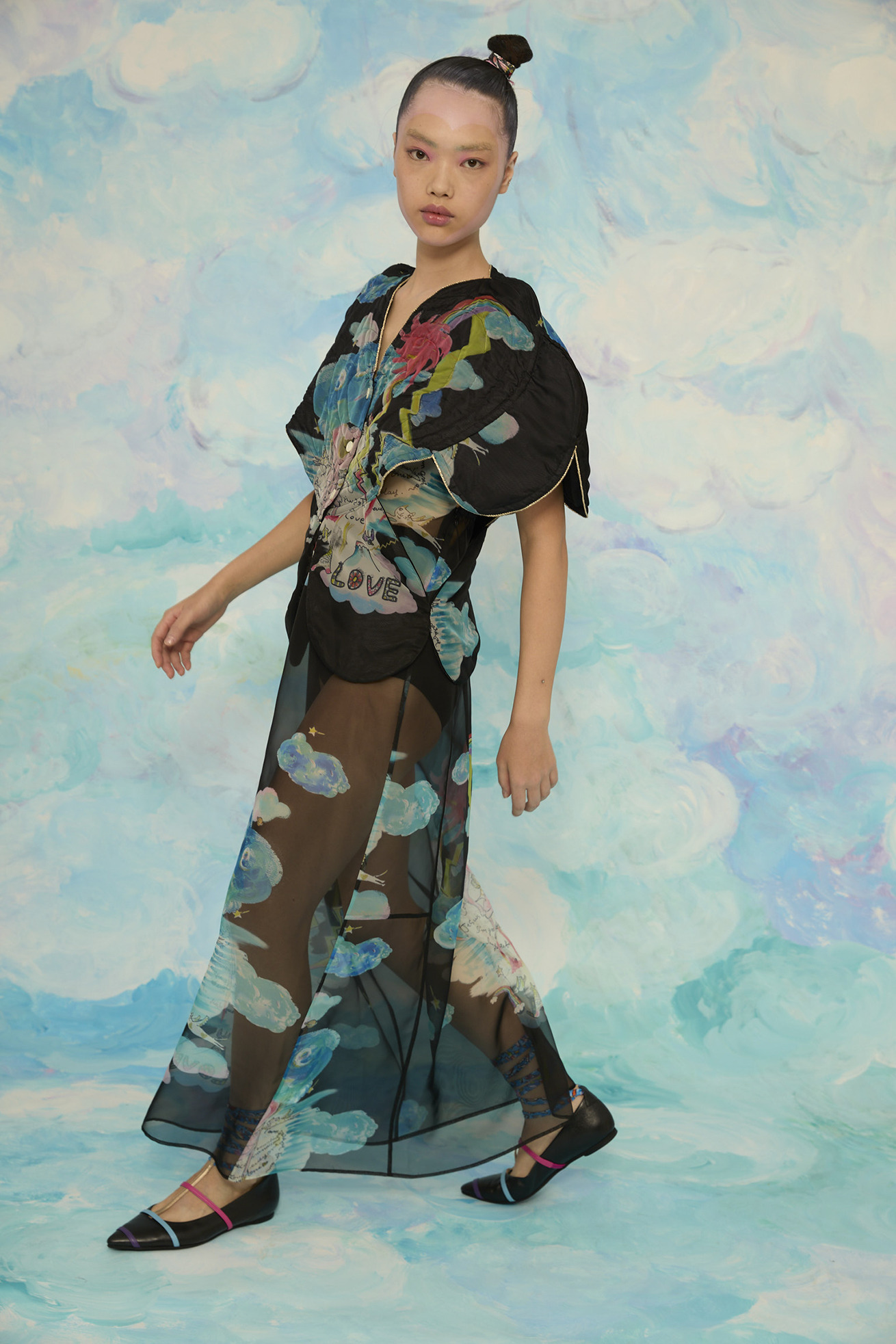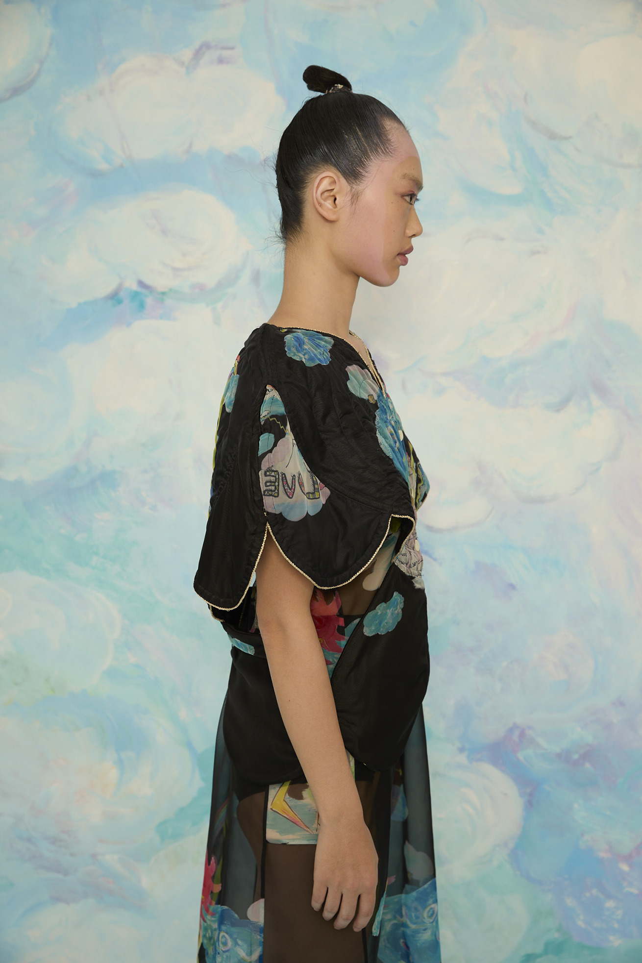 大きなハートの切り替えがキュートなキルティングのジレです。 立体感のあるシルエットがほかにはない特別なアイテムです。 リバーシブル仕様でCat's chair organdyと光沢のあるブラックの単色、どちらも違った雰囲気でお楽しみいただけます。 ハートの形に合わせてウエストはタイトに、メリハリのあるラインがコーディネートをカッコよくする1枚です。ゴールドのラメ糸のパイピングもアクセントになっています。 【Cat's chair organdy】 富士山や東京タワーのさらに高い空の上。たくさんの雲とお日様、虹から光るイナヅマ。 空飛ぶAngel catたちはハート型の椅子に駆け寄ったり座ったり。手書きで綴った感謝のメッセージもポイントです。 リサイクル素材のポリエステルオーガンジーに、筆のタッチをそのまま京都で転写プリントしています。 ケア方法:手洗い可能 ※着用モデル身長:174cm ※着用サイズ: 2(M)