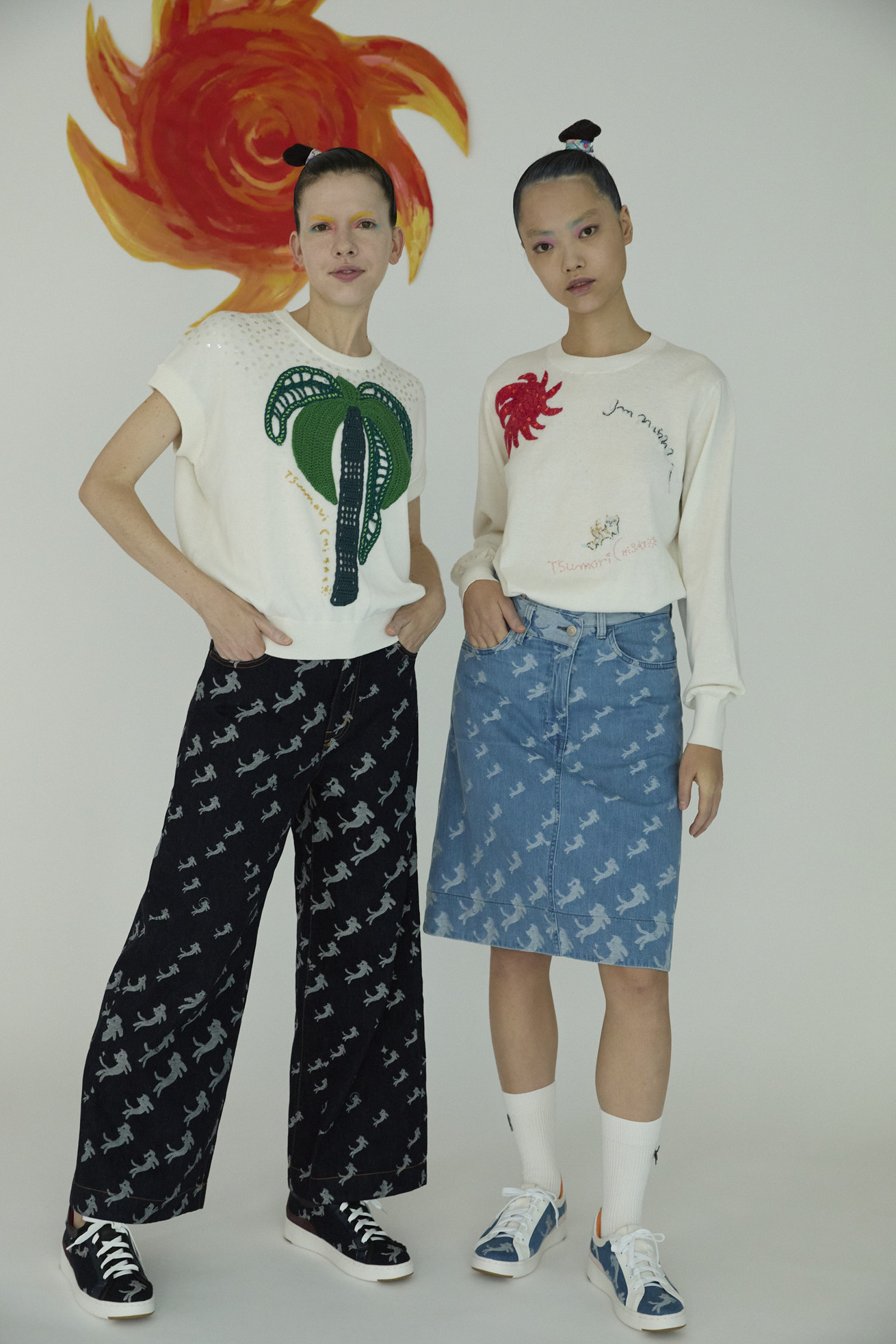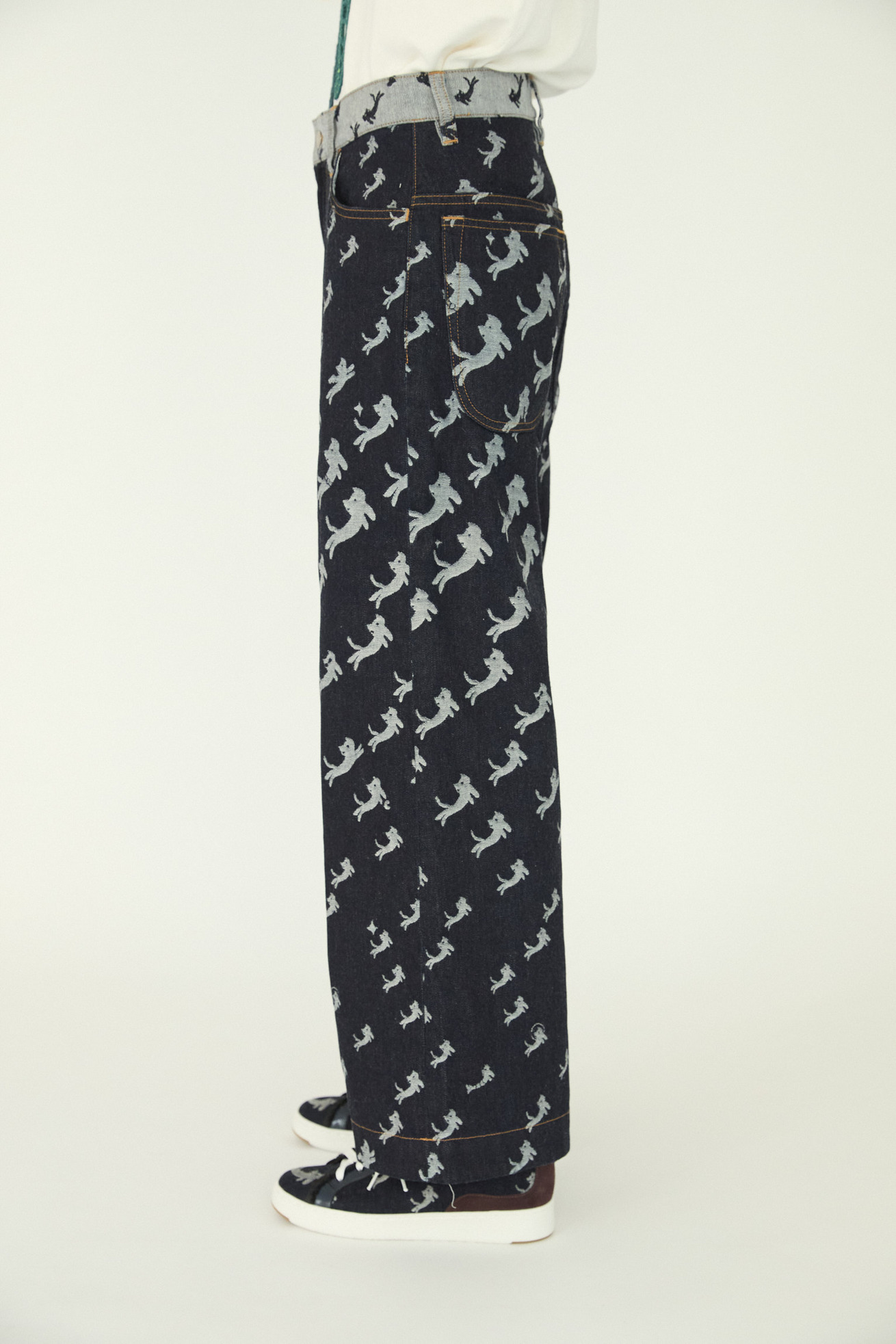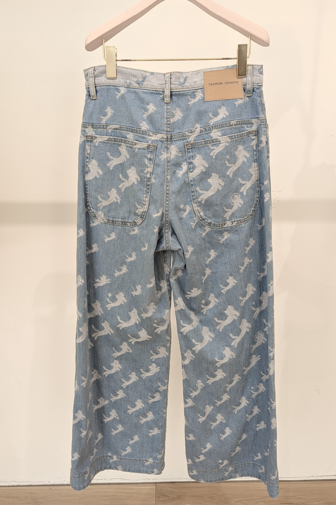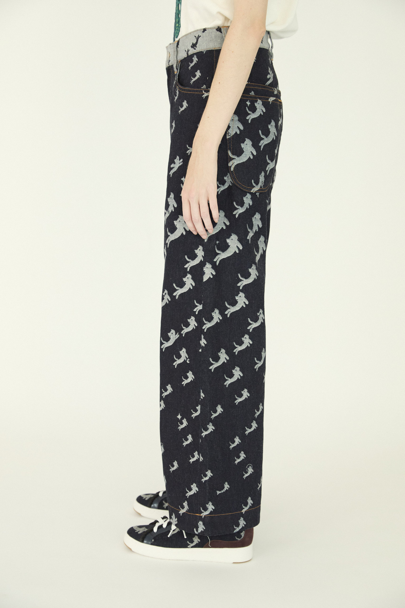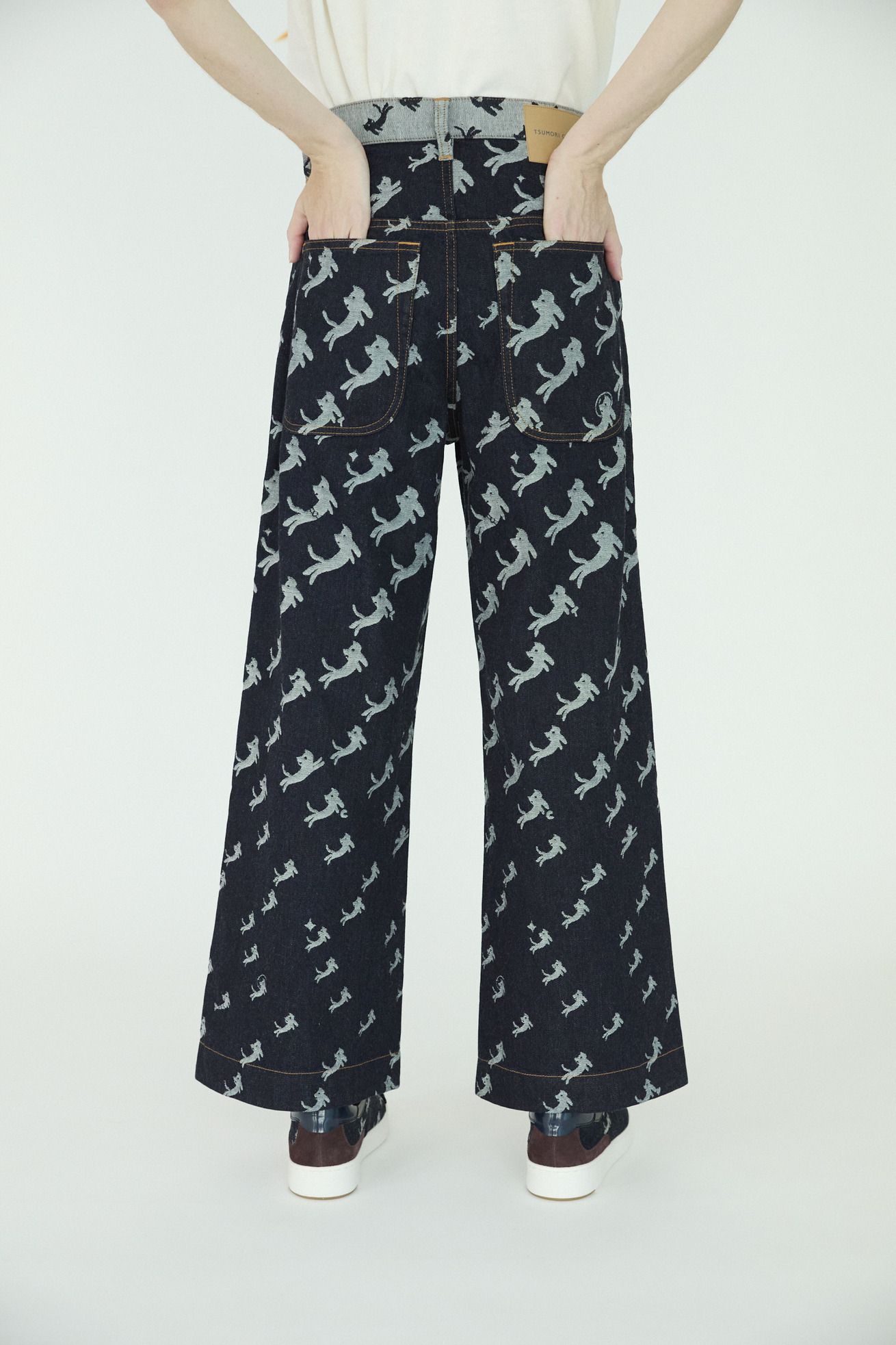 オリジナルの生地で定番の5ポケット、セミワイドパンツに仕上げました。 股上が深めの履きやすいデザインで、ベーシックにコーディネートがしやすい1枚です。 ウエスト部分は生地の裏表を変えて配色のようにみせています。 【kiraneko JQ denim】 TSUMORI CHISATOのアイコン的存在のキラネコ。グラデーションのようにサイズを変えて並べ、8オンスのジャカード織のデニムにしました。 たくさんのキラネコの中に、エンジェルねこ、ベルトをつけたねこ、サングラスねこ、宇宙飛行士ねこなど、隠れキャラを潜ませて遊び心のあるデザインに仕上げました。 経糸緯糸ともにアメリカ綿を主にした糸を使用し、バルキーさもありながら綺麗さのある表面感に仕上げました。生地は岡山県井原市で織っています。 C#12 blueはブリーチ加工、ストーンバイオ加工をしています。 C#13 navyはワンウォッシュしています。 ※インディゴ染めのため洗濯時に色が出ます。濃色は淡い色の洋服と合わせると色移りが発生しますのでご注意ください。 ケア方法:手洗い可能 ※着用モデル身長:173cm ※着用サイズ: 2(M)