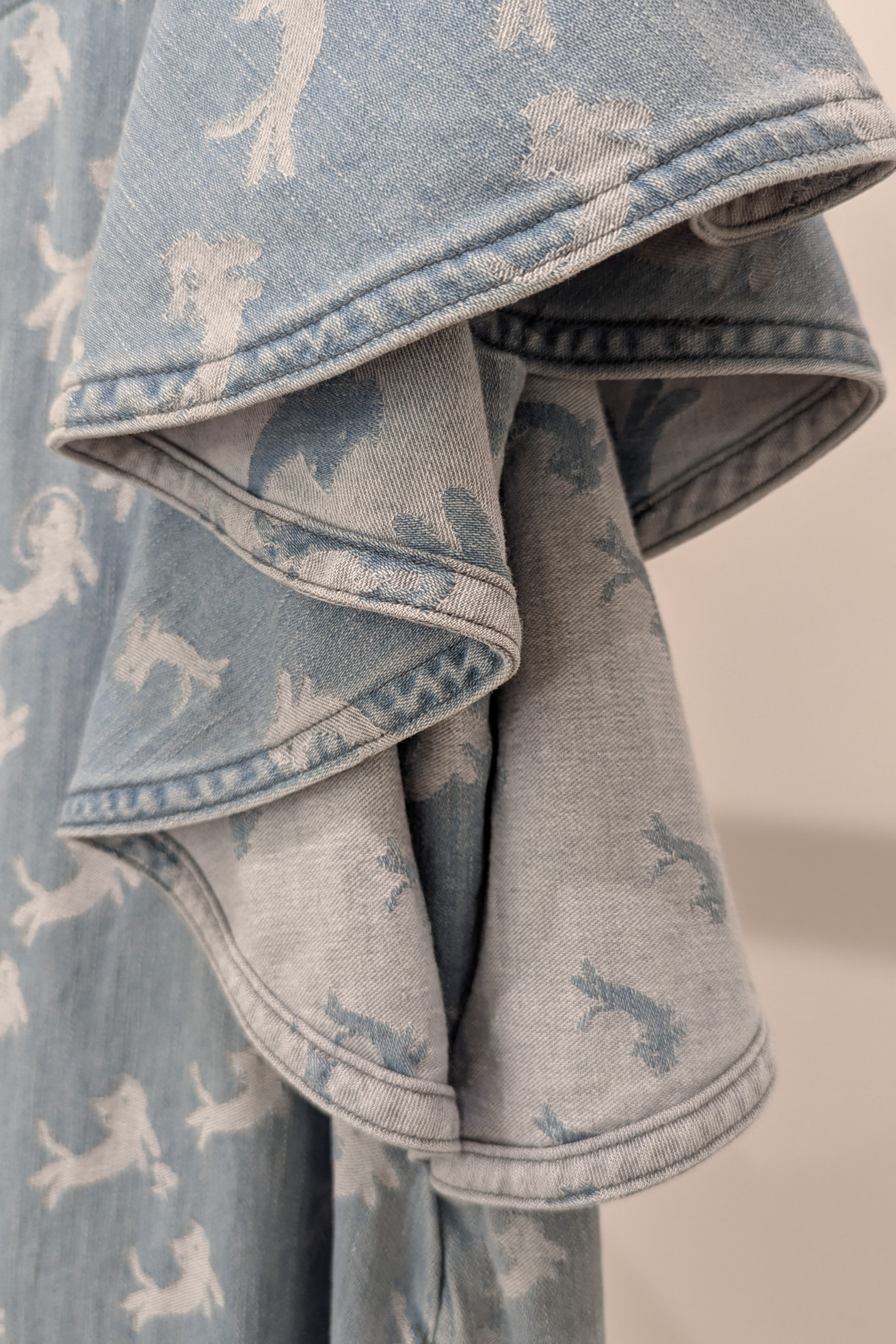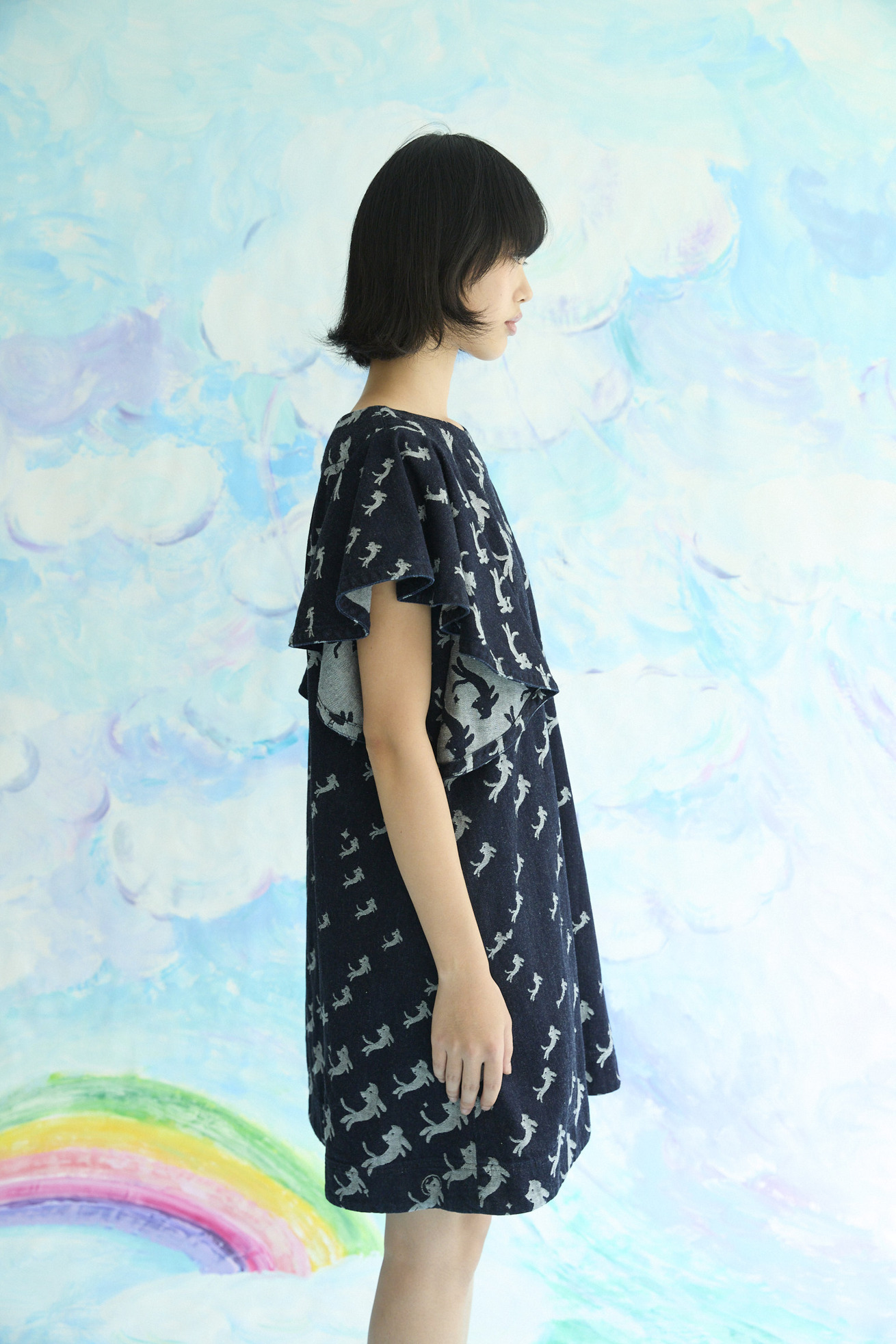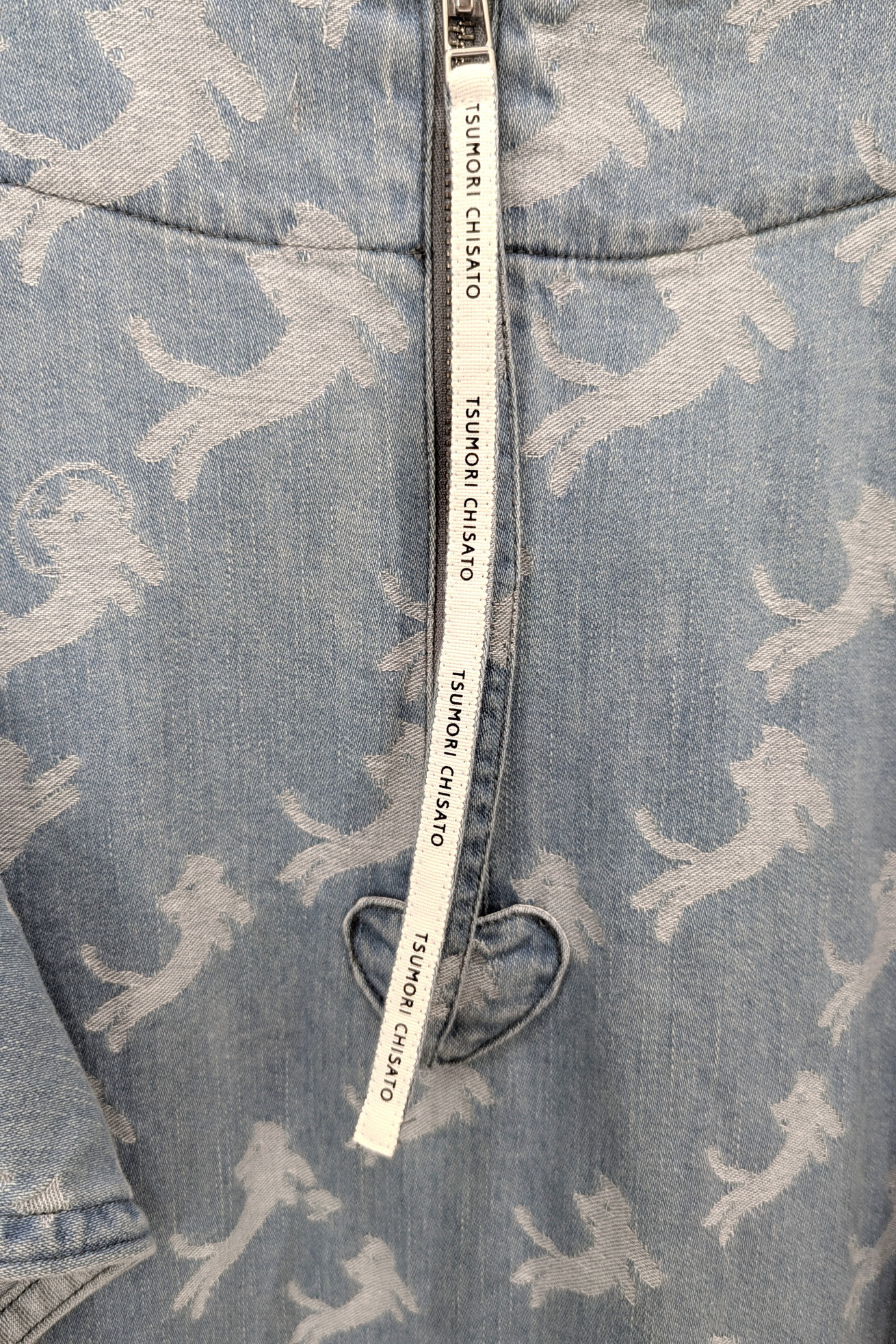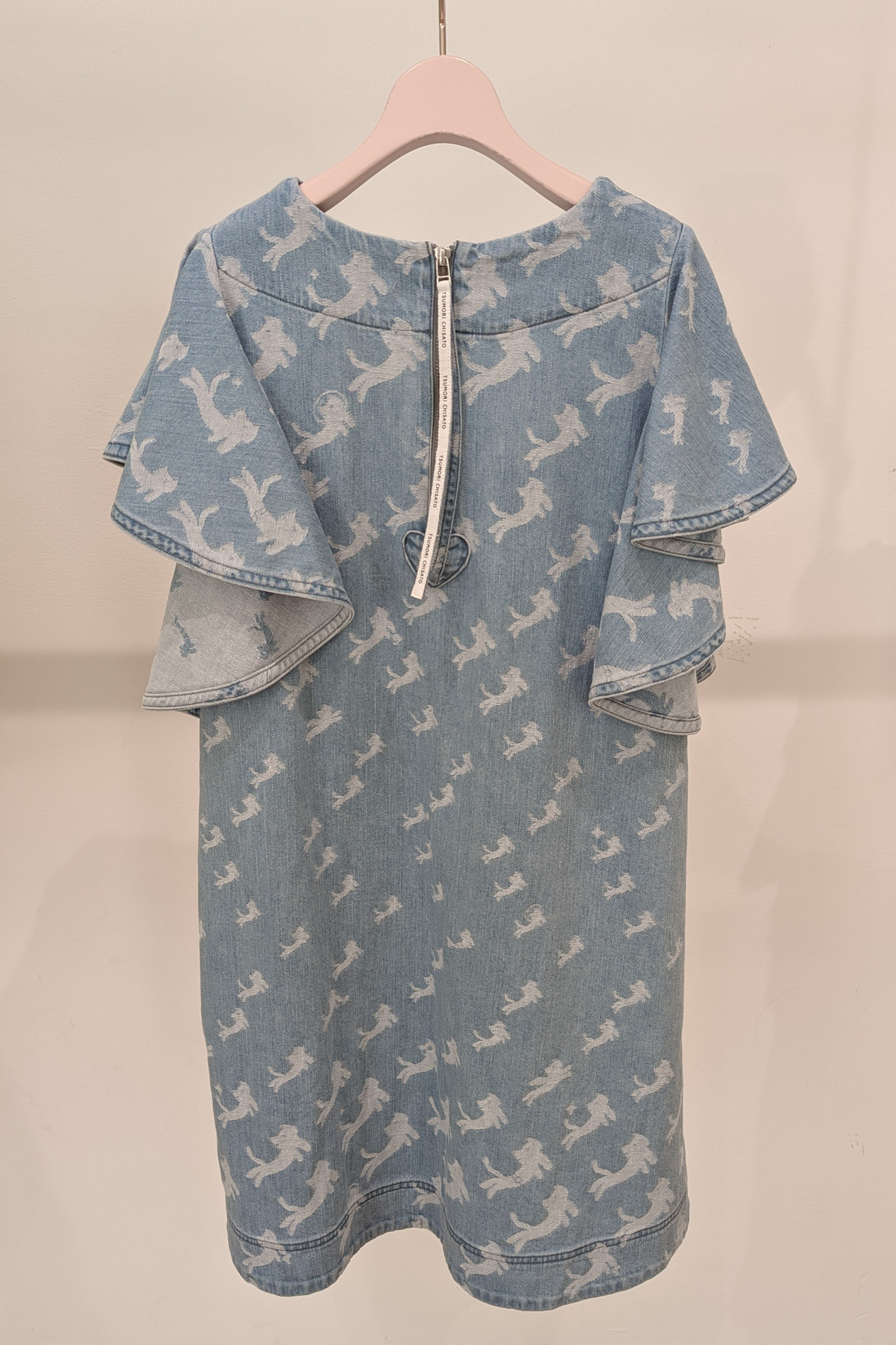 フリルスリーブが特徴的なAラインミニワンピースです。 定番の形をオリジナルのkiraneko JQ denimで作りました。 大きな袖は生地の裏面が見えても可愛く、脇に共地を合わせ開き過ぎない仕様にすることで1枚で着やすくしています。 今回は後ろにファスナーをプラス。長めのロゴ入りファスナーテープ、ファスナー下のハートのパッチもアクセントになっています。 【kiraneko JQ denim】 TSUMORI CHISATOのアイコン的存在のキラネコ。グラデーションのようにサイズを変えて並べ、8オンスのジャカード織のデニムにしました。 たくさんのキラネコの中に、エンジェルねこ、ベルトをつけたねこ、サングラスねこ、宇宙飛行士ねこなど、隠れキャラを潜ませて遊び心のあるデザインに仕上げました。 経糸緯糸ともにアメリカ綿を主にした糸を使用し、バルキーさもありながら綺麗さのある表面感に仕上げました。生地は岡山県井原市で織っています。 C#12 blueはブリーチ加工、ストーンバイオ加工をしています。 C#13 navyはワンウォッシュしています。 ※インディゴ染めのため洗濯時に色が出ます。濃色は淡い色の洋服と合わせると色移りが発生しますのでご注意ください。 ケア方法:手洗い可能 ※着用モデル身長:174cm ※着用サイズ: 2(M)