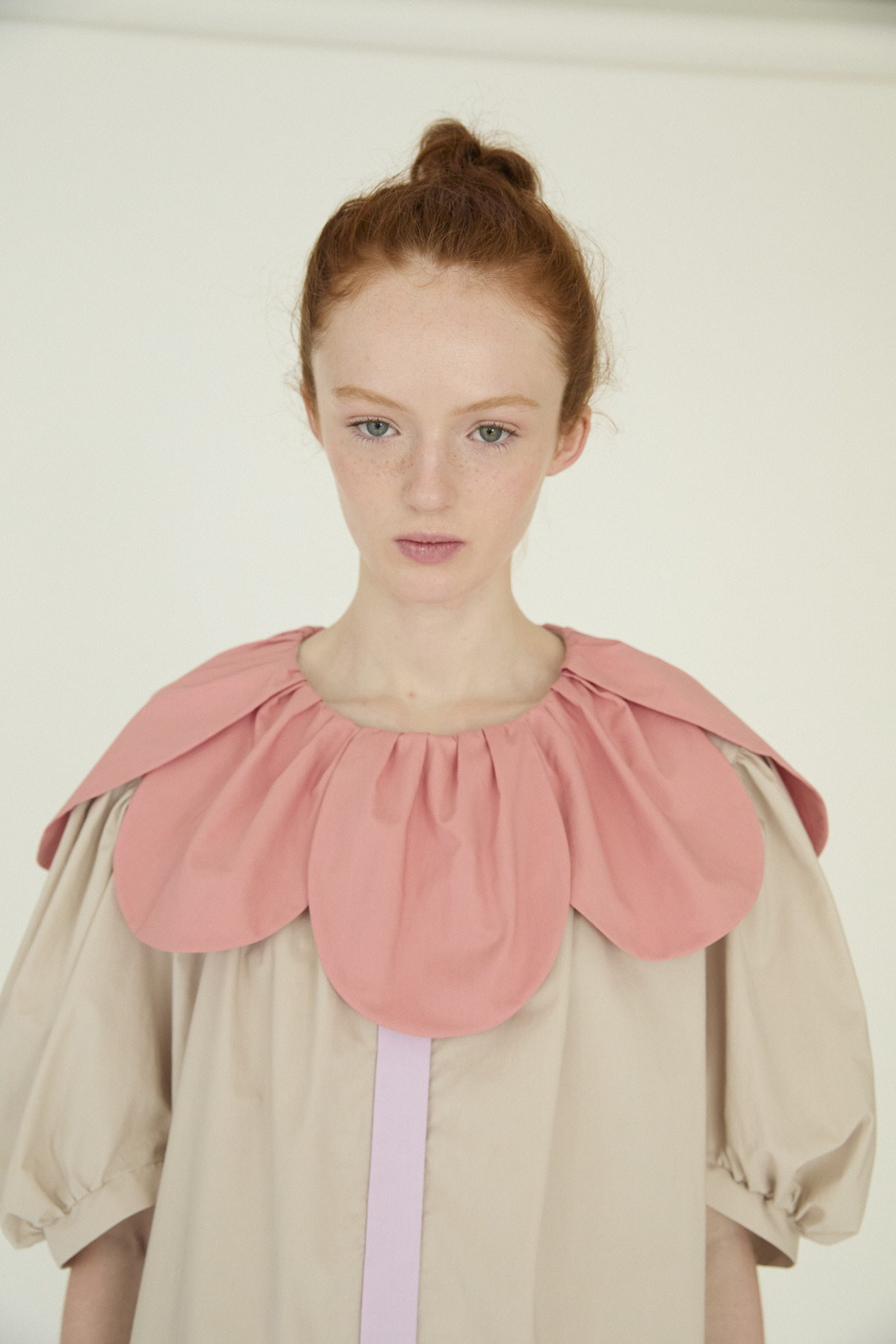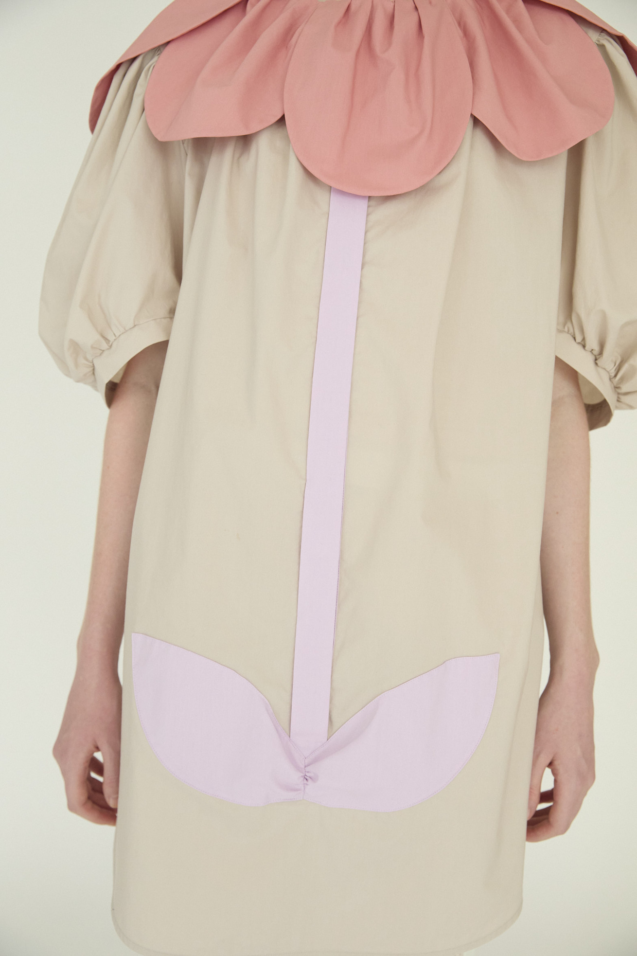 まるで大きな花を身に纏ったような、大きな花びらの襟と茎の前たて、葉のデザインがキュートなワンピースです。 ギャザーをたっぷり入れてふんわりと丸みをだした袖、サイドのスリットをスカラップ状に入れることで全体でやわらかい印象を作っています。 生地はコットン100%の風合いを充分に生かしつつ、ふんわりとしたシルキーなタッチをプラス、軽くタンブラーをかけることでナチュラルさとふんわり感を出したタイプライターを使用しています。 ボリューム感がありながら、着用感は軽く、1枚で可愛いアイテムです。 ケア方法:手洗い可能 ※着用モデル身長:176cm ※着用サイズ:2(M)